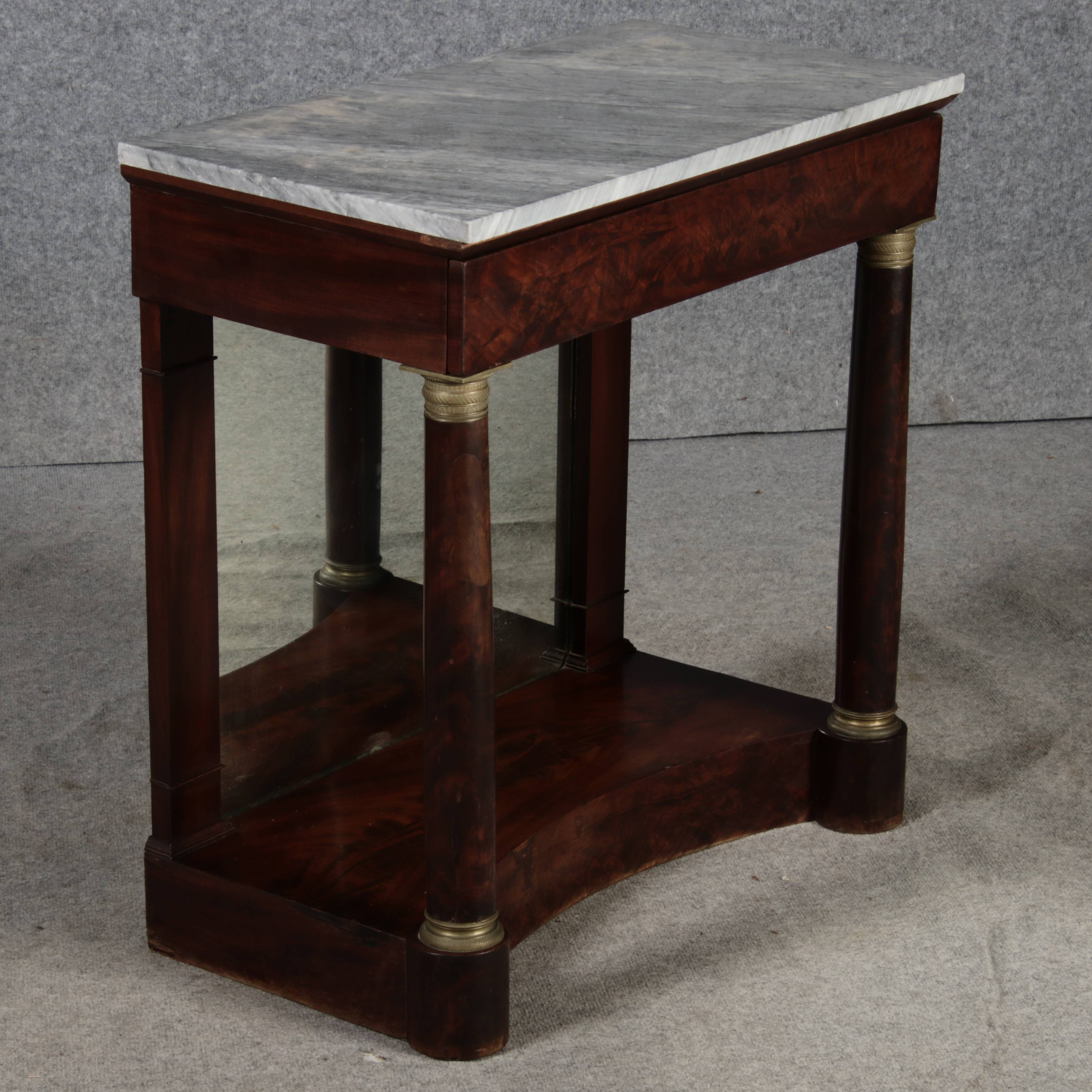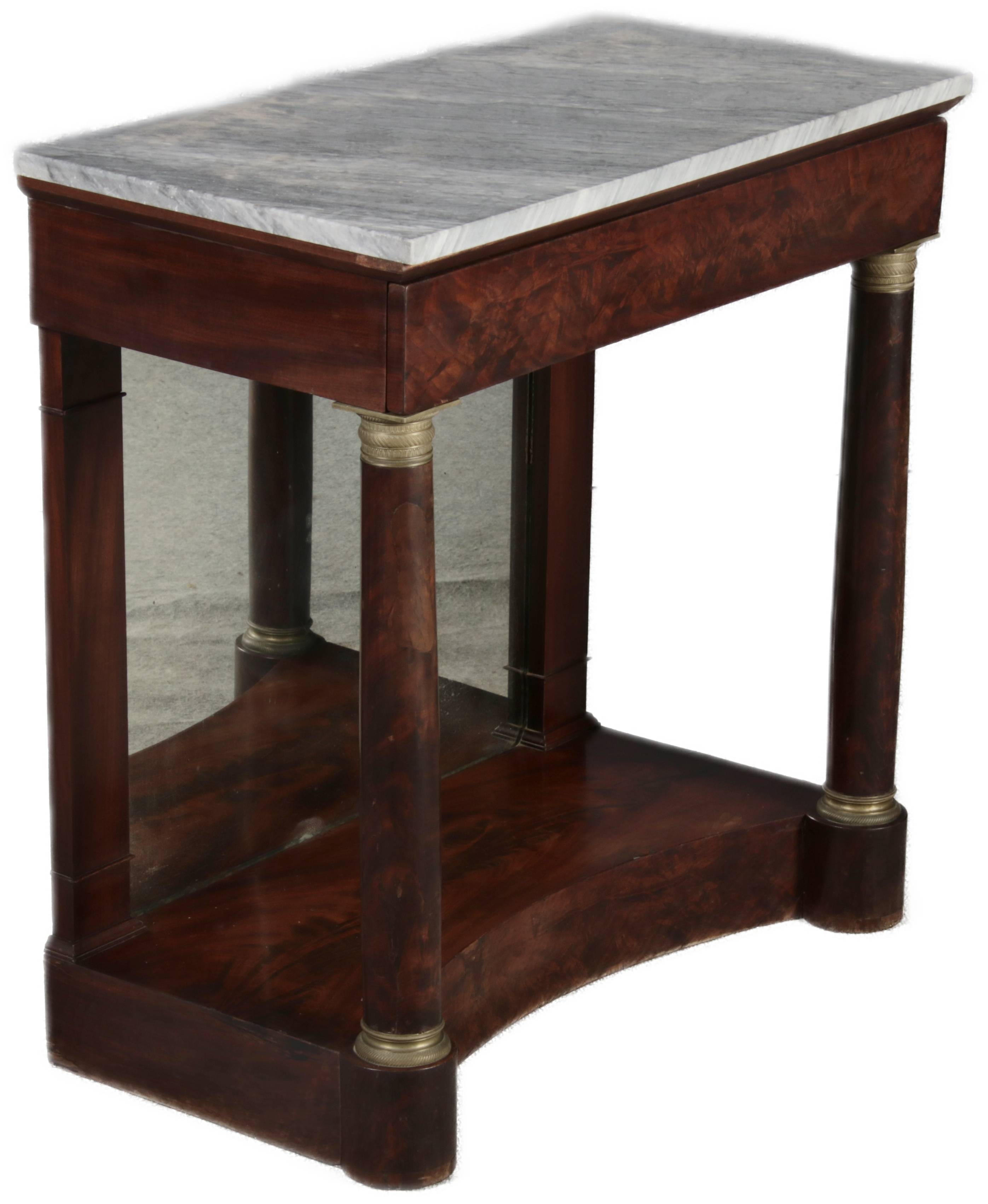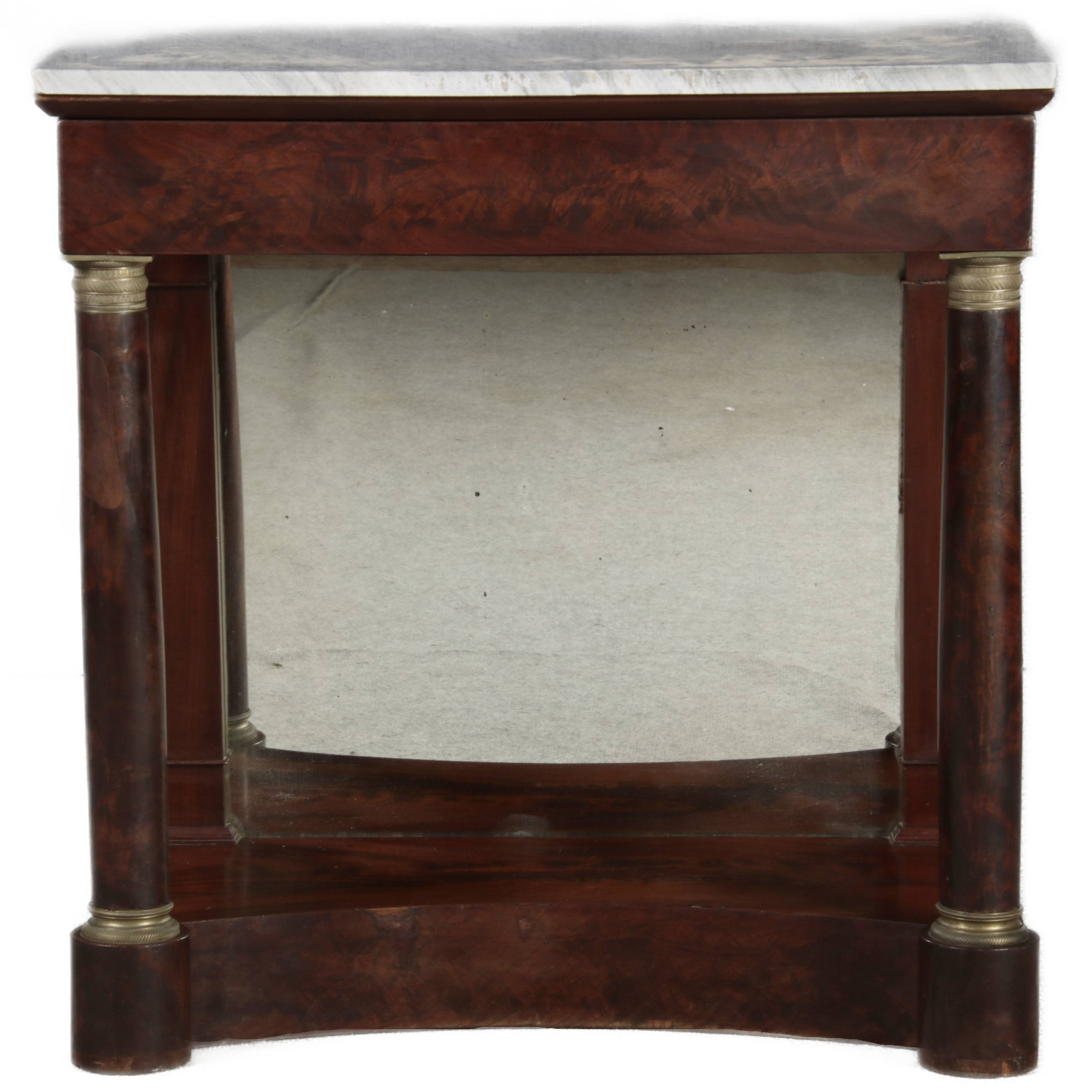 | Antike Empire Wandkonsole Mahagoni Marmor Spiegel Messing Basen und Kapitele um 1810 | ||