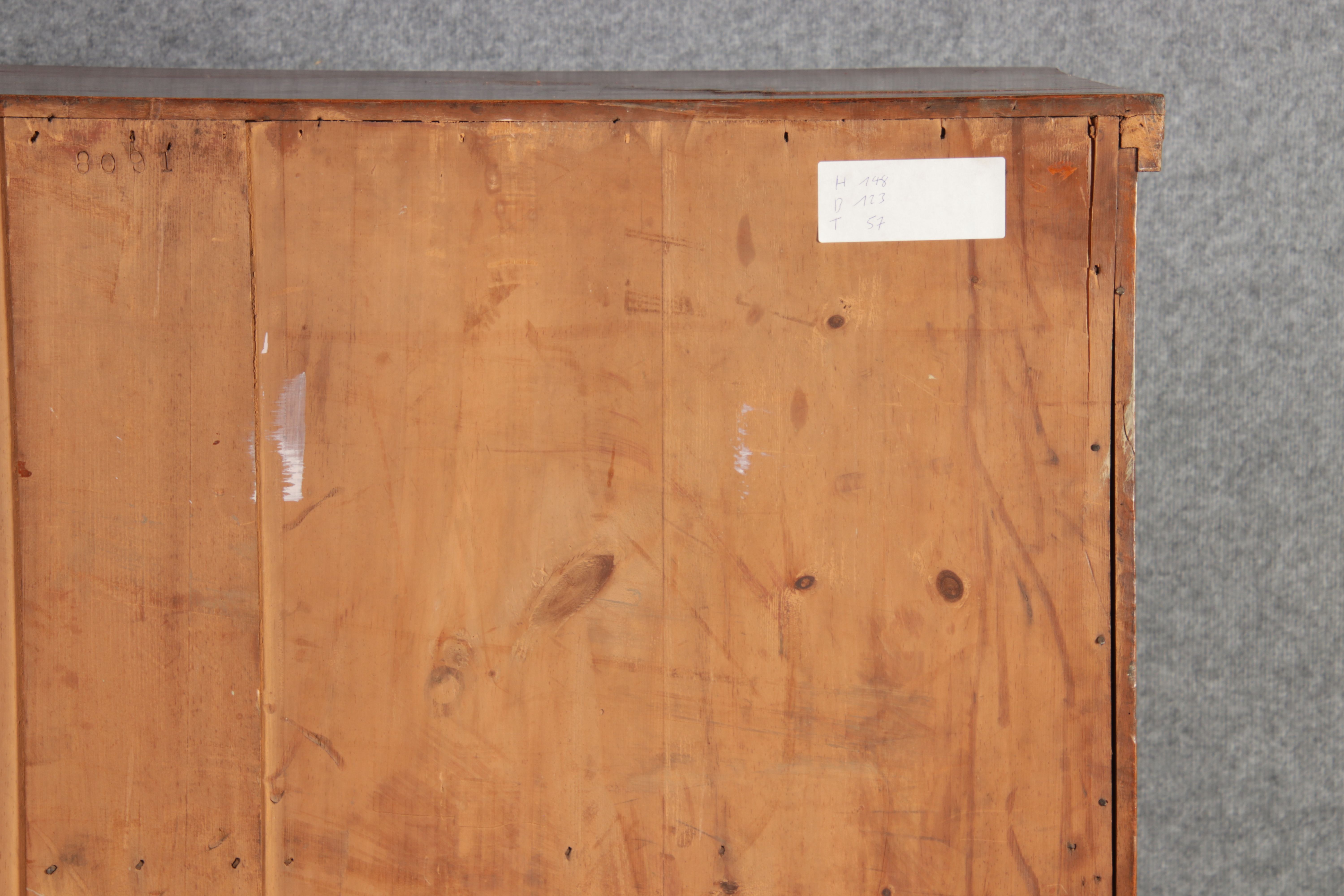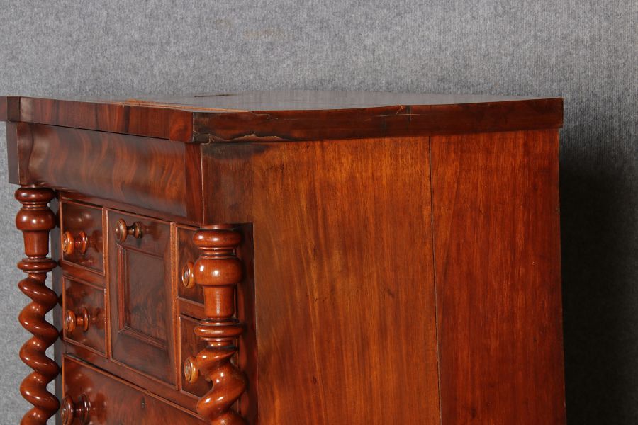 Alle Schubladenfronten sind mit ausgesuchten Mahagoni mit feinster Maserung furniert. Diese schöne große Kommode befindet sich in einem für das alter guten Zustand mit Gebrauchsspuren und kleinen Beschädigungen, die dem Alter und der Verwendung entsprechen. |