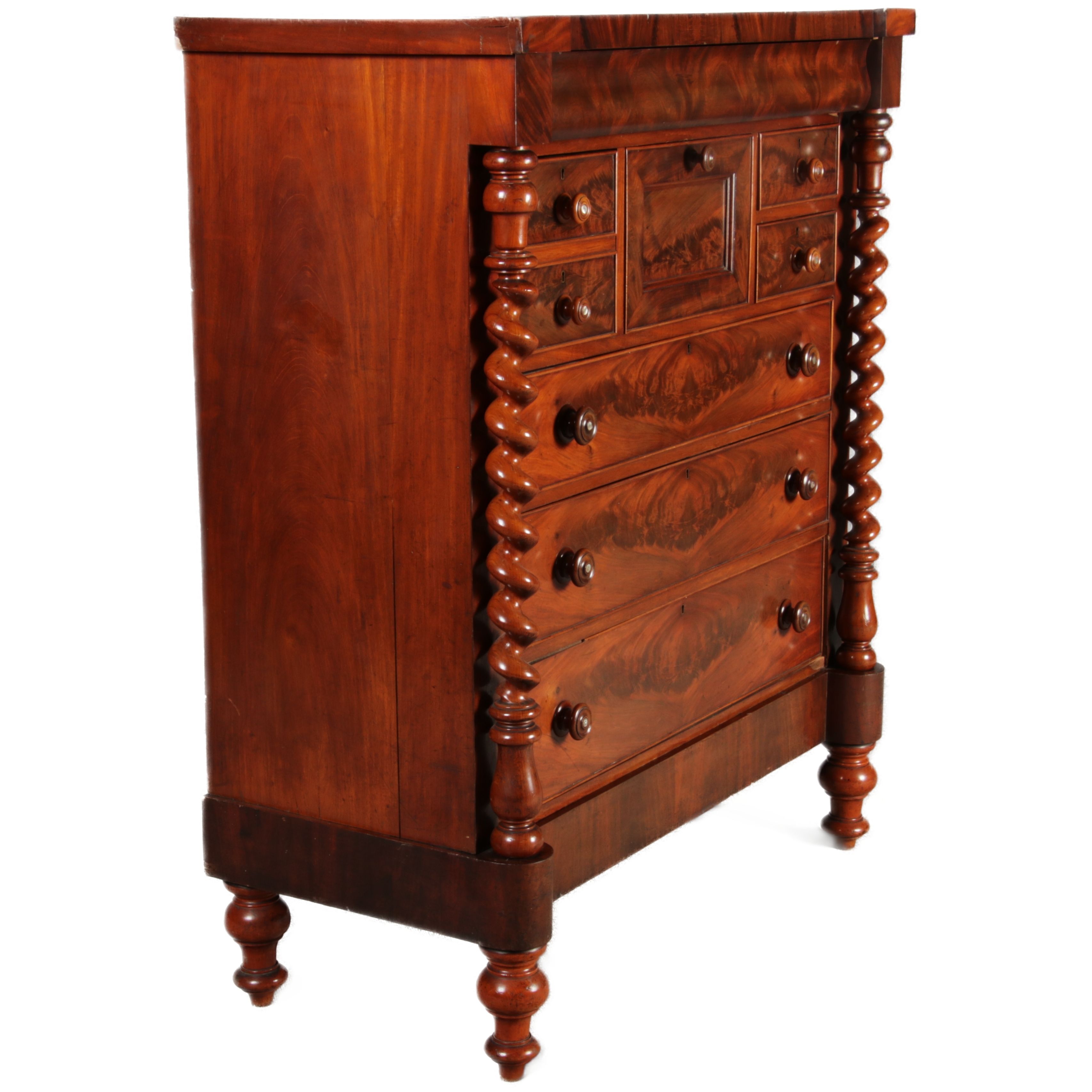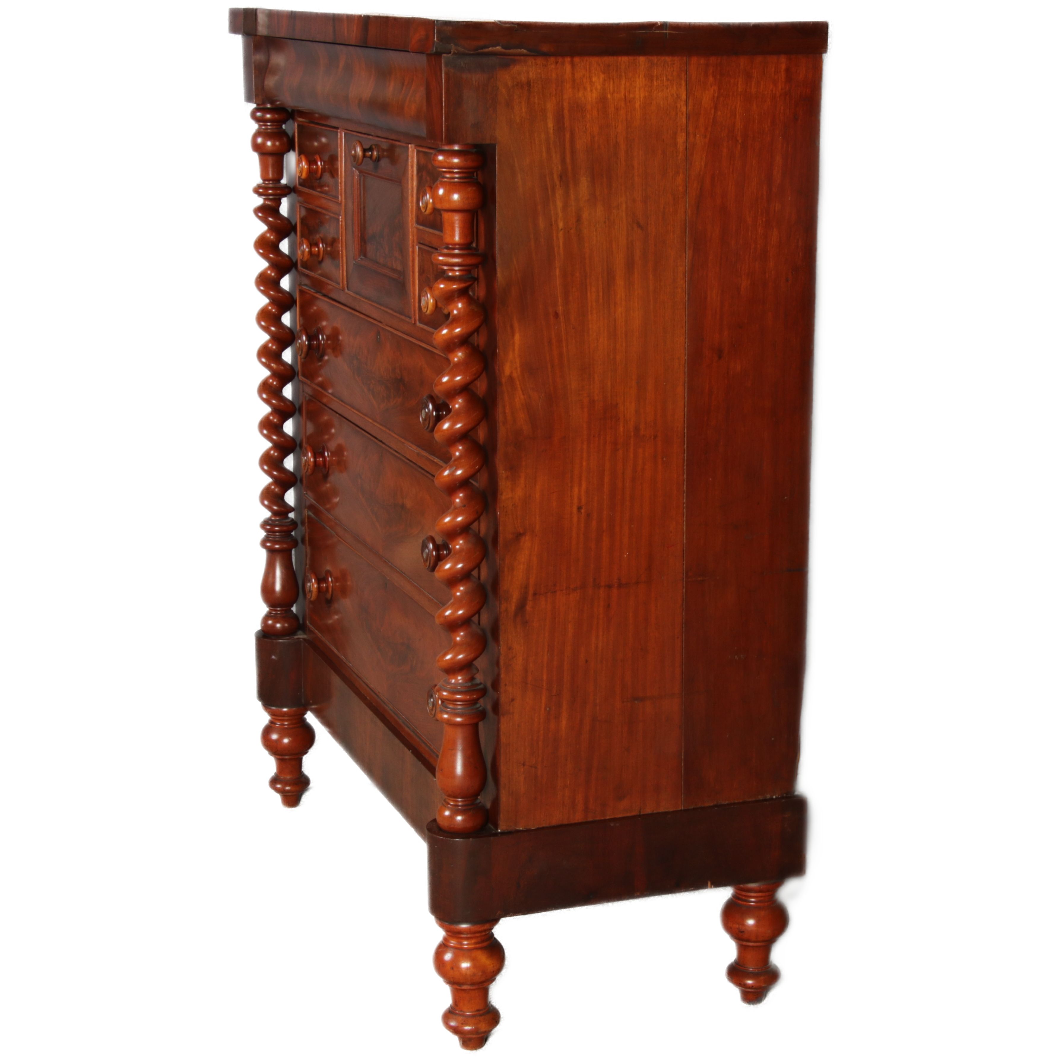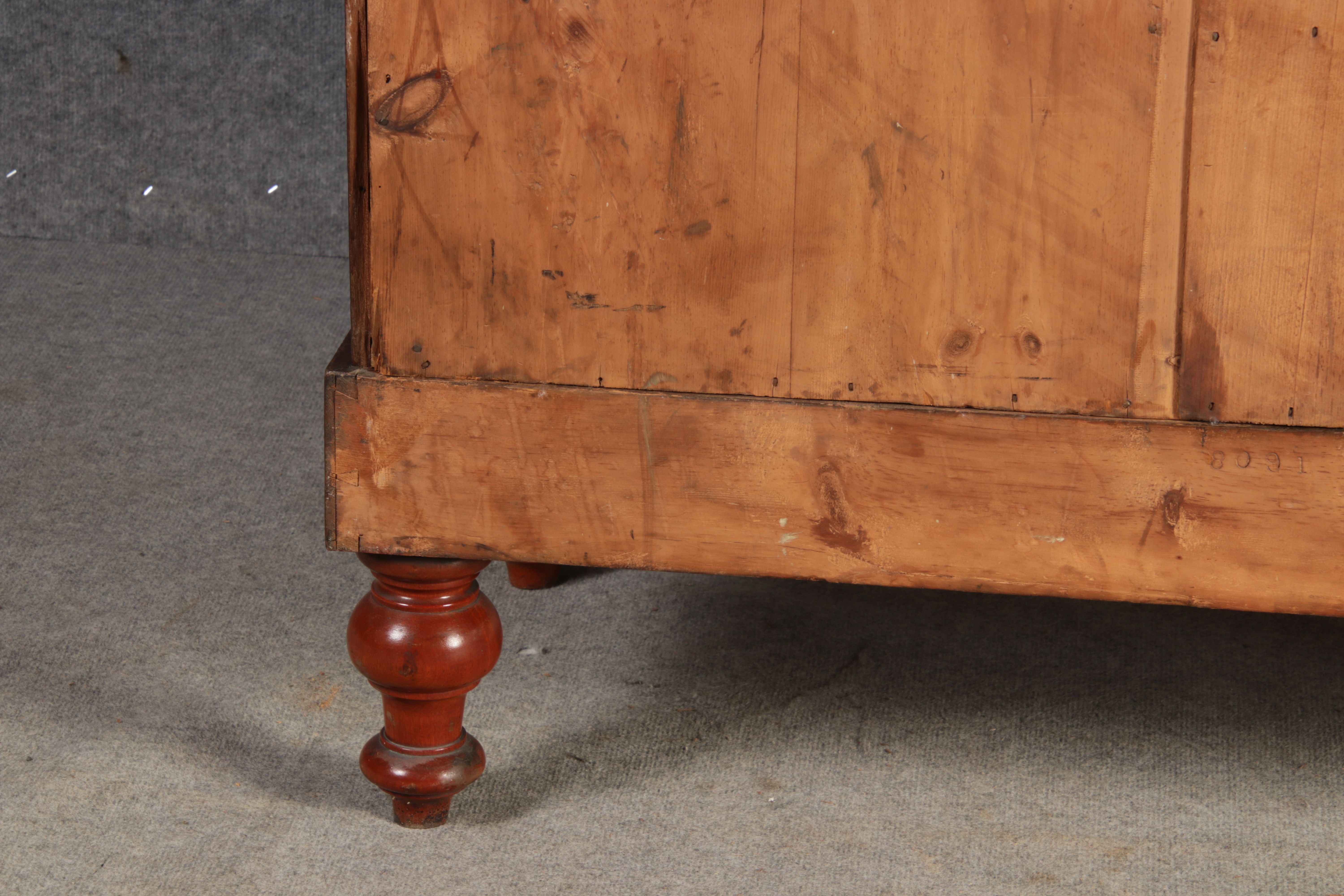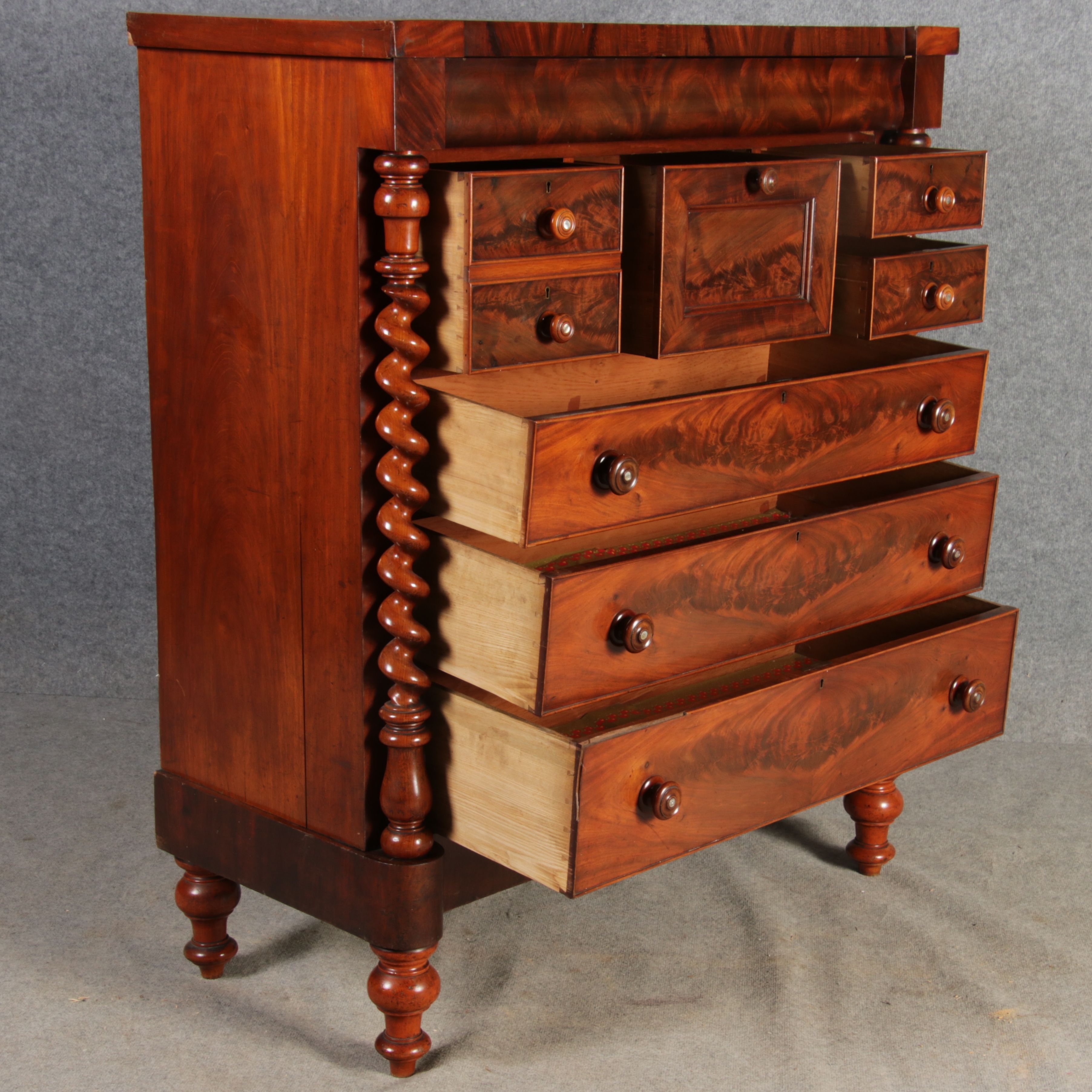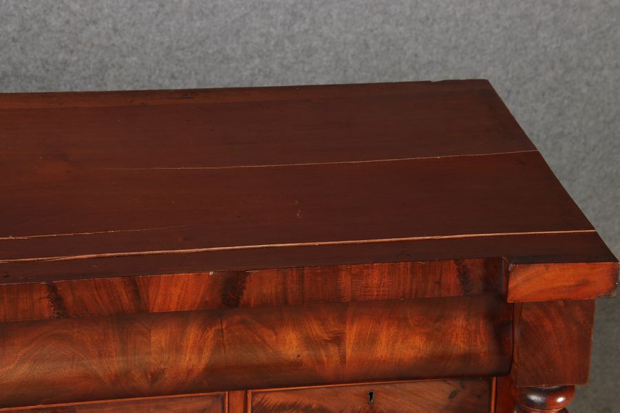 Alle Schubladenfronten sind mit ausgesuchten Mahagoni mit feinster Maserung furniert. Diese schöne große Kommode befindet sich in einem für das alter guten Zustand mit Gebrauchsspuren und kleinen Beschädigungen, die dem Alter und der Verwendung entsprechen.