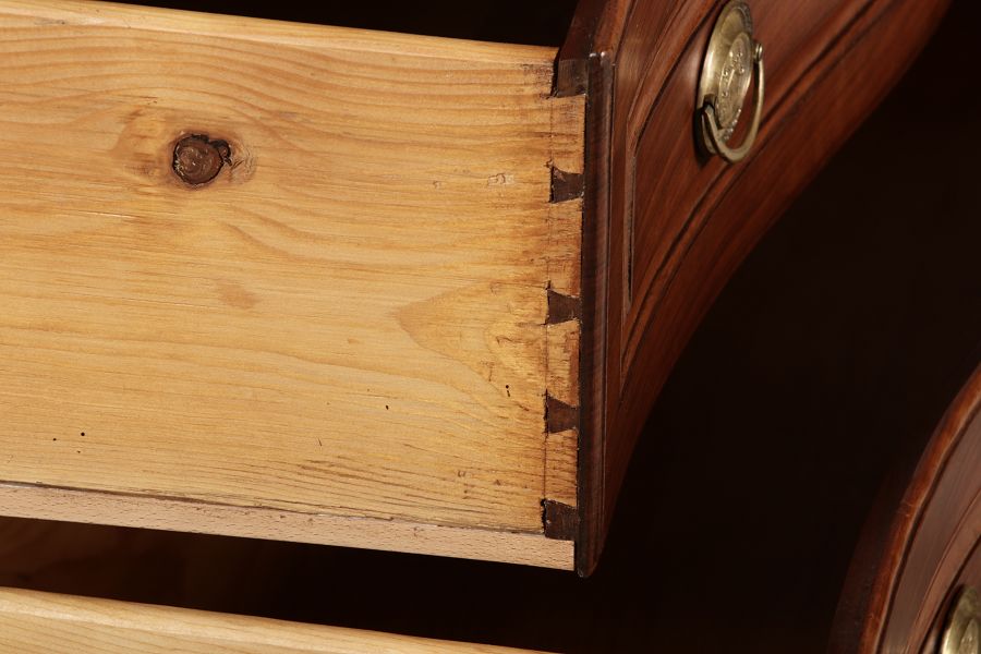 Nussbaumkommode, 18. Jahrhundert Die Kommode verfügt über vier geräumige Schubladen. Jede Schublade ist mit, kunstvoll gestalteten Messingbeschlägen und Schlüsselschildern ausgestattet, die den historischen Charakter unterstreichen. Die geschwungene Front sowie die leicht geschwungene Zarge verleihen dem Möbelstück eine grazile Leichtigkeit, die von den geschwungenen Beinen harmonisch ergänzt wird. Der geschweifte Sockel und die fein geschliffene Deckplatte runden das harmonische Gesamtbild ab. Dieses zeitlose Möbelstück fügt sich mühelos in klassisch wie auch modern eingerichtete Räume ein und bietet zugleich praktischen Stauraum und ästhetische Schönheit |