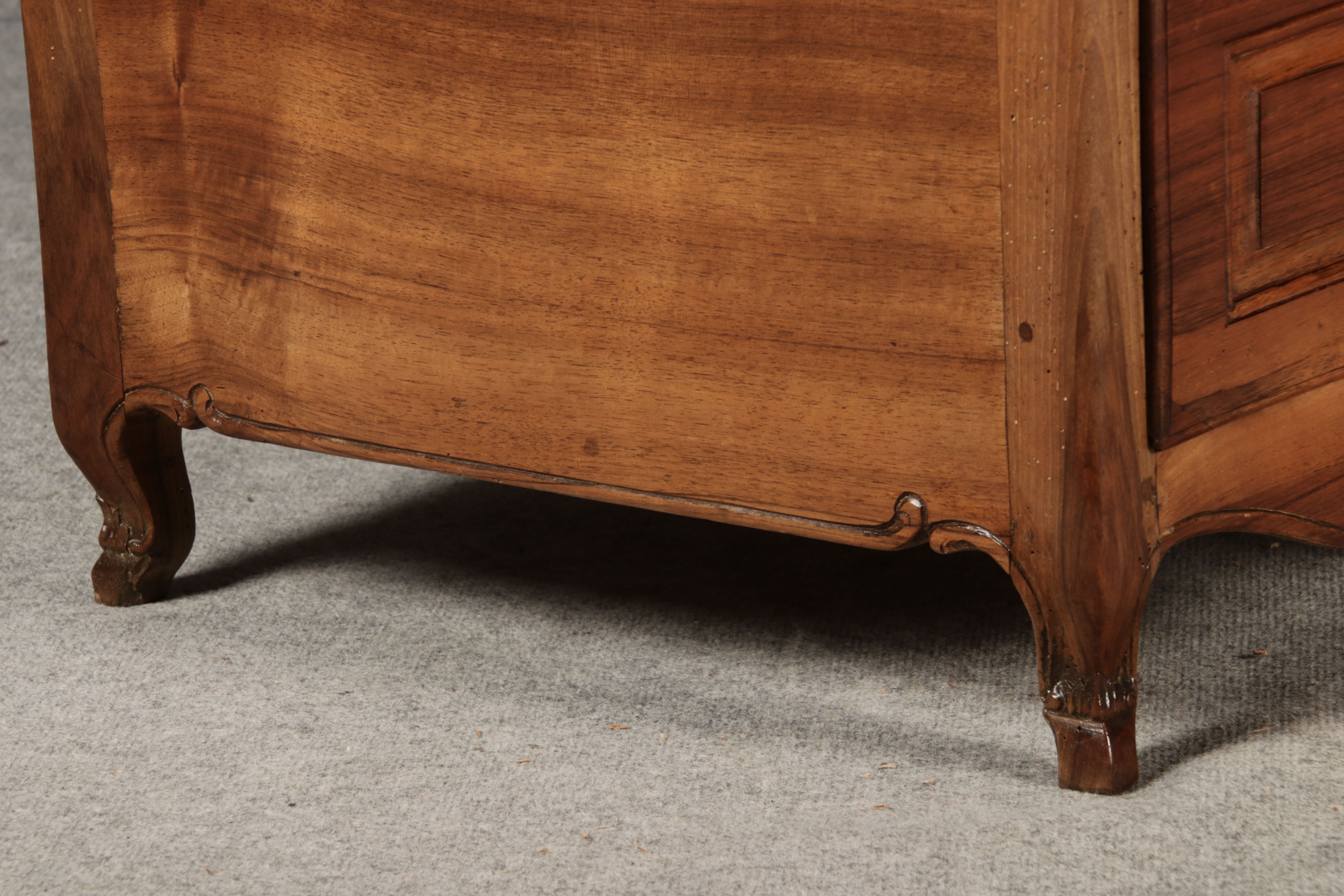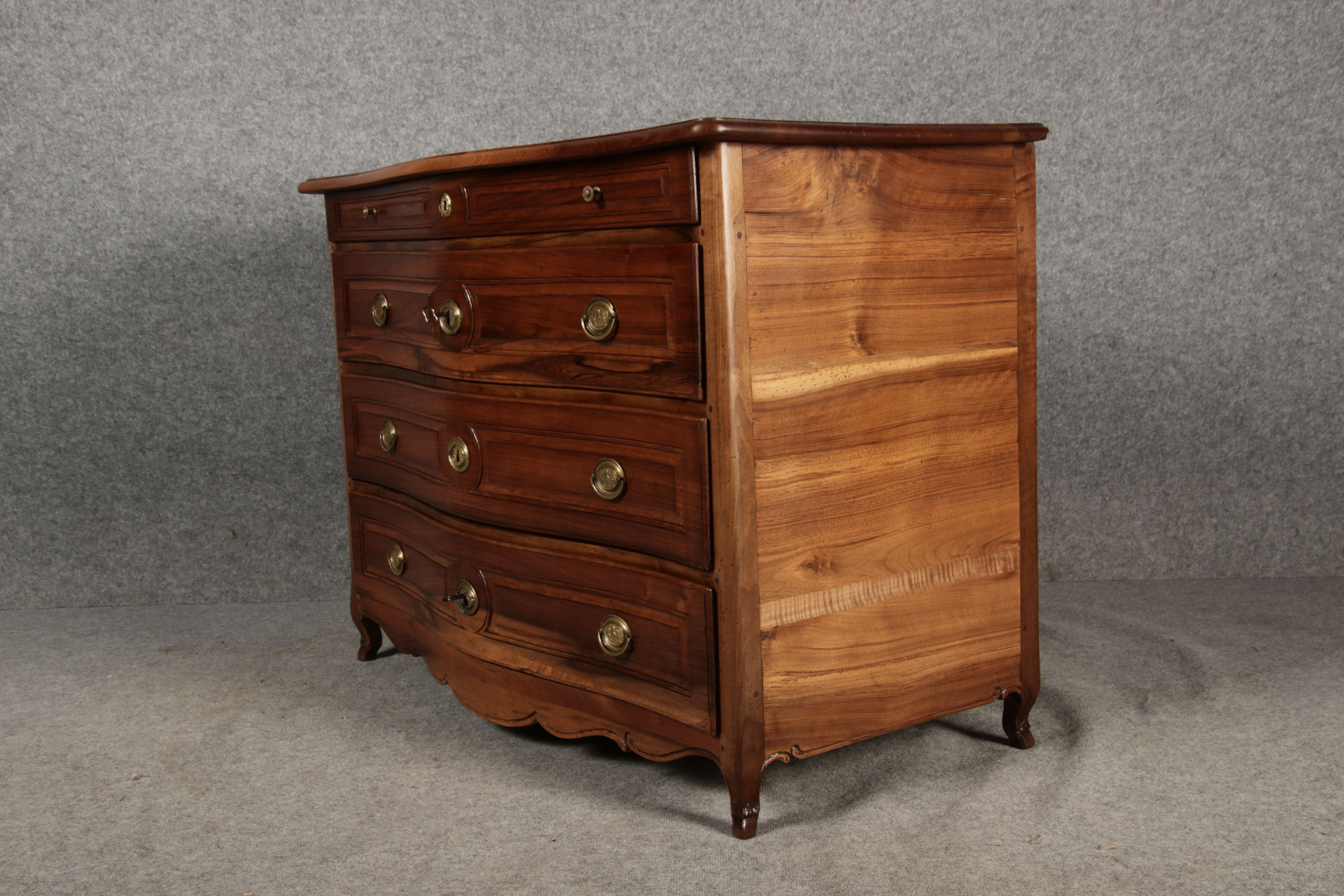 Beschreibung/description: Nussbaumkommode, 18. Jahrhundert Die Kommode verfügt über vier geräumige Schubladen. Jede Schublade ist mit, kunstvoll gestalteten Messingbeschlägen und Schlüsselschildern ausgestattet, die den historischen Charakter unterstreichen. Die geschwungene Front sowie die leicht geschwungene Zarge verleihen dem Möbelstück eine grazile Leichtigkeit, die von den geschwungenen Beinen harmonisch ergänzt wird. Der geschweifte Sockel und die fein geschliffene Deckplatte runden das harmonische Gesamtbild ab. Dieses zeitlose Möbelstück fügt sich mühelos in klassisch wie auch modern eingerichtete Räume ein und bietet zugleich praktischen Stauraum und ästhetische Schönheit.