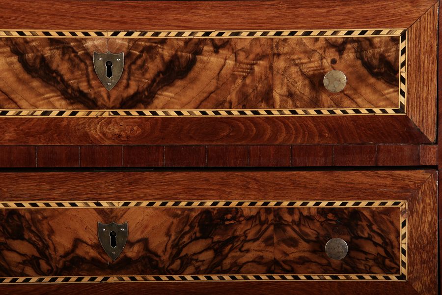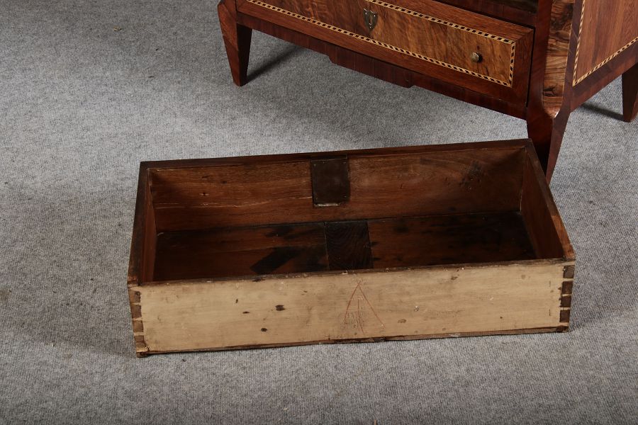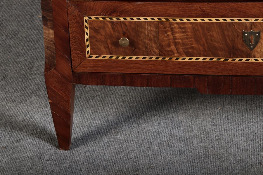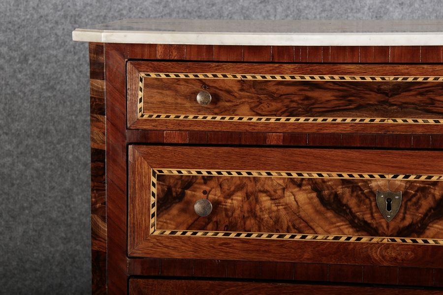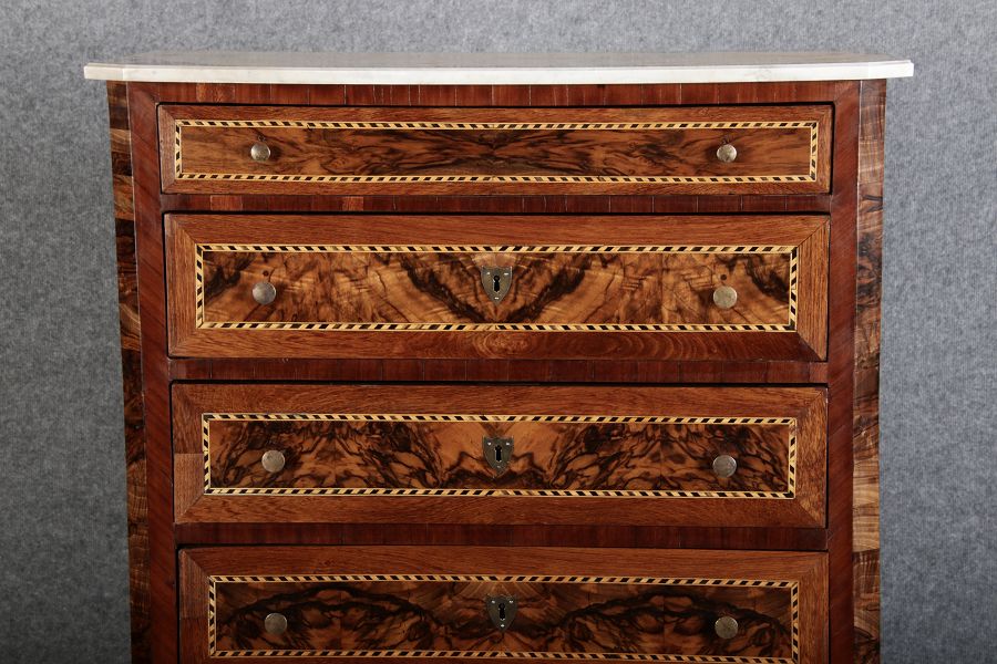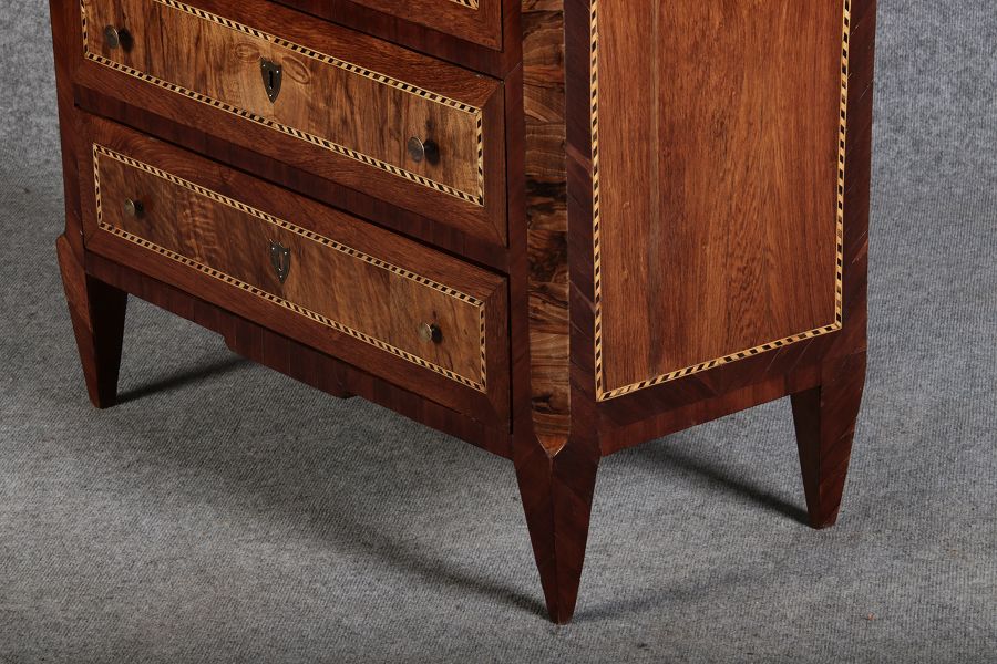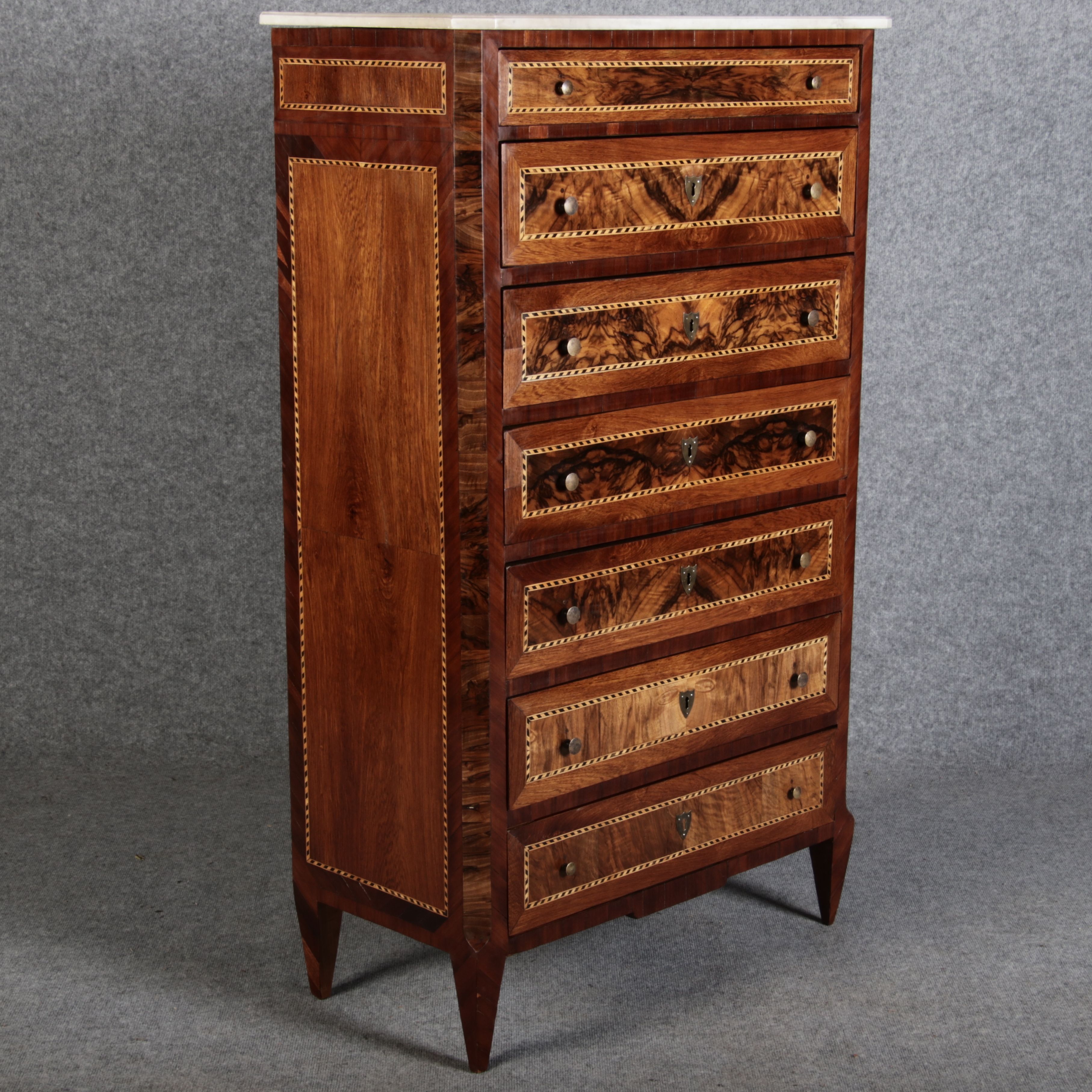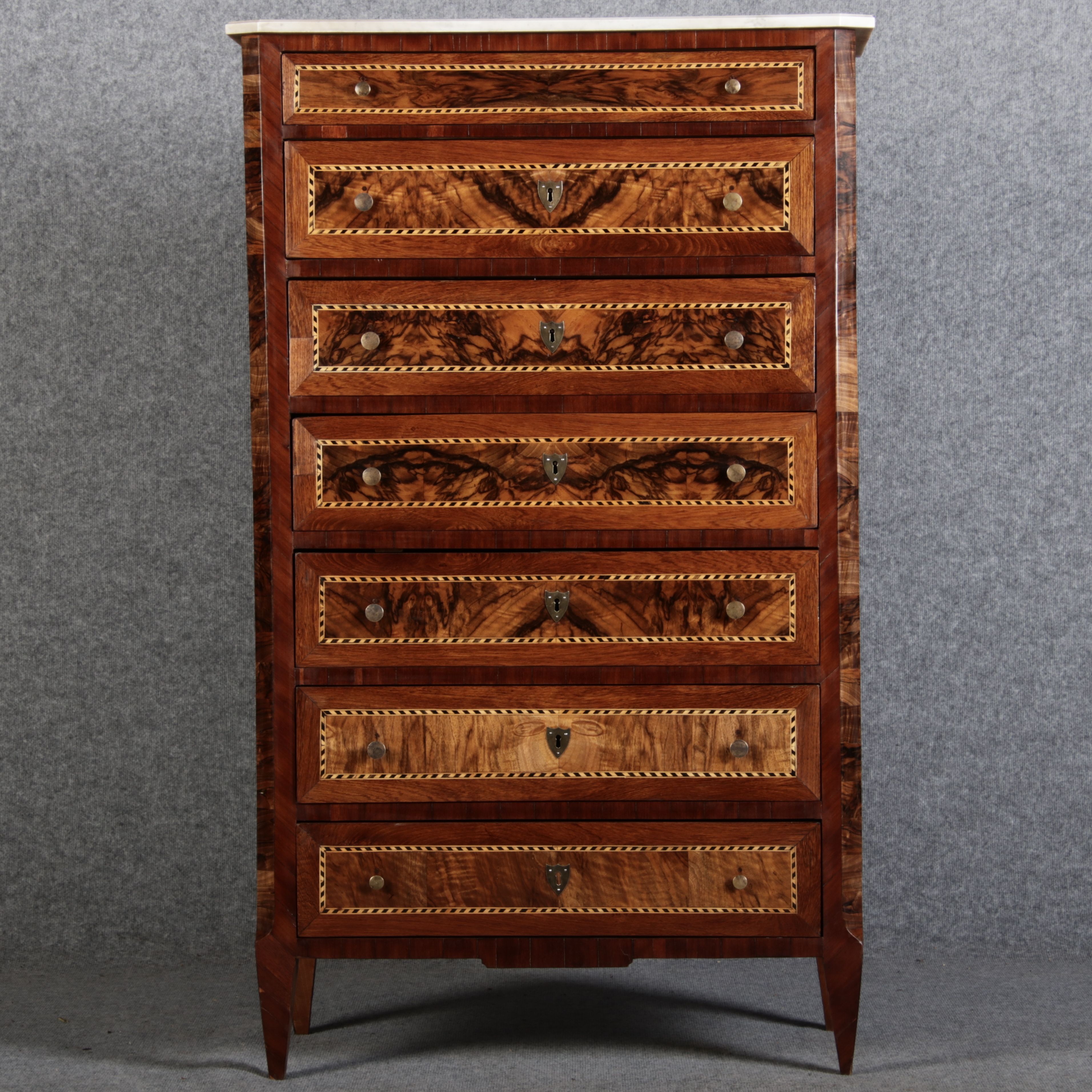 | Antike Louise XVI Pfeiler Hoch Kommode um 1800 mit Einlegearbeiten Nussbaum 7 Schubladen |
