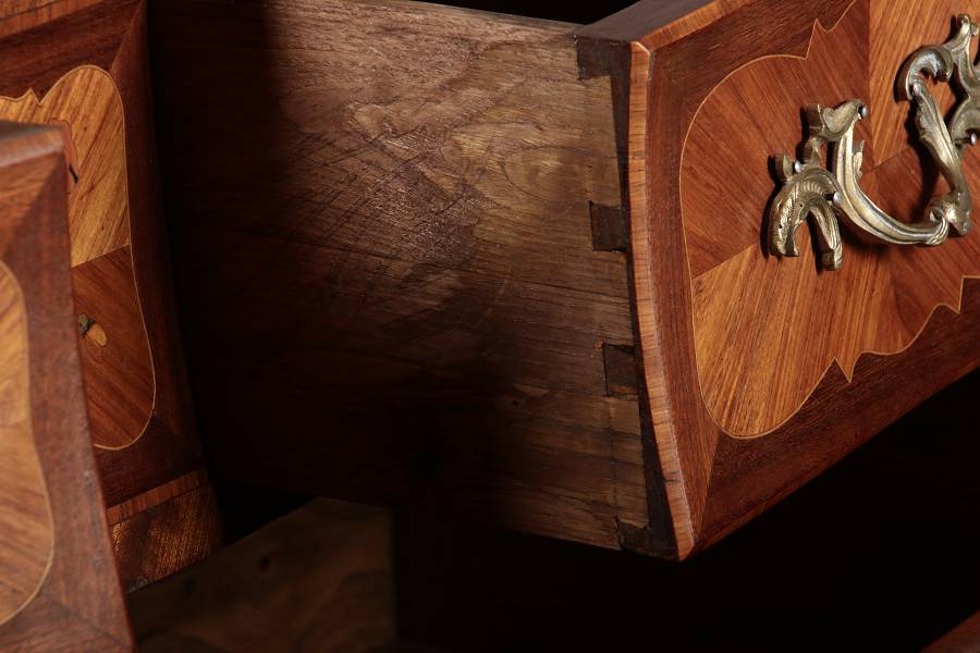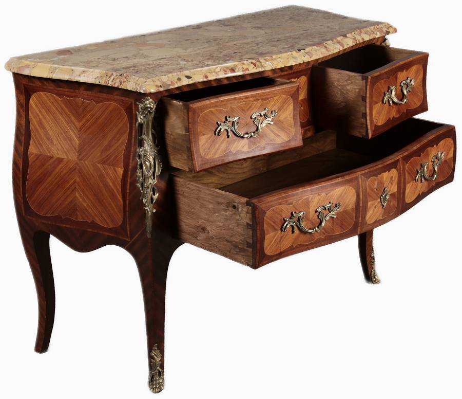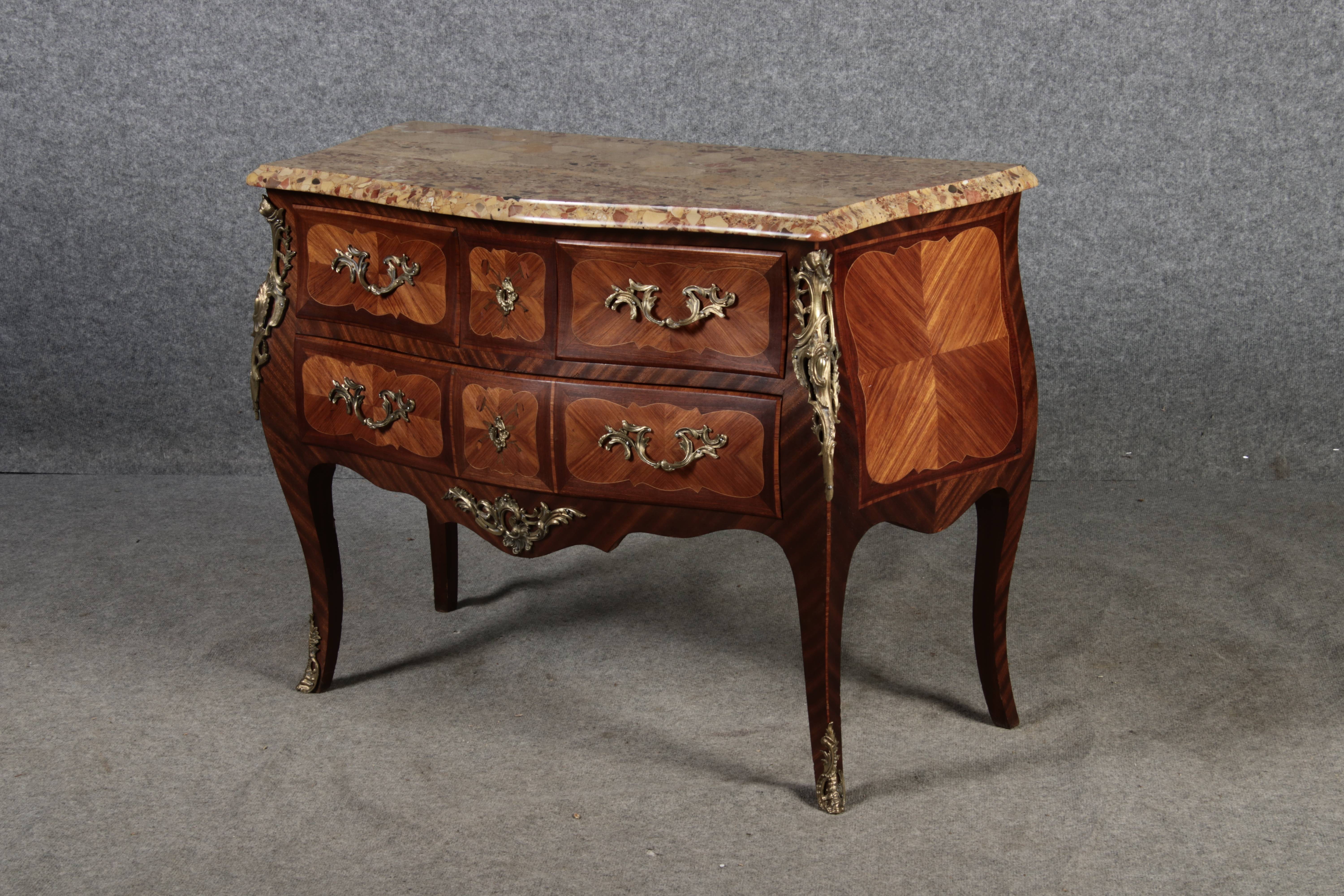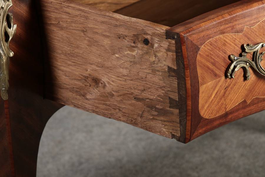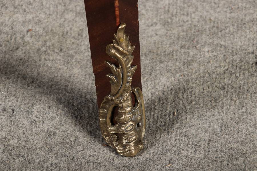 Das Holz ist Nussbaum und andere Hölzer auf Eichenholz mit Bronze Verzierungen und einer Marmorplatte