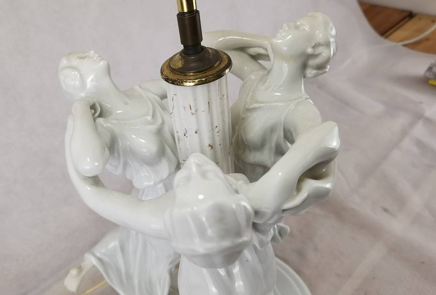 Zustand/condition: Original Antiquität- Vintage Artikel in einem für das alter guten Zustand, mit Gebrauchsspuren, unten an der Säule reparierter Schaden, siehe Bilder. Verkabelung ist geprüft und war zum Zeitpunkt der Prüfung in Ordnung. Dekorationen auf den Bildern und Leuchtmittel sind nicht Bestandteil des Angebotes.