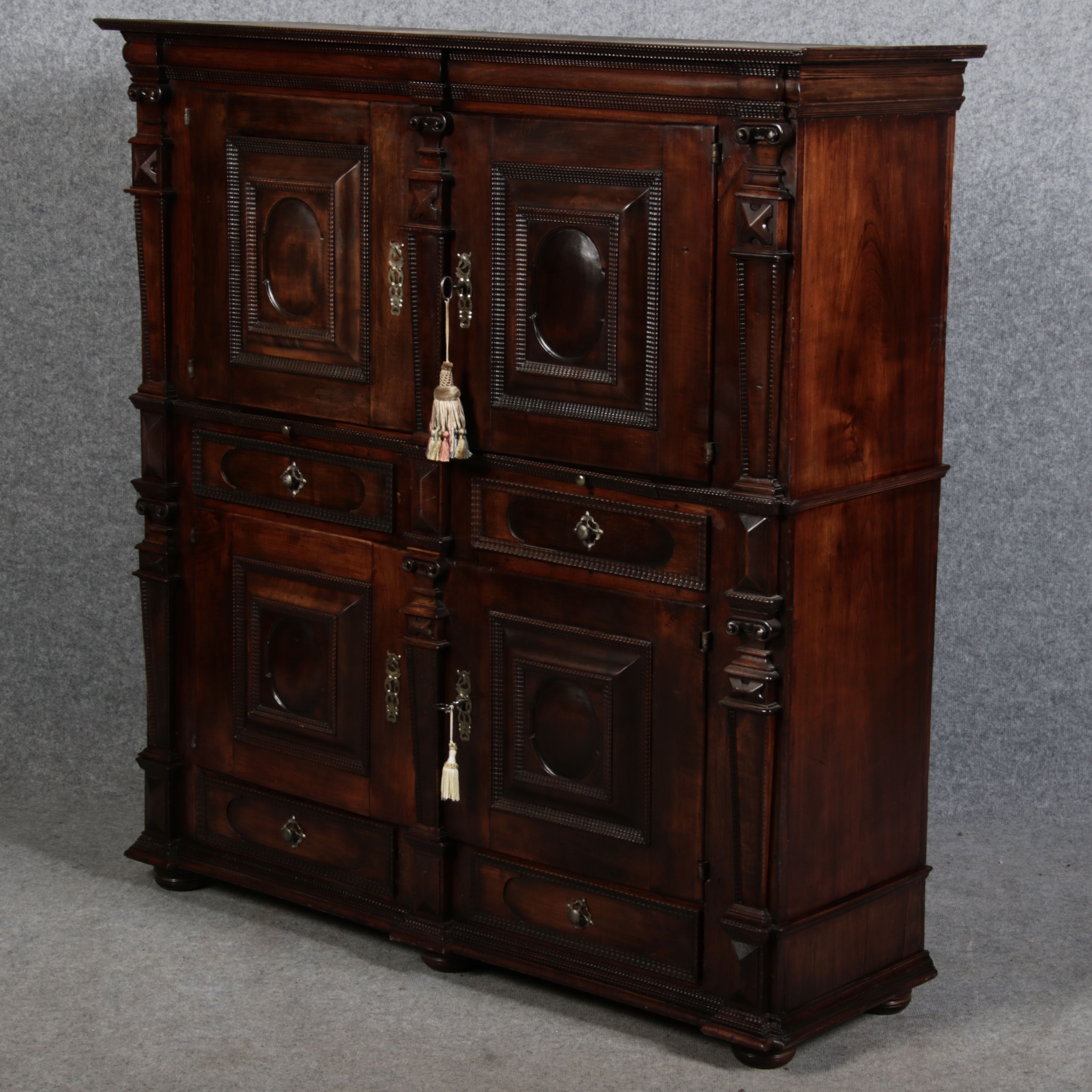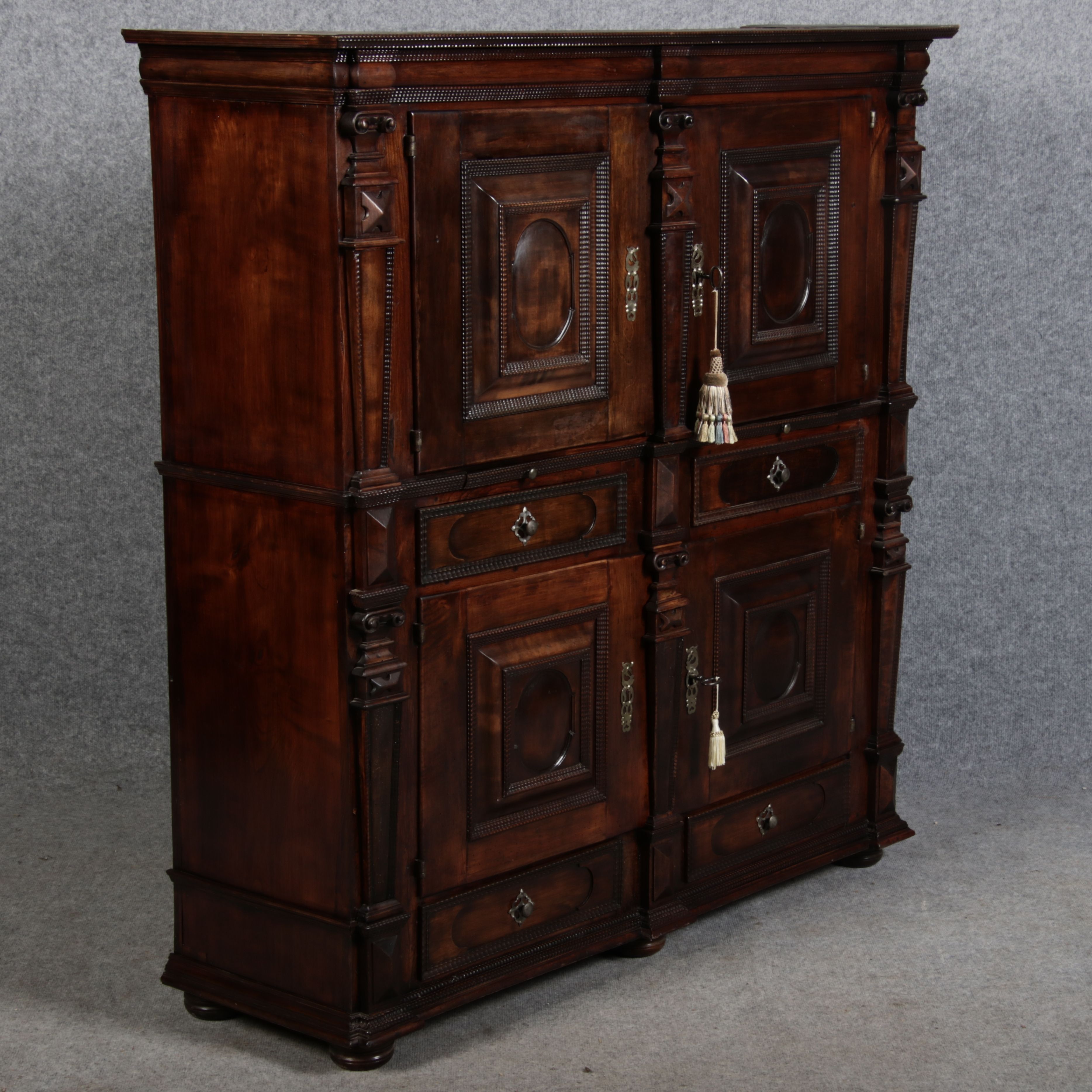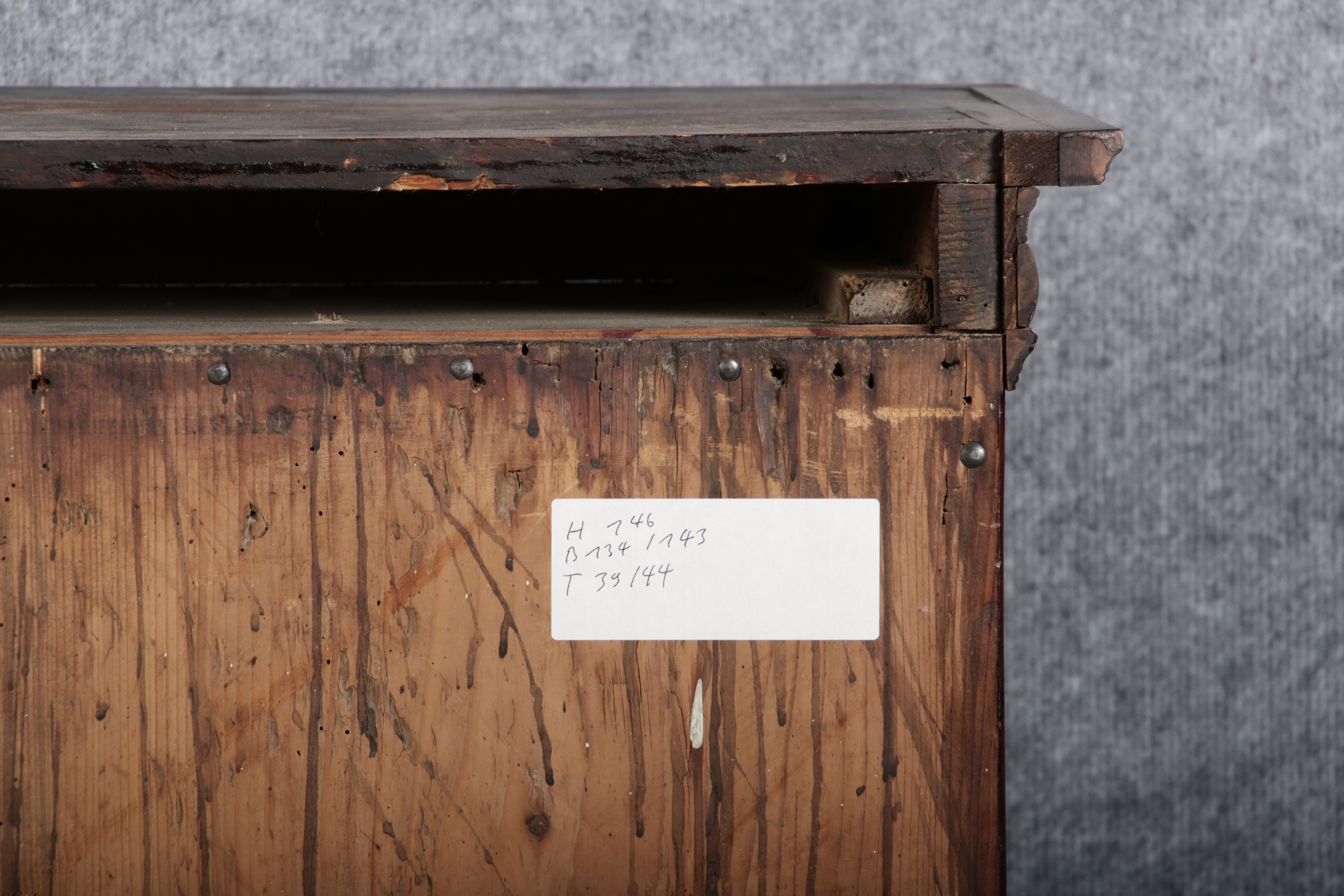 Masse/dimensions: Höhe/Height ca. 146 cm, Breite Korpus/Broad Boda ca. 134 cm, Breite Gesims/Broad cornice ca. 143 cm, Tiefe Korpus/Deep body ca. 39 cm, Tiefe Gesims/Deep cornice ca. 44 cm
