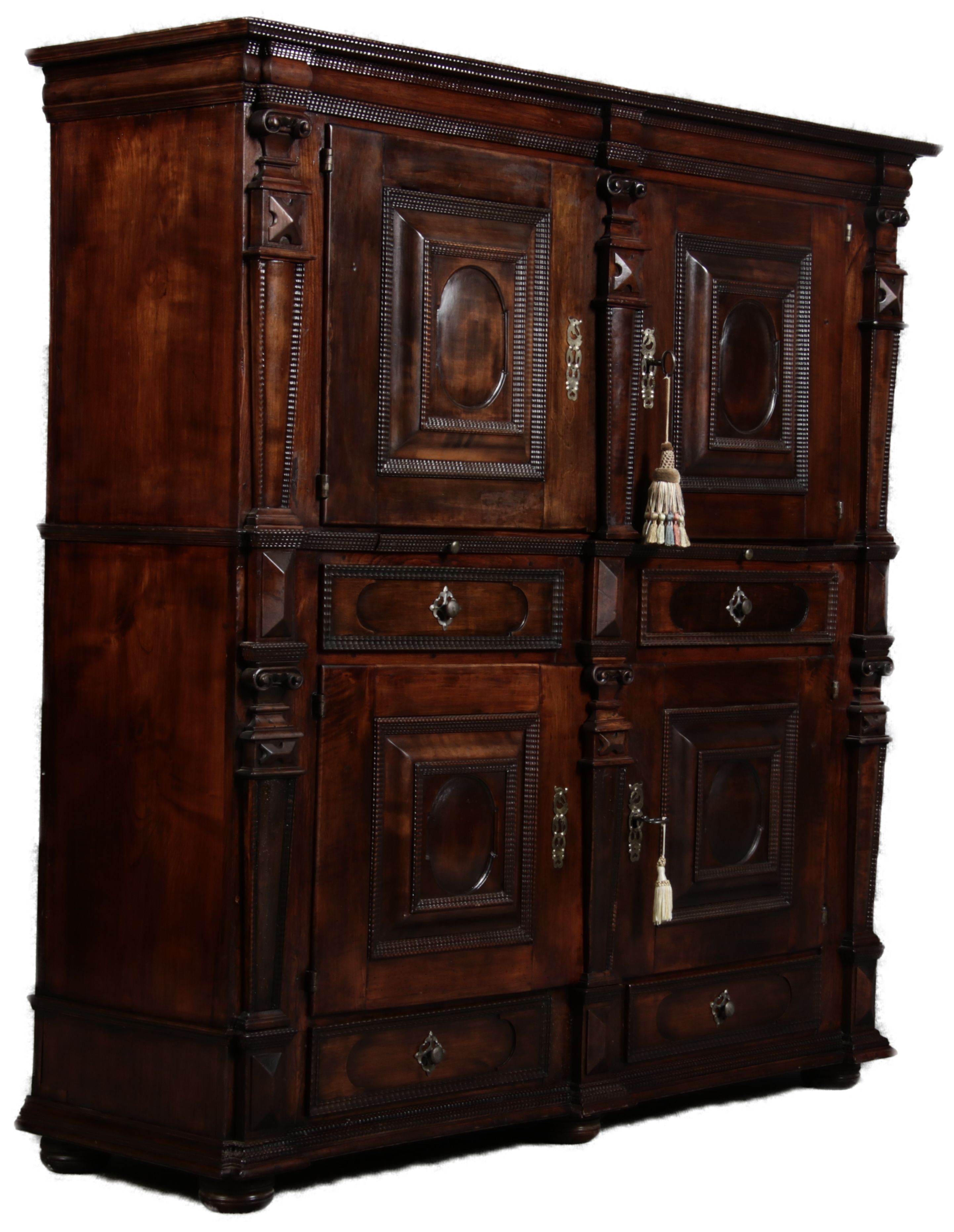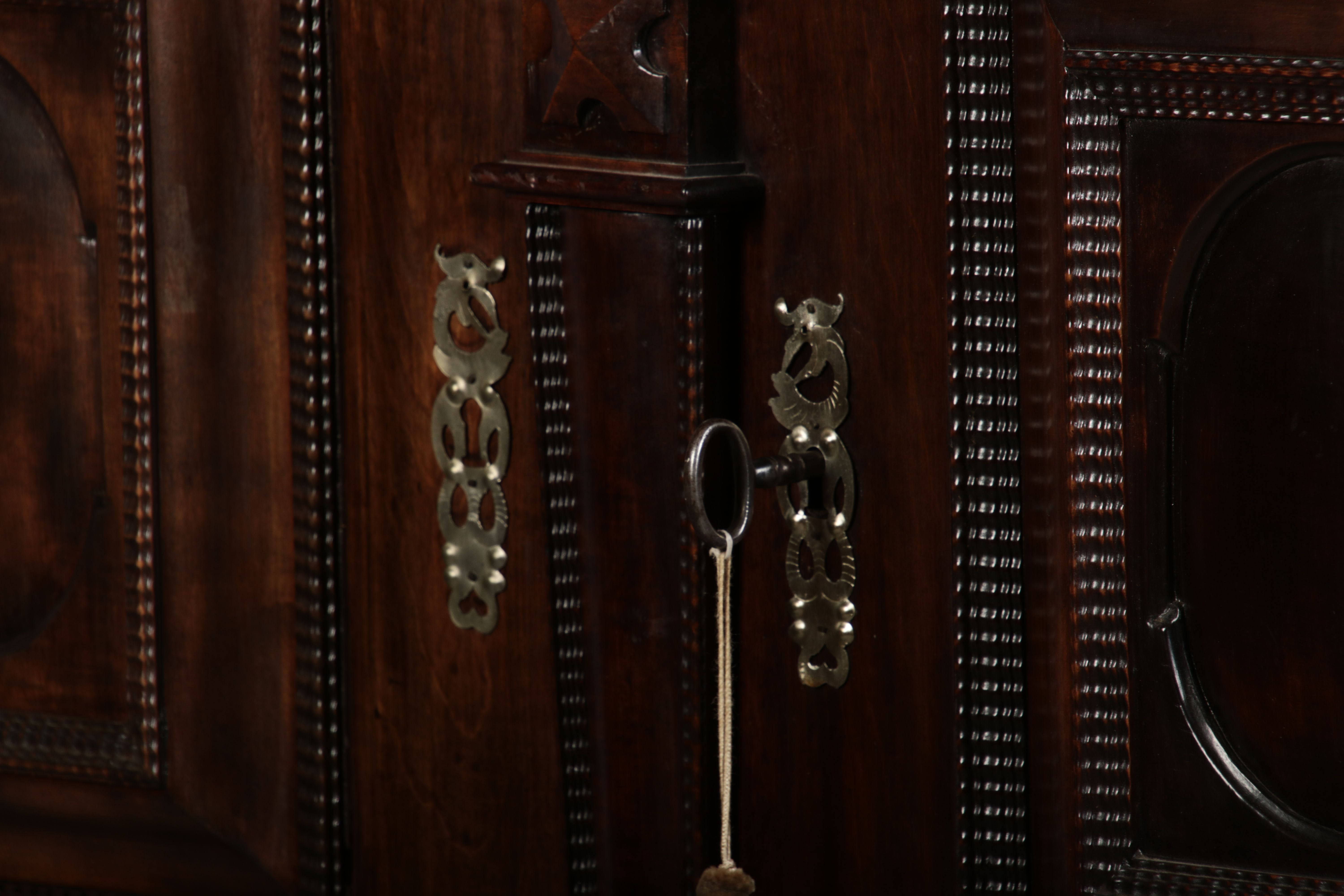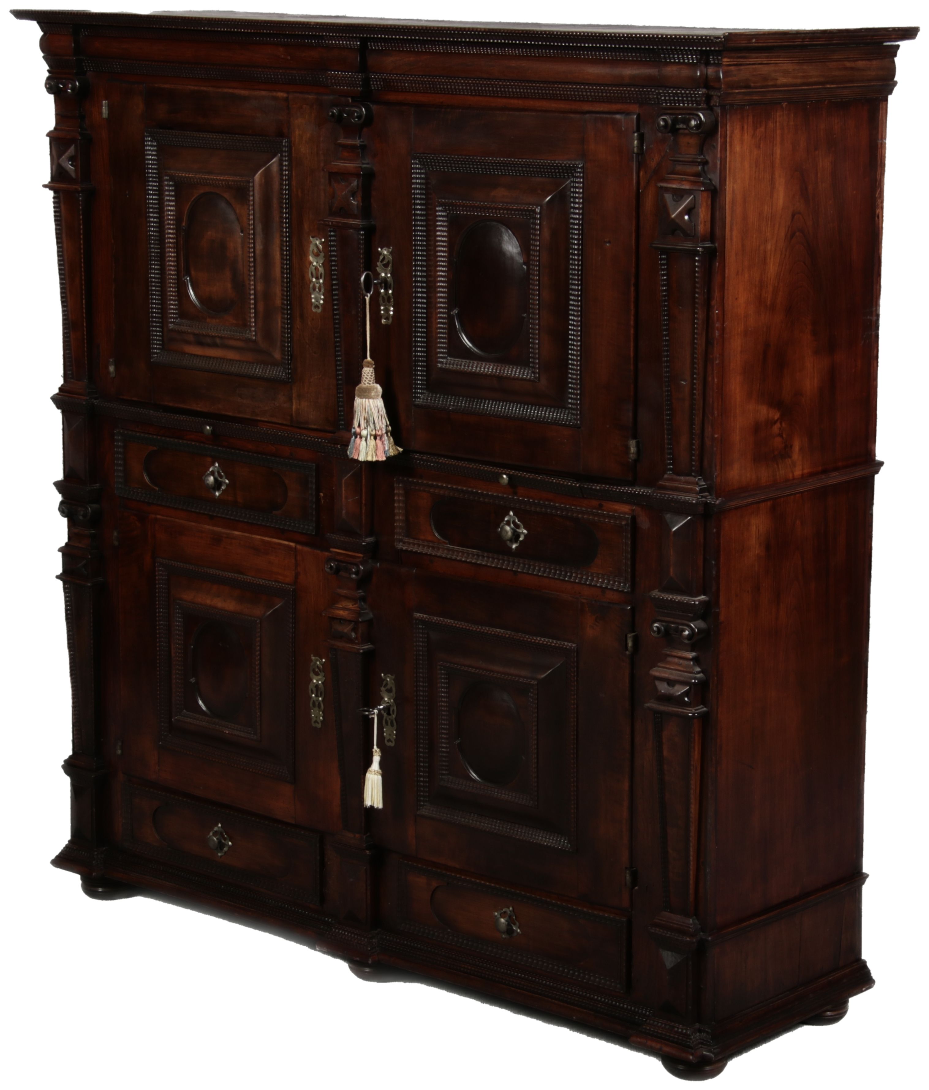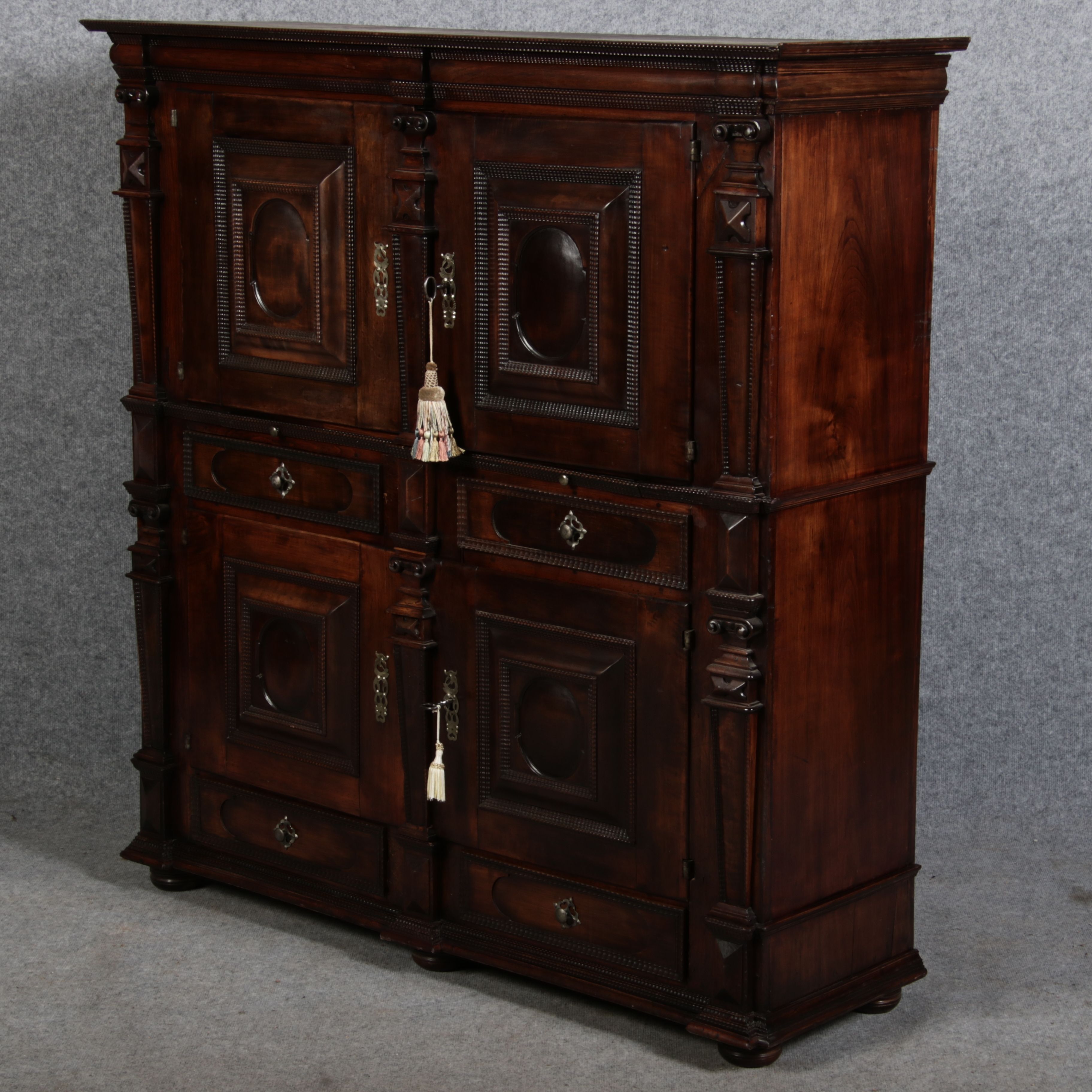 Masse/dimensions: Höhe/Height ca. 146 cm, Breite Korpus/Broad Boda ca. 134 cm, Breite Gesims/Broad cornice ca. 143 cm, Tiefe Korpus/Deep body ca. 39 cm, Tiefe Gesims/Deep cornice ca. 44 cm