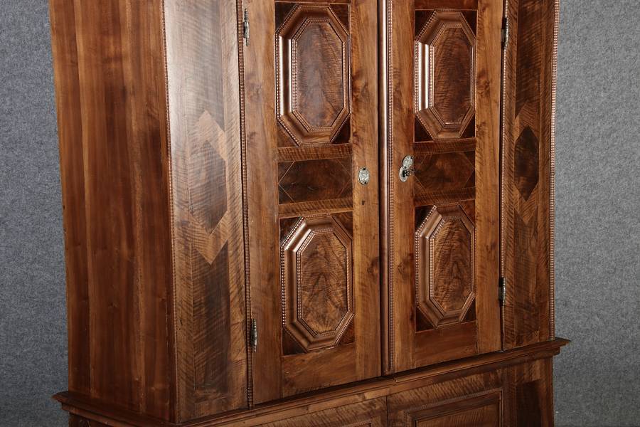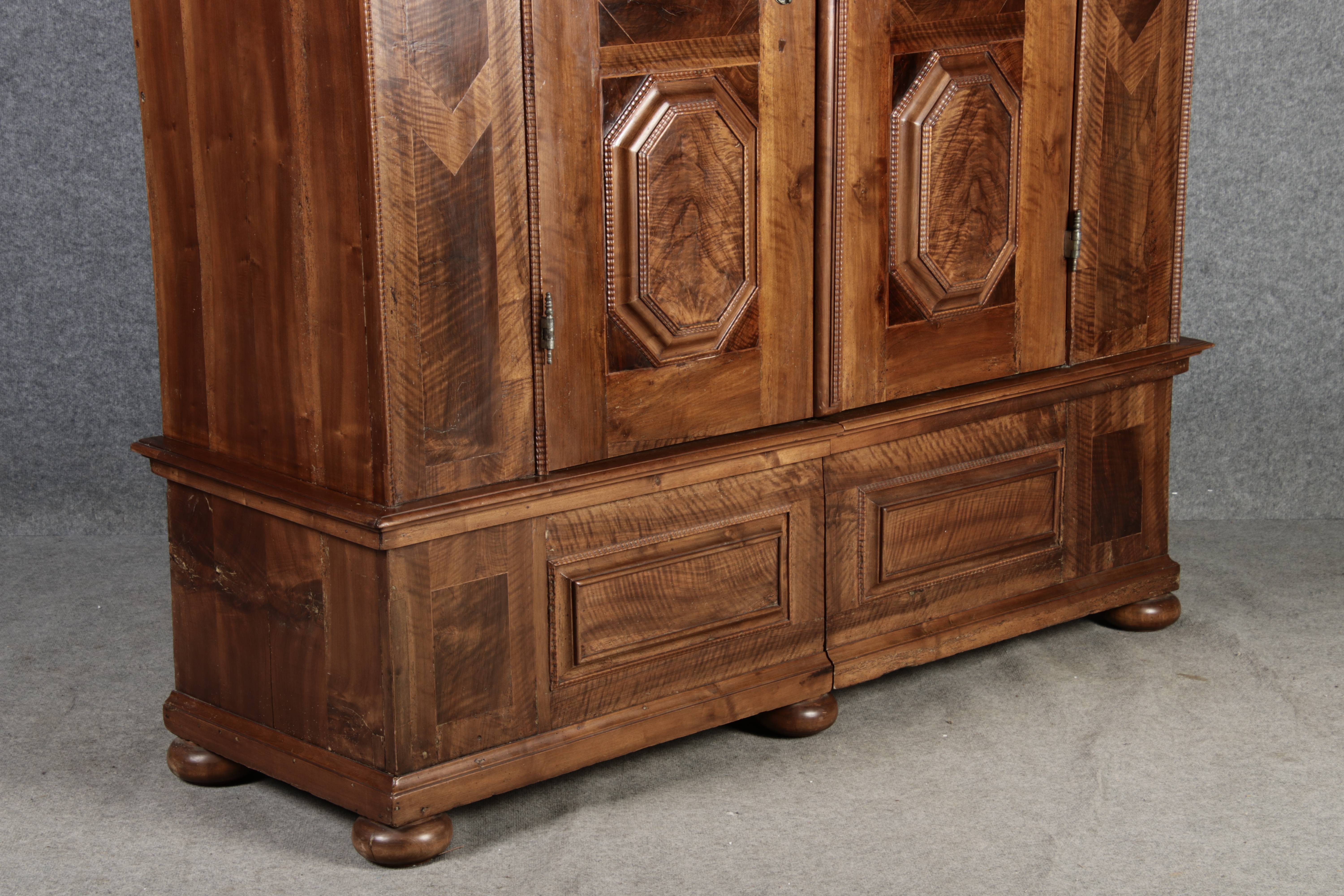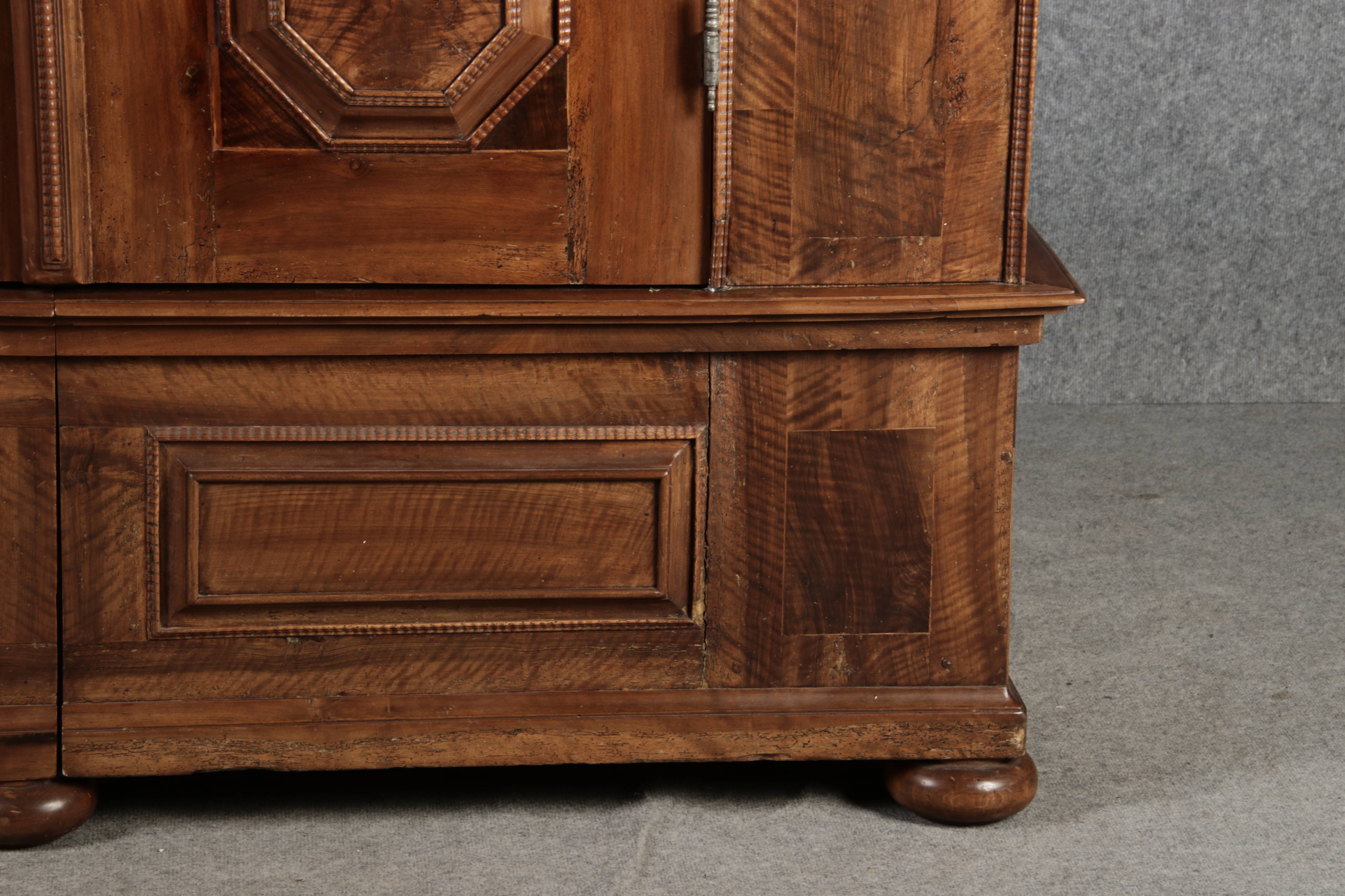 Antiker Renaissance Früh Barock Schrank um 1680 Nussbaum auf Weichholz mit Eisenschloss und Schlüssel In dem Buch Züricher und Nordschweizer Möbel findet sich auf Seite 113 ein ähnlicher Schrank. Laut Text, Herstellungsort Nordwestschweiz Zürich oder Winterthur und Datierung wurde um 1680-1690 angegeben. Die dendrochronologische Datierung ergab nach 1674.