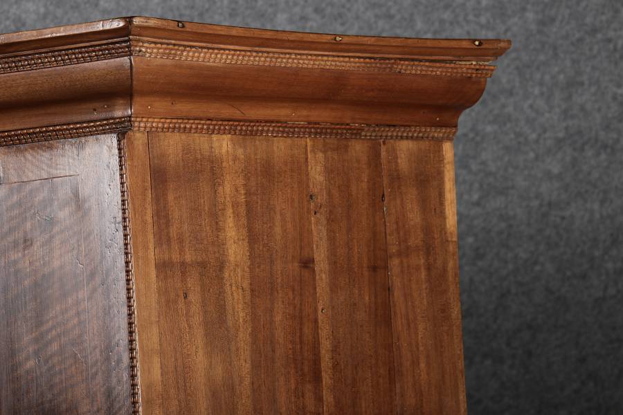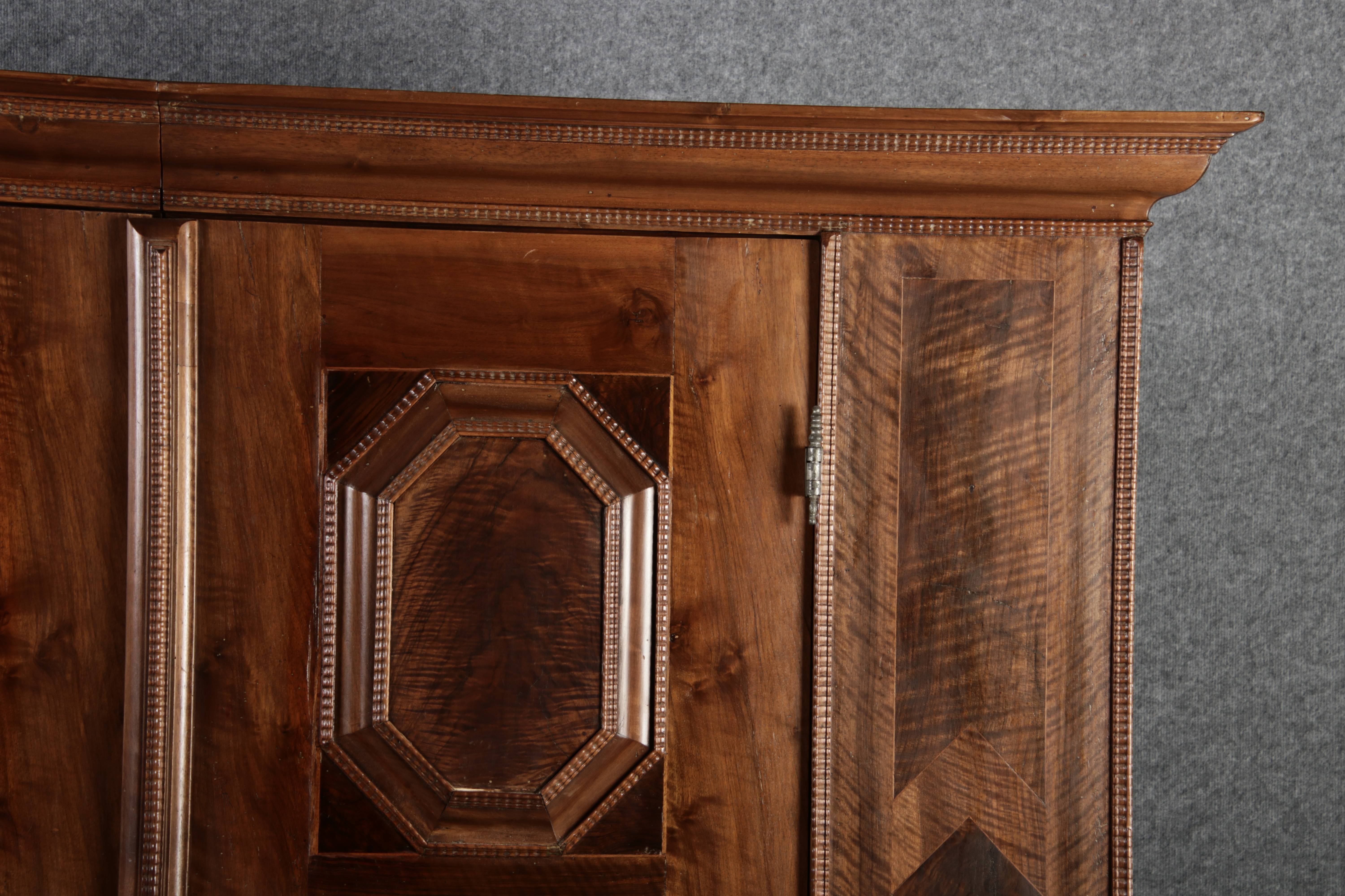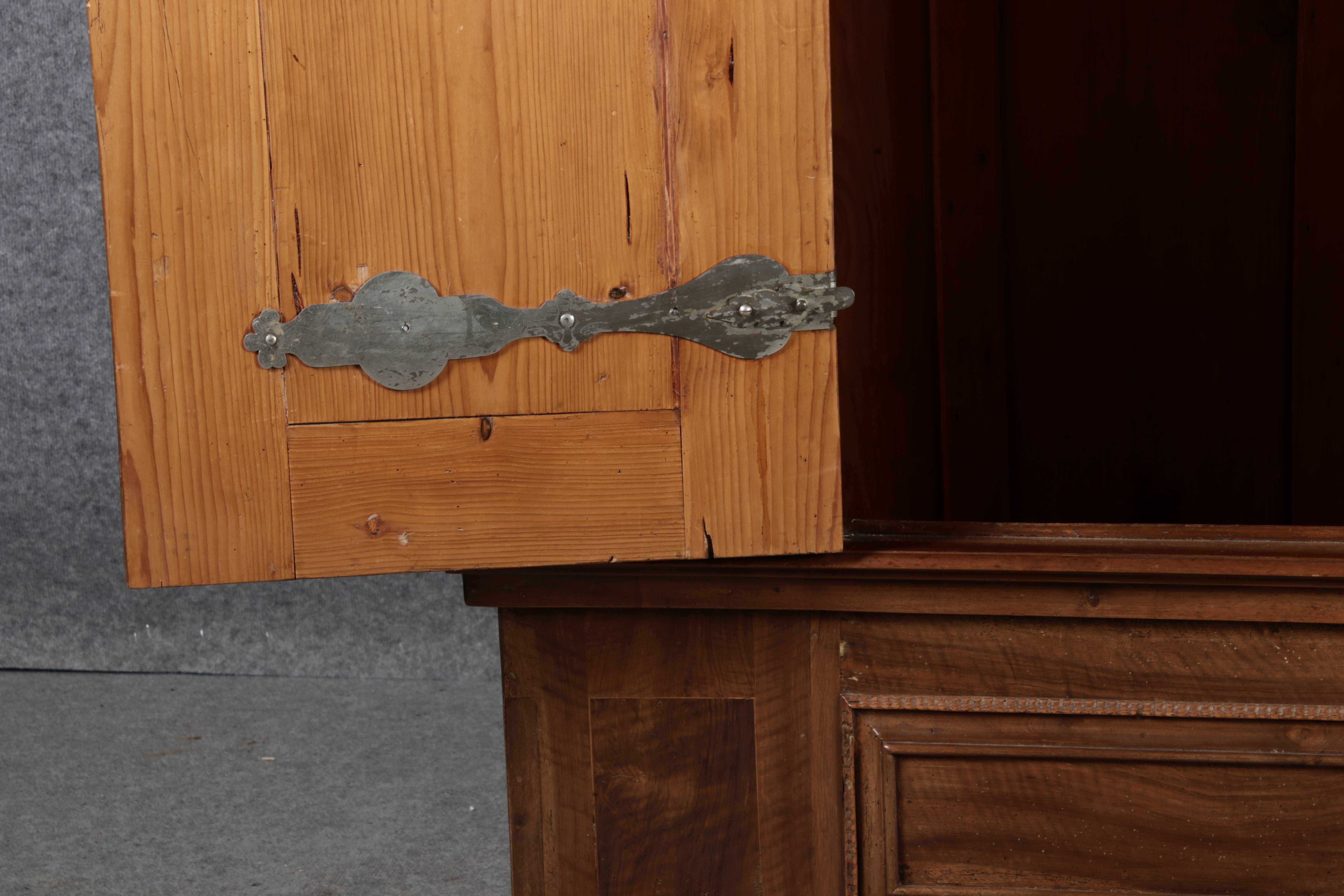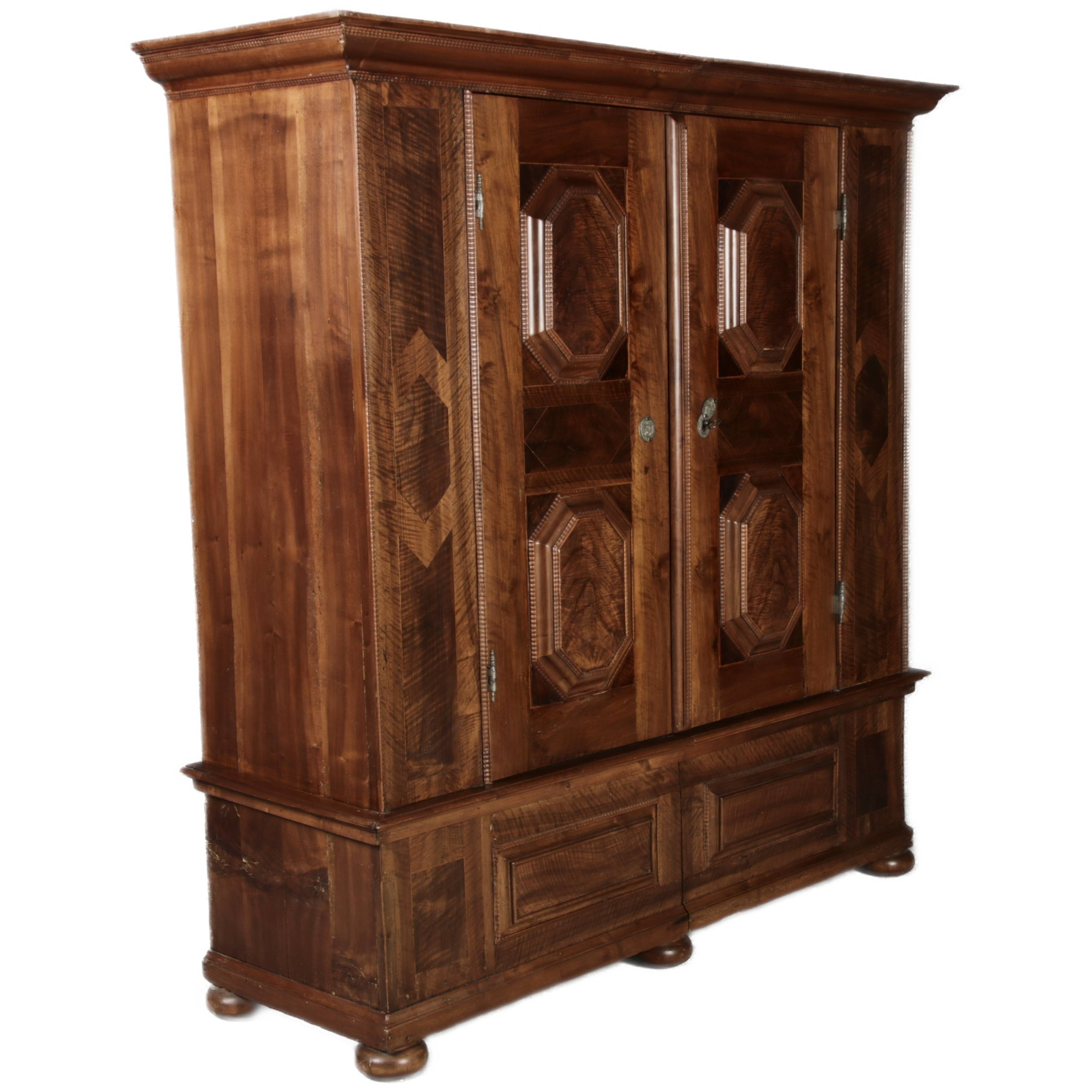 Antiker Renaissance Früh Barock Schrank um 1680 Nussbaum auf Weichholz mit Eisenschloss und Schlüssel In dem Buch Züricher und Nordschweizer Möbel findet sich auf Seite 113 ein ähnlicher Schrank. Laut Text, Herstellungsort Nordwestschweiz Zürich oder Winterthur und Datierung wurde um 1680-1690 angegeben. Die dendrochronologische Datierung ergab nach 1674.