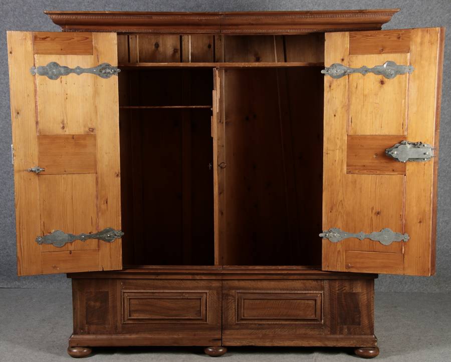 Masse/dimensions: Höhe/Height ca. 203 cm, Breite Korpus/Broad Boda ca. 179 cm, Breite Gesims/Broad cornice ca. 197 cm, Tiefe Korpus/Deep body ca. 59 cm, Tiefe Gesims/Deep cornice ca. 67 cm,