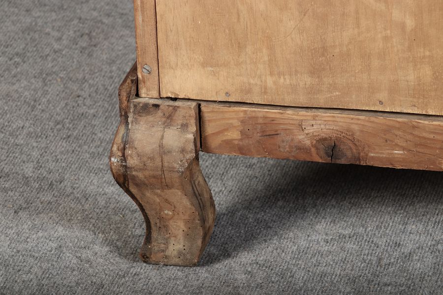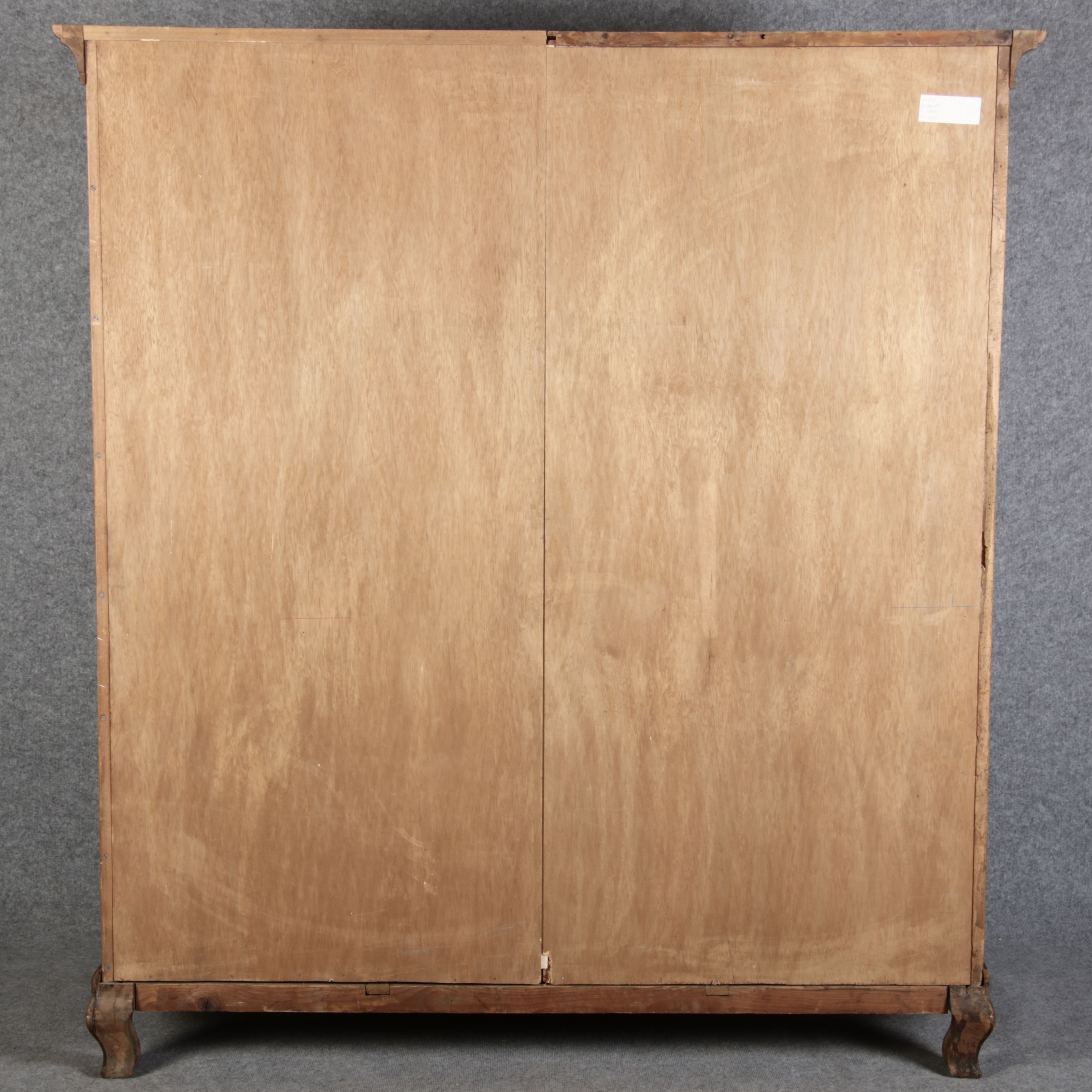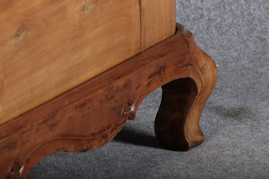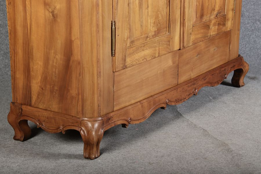 Schrank steht in einem Sockel mir geschwungenen Füßen. In der Front zwei