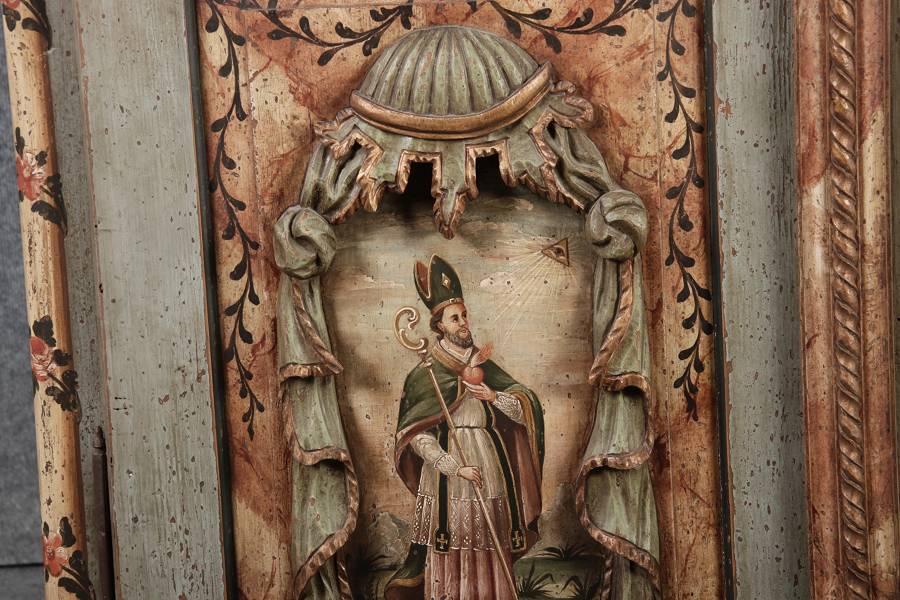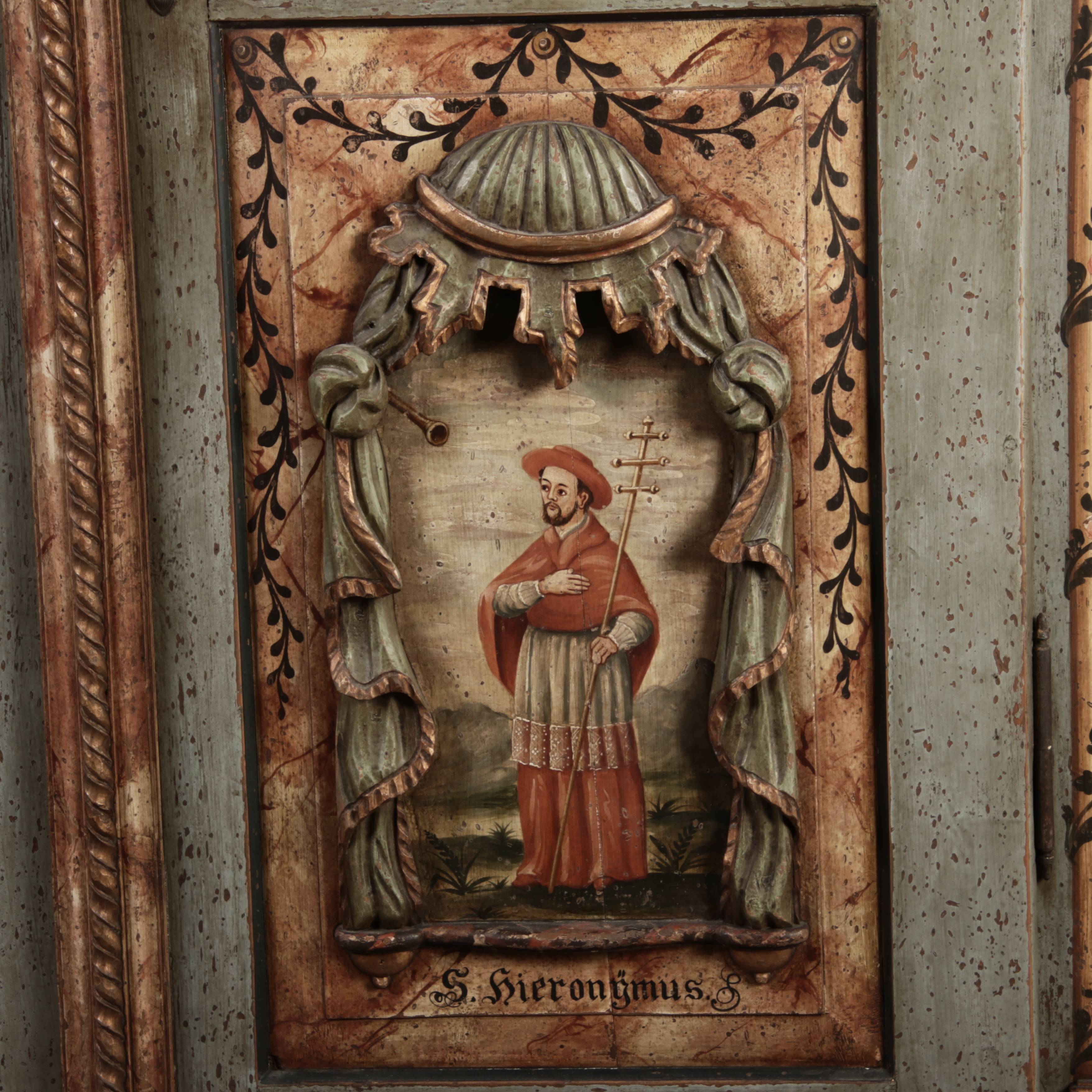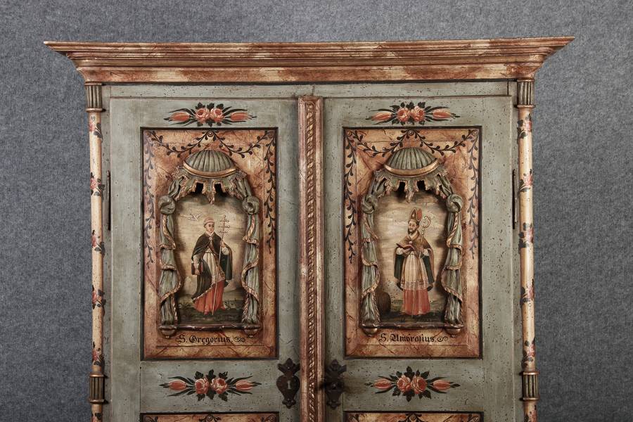 Beschreibung/description: Barockschrank aus dem 19 Jh. mit aufwendig geschnitzten Türfeldern.Die vier Felder mit Schnitzwerk und Darstellungen von S. Gregorius, S. Ambrosius, S. Augustinus und S. Hieronymus ArtikelNummer /number: sch122