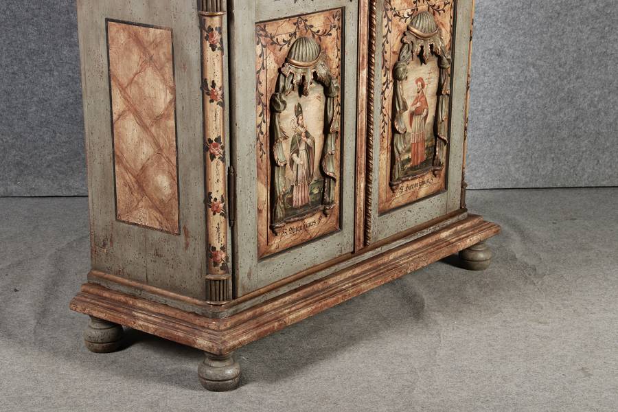 Barockschrank aus dem 19 Jh. mit aufwendig geschnitzten Türfeldern.Die vier Felder mit Schnitzwerk und Darstellungen von S. Gregorius, S. Ambrosius, S. Augustinus und S. Hieronymus
