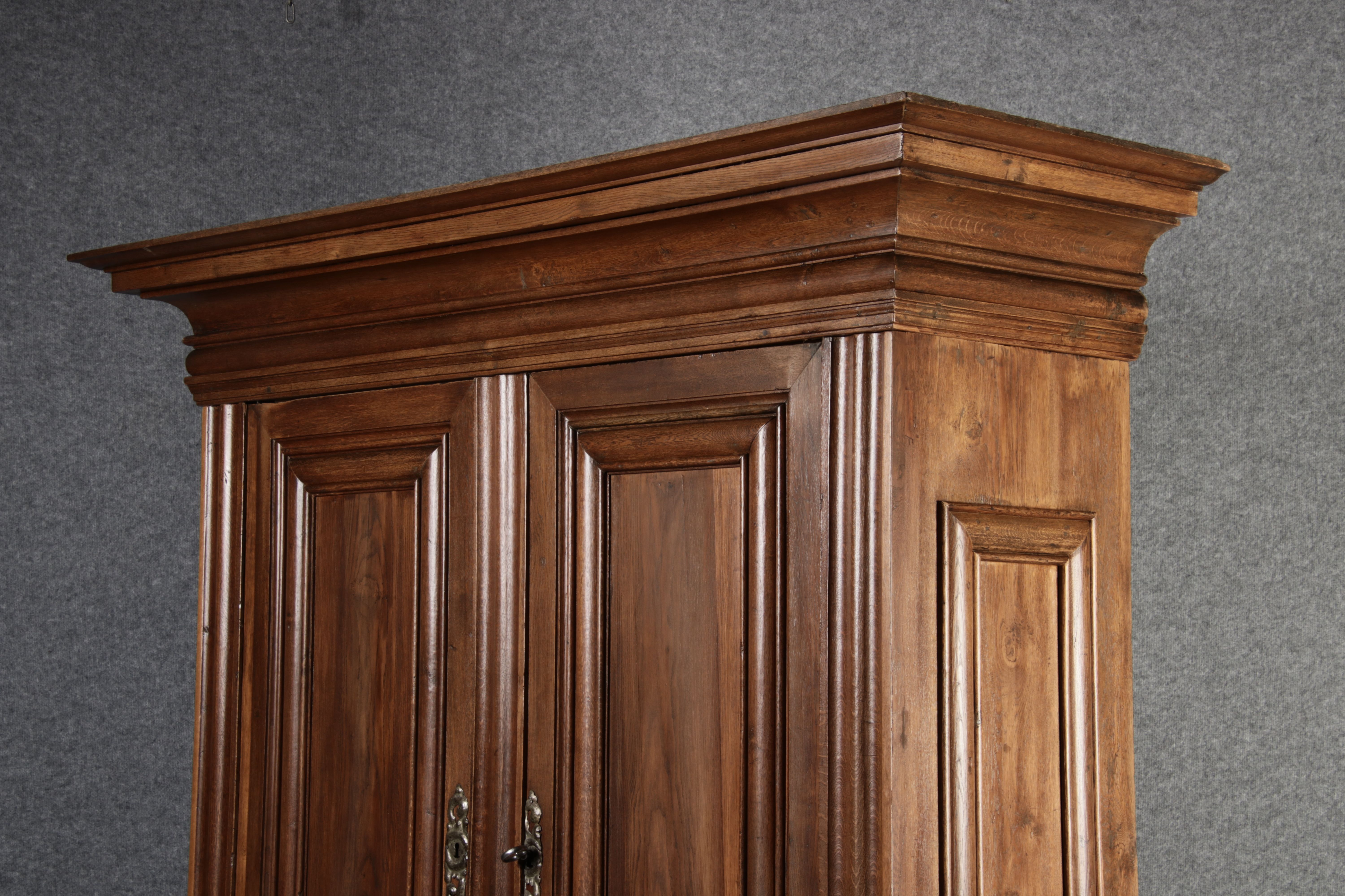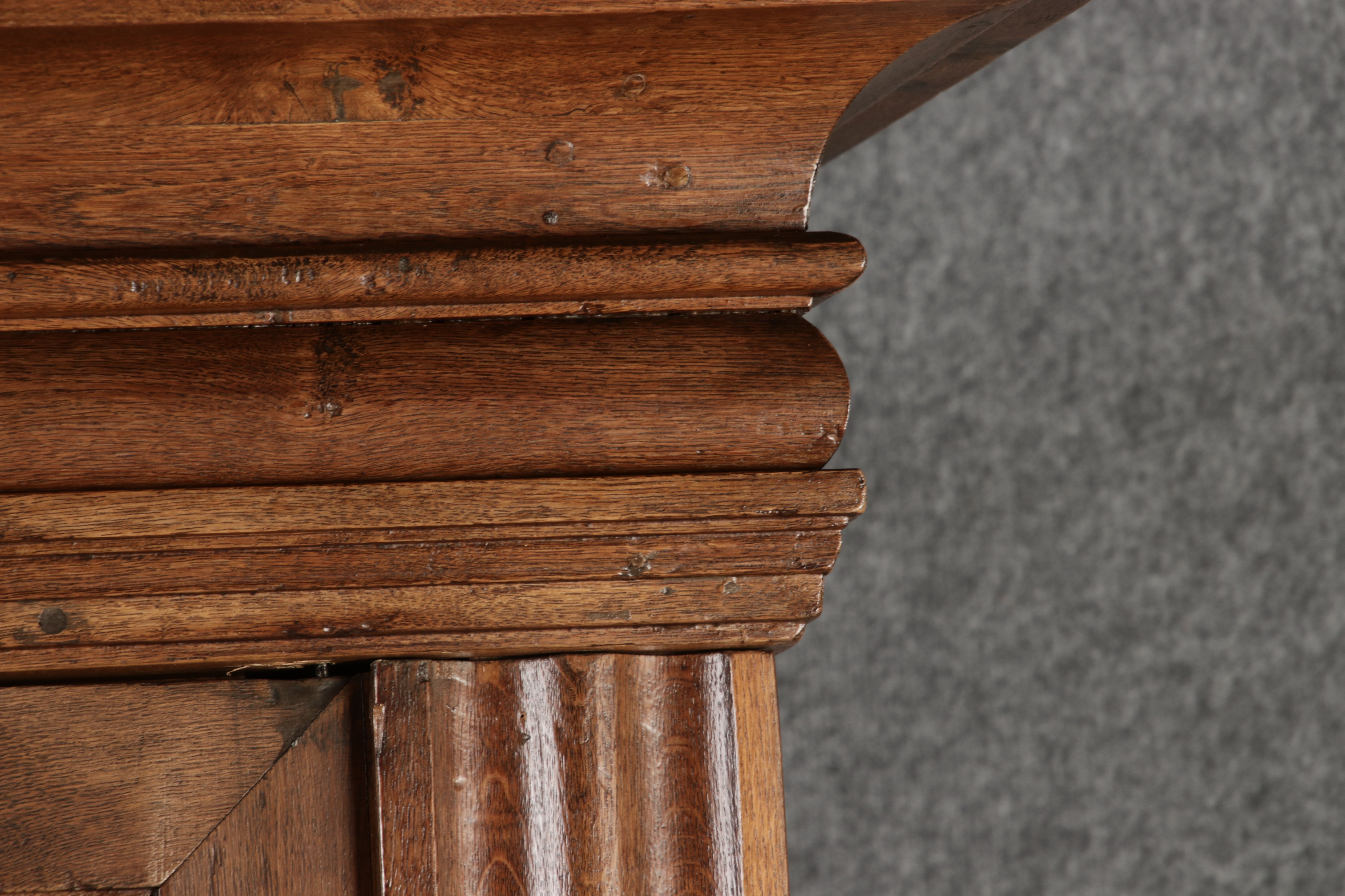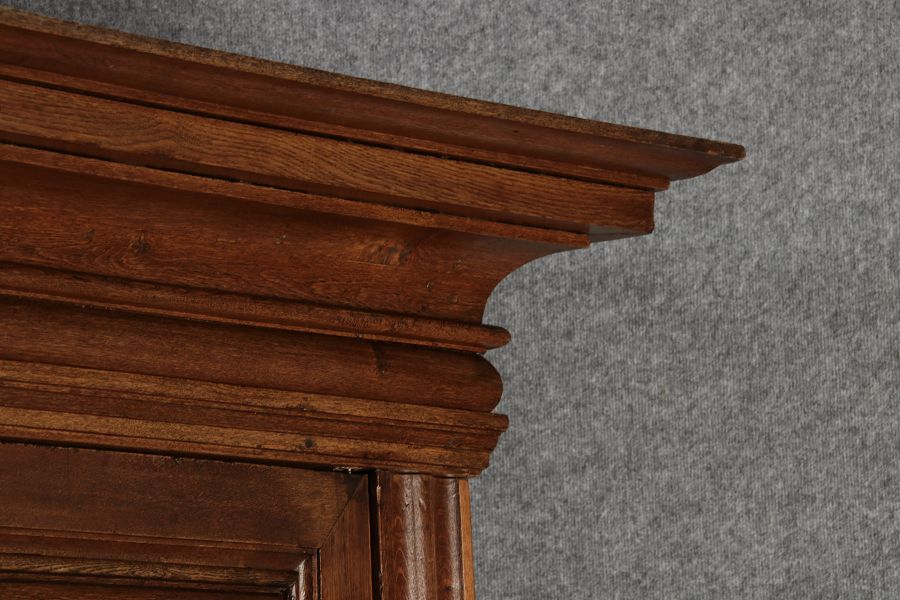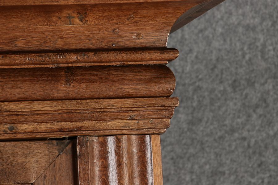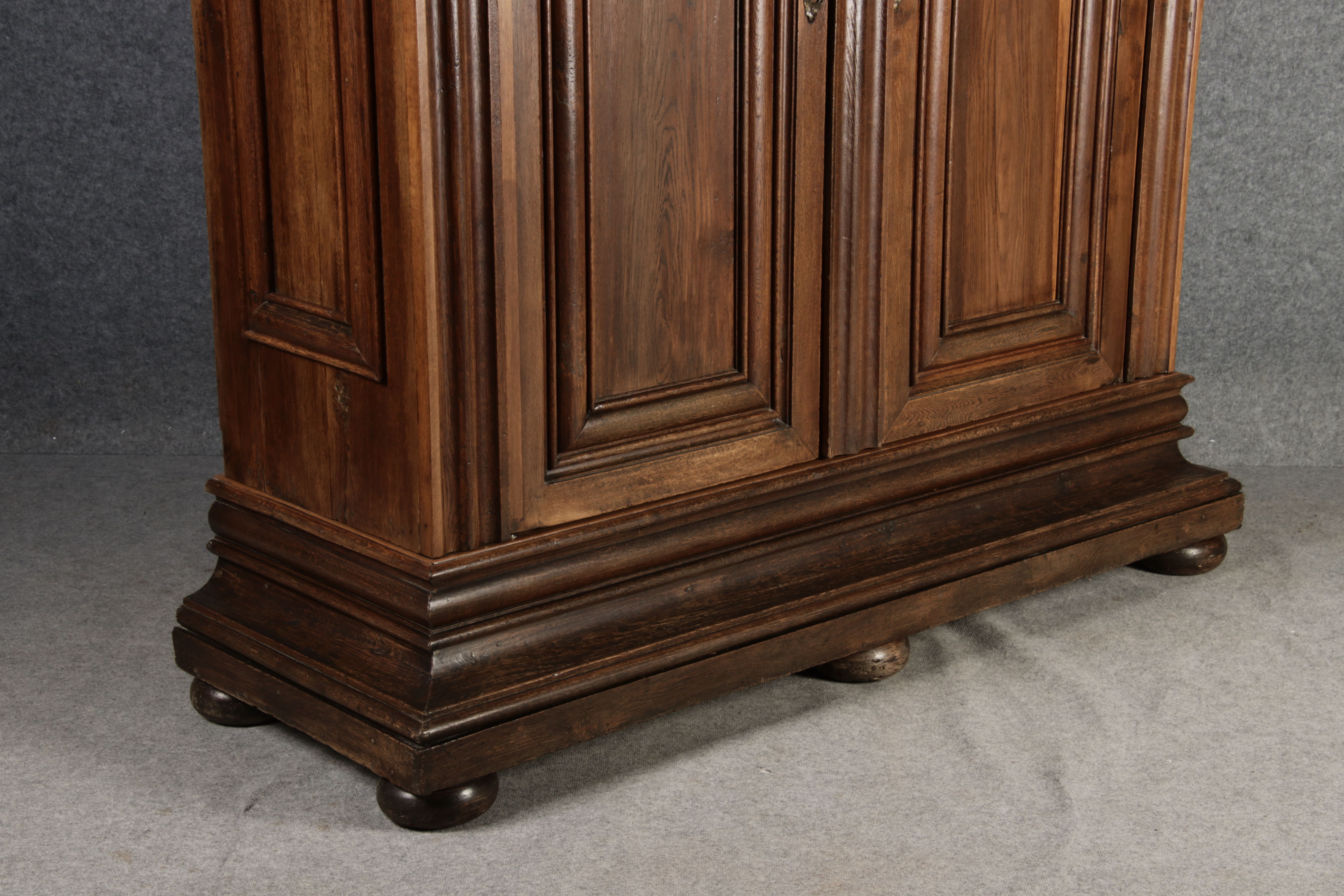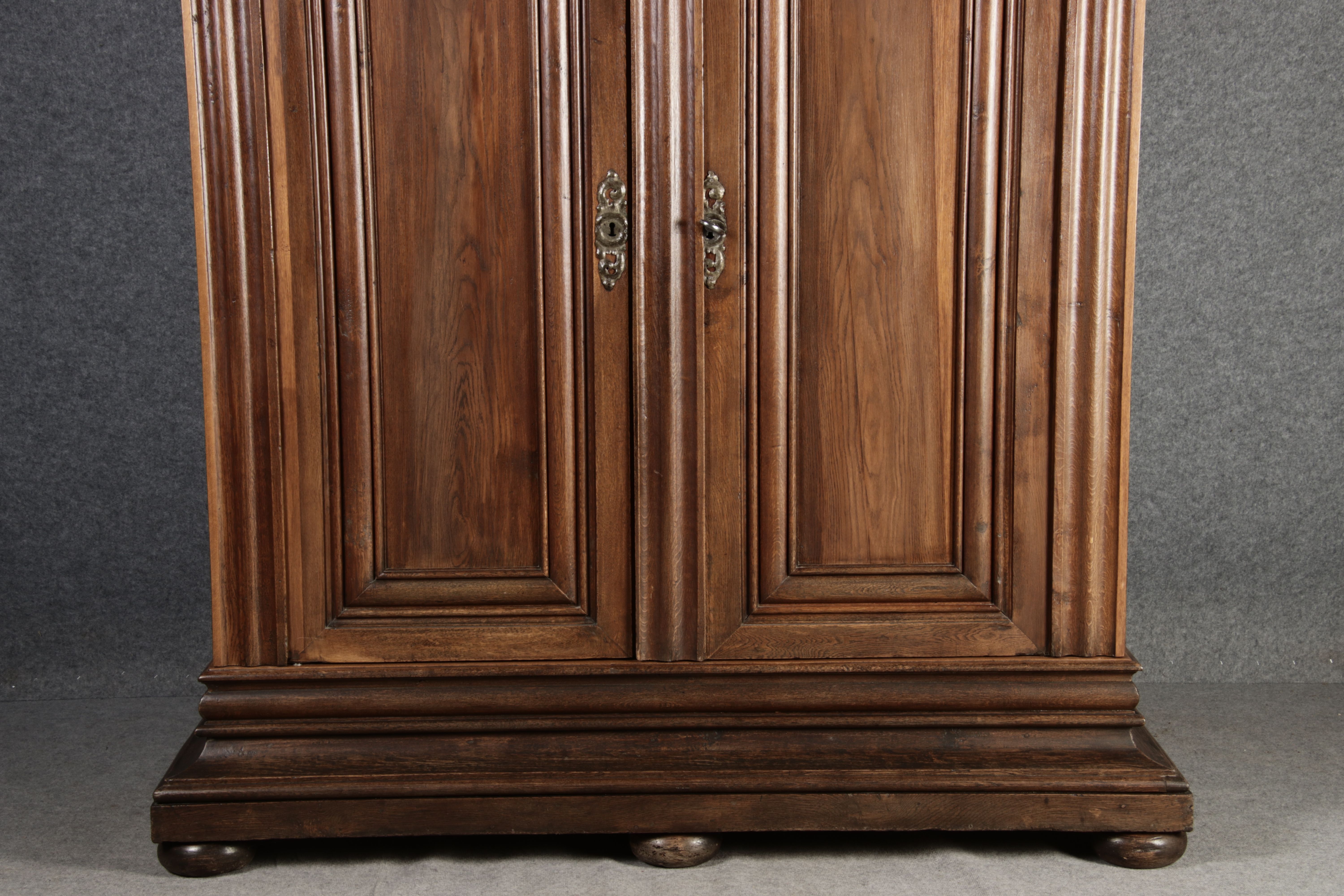 Antiker sehr hoher Frankfurter Barock Wellenschrank Eiche massiv aus dem 18 Jh. Der Schrank stand im Fränkischen Kloster Maria Hilf und wurde dort als Garderobenschrank genutzt. Der Schrank wurde innen von einem Schreiner mit neuen Sperrholz Platten ausgeschlagen, damit er innen ein sauberes Erscheinungsbild hat. Durch seine Höhe von 241 cm hat er ein Dominates Erscheinungsbild und ist in jedem Raum ein besonderes Stück. |