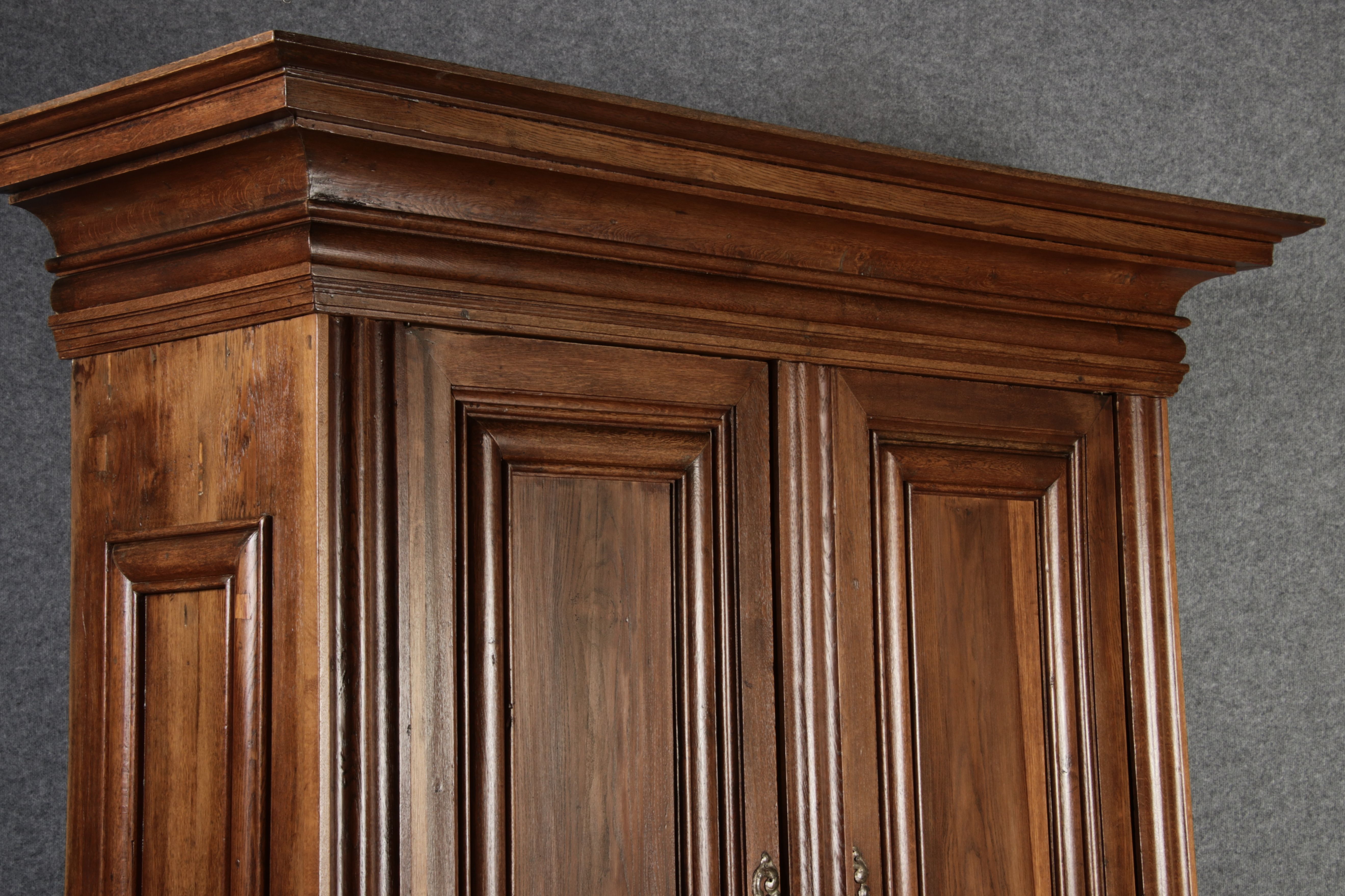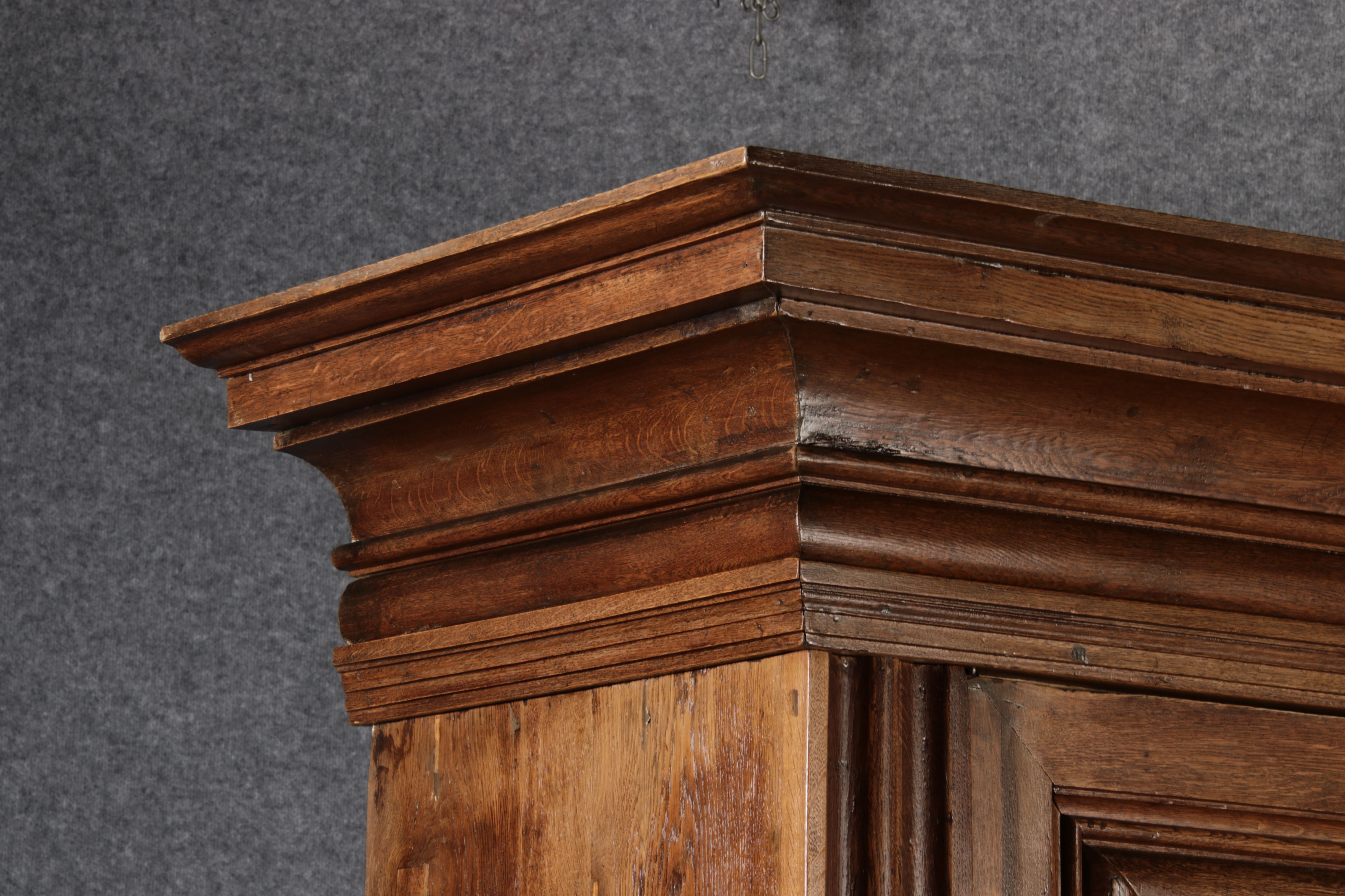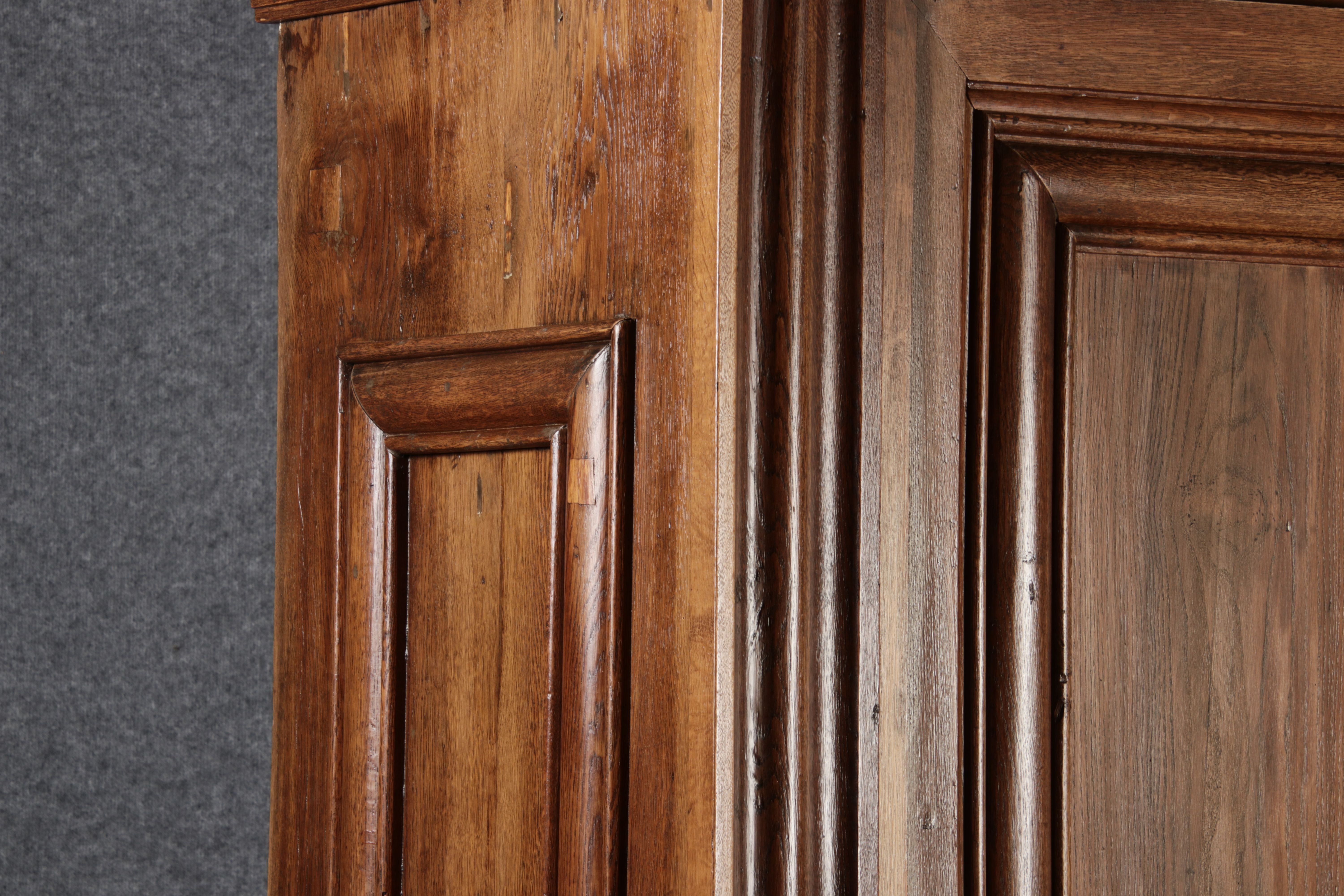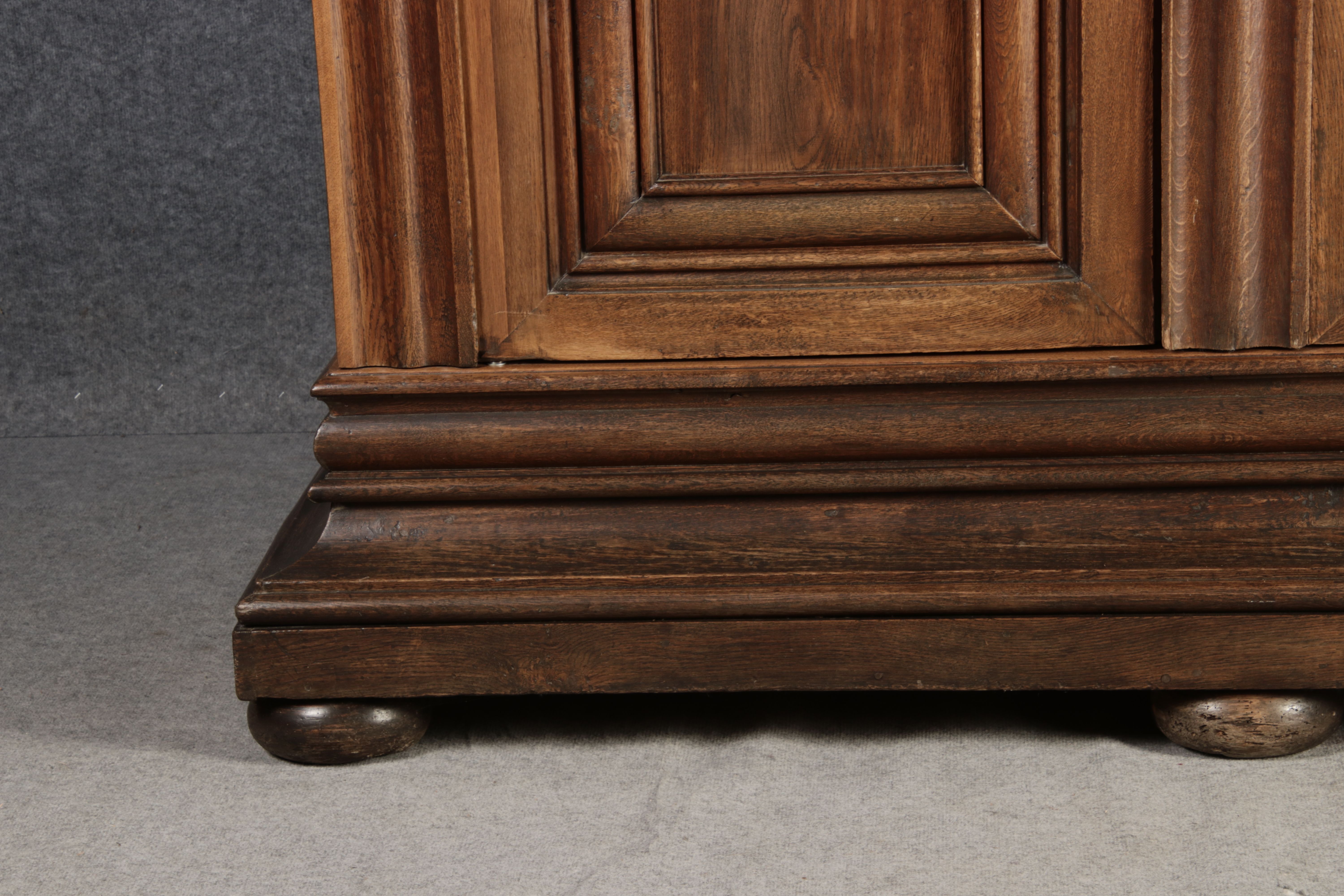 Antiker sehr hoher Frankfurter Barock Wellenschrank Eiche massiv aus dem 18 Jh. Der Schrank stand im Fränkischen Kloster Maria Hilf und wurde dort als Garderobenschrank genutzt. Der Schrank wurde innen von einem Schreiner mit neuen Sperrholz Platten ausgeschlagen, damit er innen ein sauberes Erscheinungsbild hat. Durch seine Höhe von 241 cm hat er ein Dominates Erscheinungsbild und ist in jedem Raum ein besonderes Stück. |