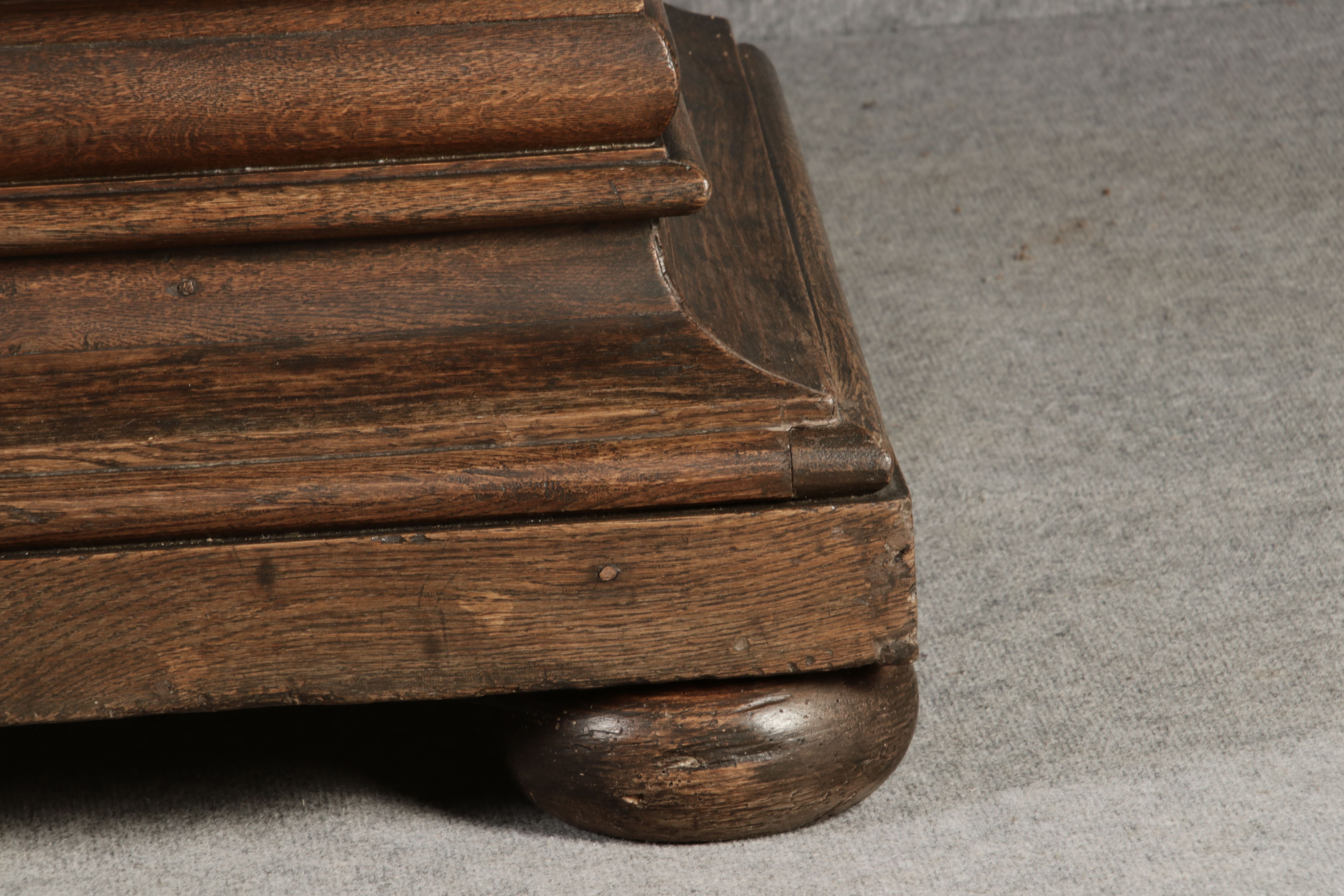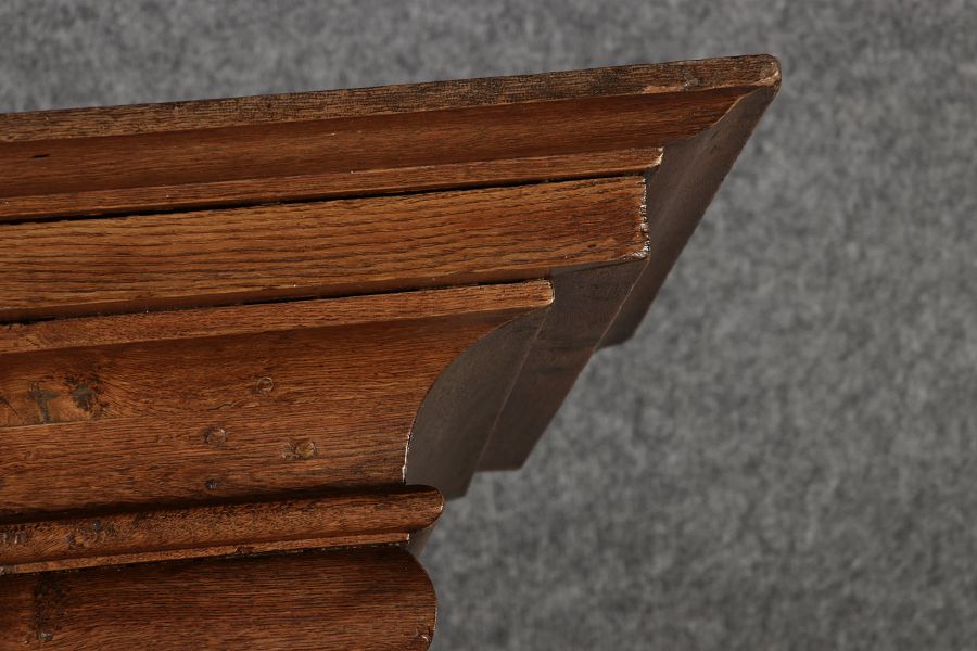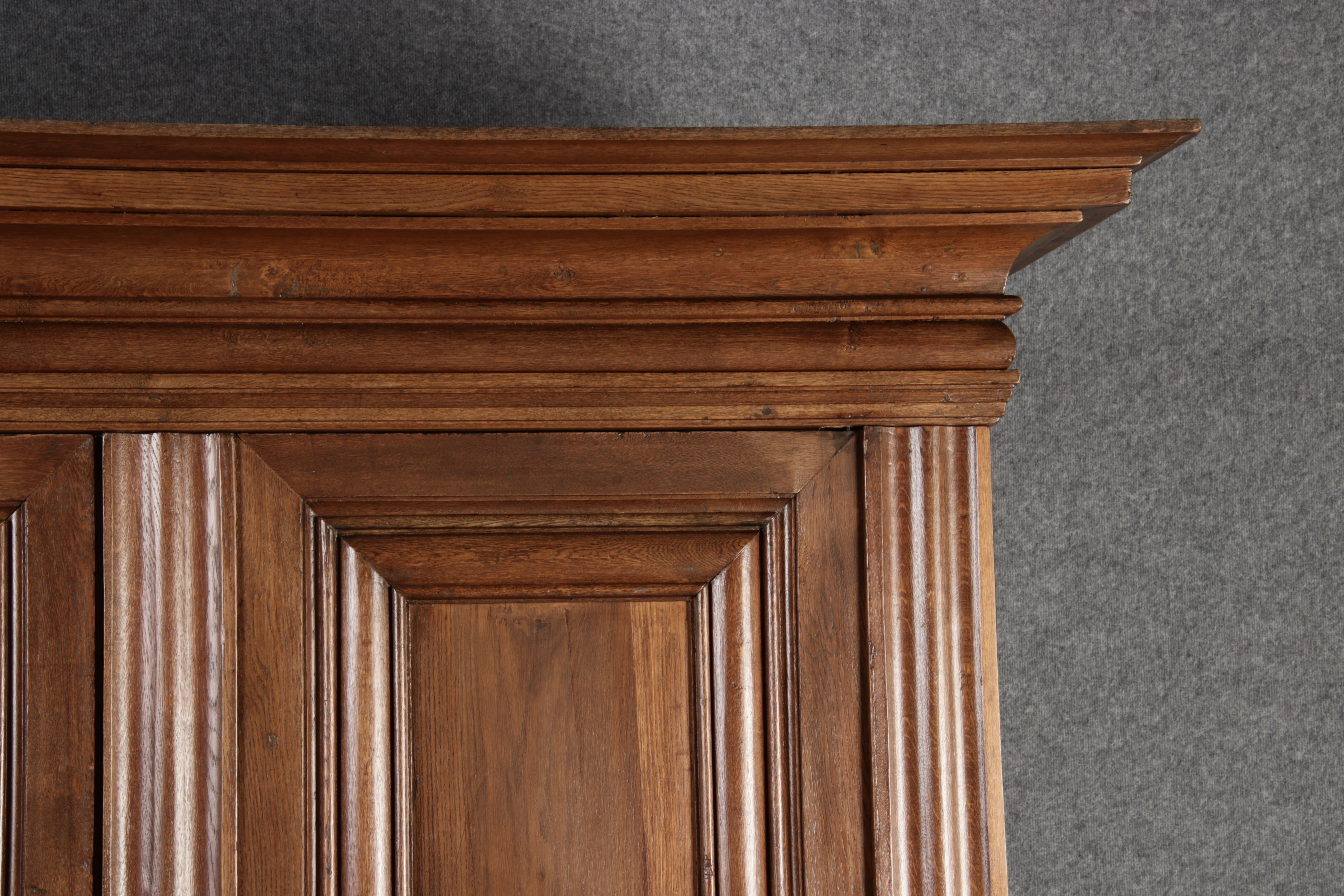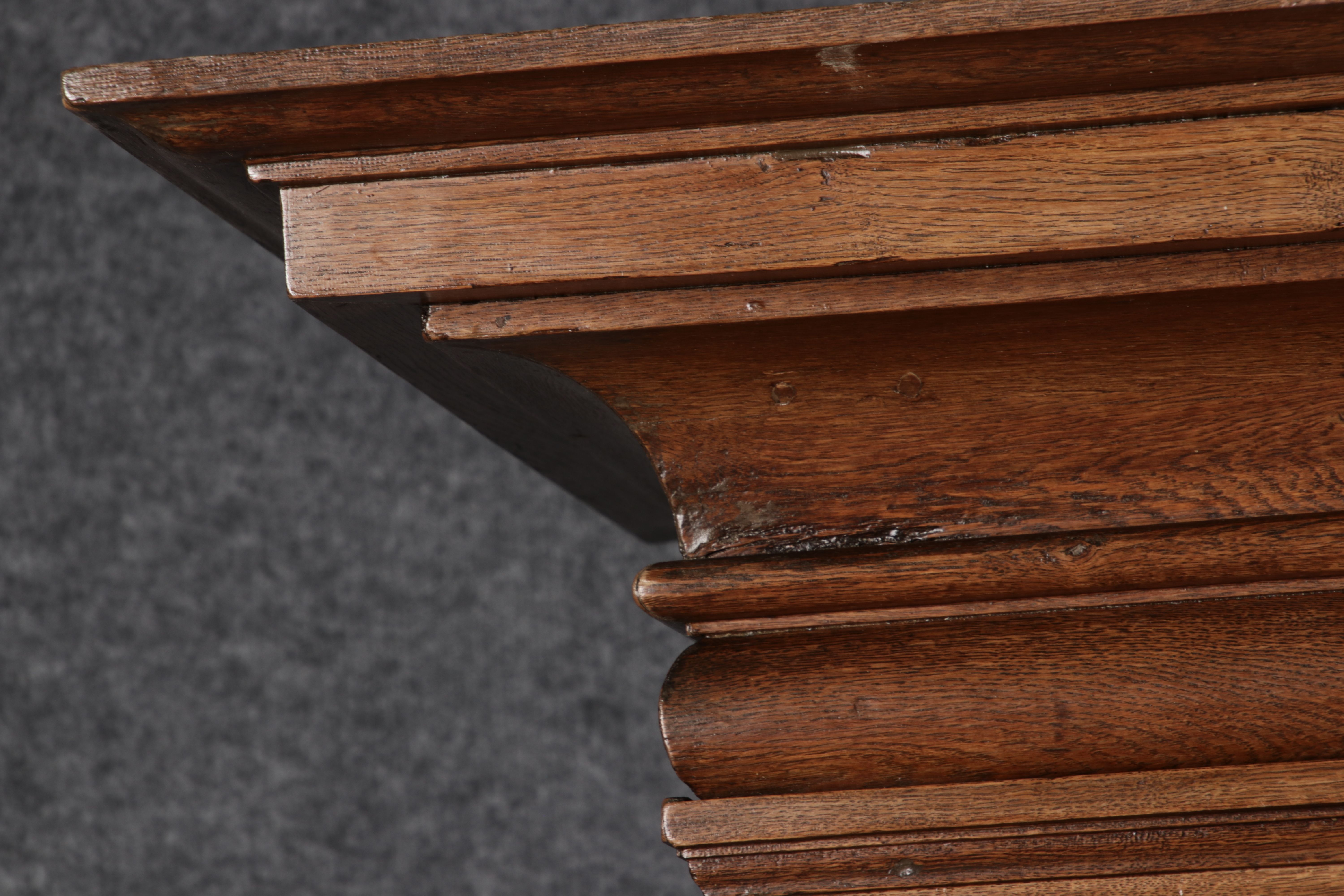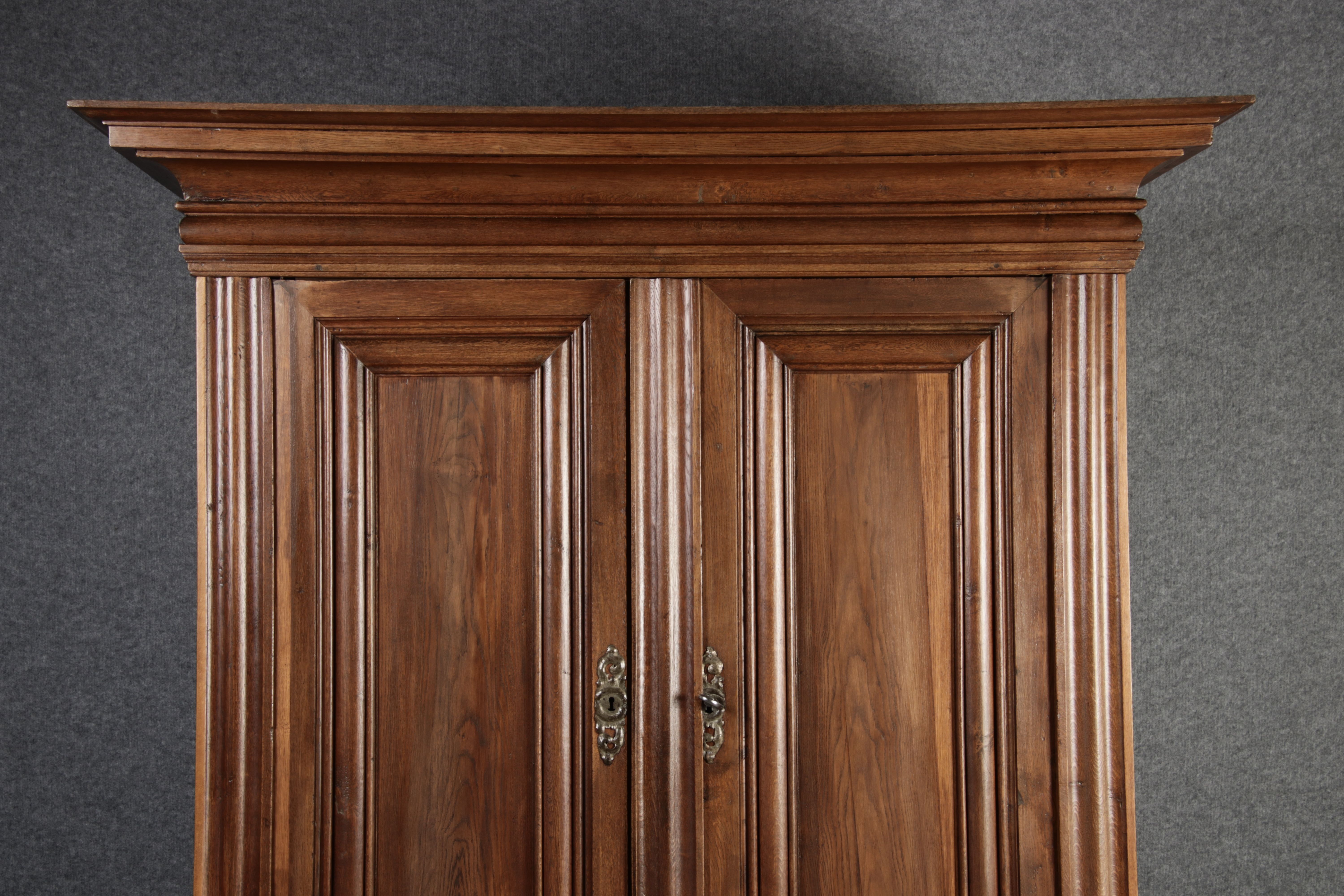 Antiker sehr hoher Frankfurter Barock Wellenschrank Eiche massiv aus dem 18 Jh. Der Schrank stand im Fränkischen Kloster Maria Hilf und wurde dort als Garderobenschrank genutzt. Der Schrank wurde innen von einem Schreiner mit neuen Sperrholz Platten ausgeschlagen, damit er innen ein sauberes Erscheinungsbild hat. Durch seine Höhe von 241 cm hat er ein Dominates Erscheinungsbild und ist in jedem Raum ein besonderes Stück. |
