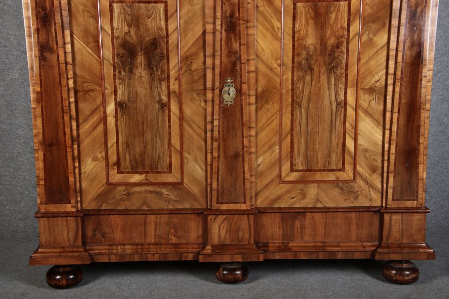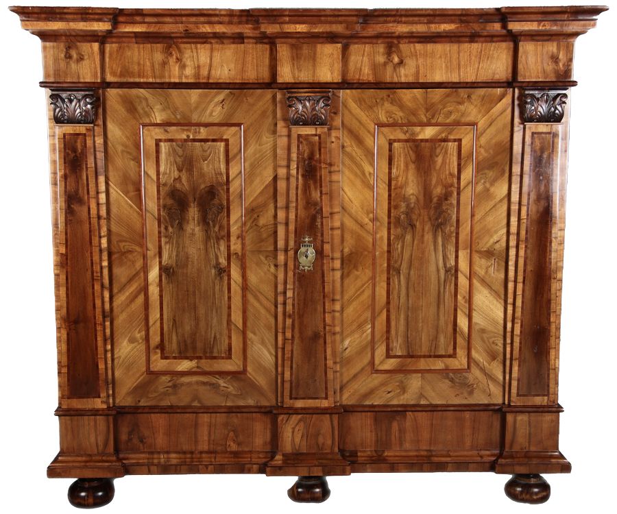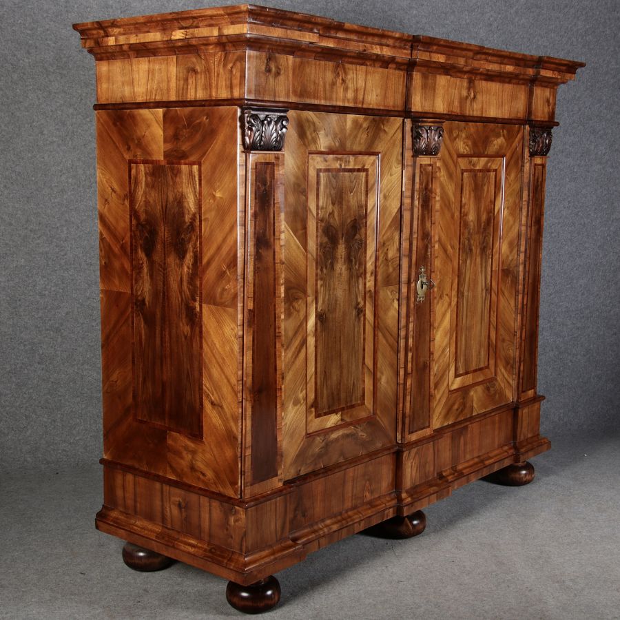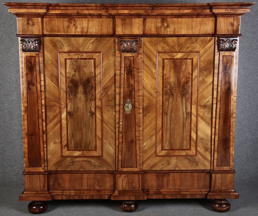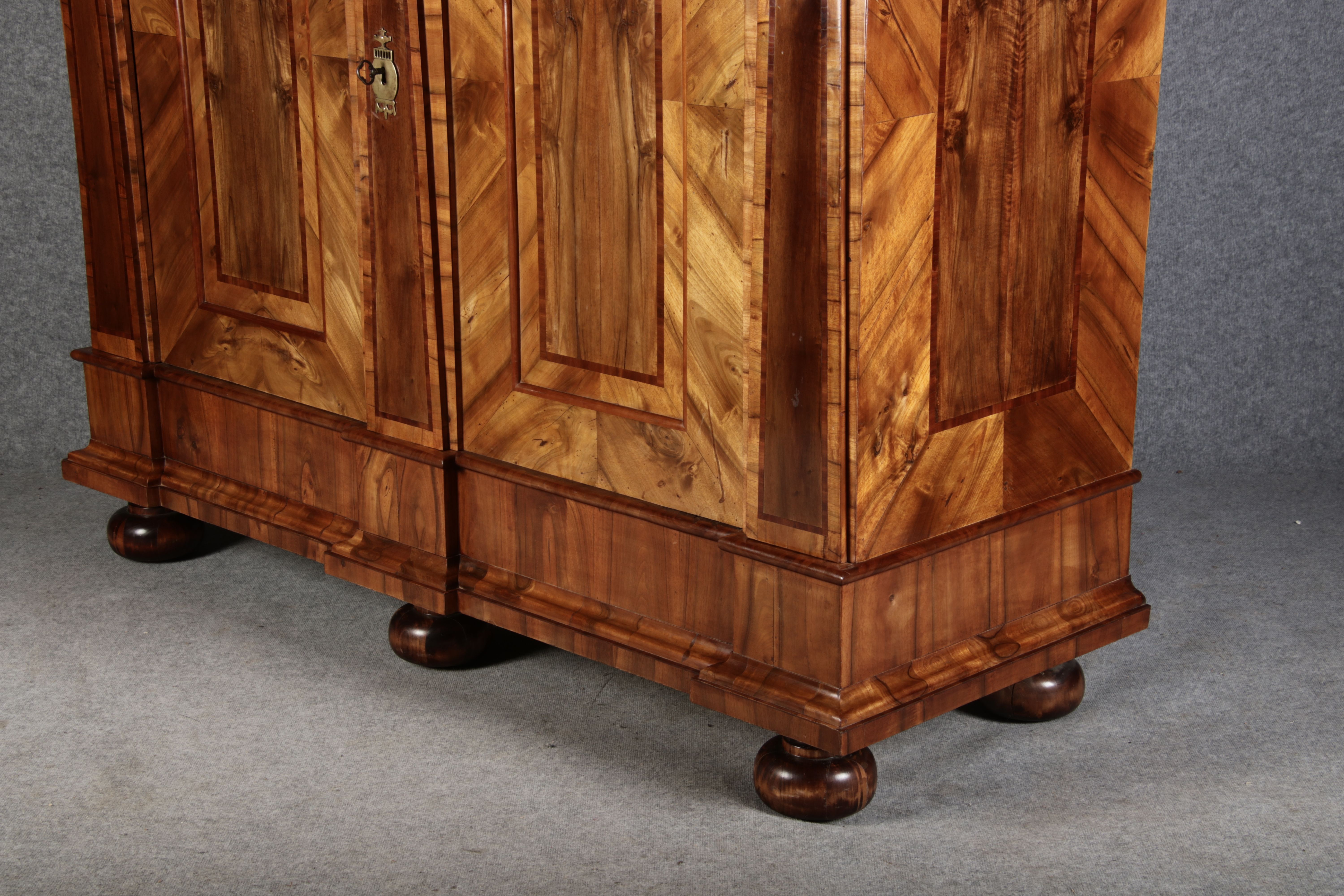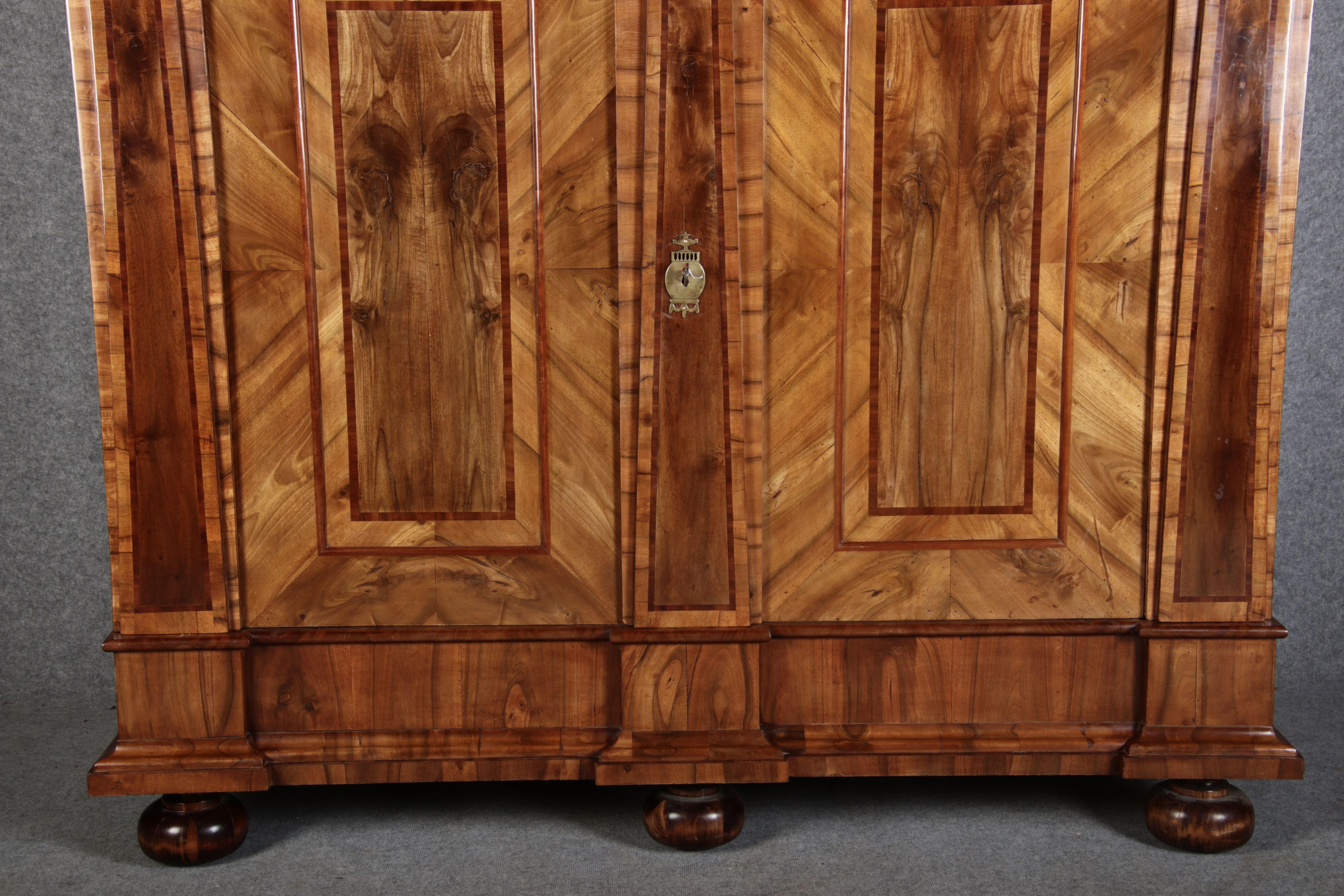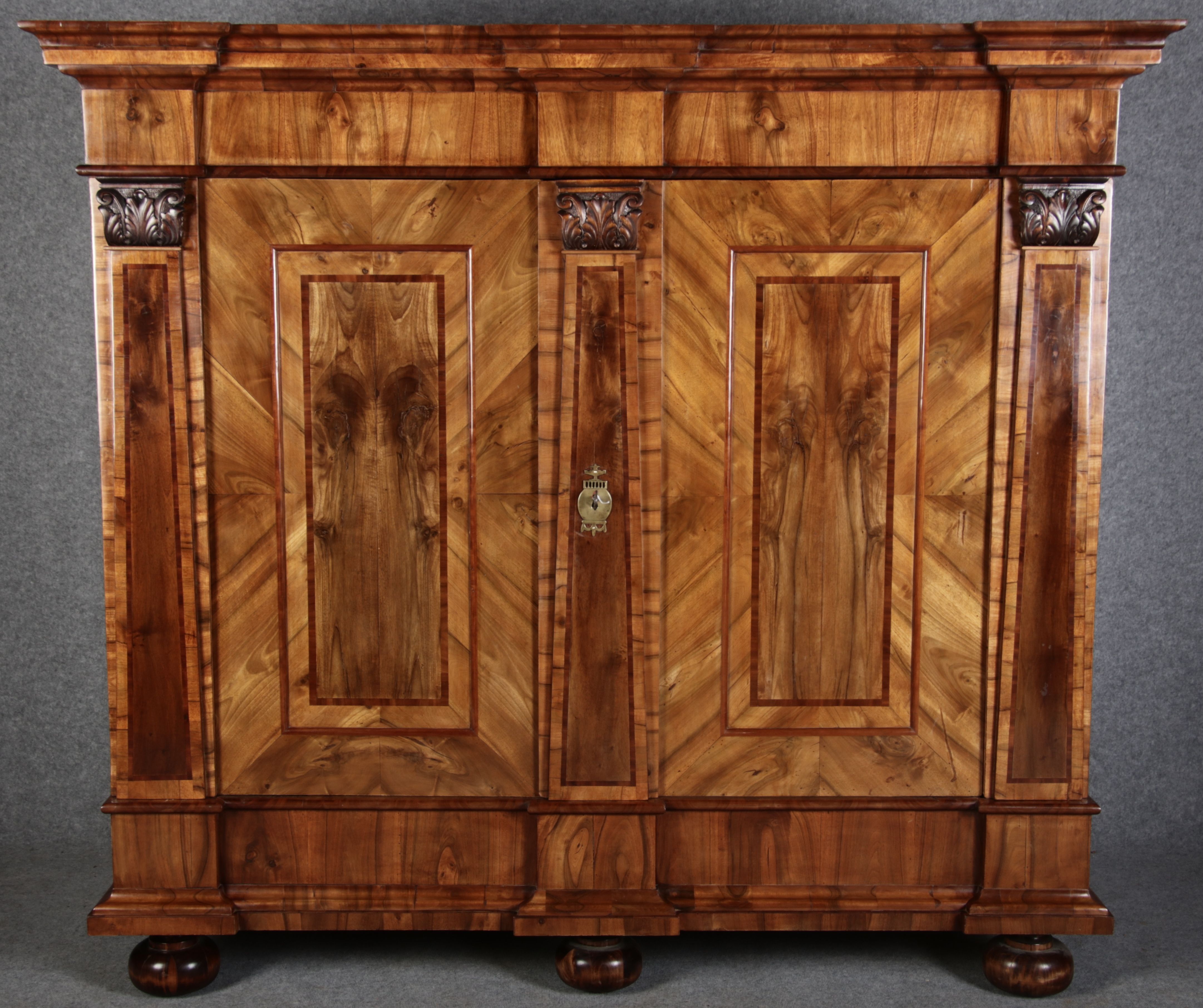 | Großer 230 cm Breiter Antiker Danziger Barockschrank 18 Jh. Nussbaum, Bandeinlagen, Kapitele, Lisenen und Eisenschloss |