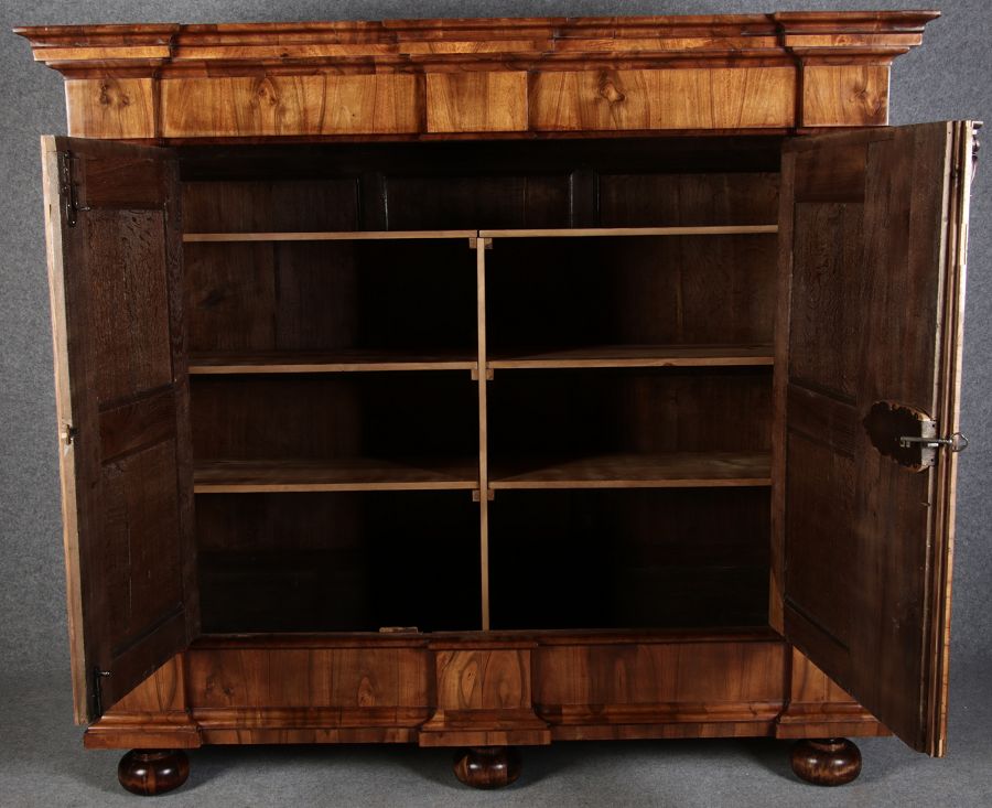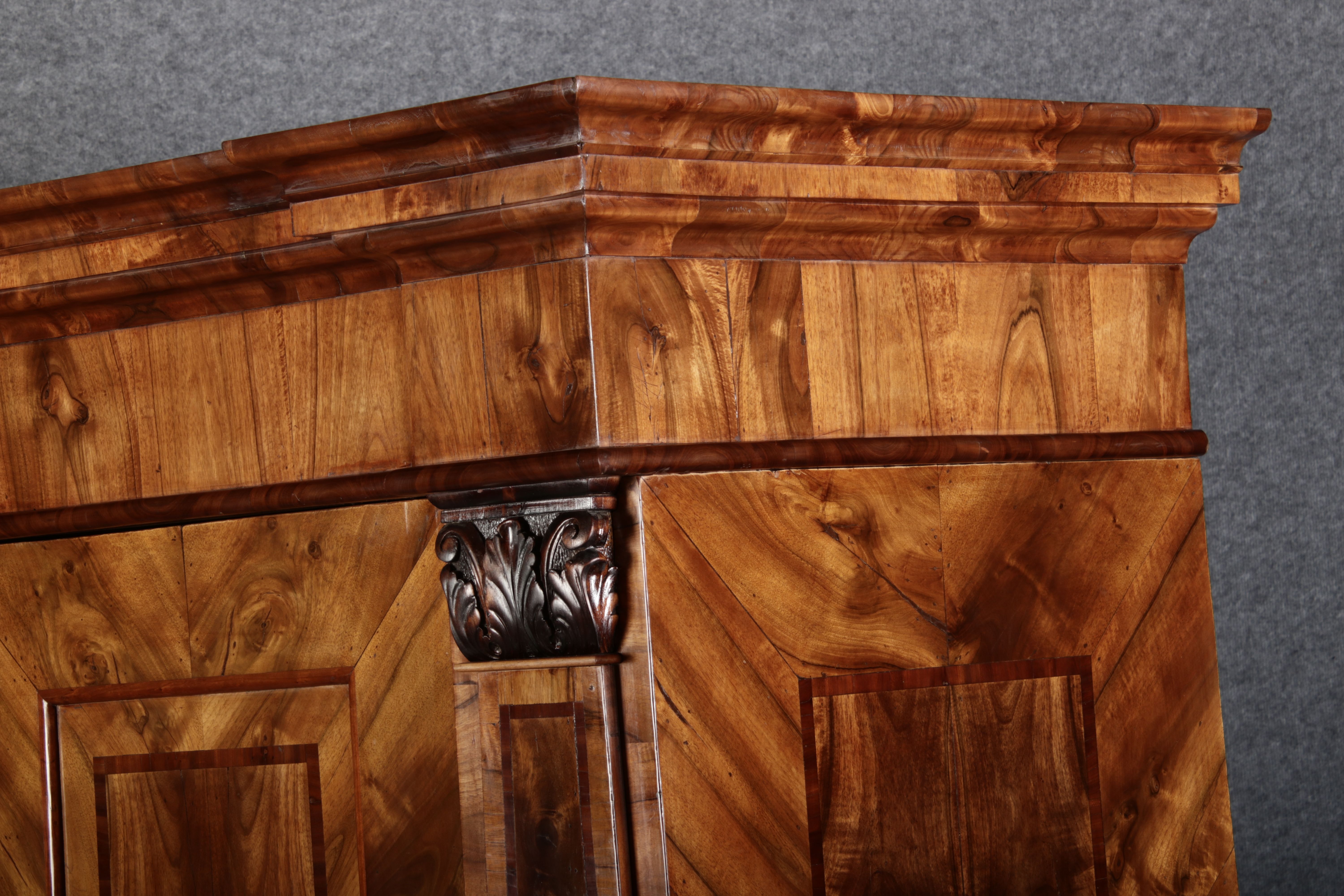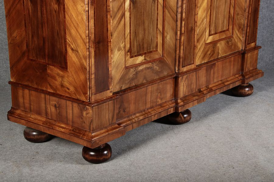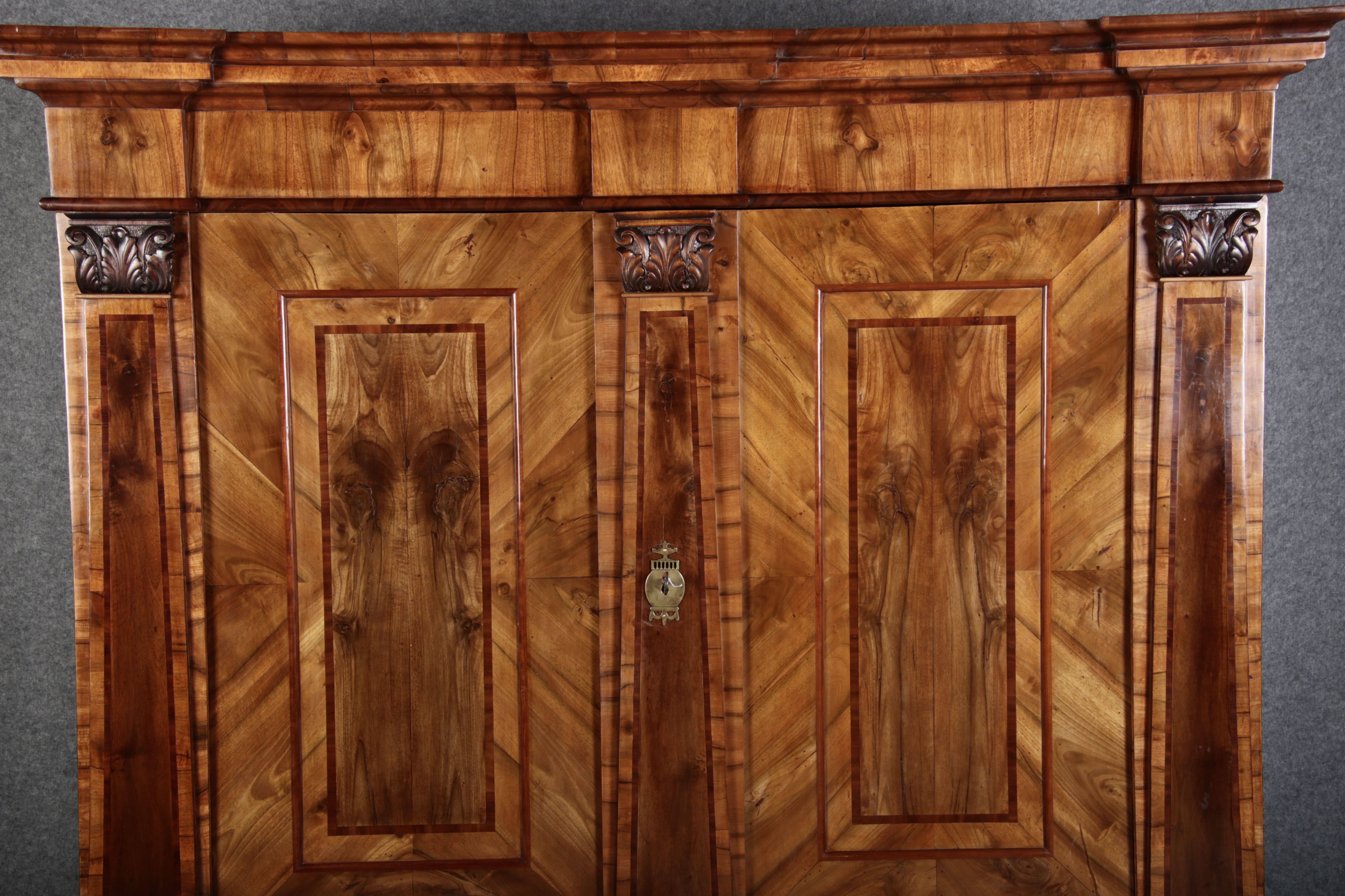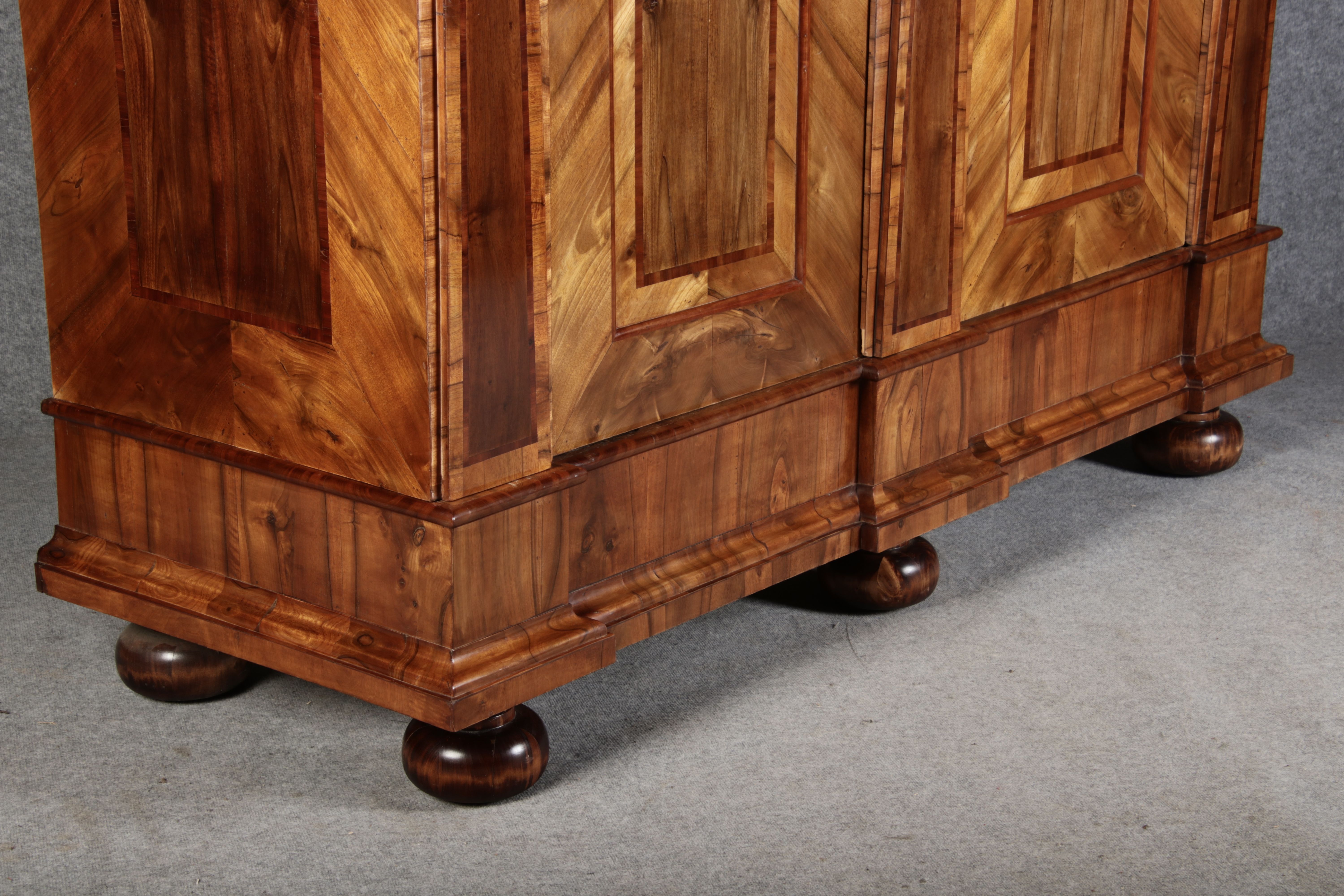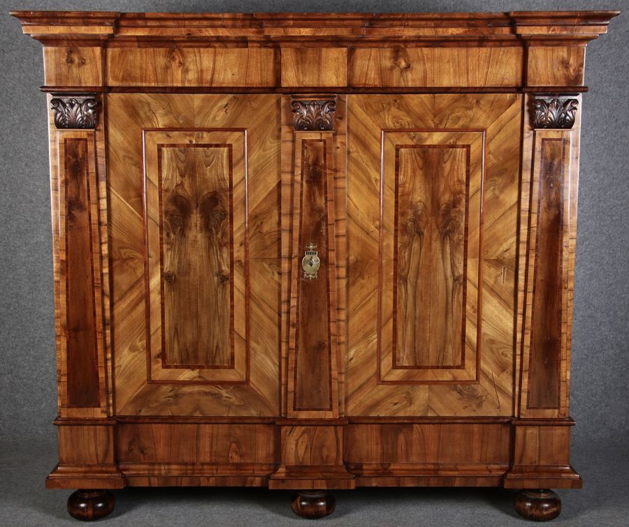 | Großer 230 cm Breiter Antiker Danziger Barockschrank 18 Jh. Nussbaum, Bandeinlagen, Kapitele, Lisenen und Eisenschloss |
