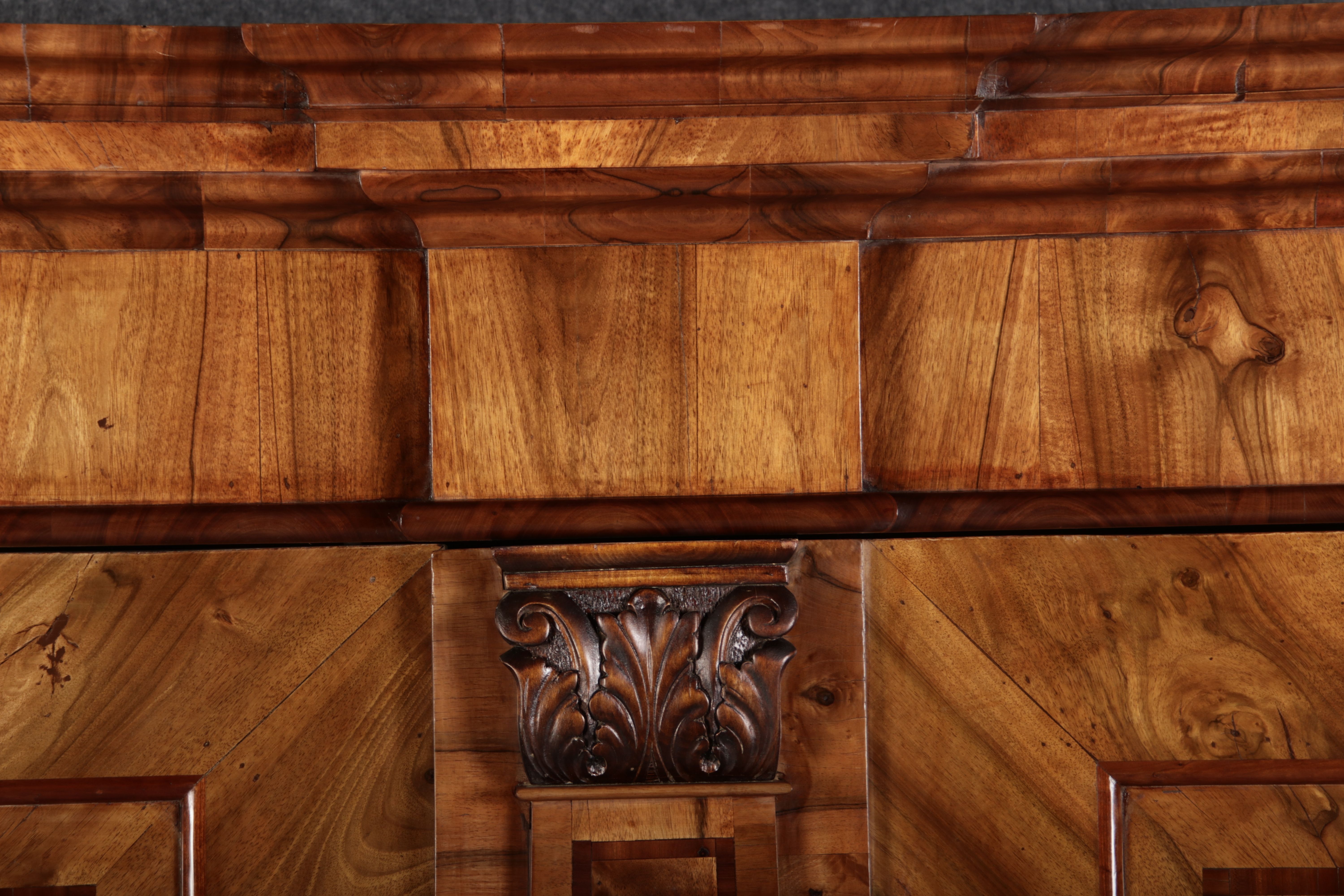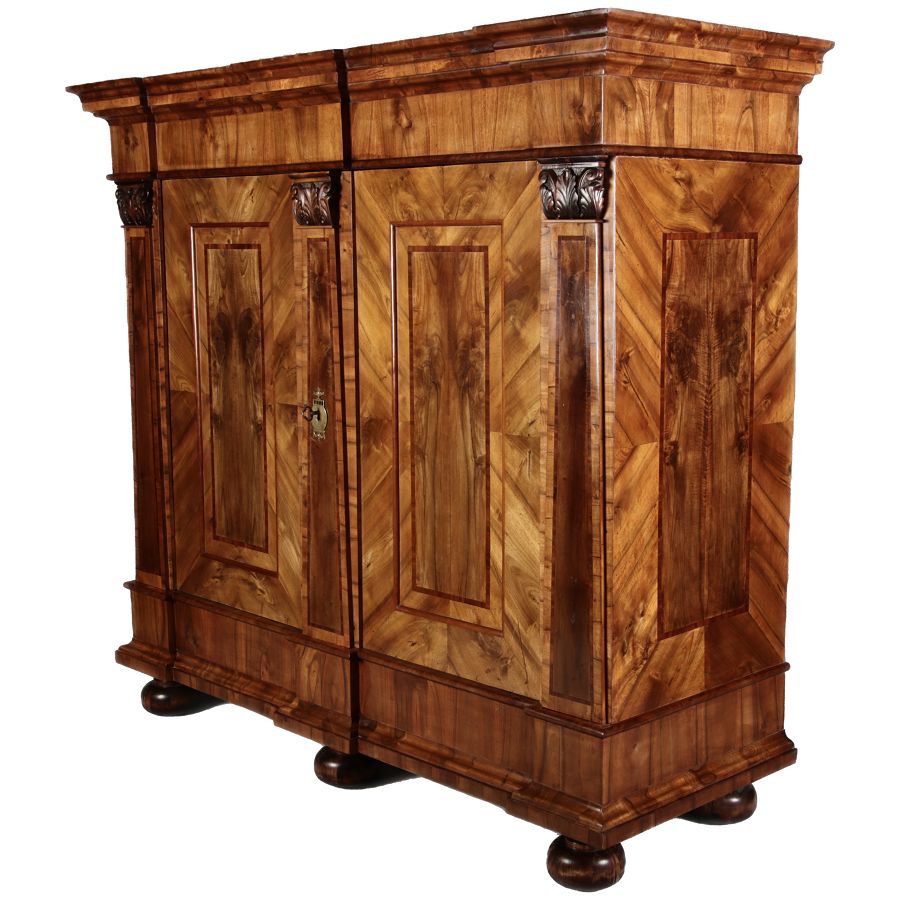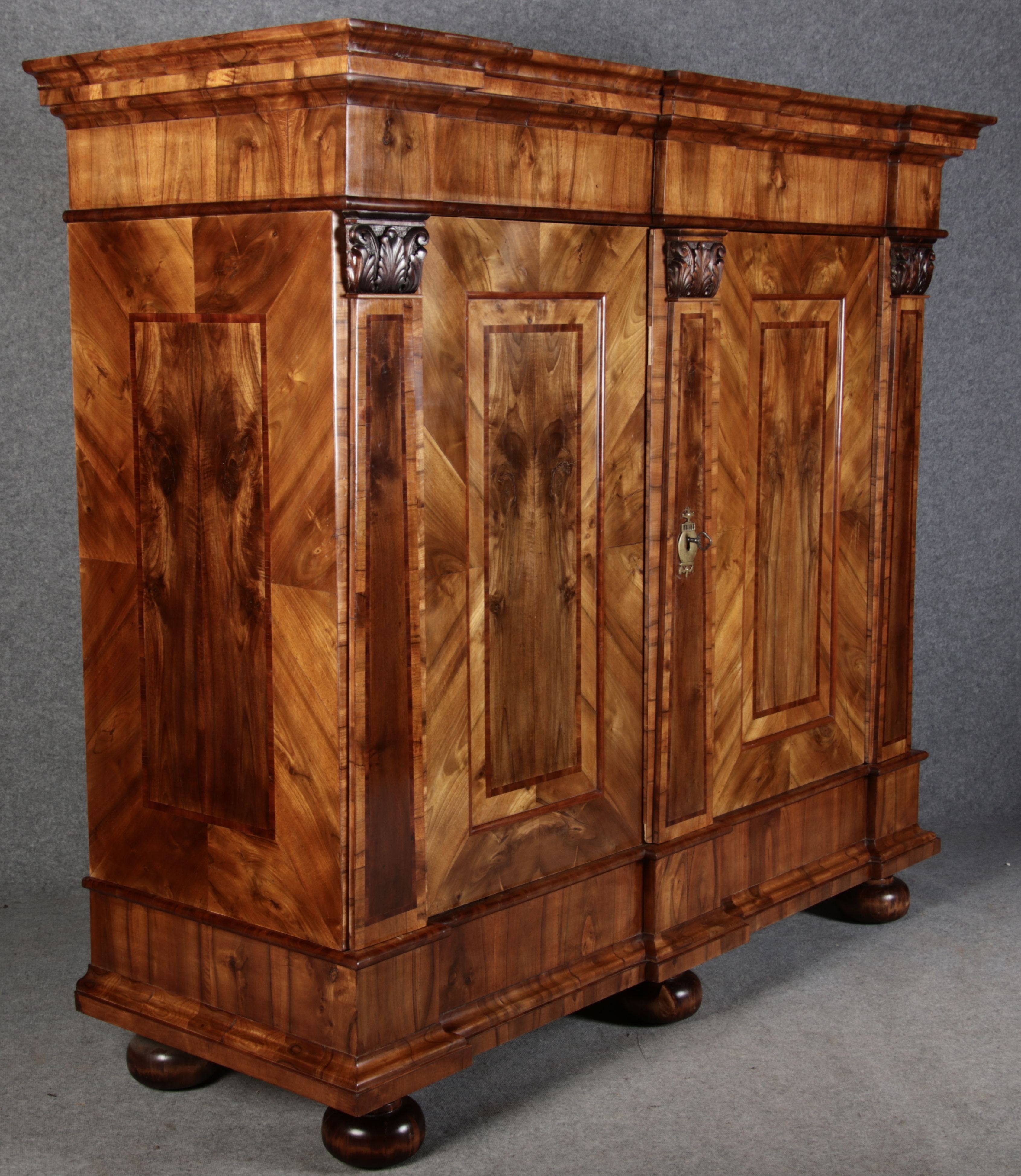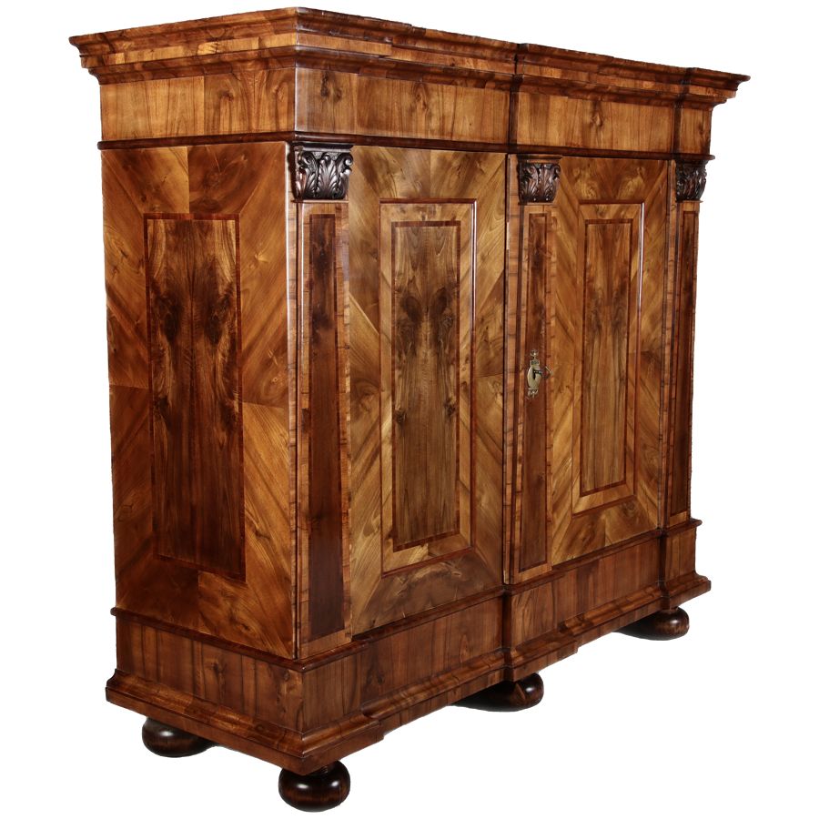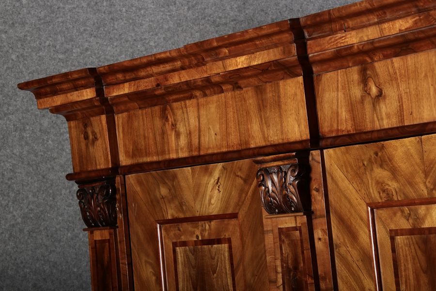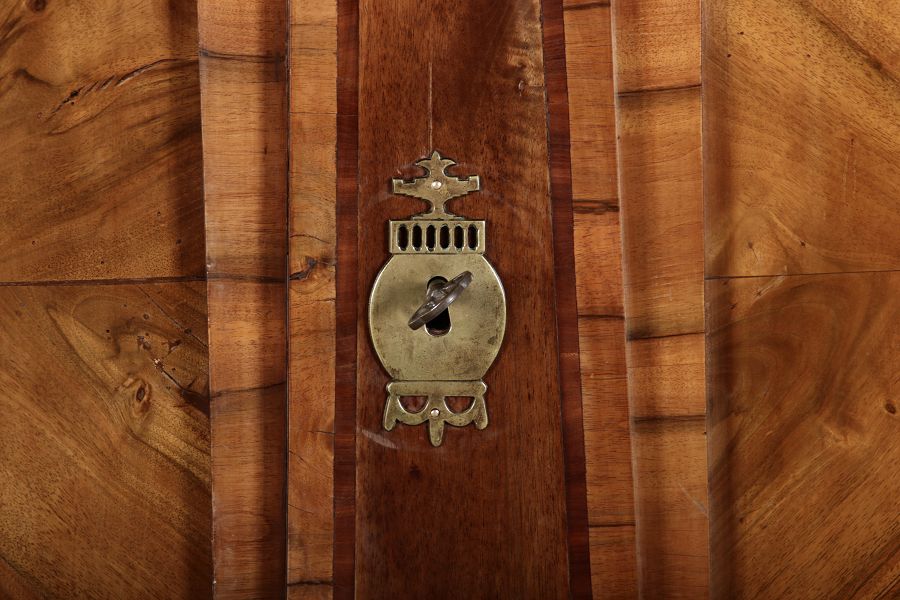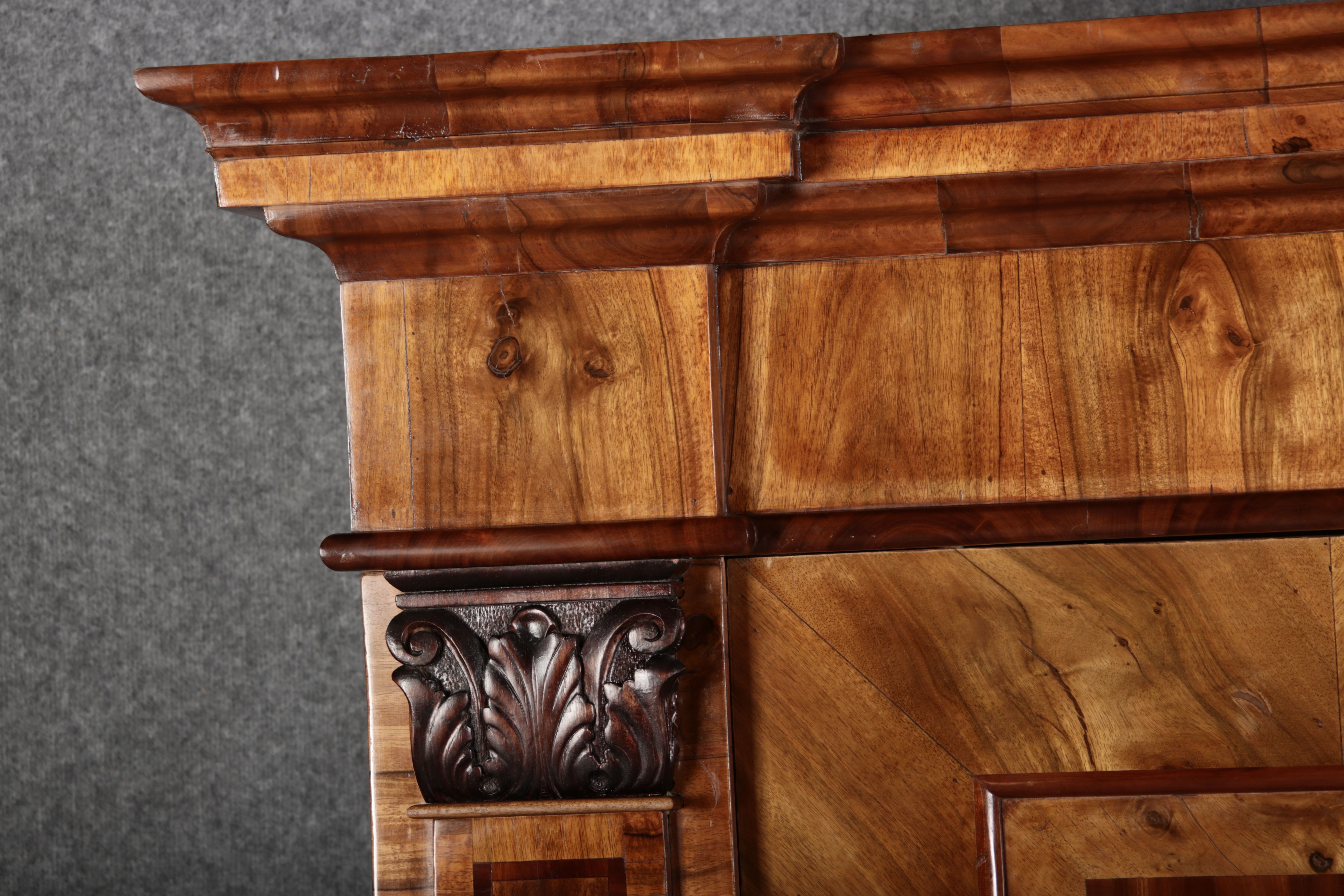 | Großer 230 cm Breiter Antiker Danziger Barockschrank 18 Jh. Nussbaum, Bandeinlagen, Kapitele, Lisenen und Eisenschloss |