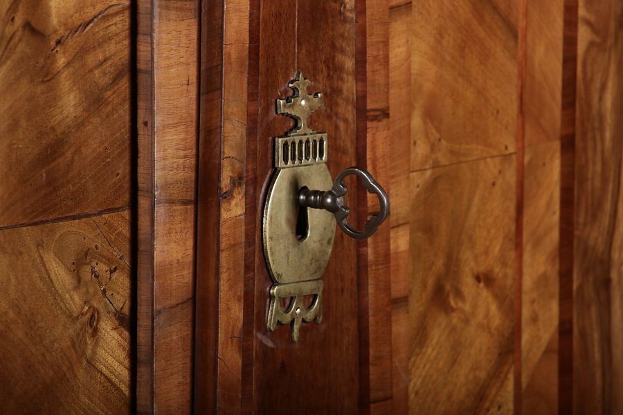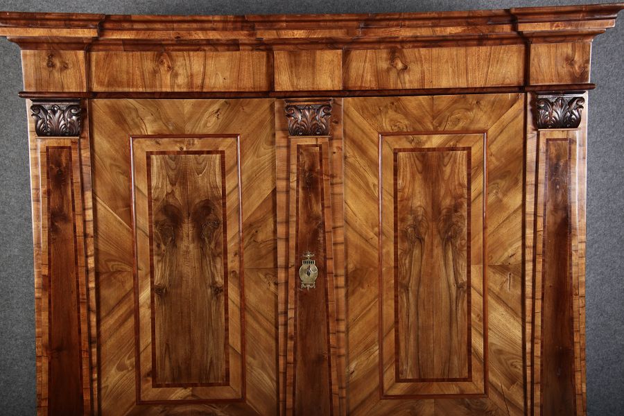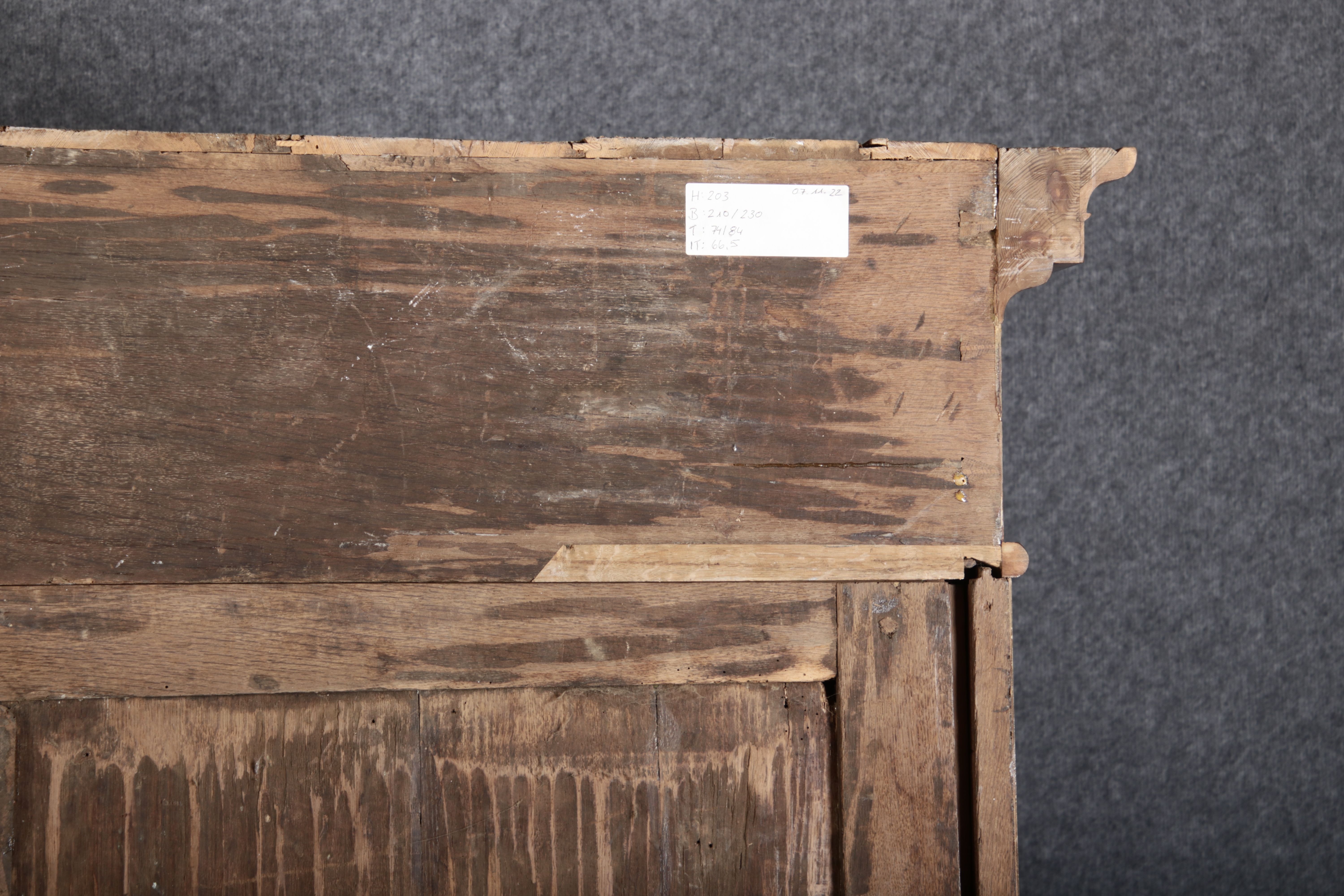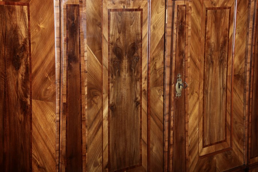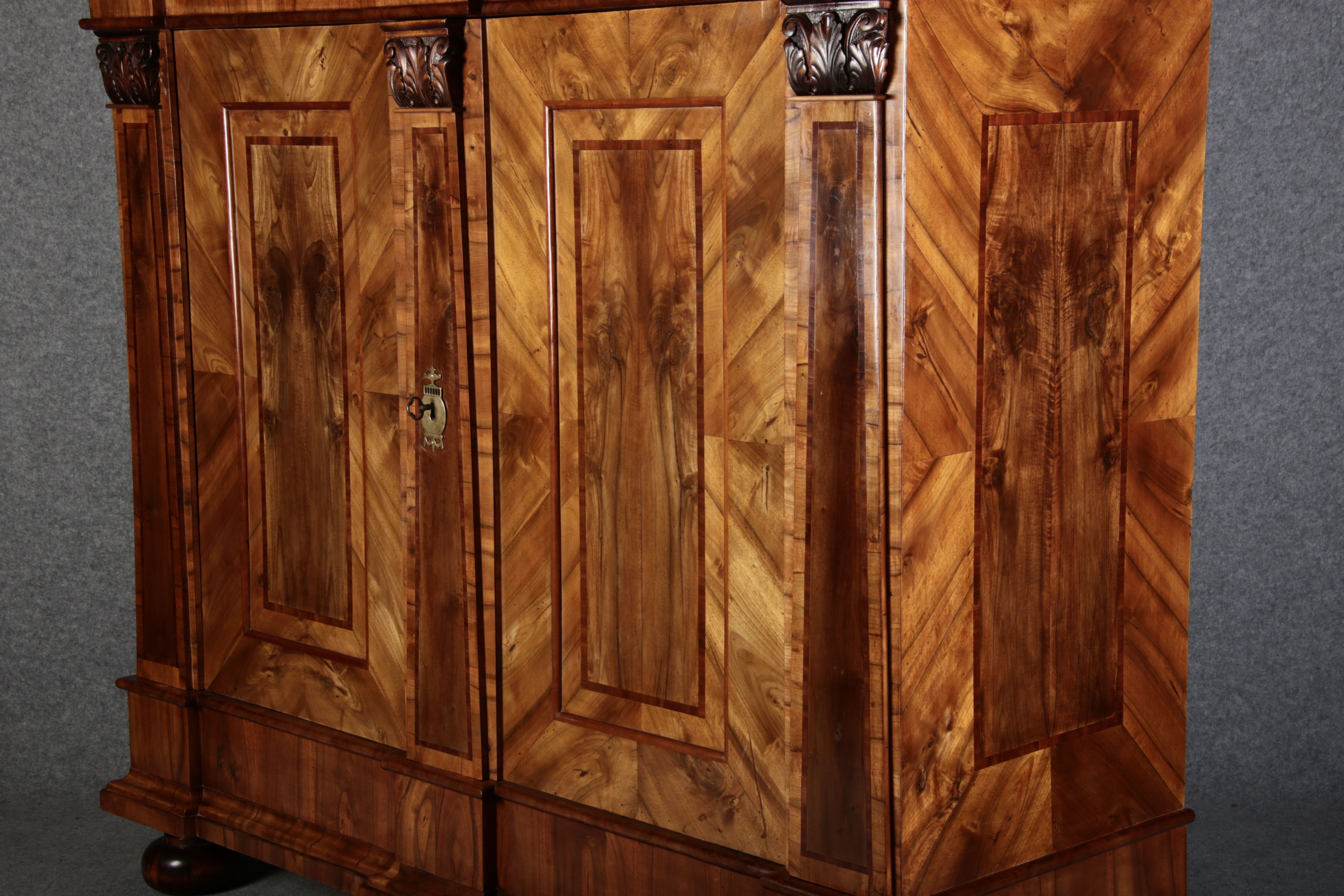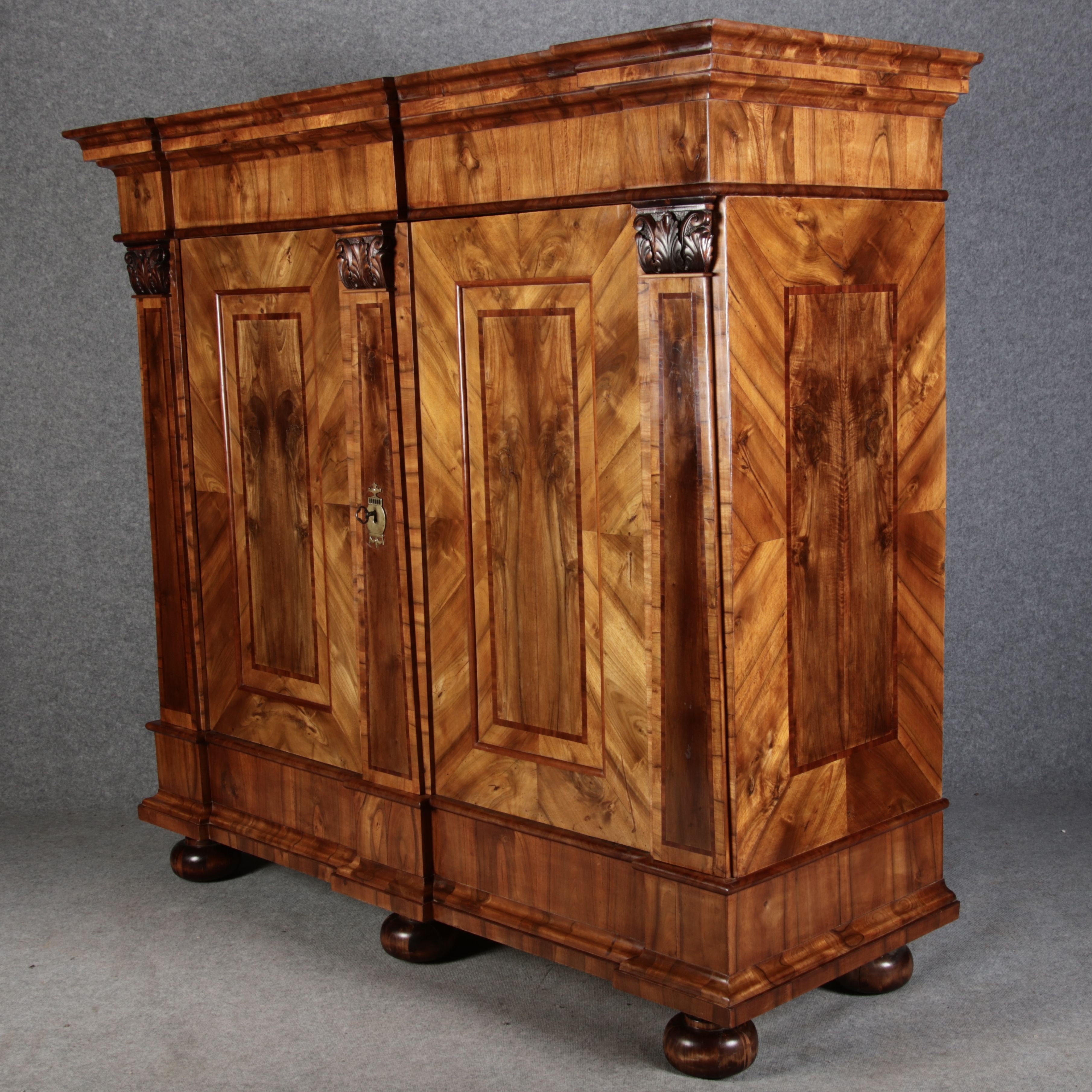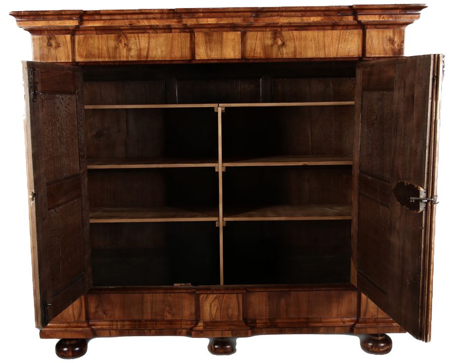 | Großer 230 cm Breiter Antiker Danziger Barockschrank 18 Jh. Nussbaum, Bandeinlagen, Kapitele, Lisenen und Eisenschloss |