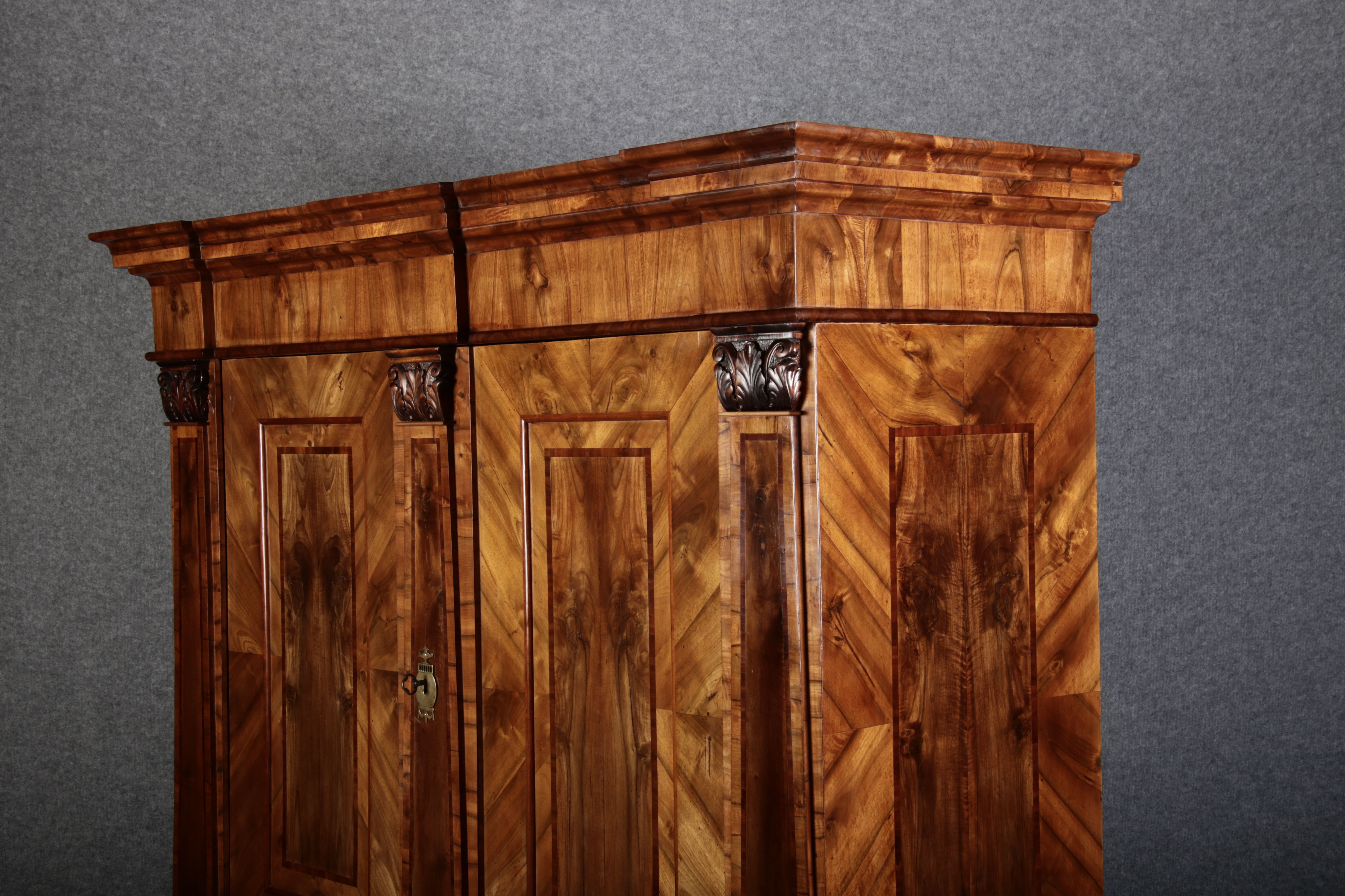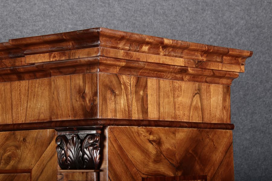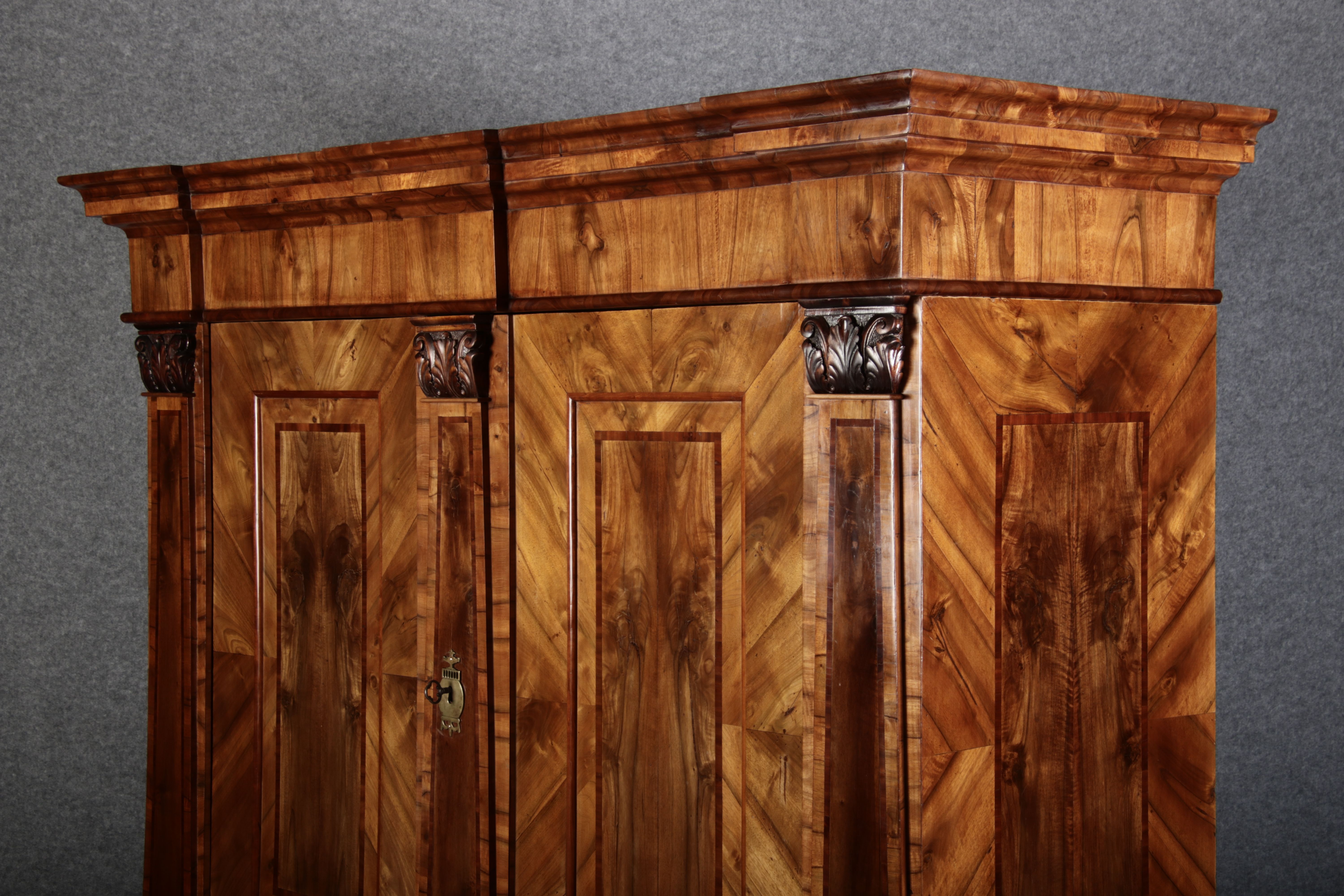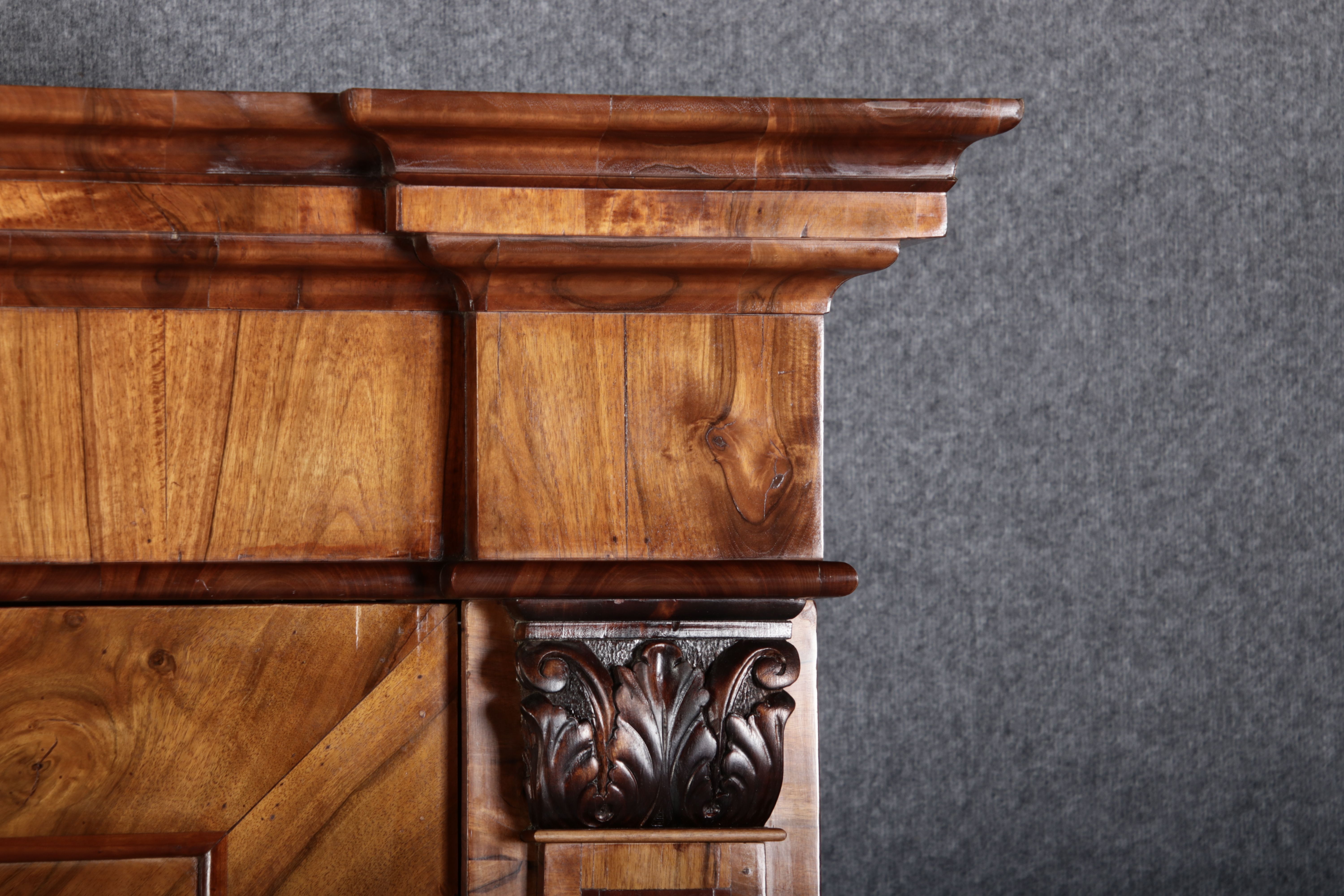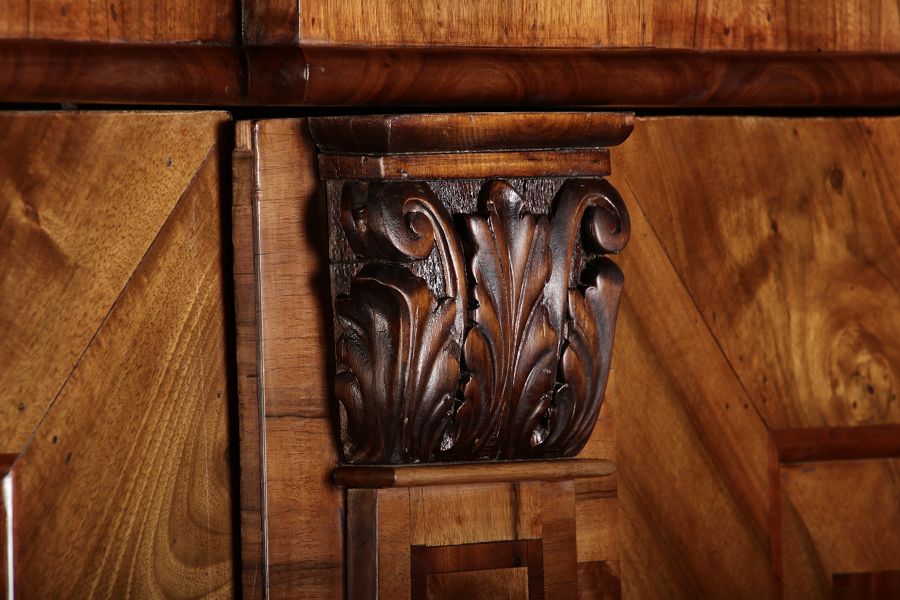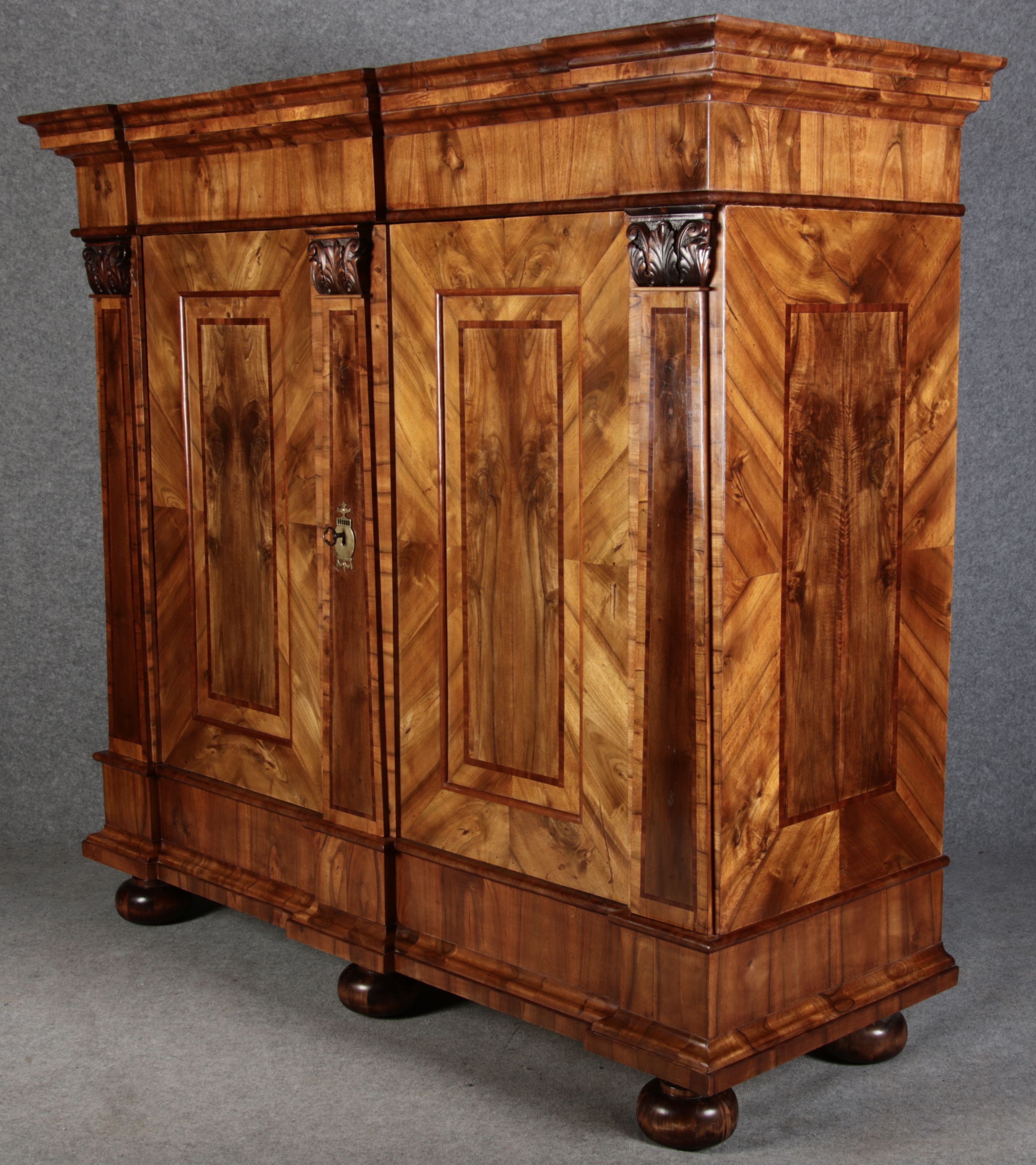 | Großer 230 cm Breiter Antiker Danziger Barockschrank 18 Jh. Nussbaum, Bandeinlagen, Kapitele, Lisenen und Eisenschloss |