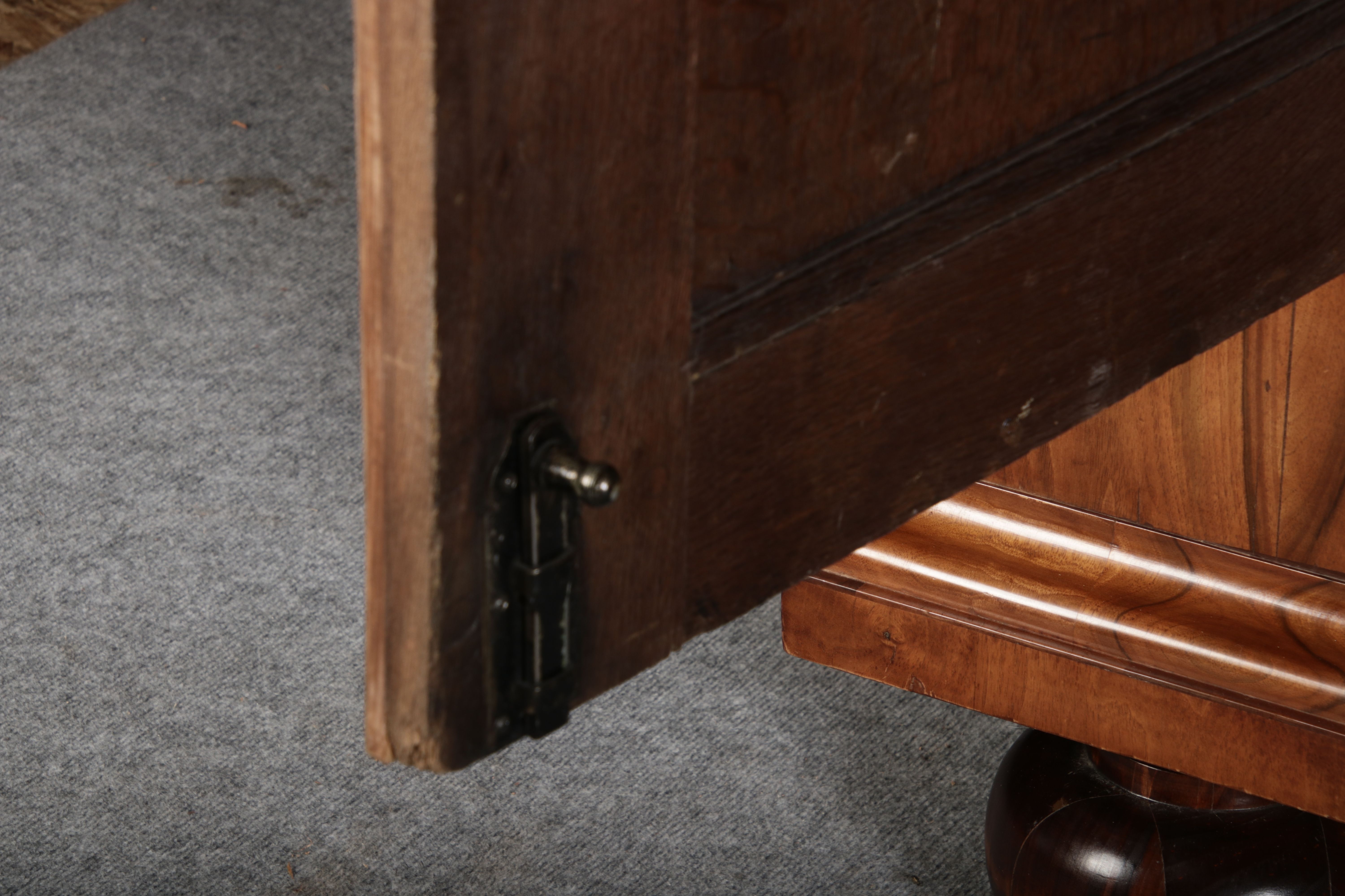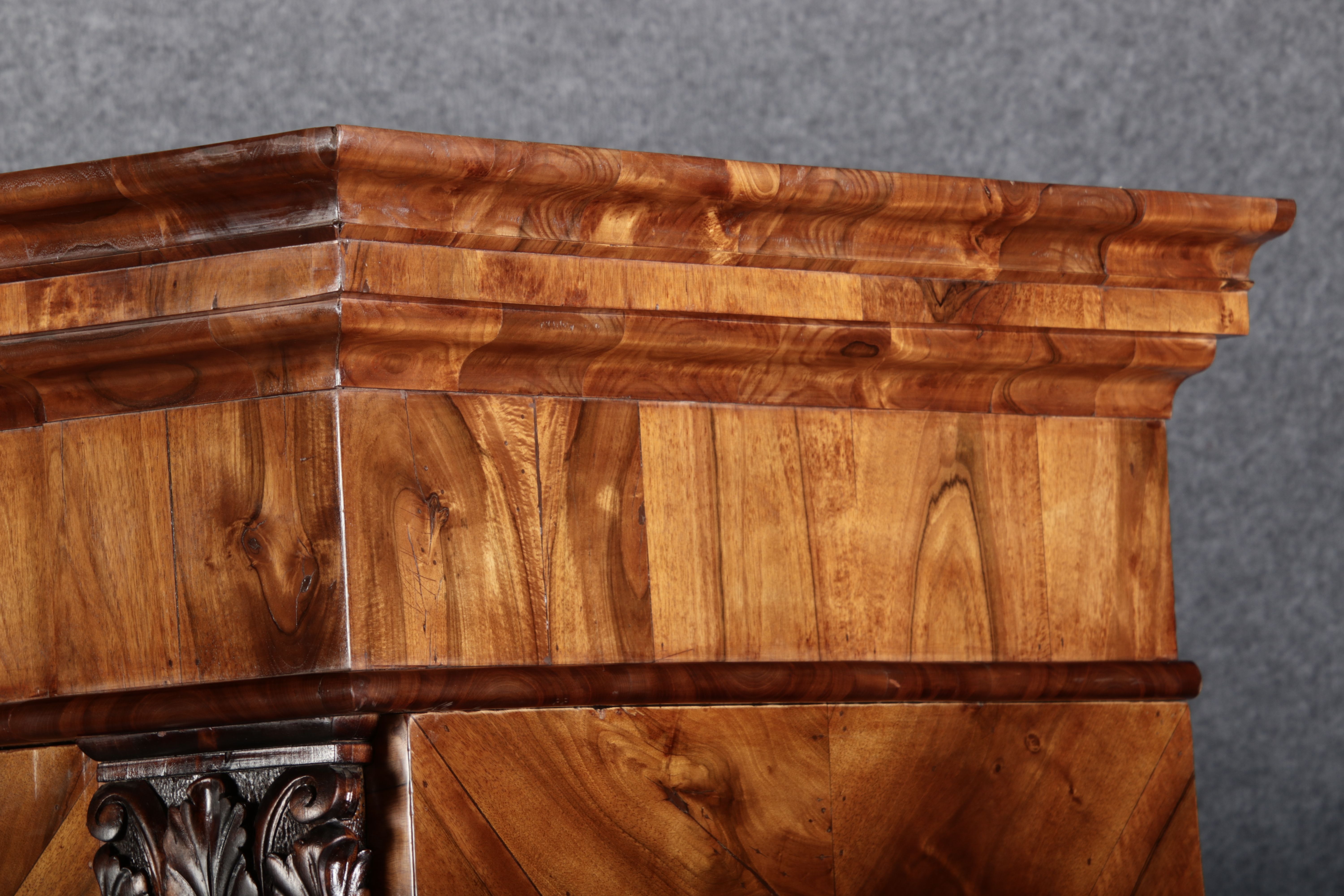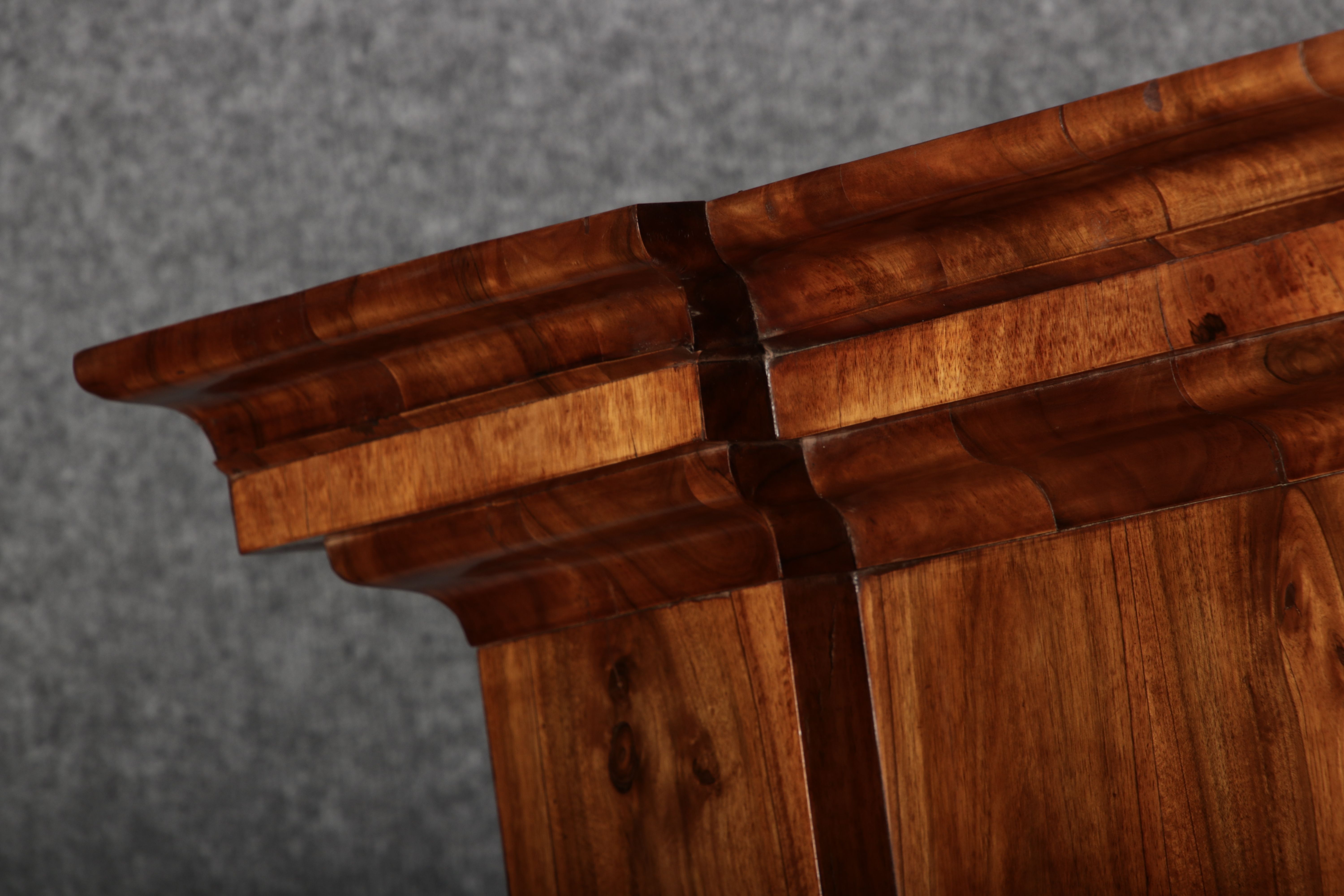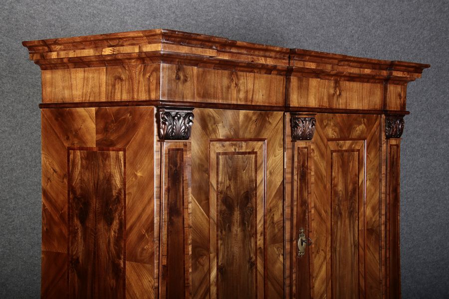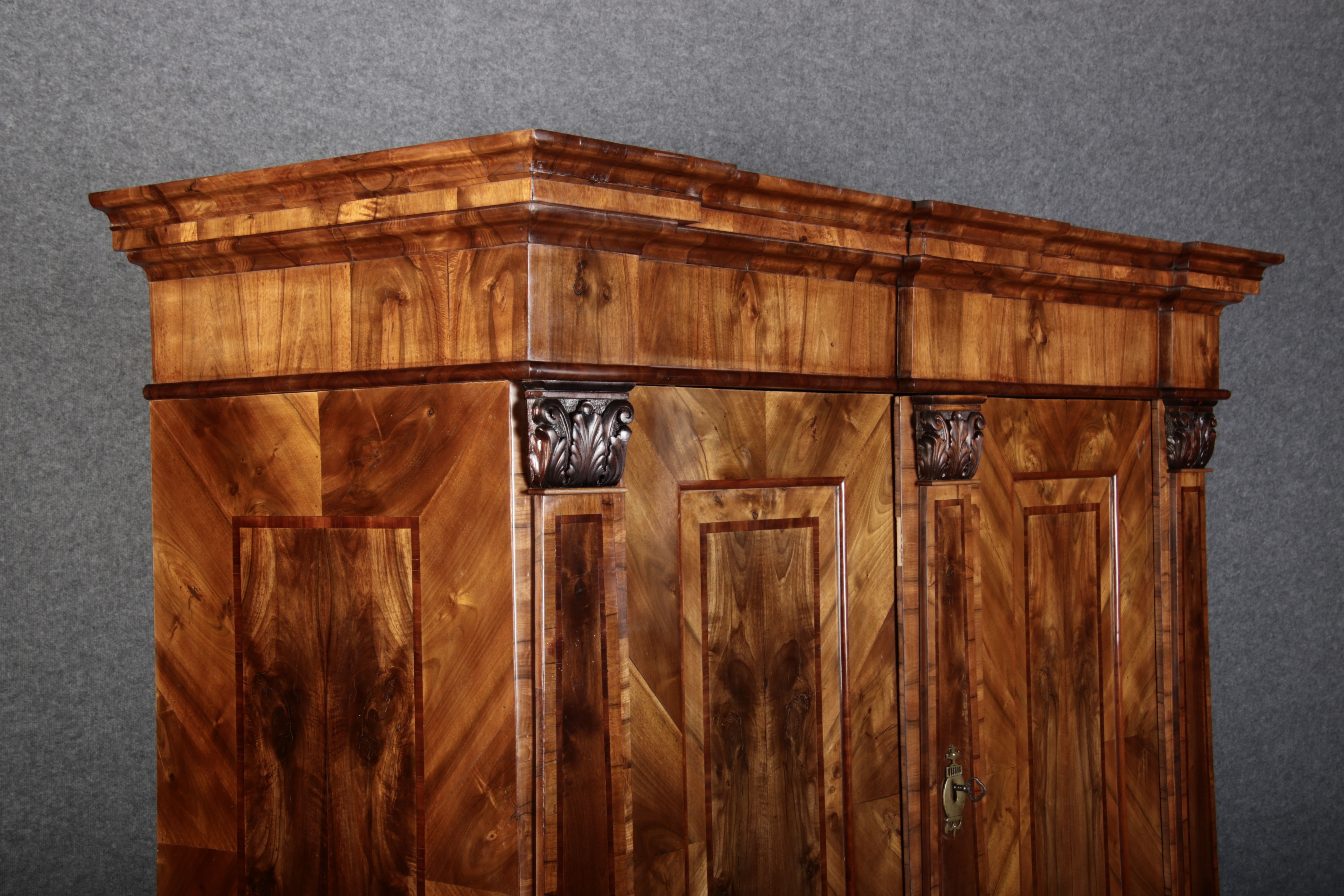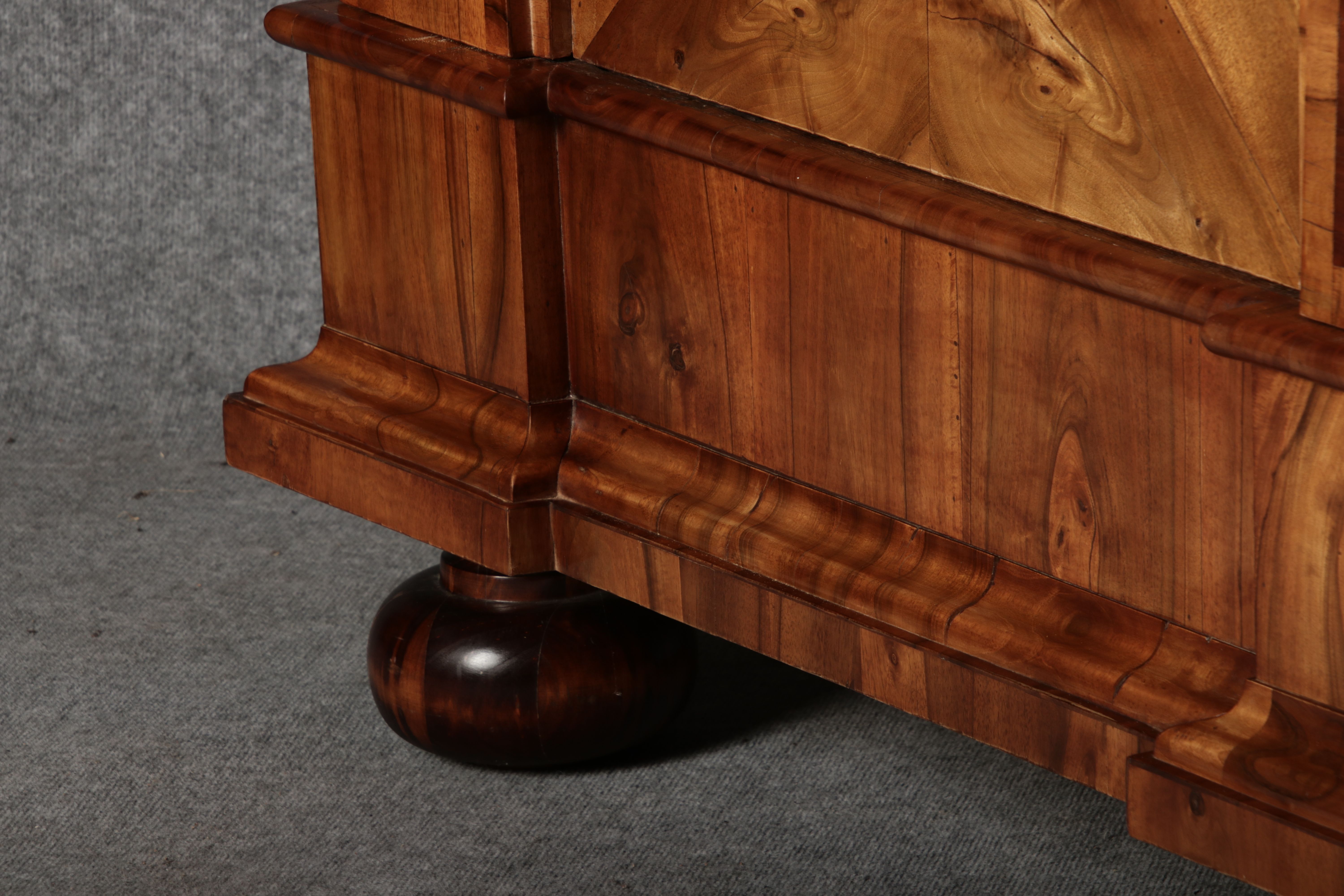 | Großer 230 cm Breiter Antiker Danziger Barockschrank 18 Jh. Nussbaum, Bandeinlagen, Kapitele, Lisenen und Eisenschloss |