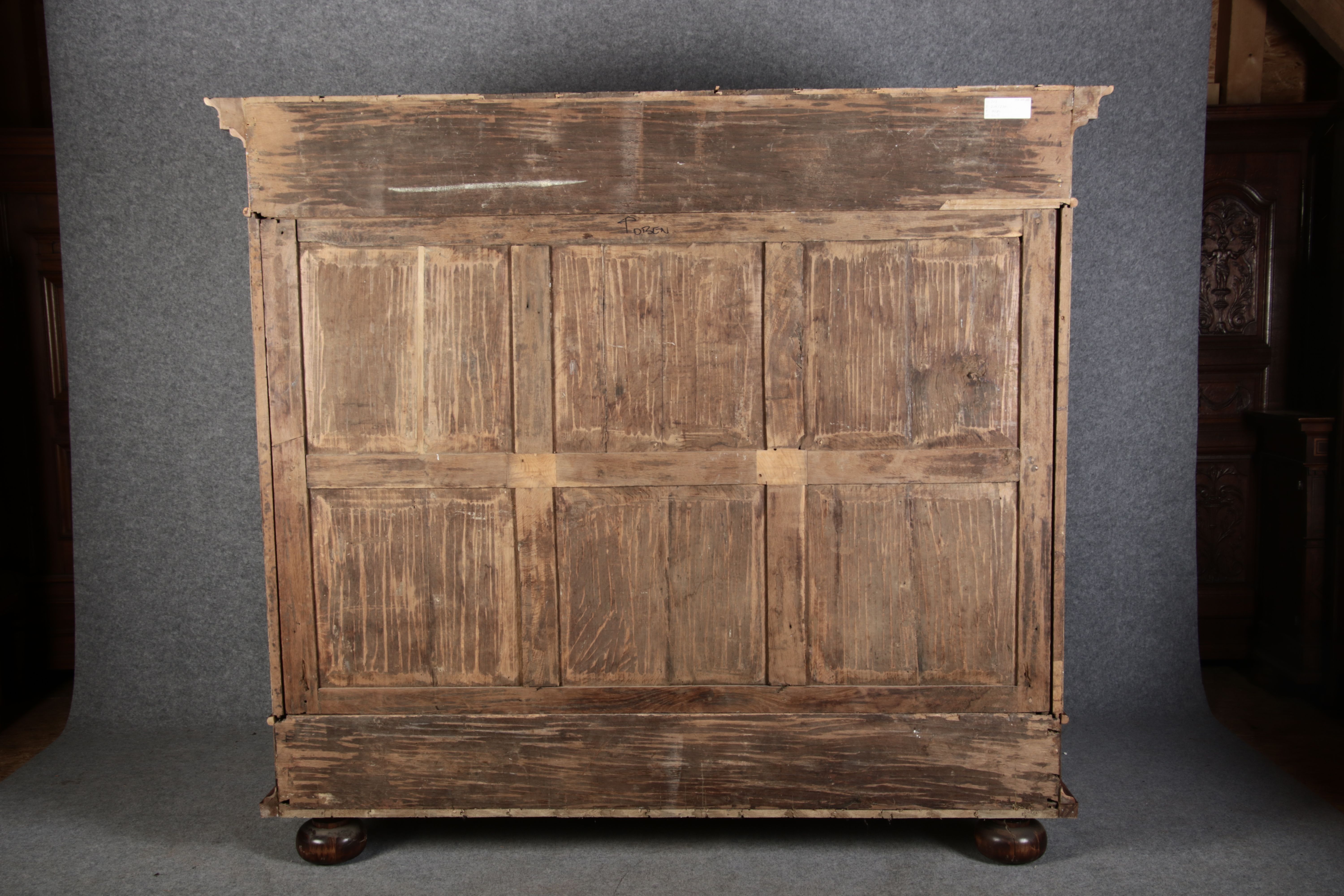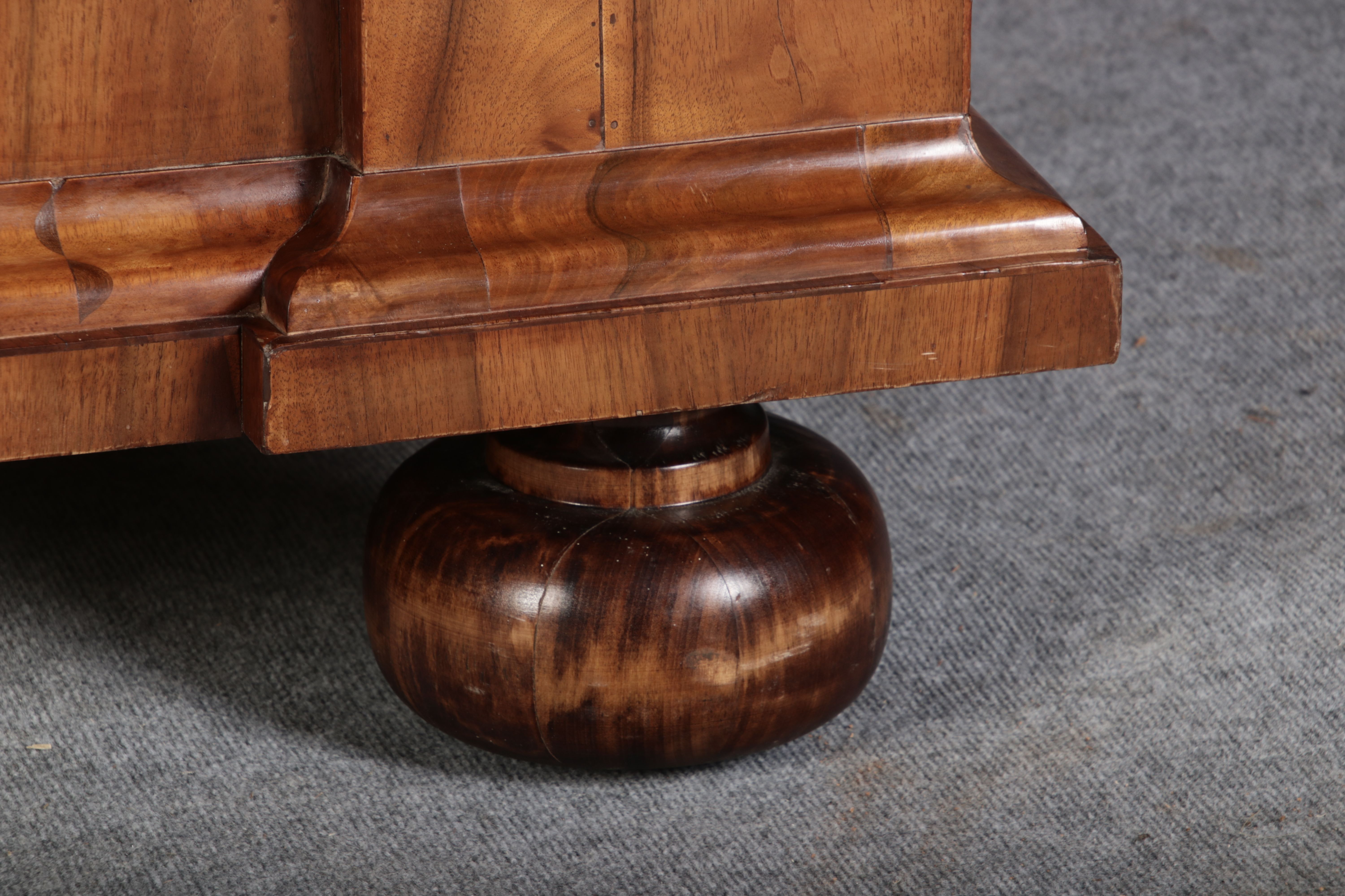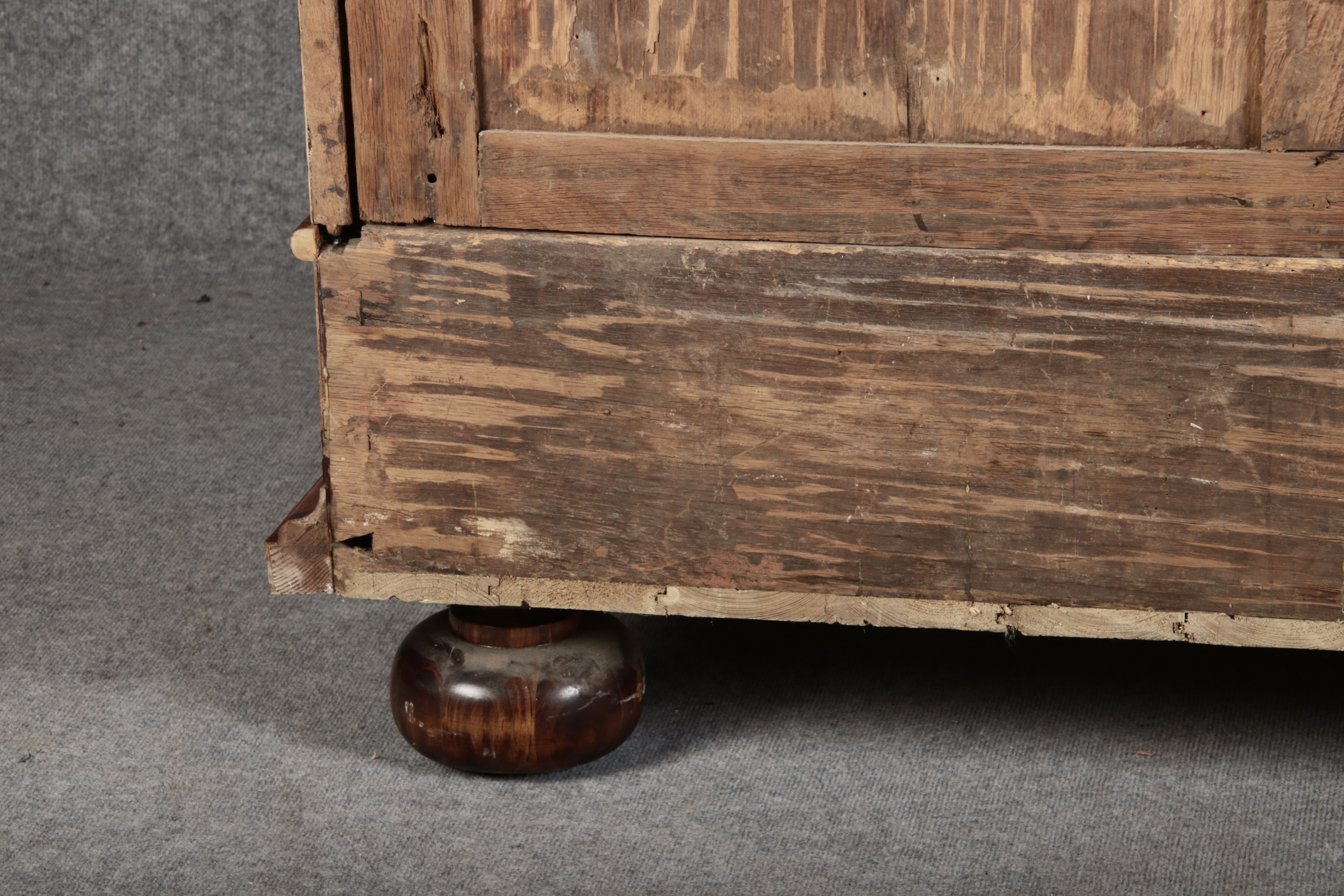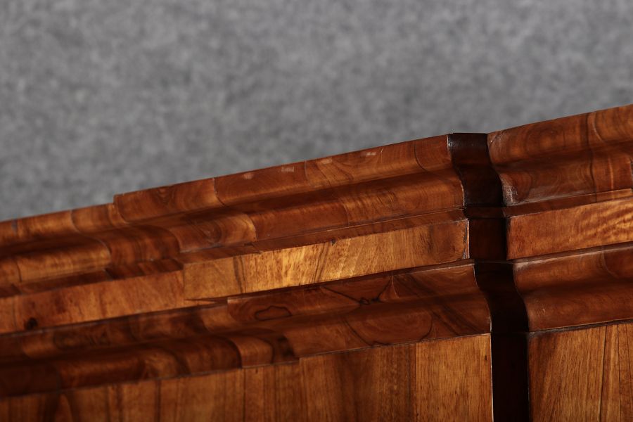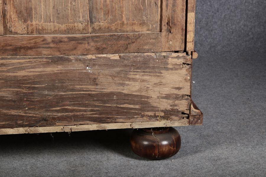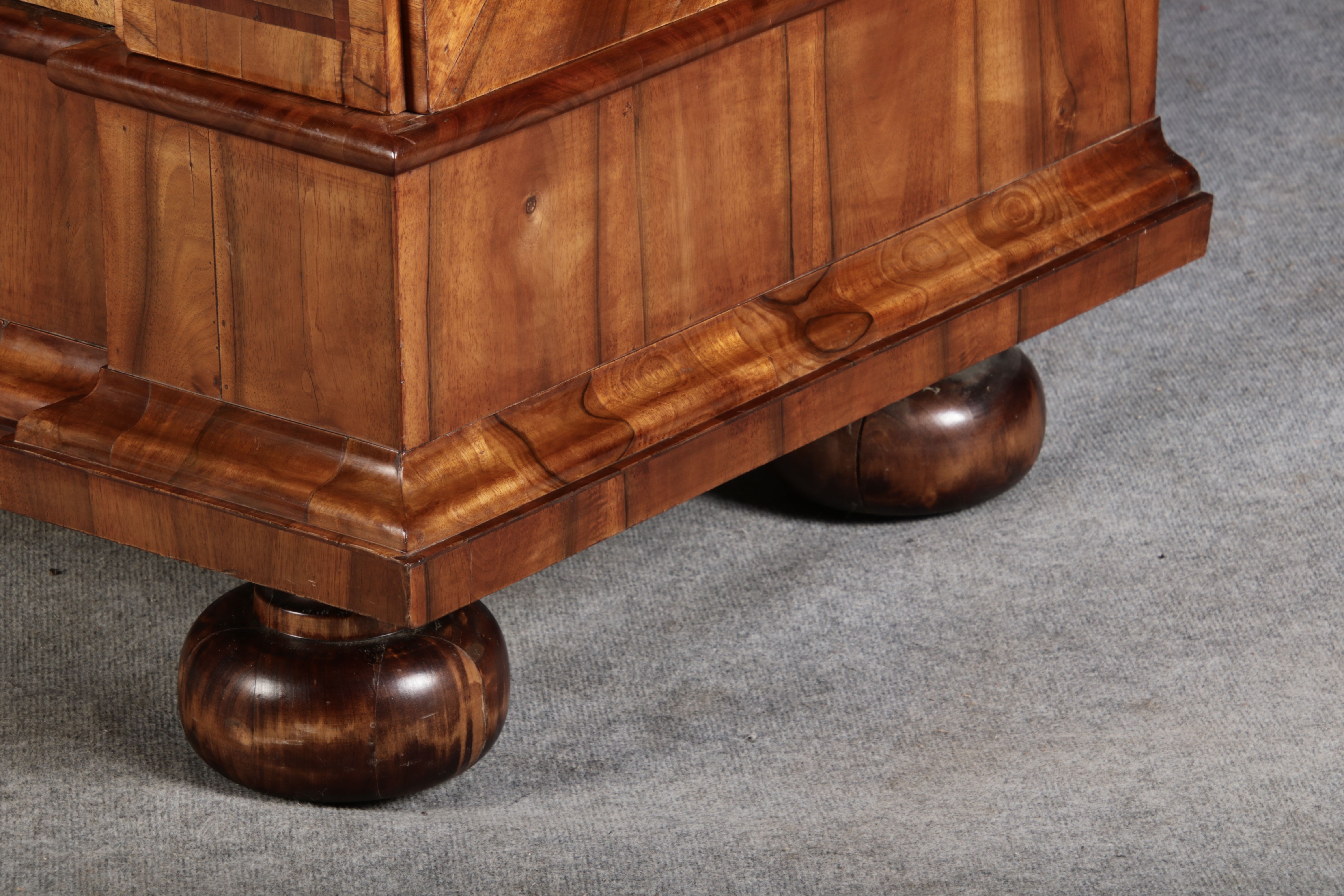 | Großer 230 cm Breiter Antiker Danziger Barockschrank 18 Jh. Nussbaum, Bandeinlagen, Kapitele, Lisenen und Eisenschloss |