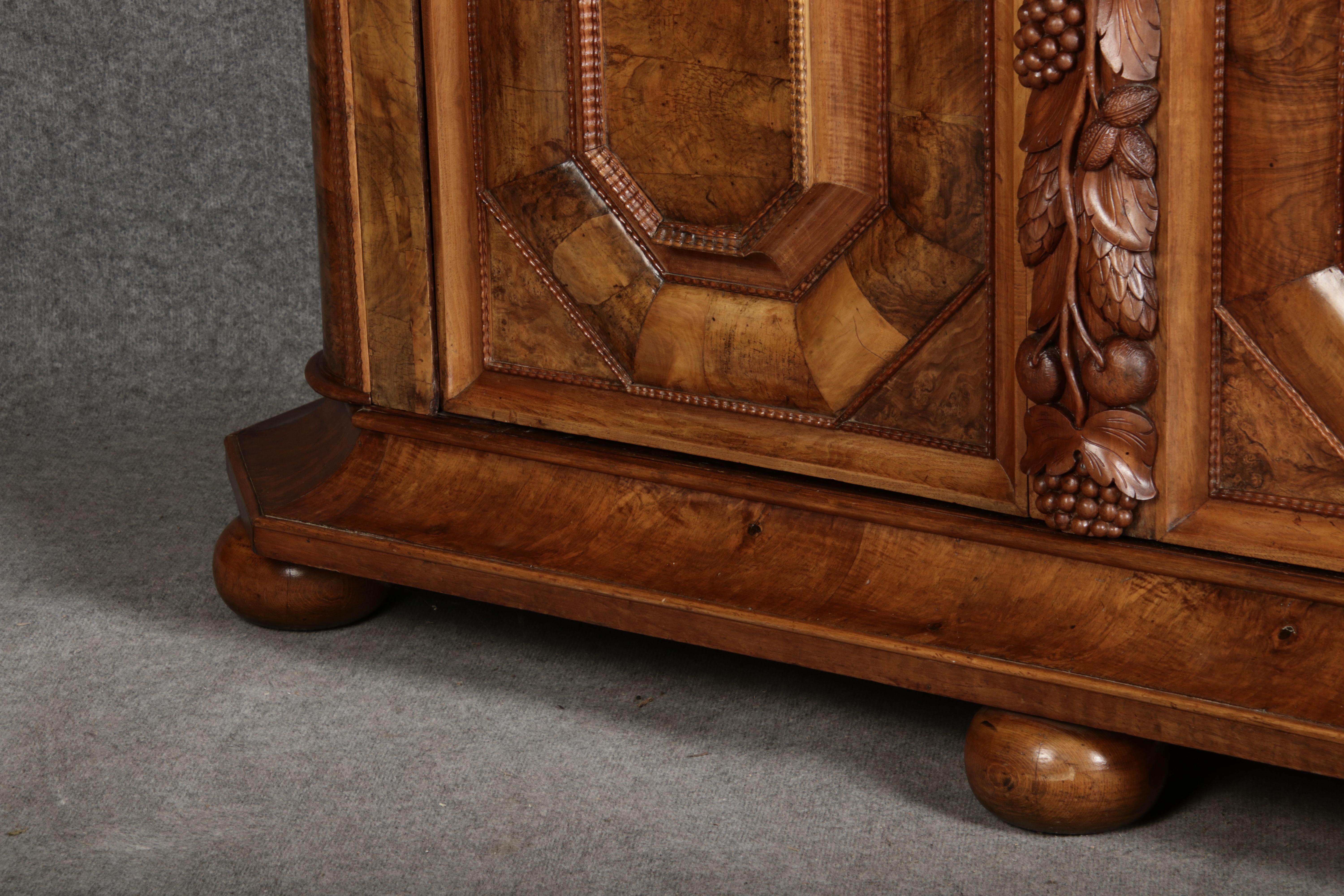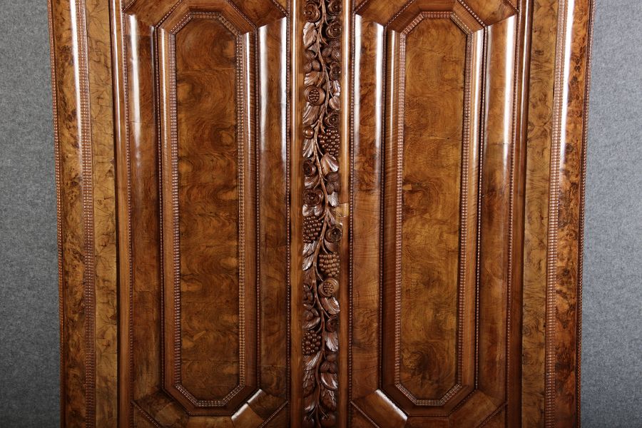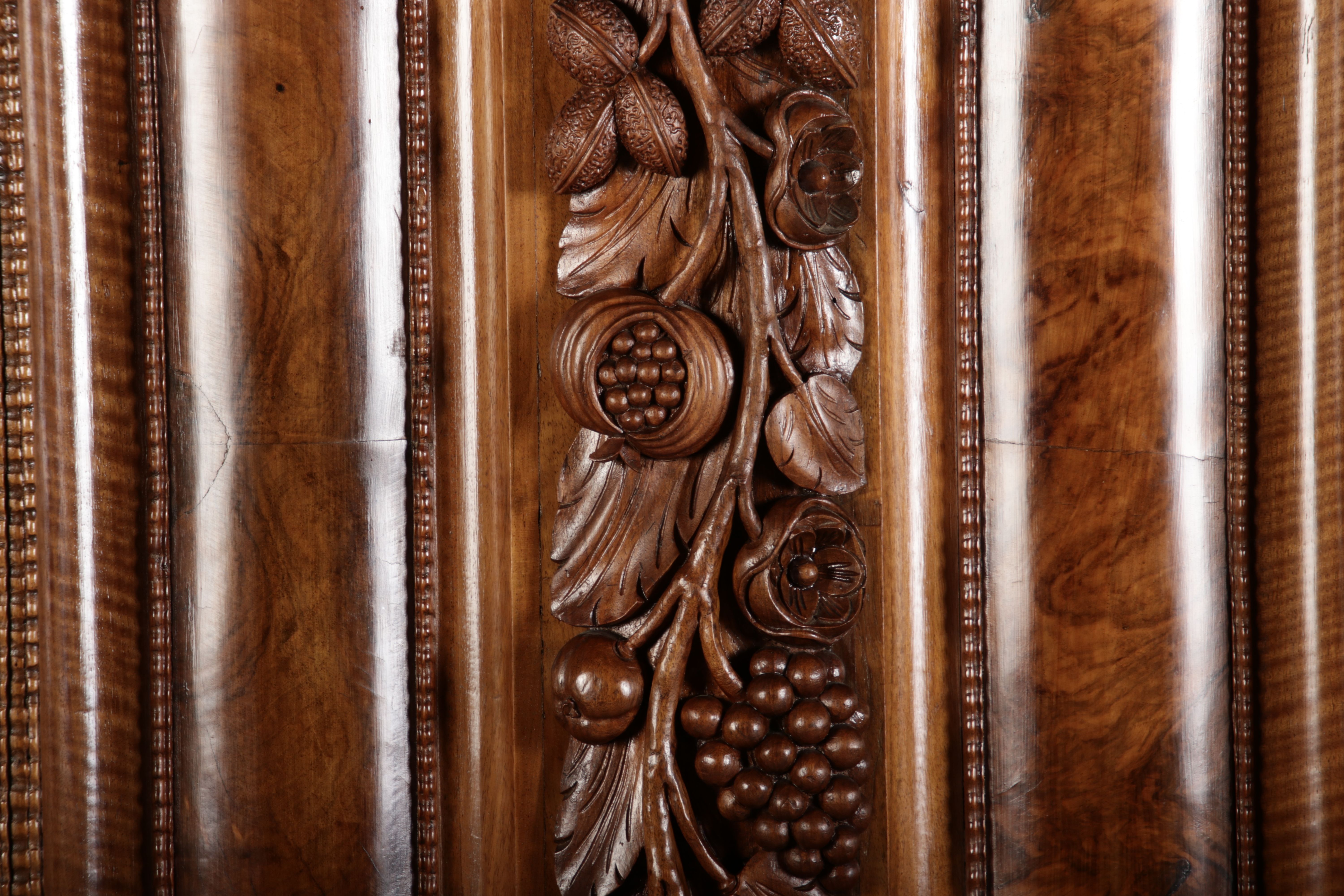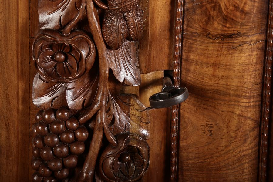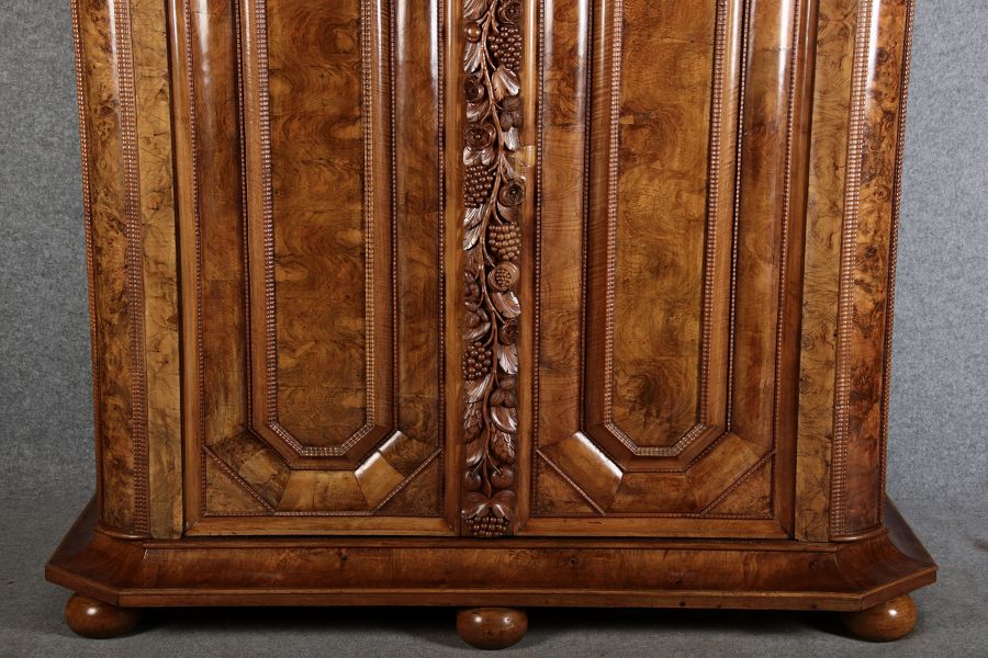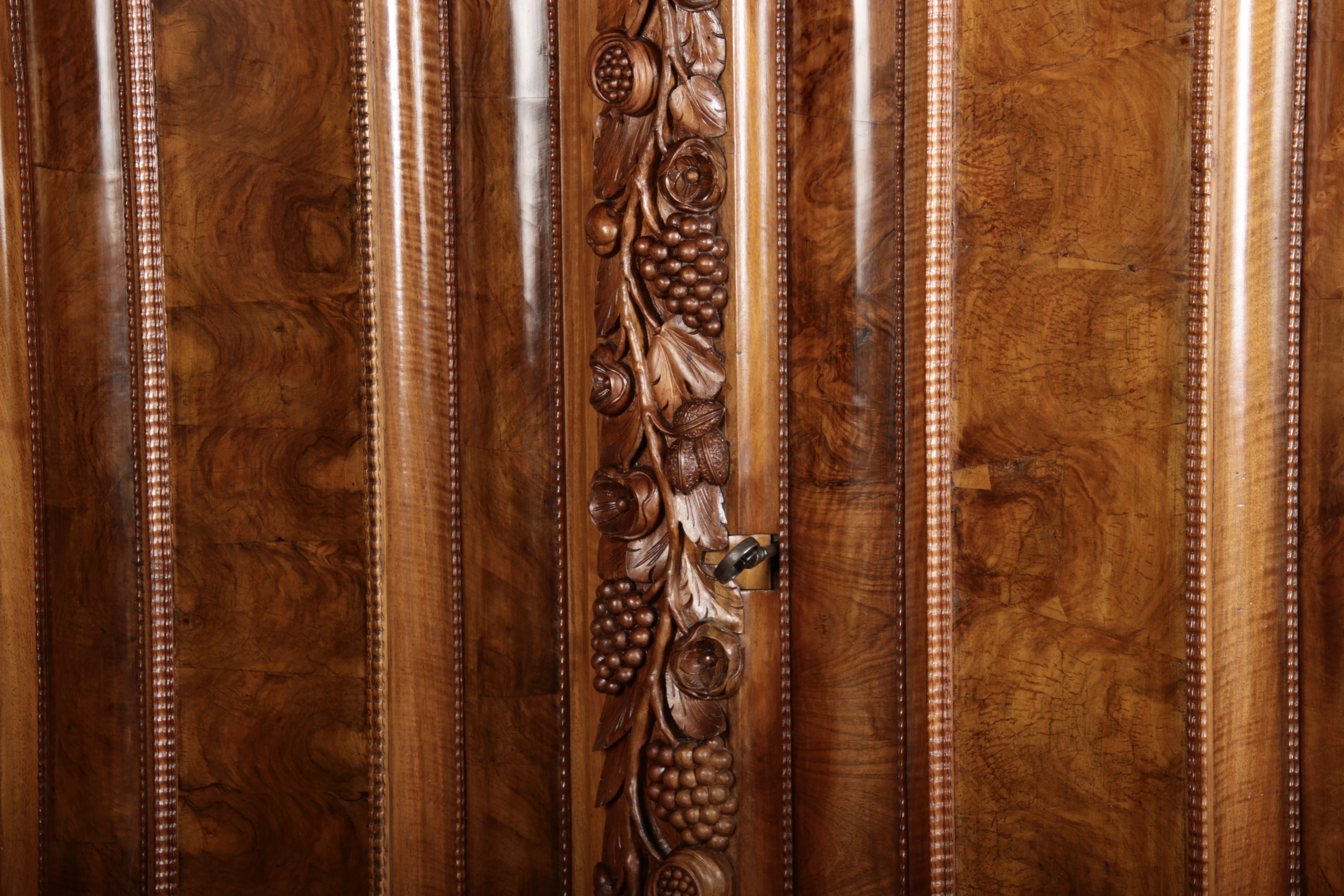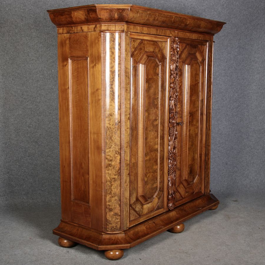 | Antiker Barockschrank um 1740-60 Nussbaum mit Trauben Schnitzereien |