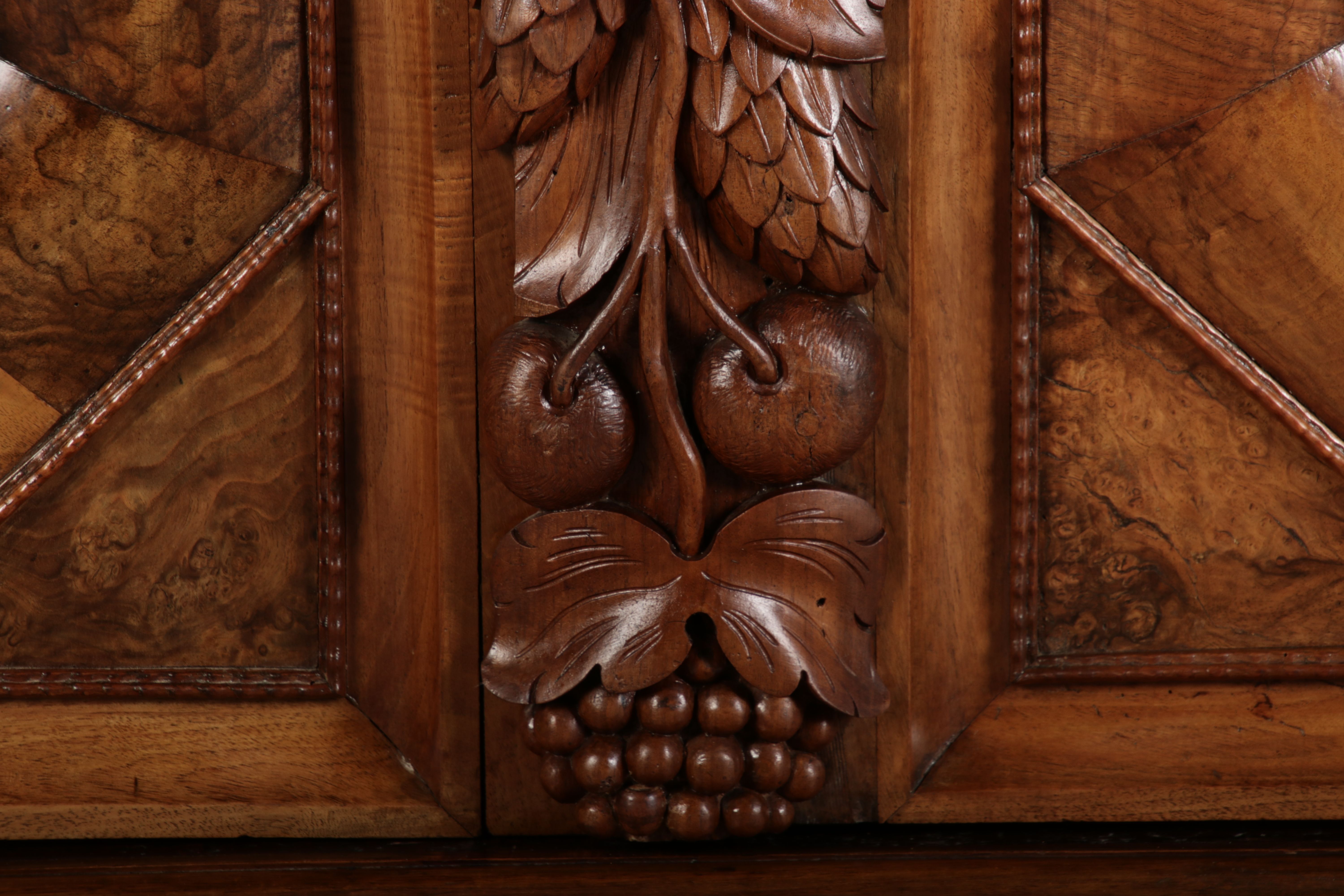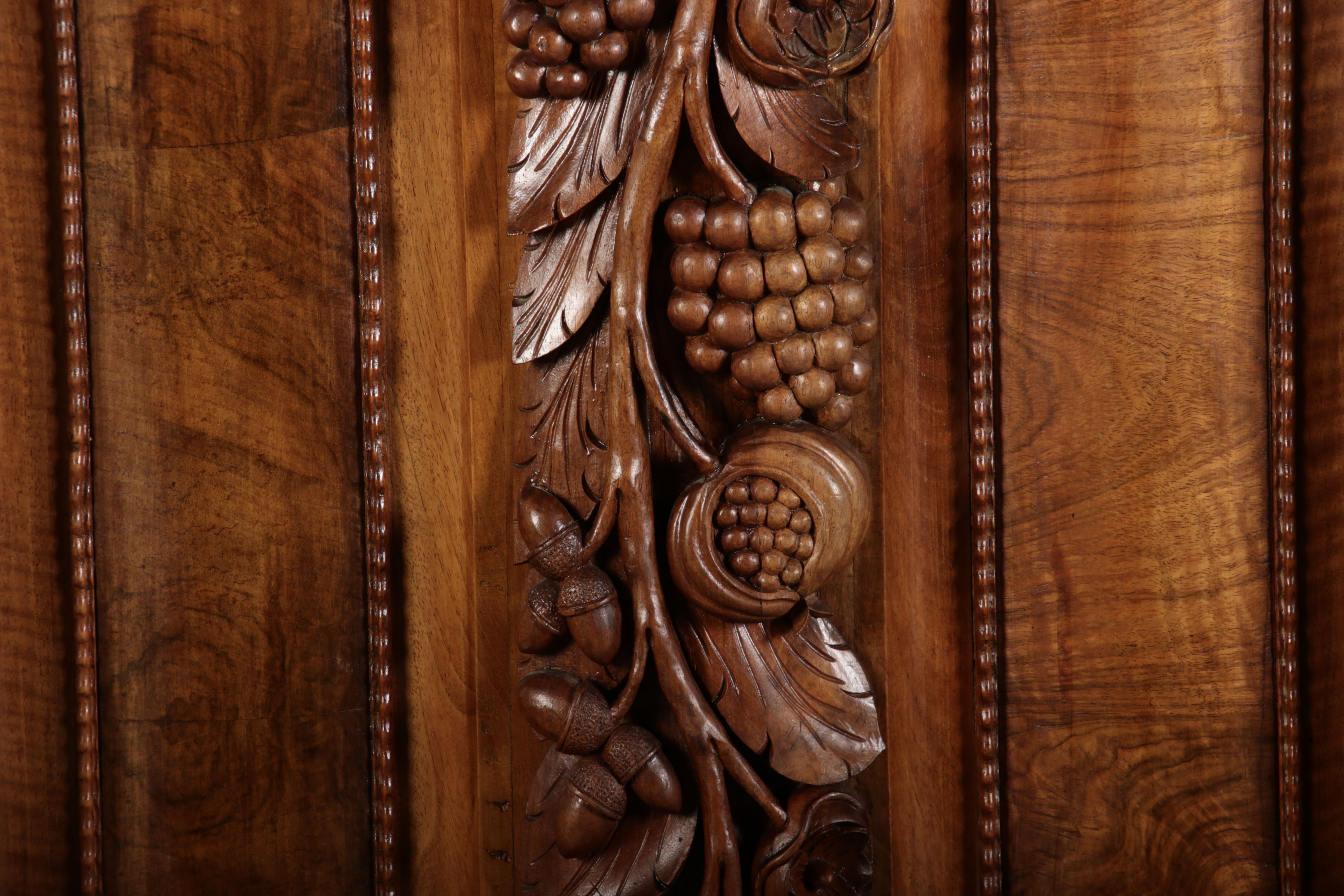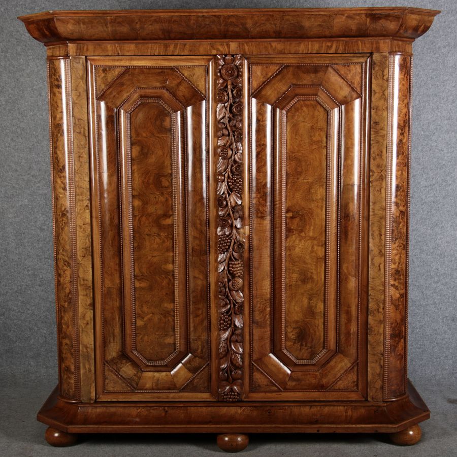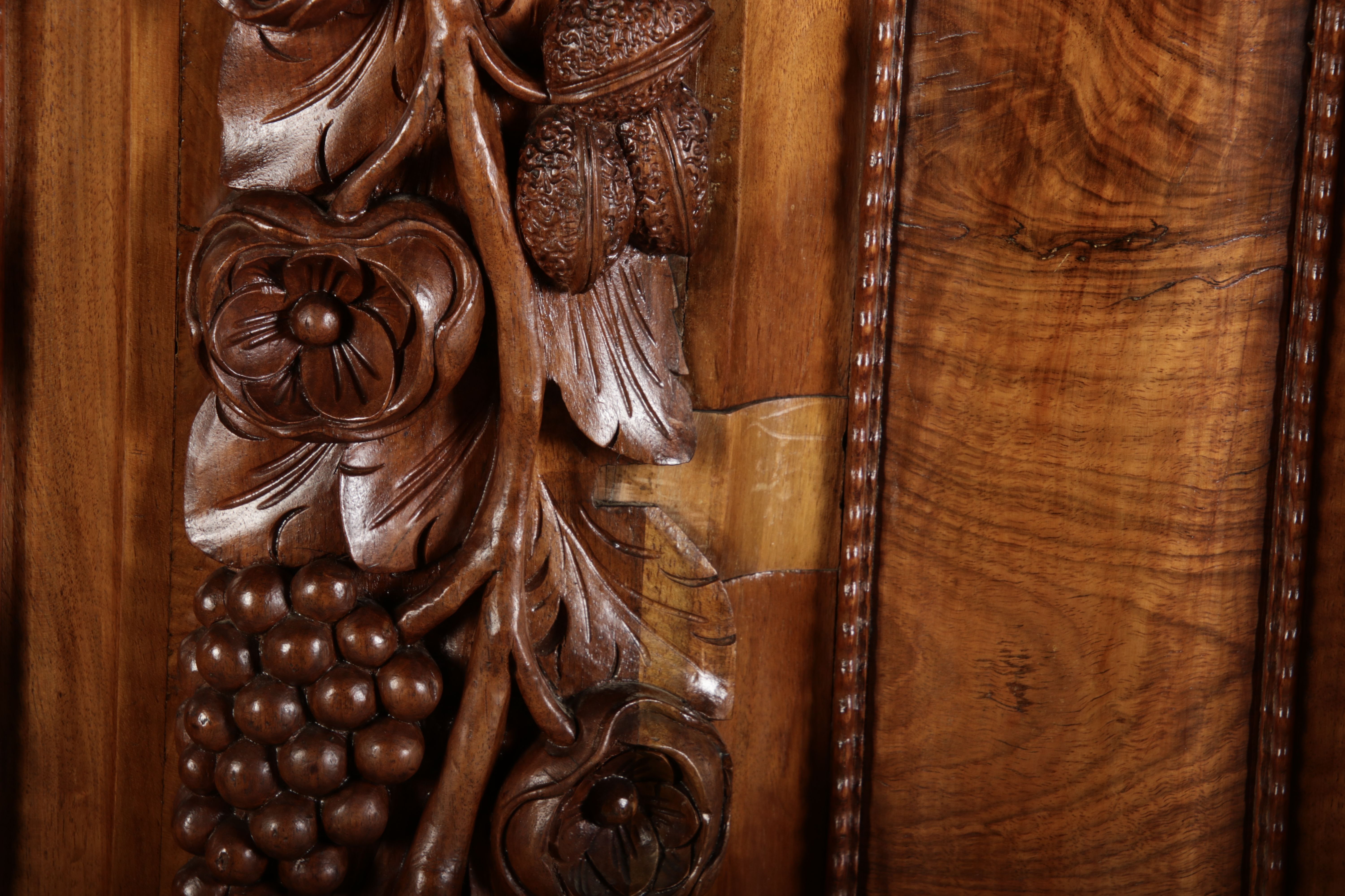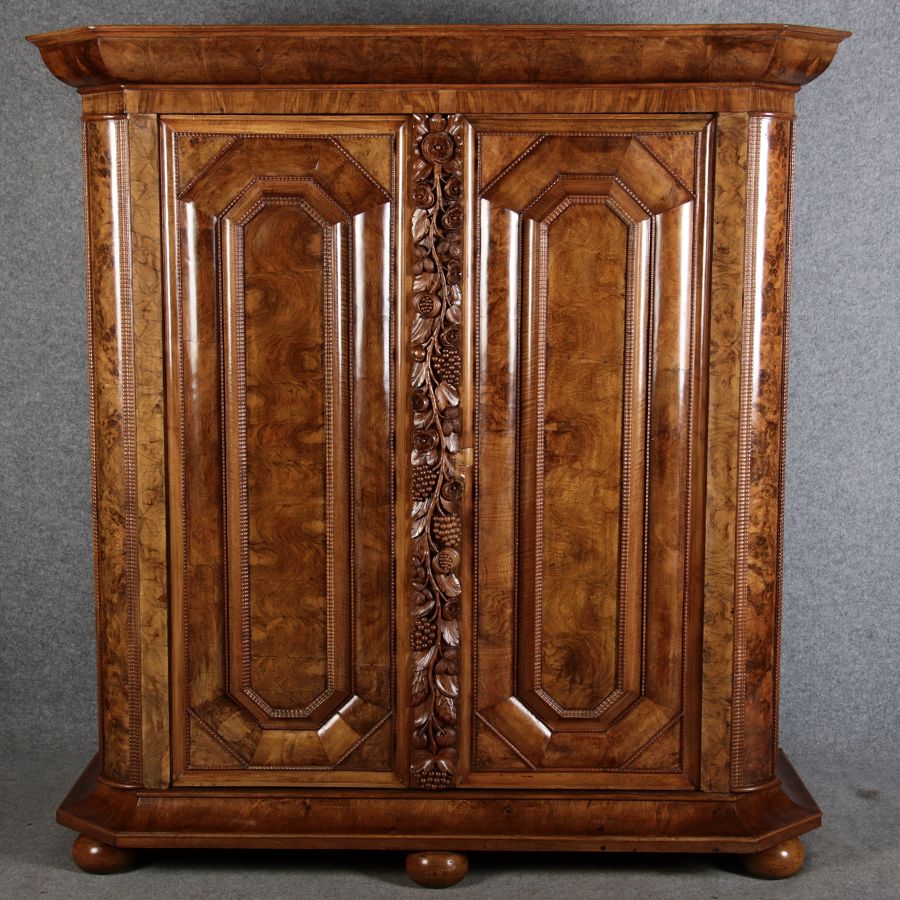 | Antiker Barockschrank um 1740-60 Nussbaum mit Trauben Schnitzereien |