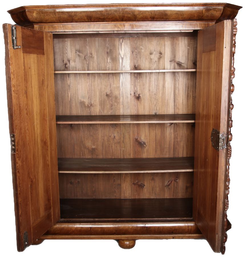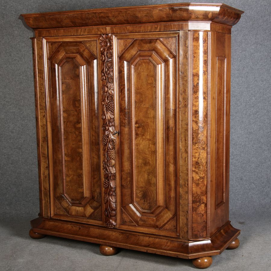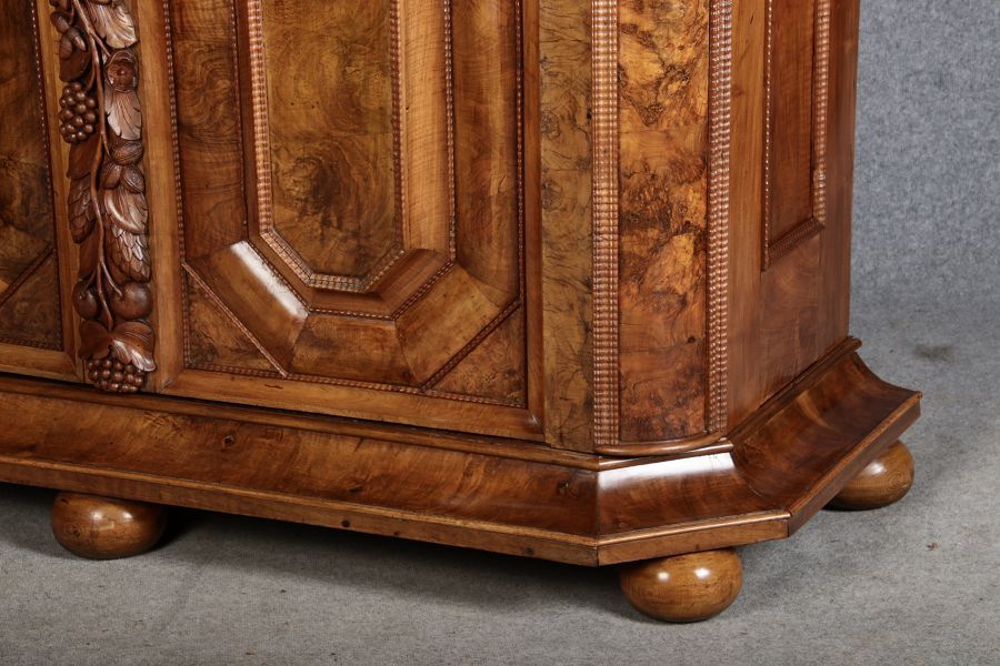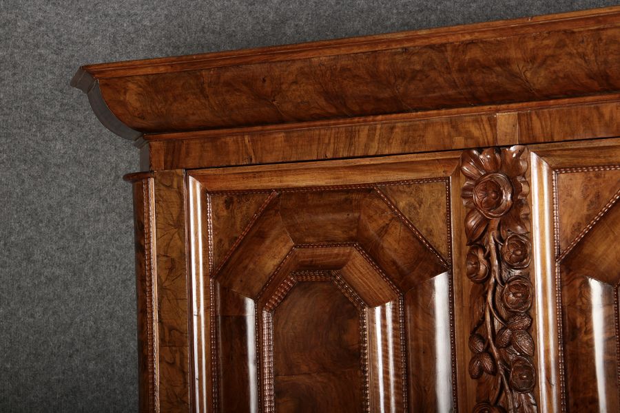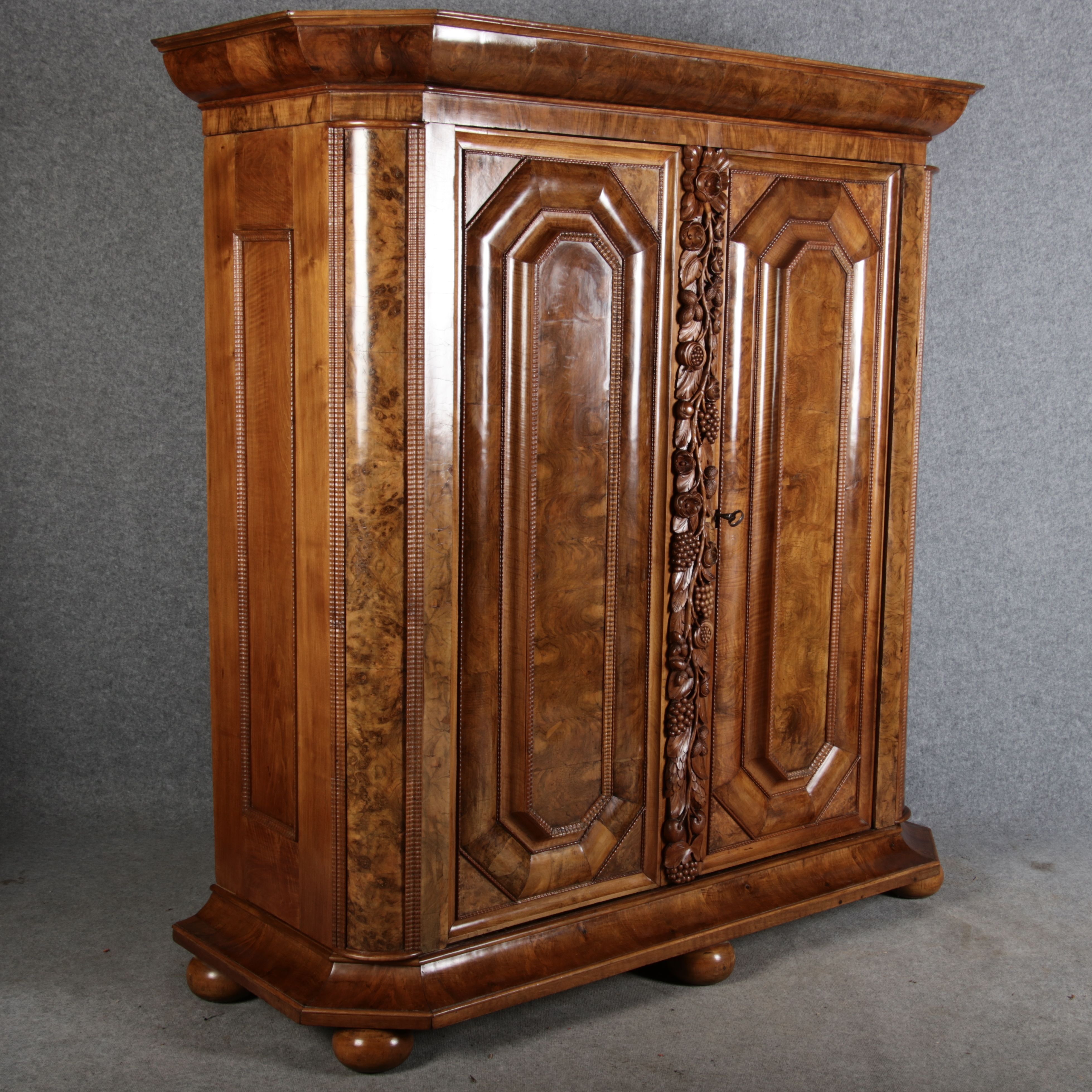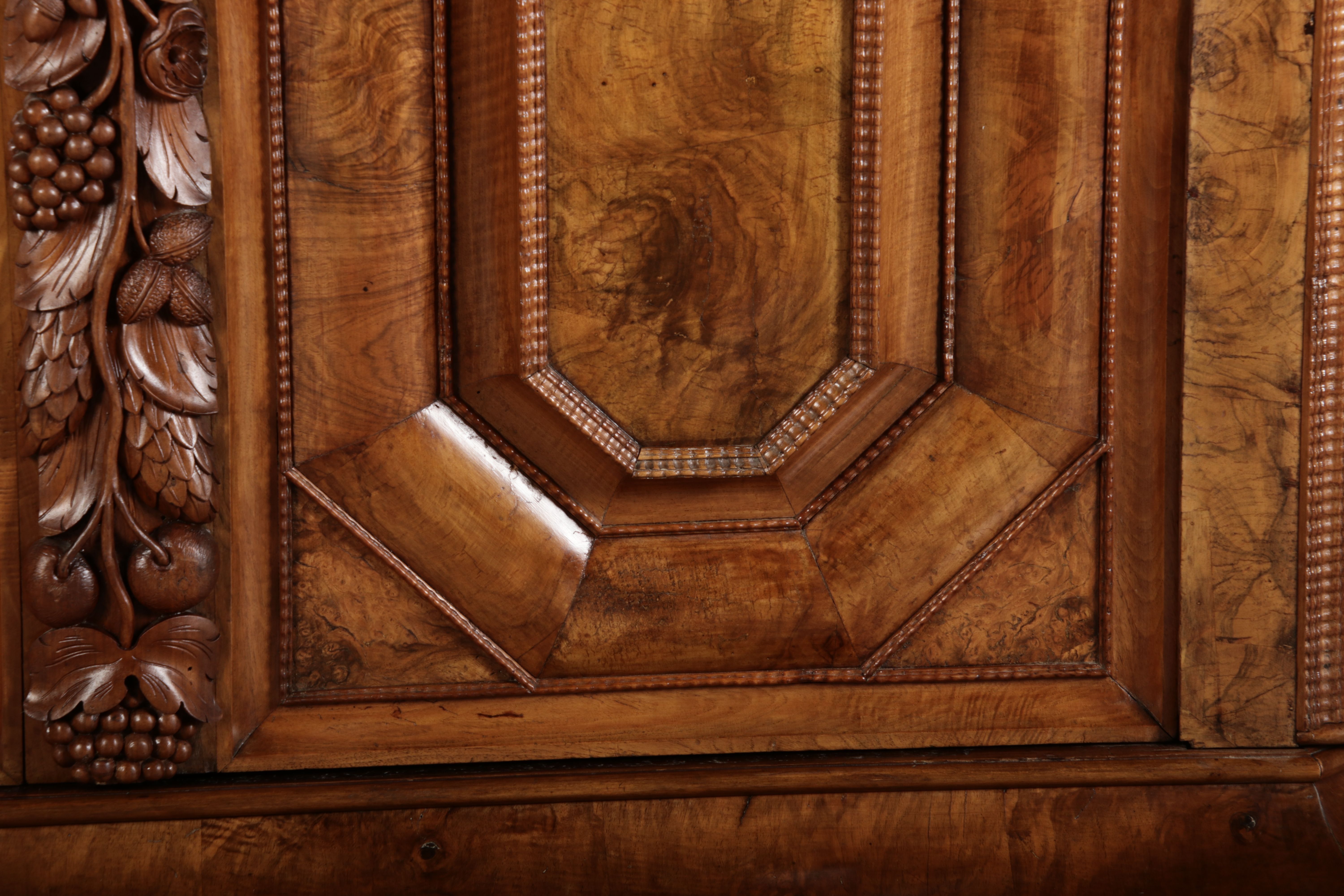 | Antiker Barockschrank um 1740-60 Nussbaum mit Trauben Schnitzereien |