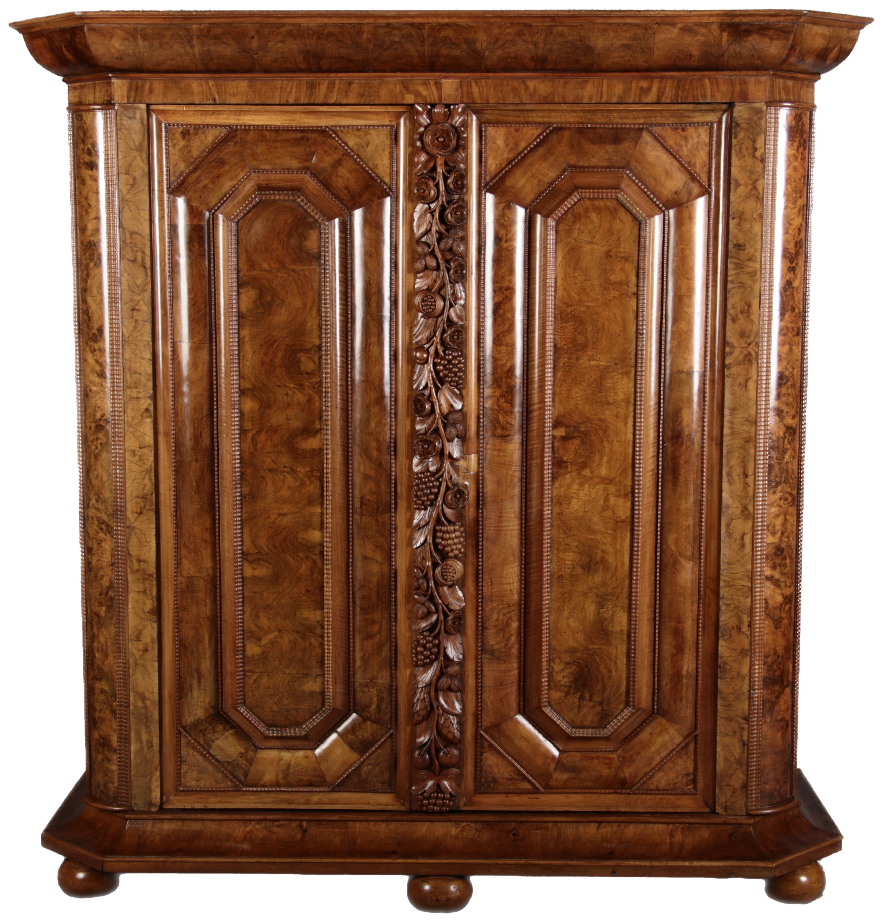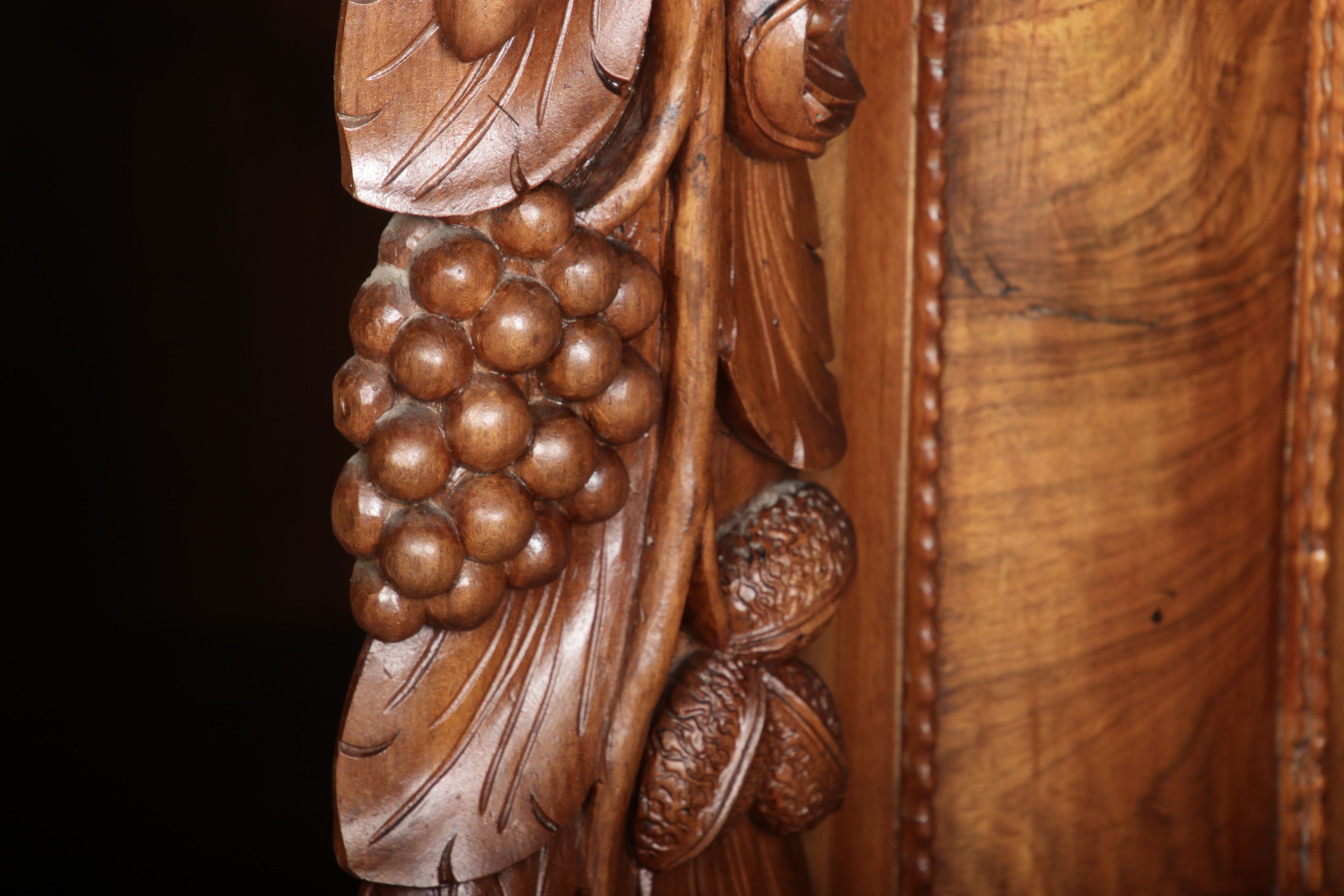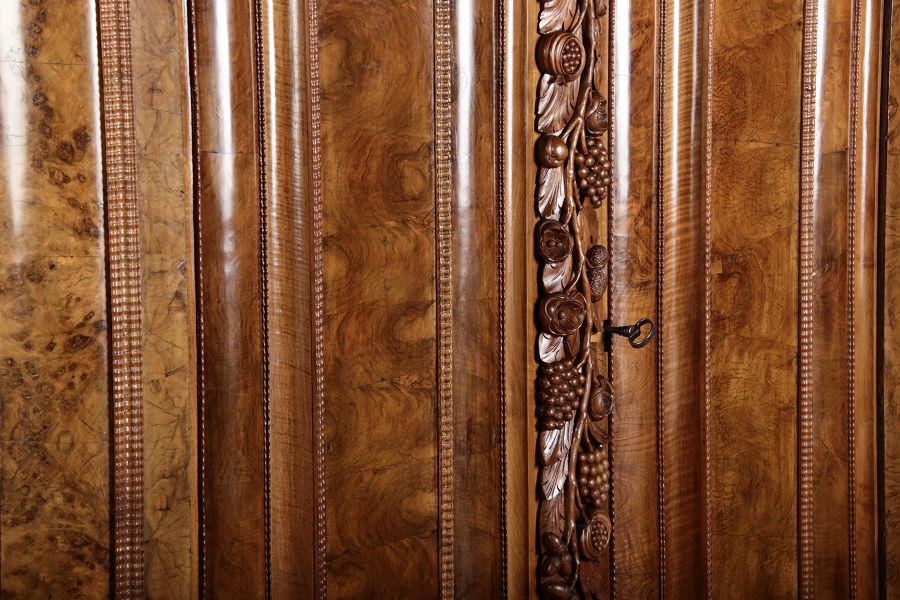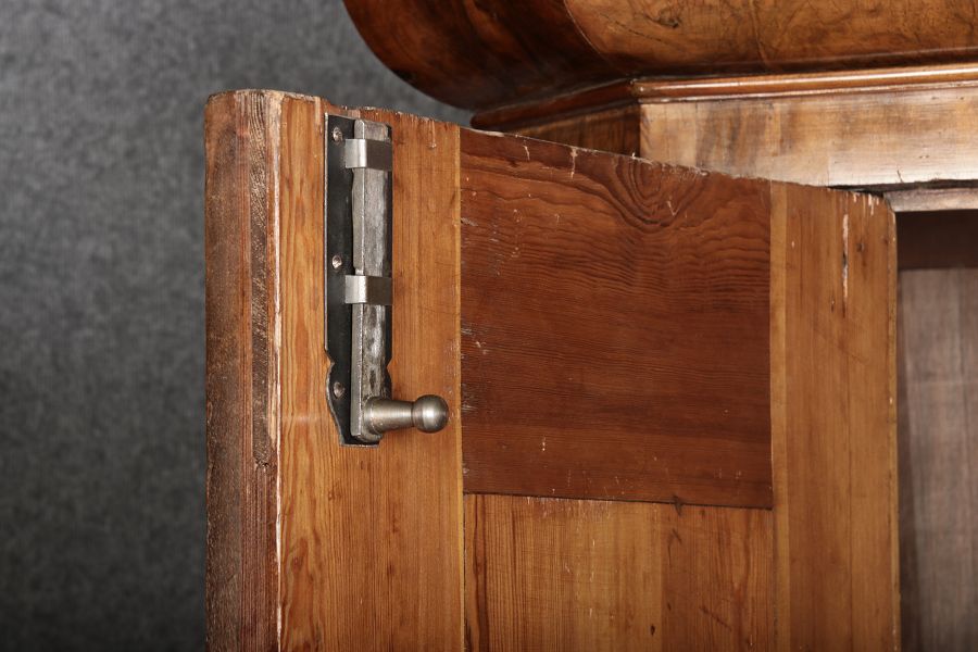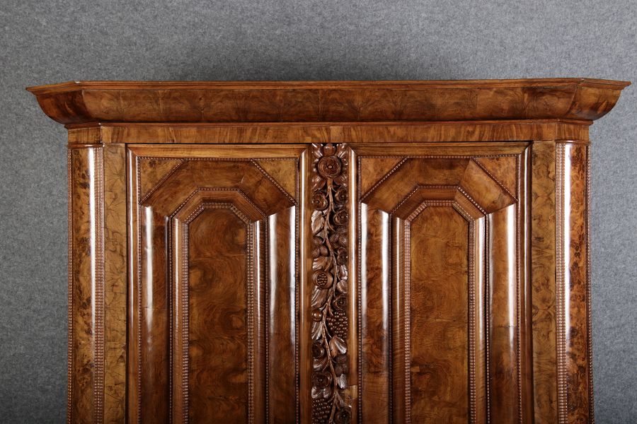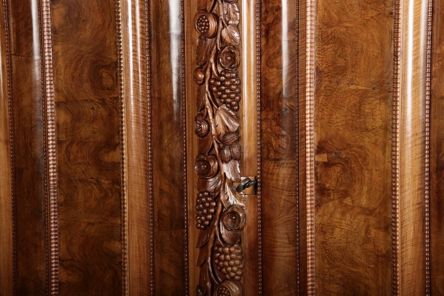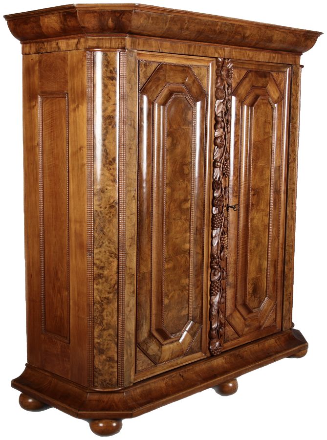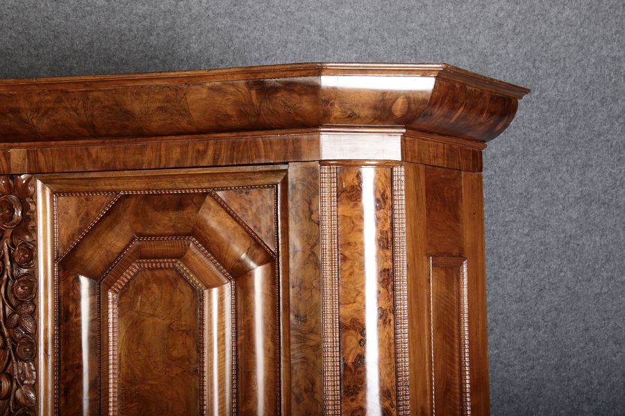| Antiker Barockschrank um 1740-60 Nussbaum mit Trauben Schnitzereien |