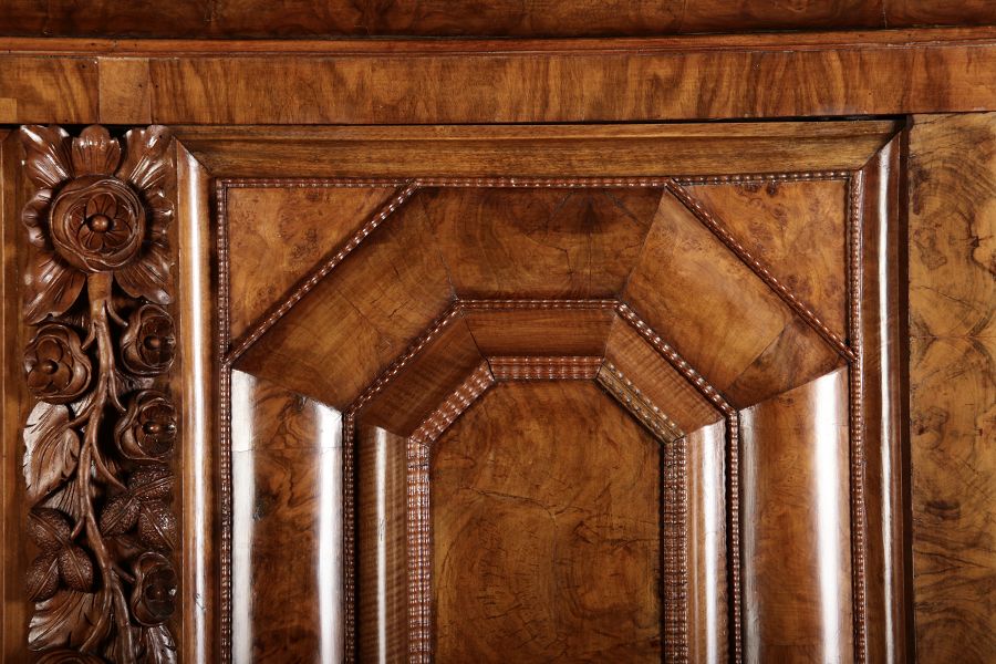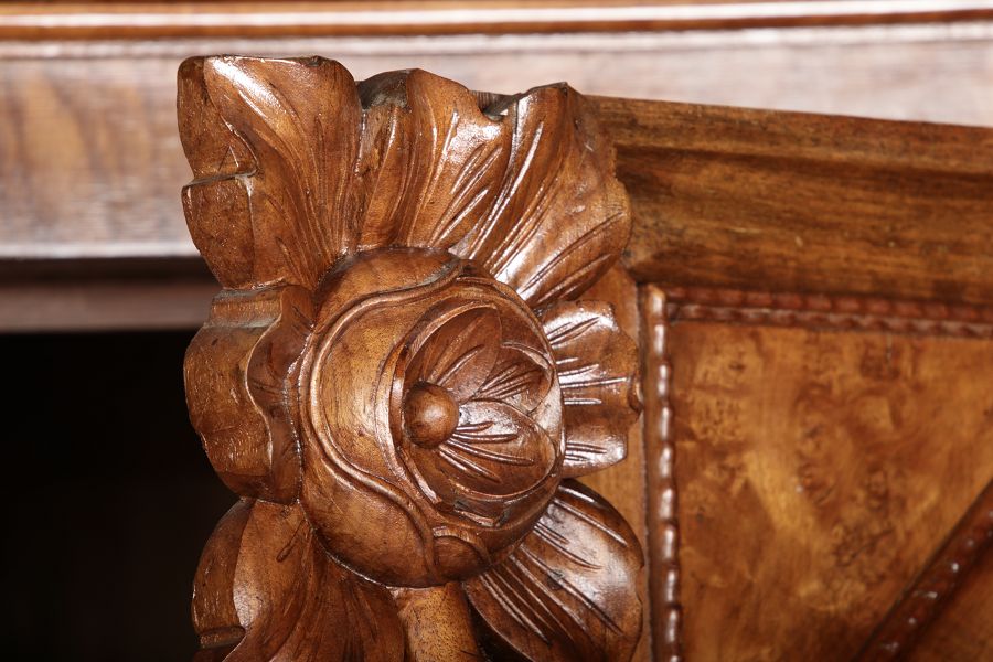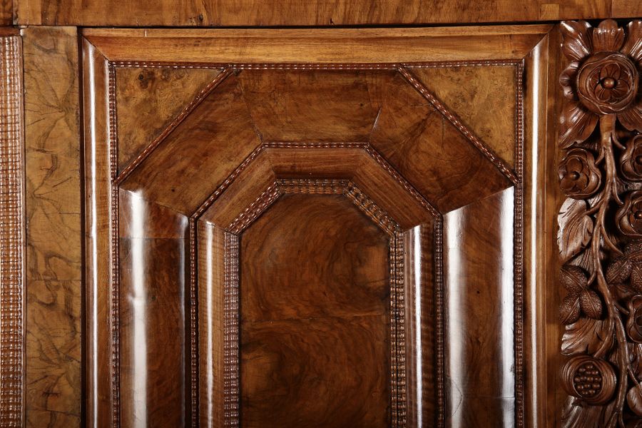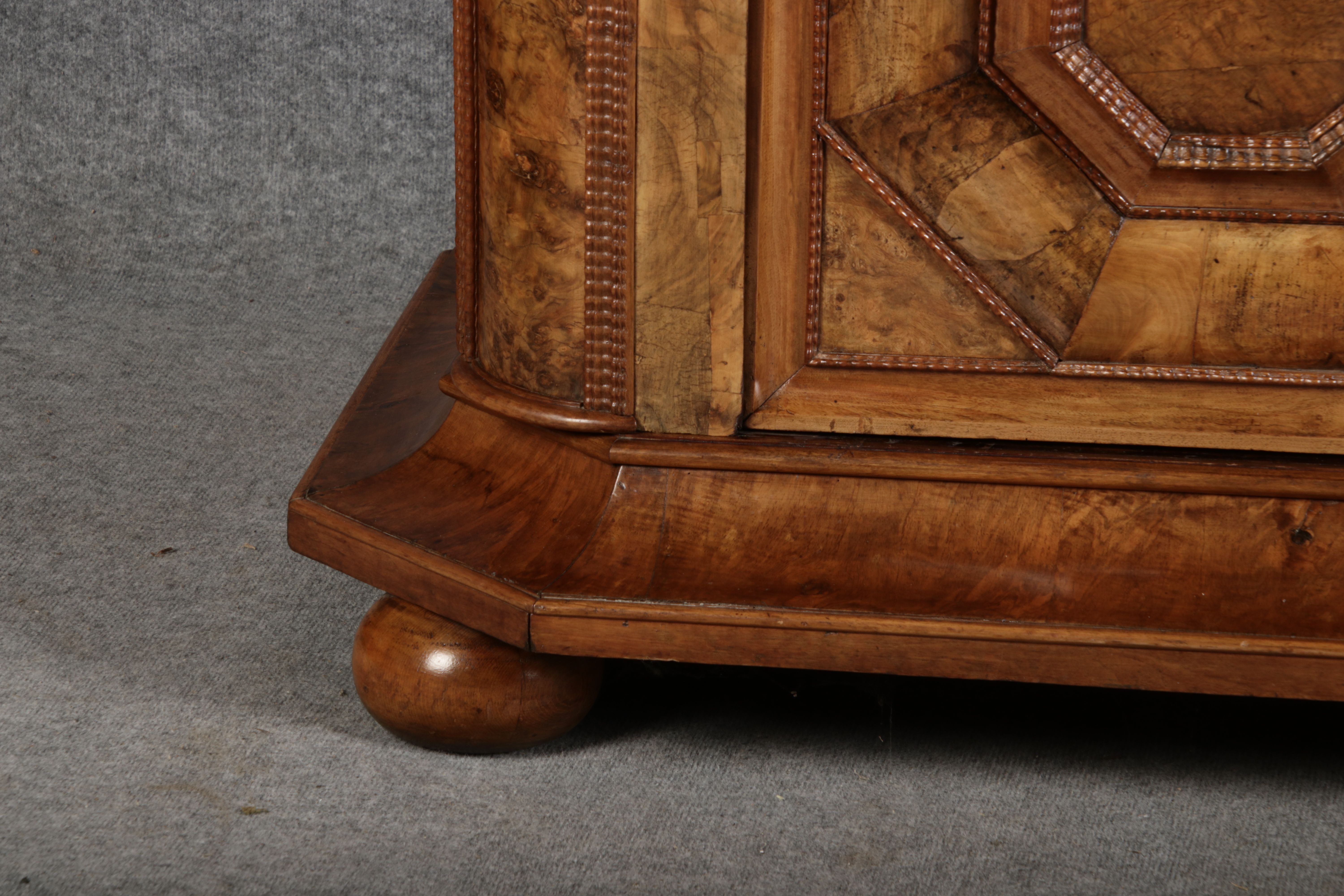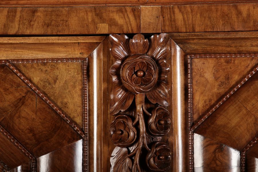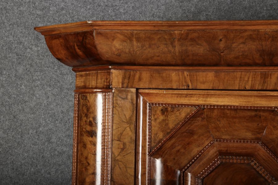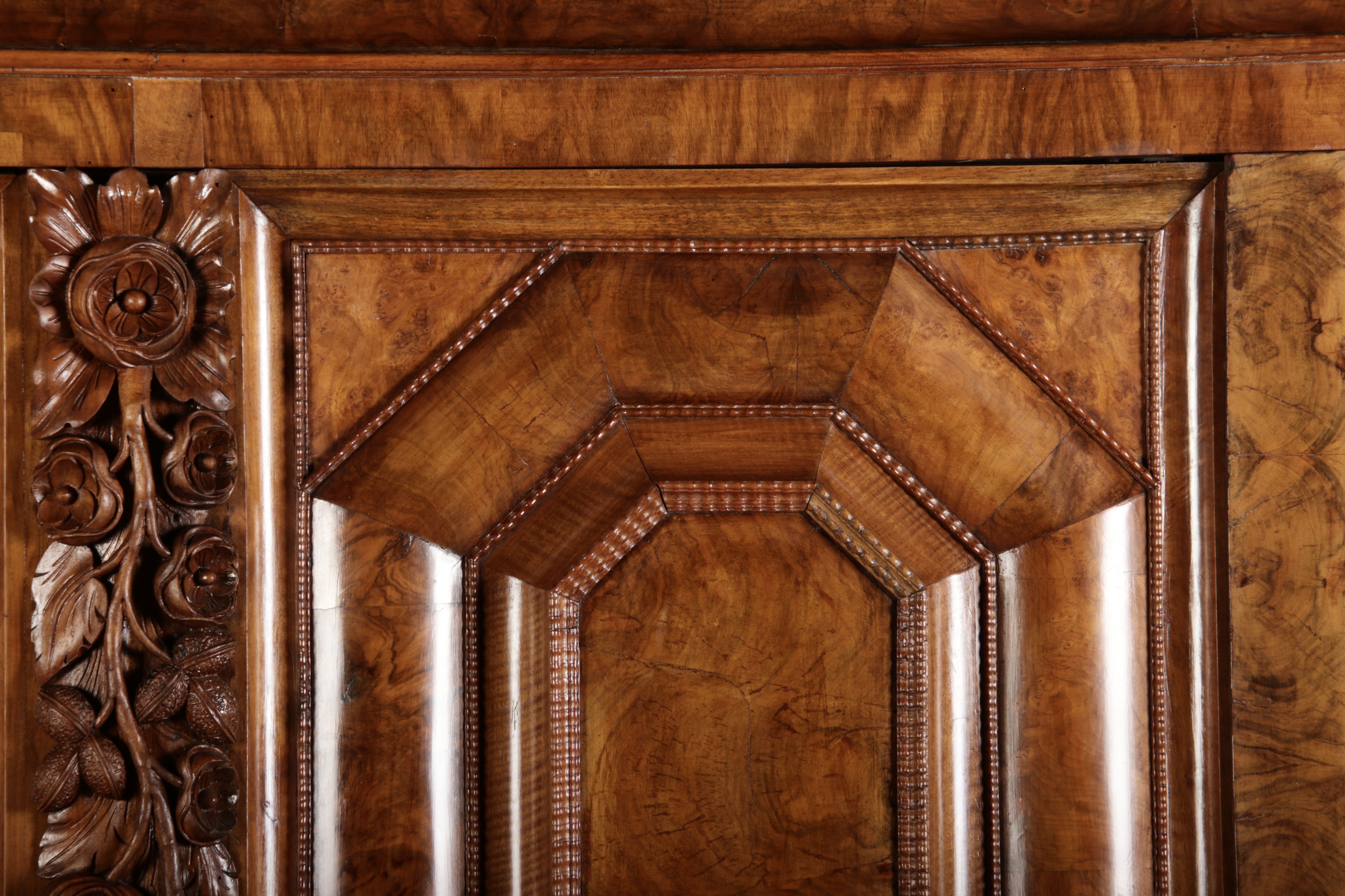 | Antiker Barockschrank um 1740-60 Nussbaum mit Trauben Schnitzereien |
