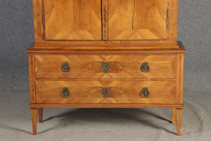 Masse/dimensions: Höhe/Height ca. 74/190 cm, Breite Korpus/Broad Boda ca. 118 cm, Breite Gesims/Broad cornice ca. 131 cm, Tiefe Korpus/Deep body ca. 30 cm, Tiefe Gesims/Deep cornice ca. 42 cm, Holz, Schlüssel/wood,