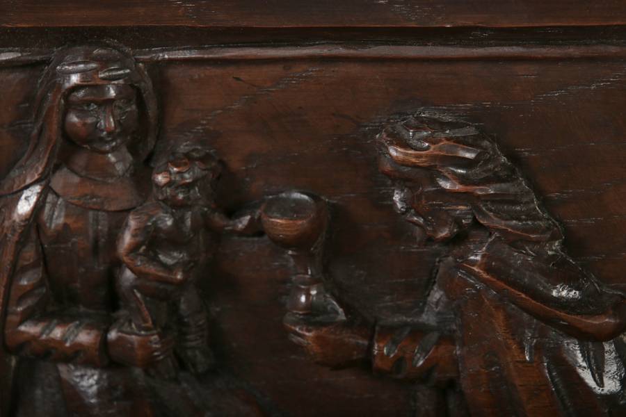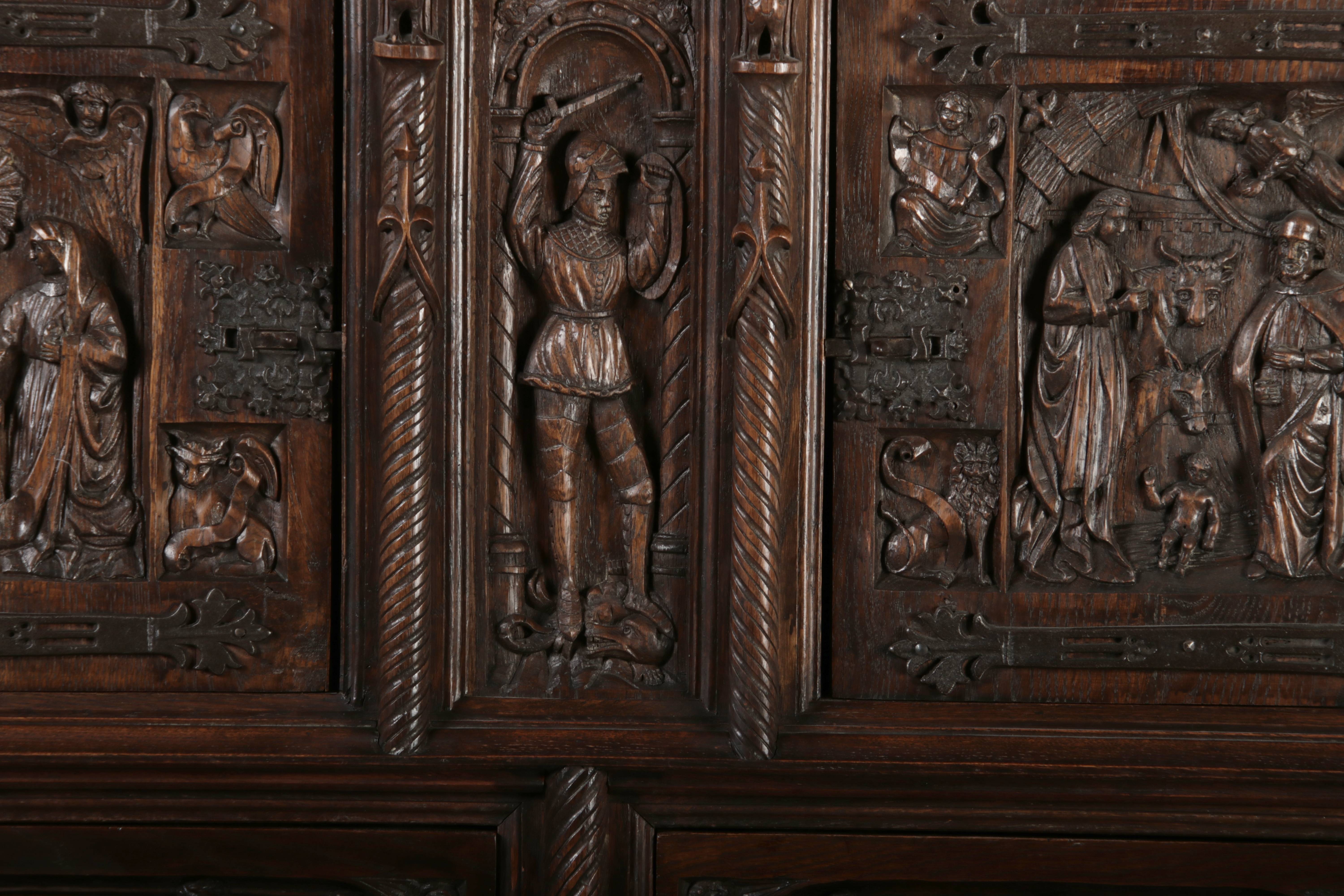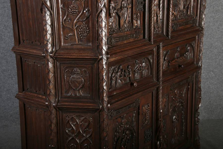 Prächtiger Schrank aus der Epoche des Historismus, gefertigt im späten 19. Jahrhundert. Das Möbel besticht durch sein außergewöhnlich reiches, tief gearbeitetes Schnitzwerk mit figürlichen und ornamentalen Darstellungen. Die Front ist in mehrere Felder gegliedert und zeigt reliefierte Szenen mit menschlichen Figuren, biblischen bzw. allegorischen Motiven sowie floralen und architektonischen Elementen. Der Korpus ist aus massivem Eichen Holz gearbeitet und zeigt eine warme, dunkel patinierte Oberfläche. Mit geschnitzten Säulen, profilierte Rahmen und aufwendig gestaltete Füllungen unterstreichen den repräsentativen Charakter des Schranks. Die handwerkliche Qualität und Detailtiefe der Schnitzereien zeugen von hoher Kunstfertigkeit. Innen bietet der Schrank großzügigen Stauraum und eignet sich sowohl als Aufbewahrungsmöbel als auch als eindrucksvolles Sammlerstück. Alters- und Gebrauchsspuren sind vorhanden und unterstreichen die Authentizität und den historischen Charakter des Möbels. Ein imposantes Originalstück des Historismus – ideal für Liebhaber historischer Möbel, repräsentative Interieurs oder Sammlungen.