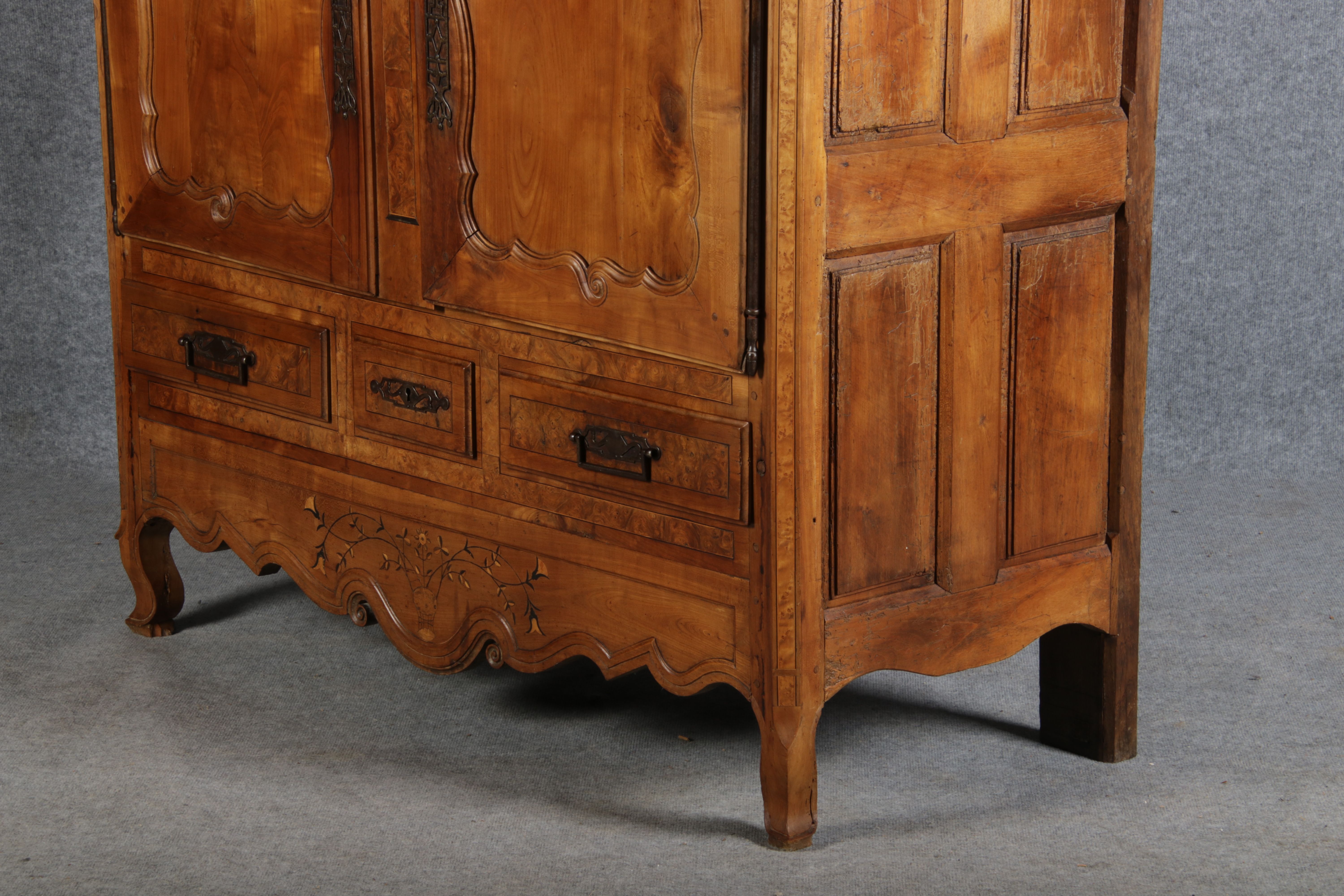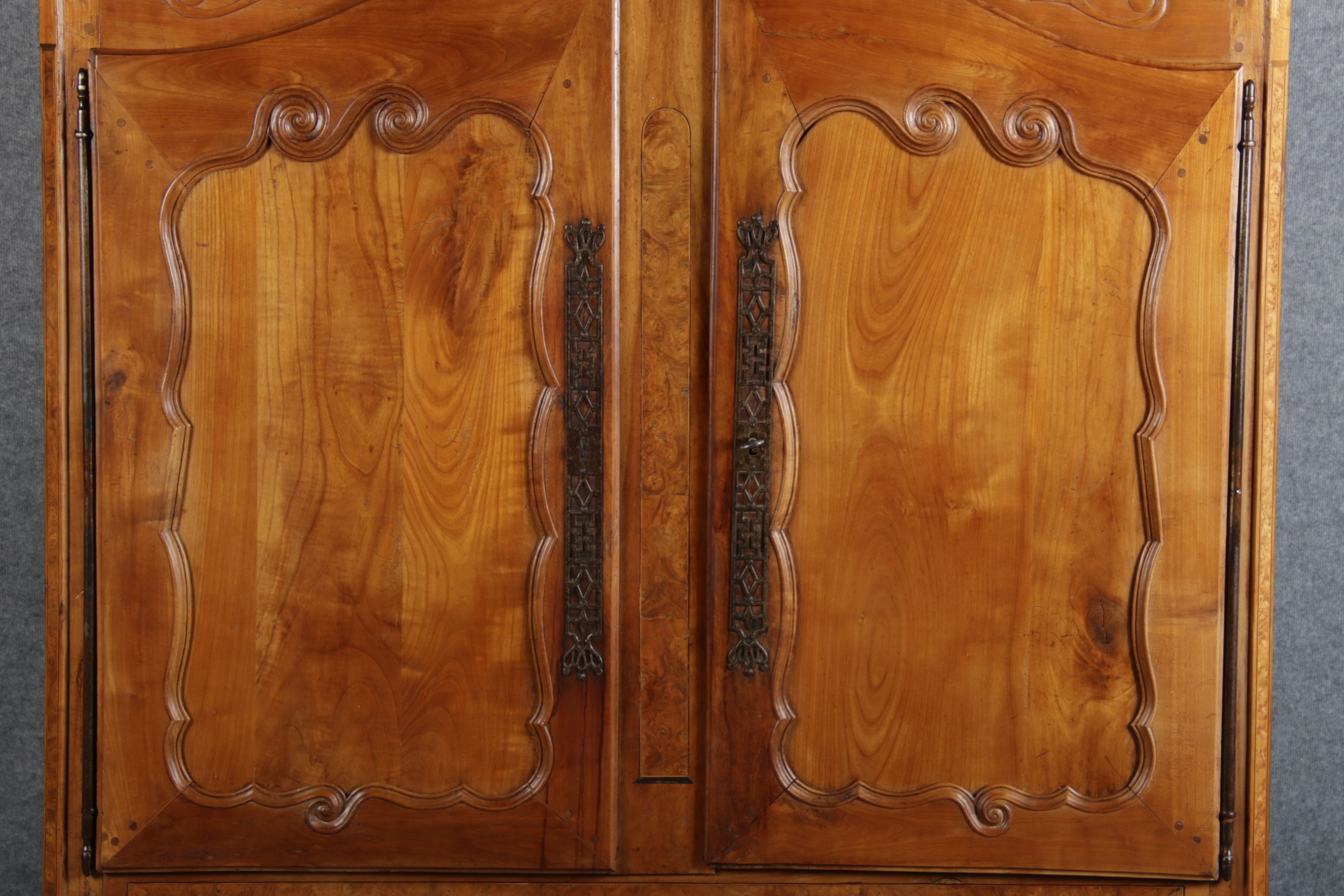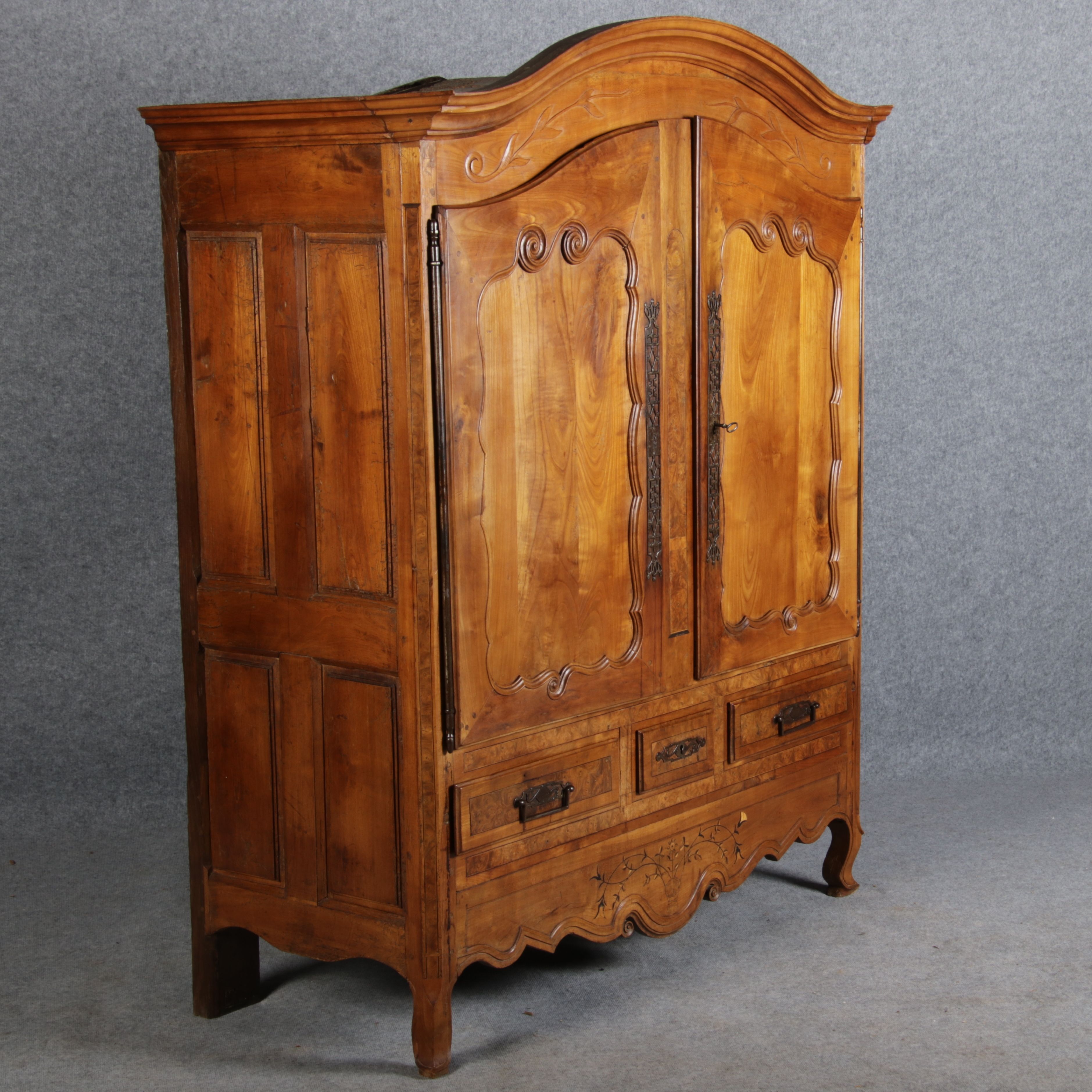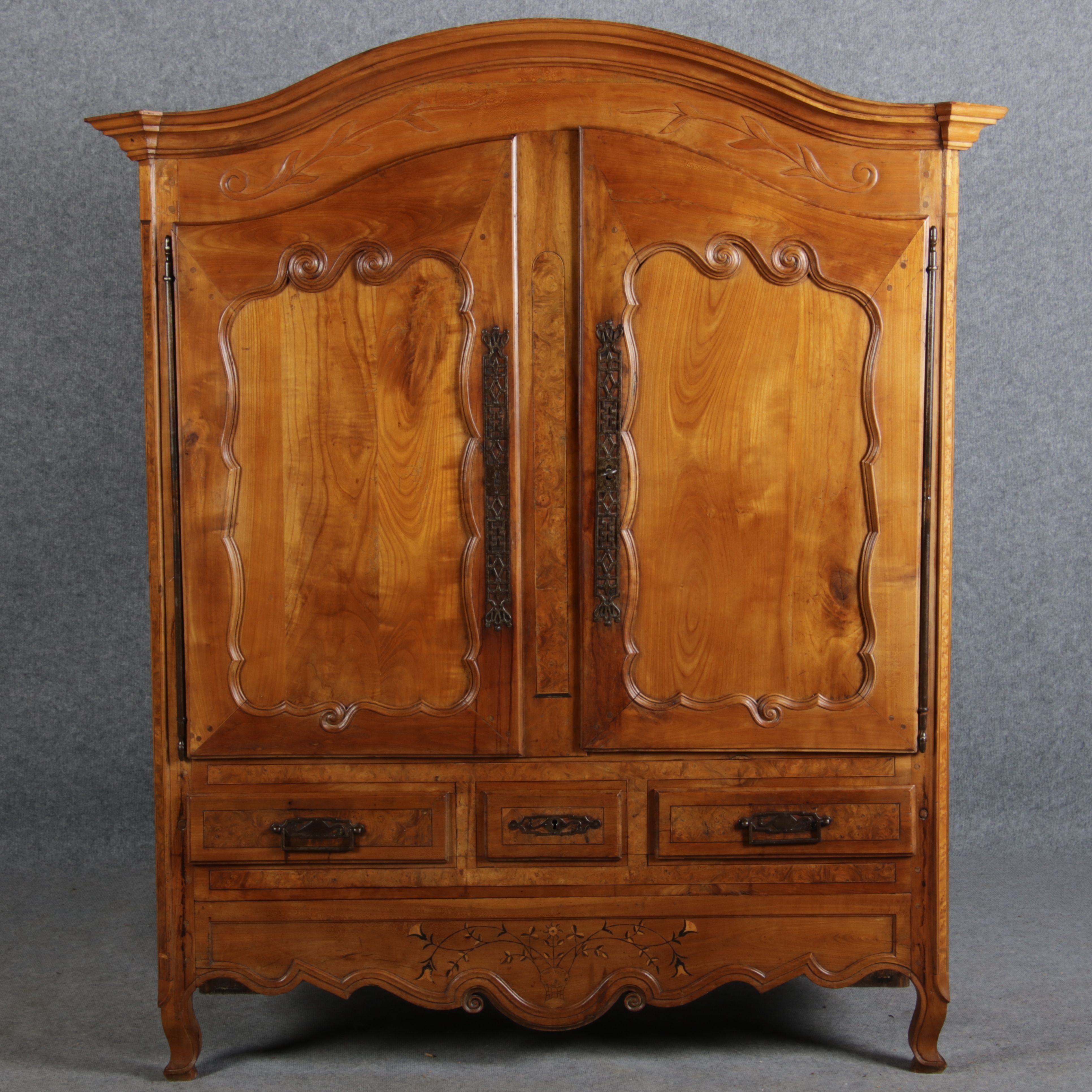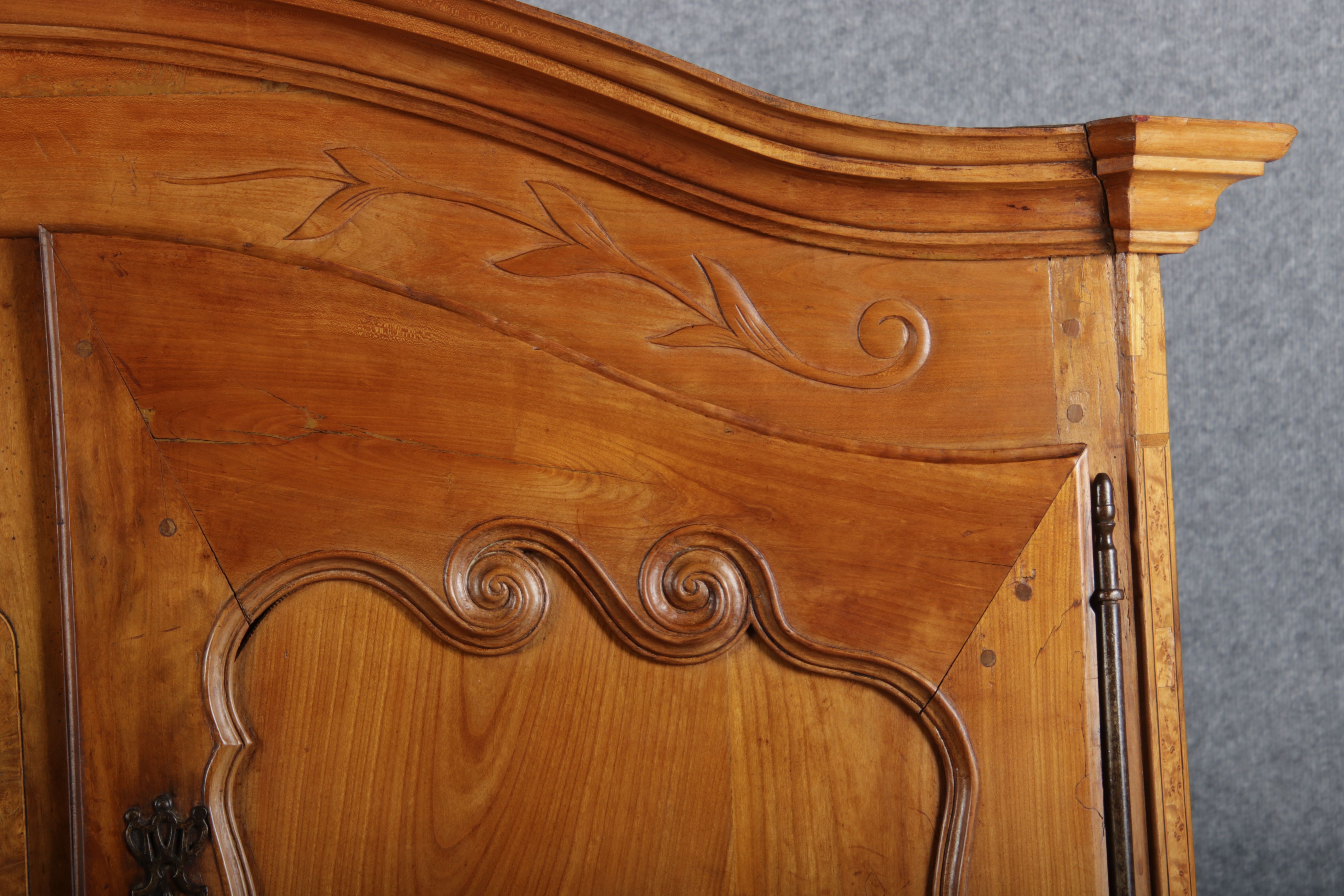 | Antiker Französischer Barockschrank um 1760 Kirschbaum große Eisenbeschläge- Türangeln, Kirchbaum, Schnitzereien, Einlegearbeiten und Bandeinlagen |