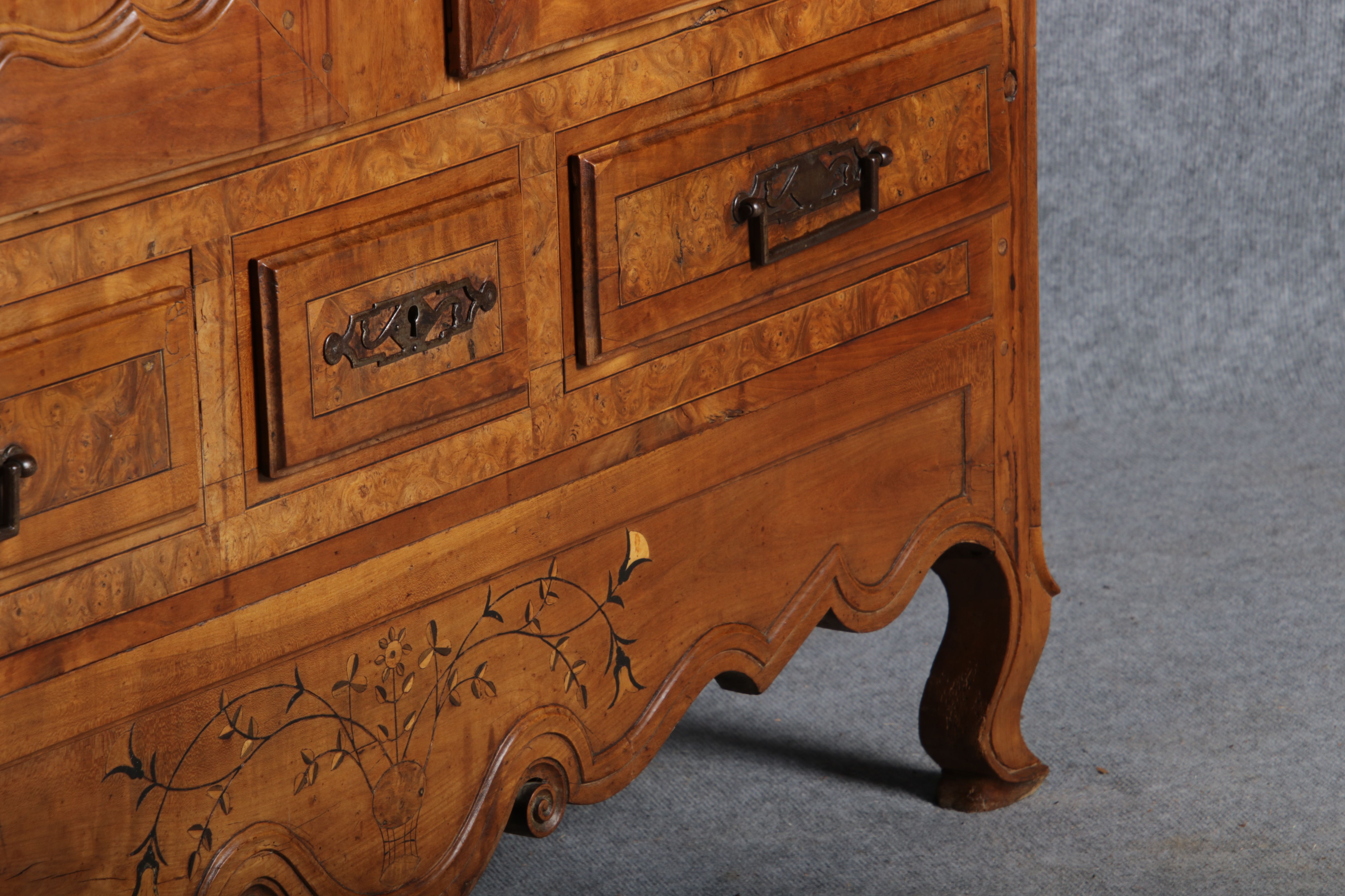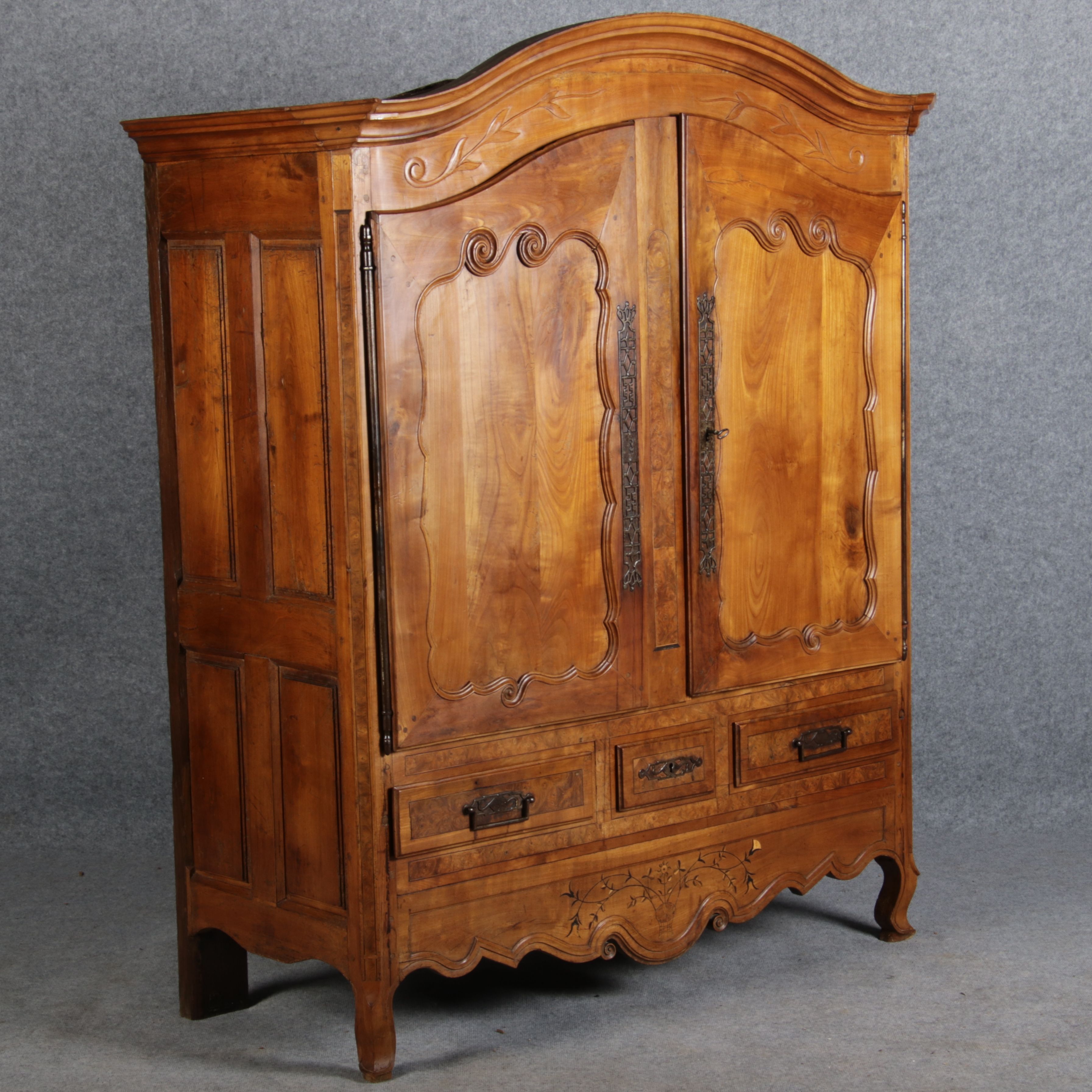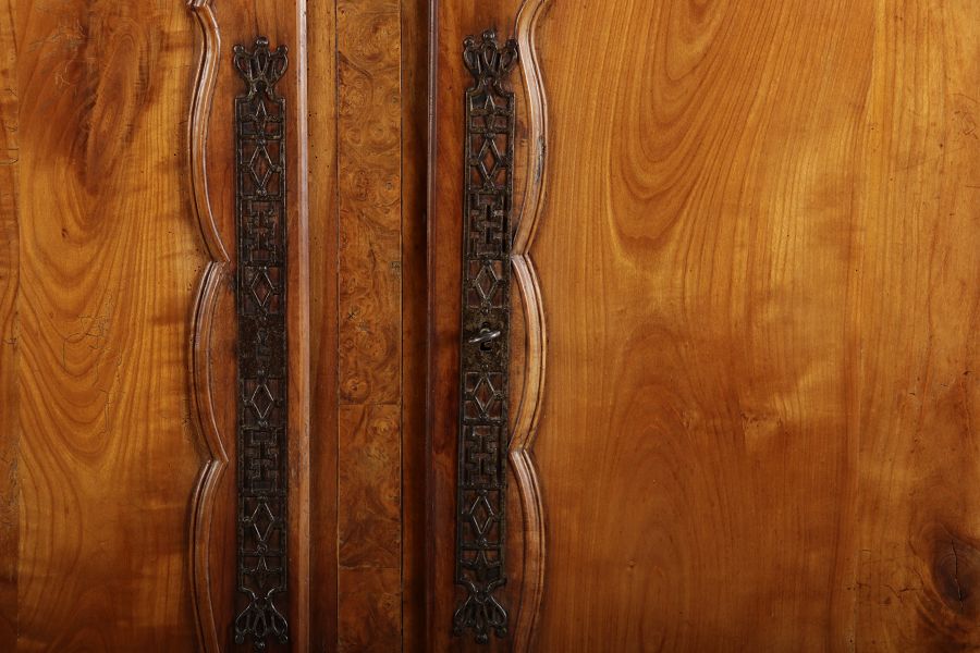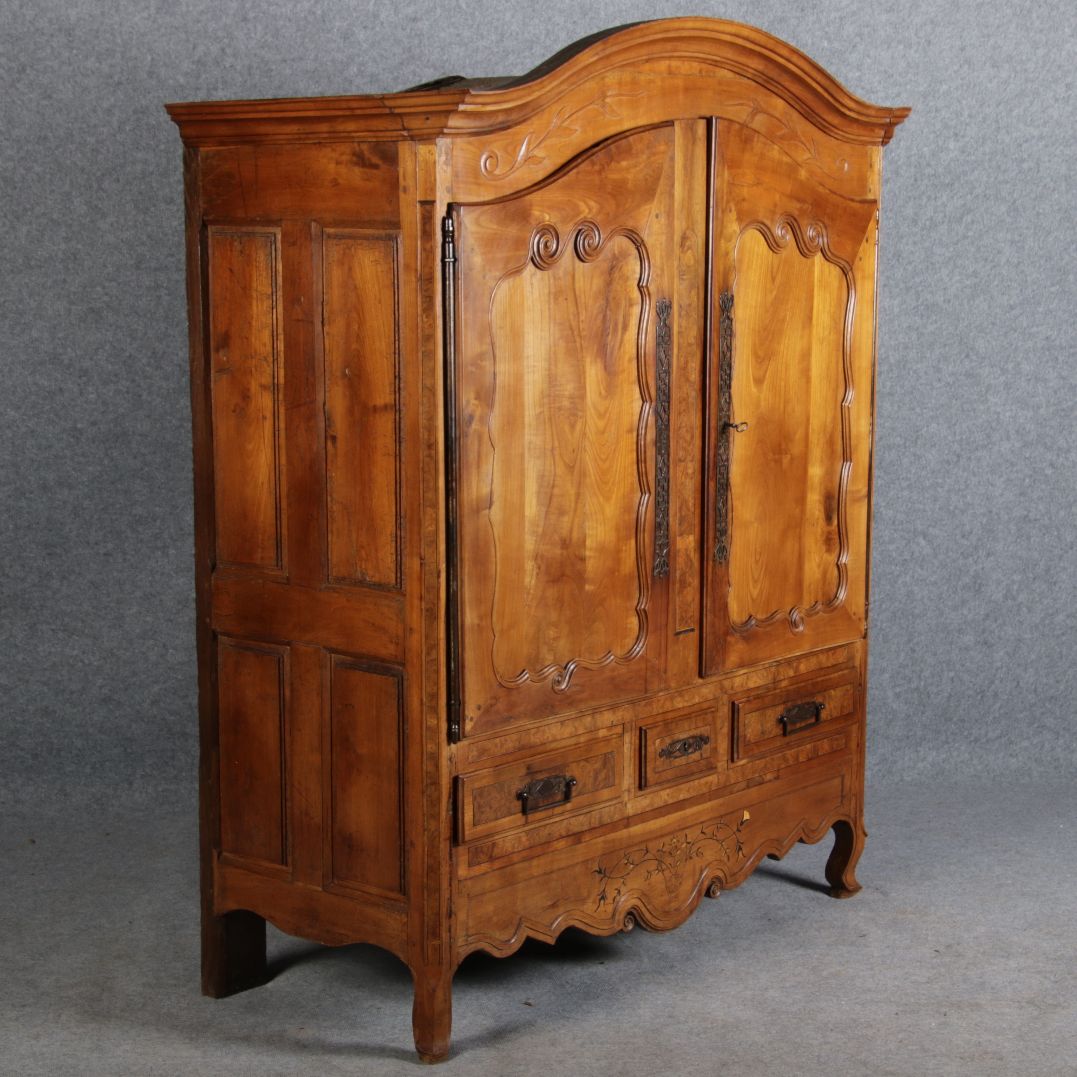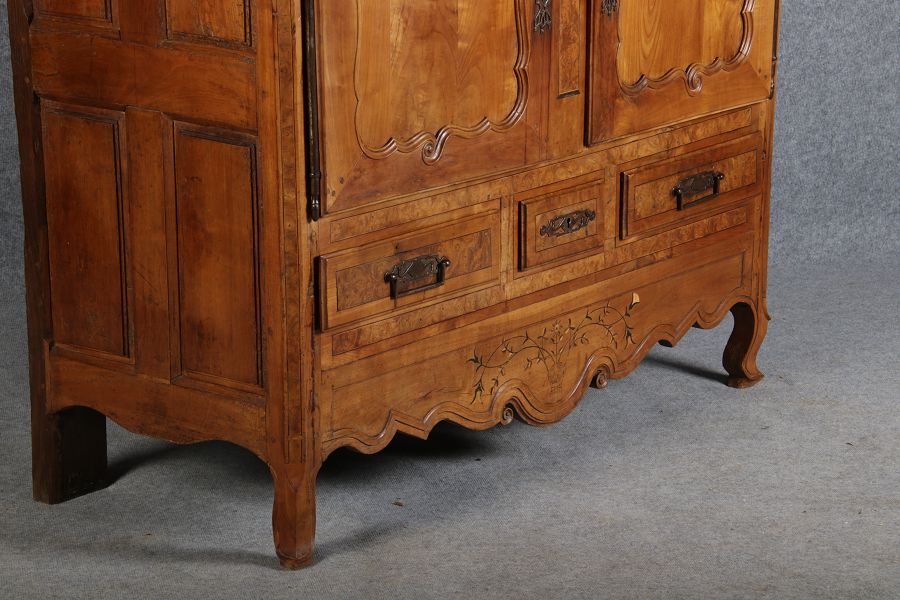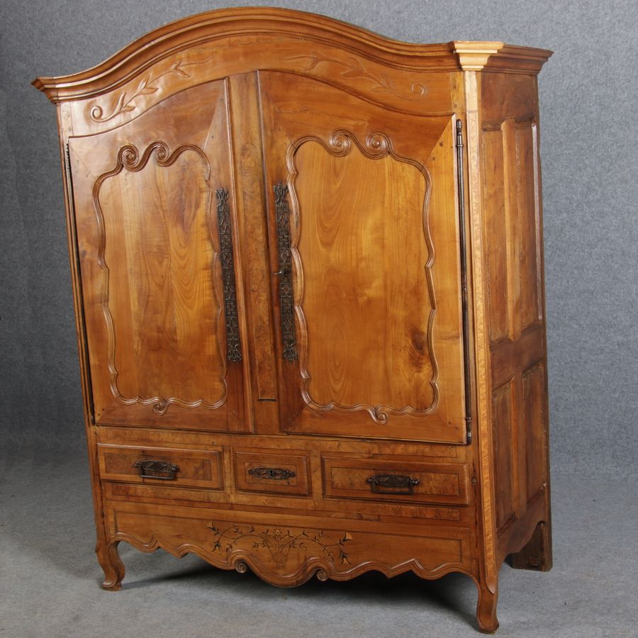 | Antiker Französischer Barockschrank um 1760 Kirschbaum große Eisenbeschläge- Türangeln, Kirchbaum, Schnitzereien, Einlegearbeiten und Bandeinlagen |