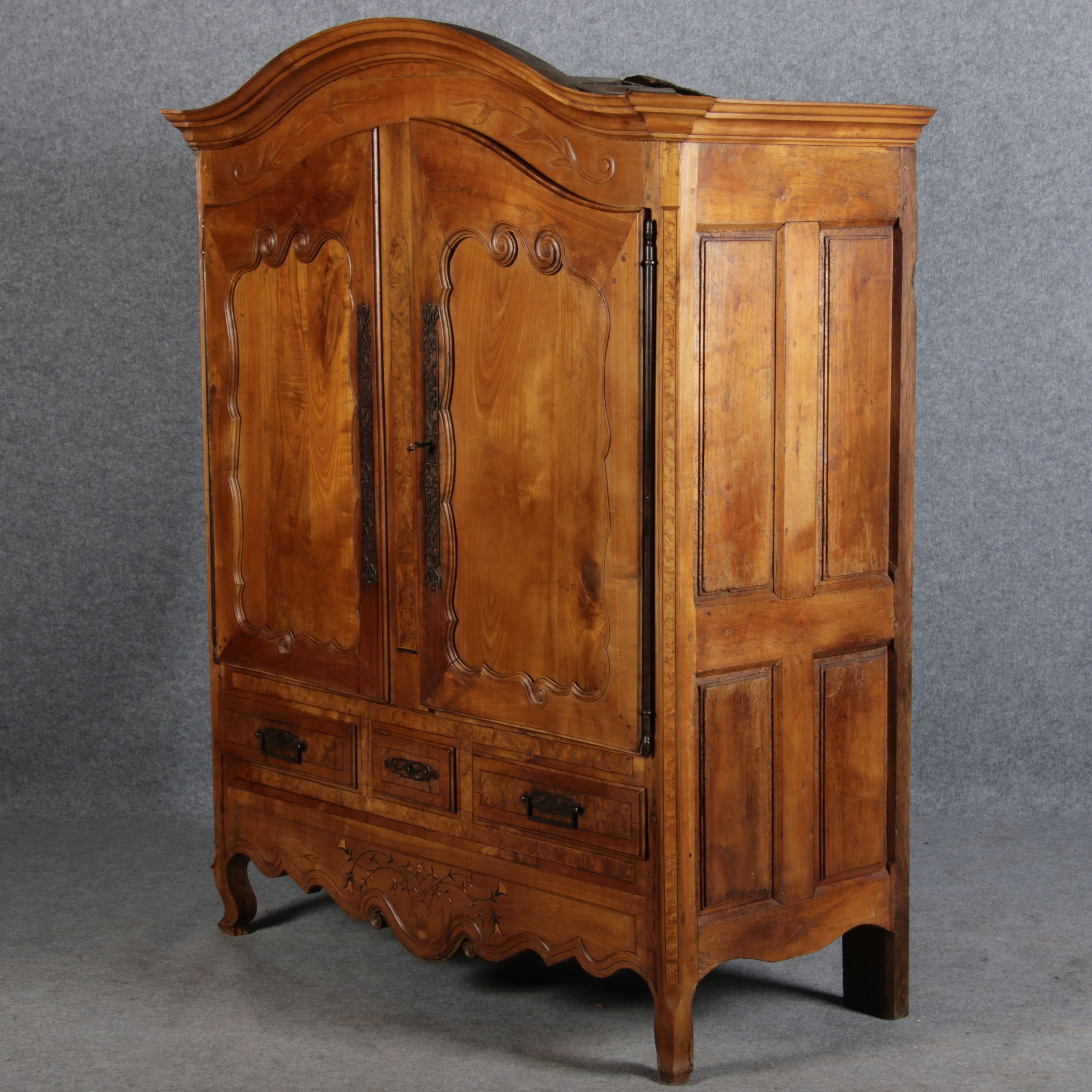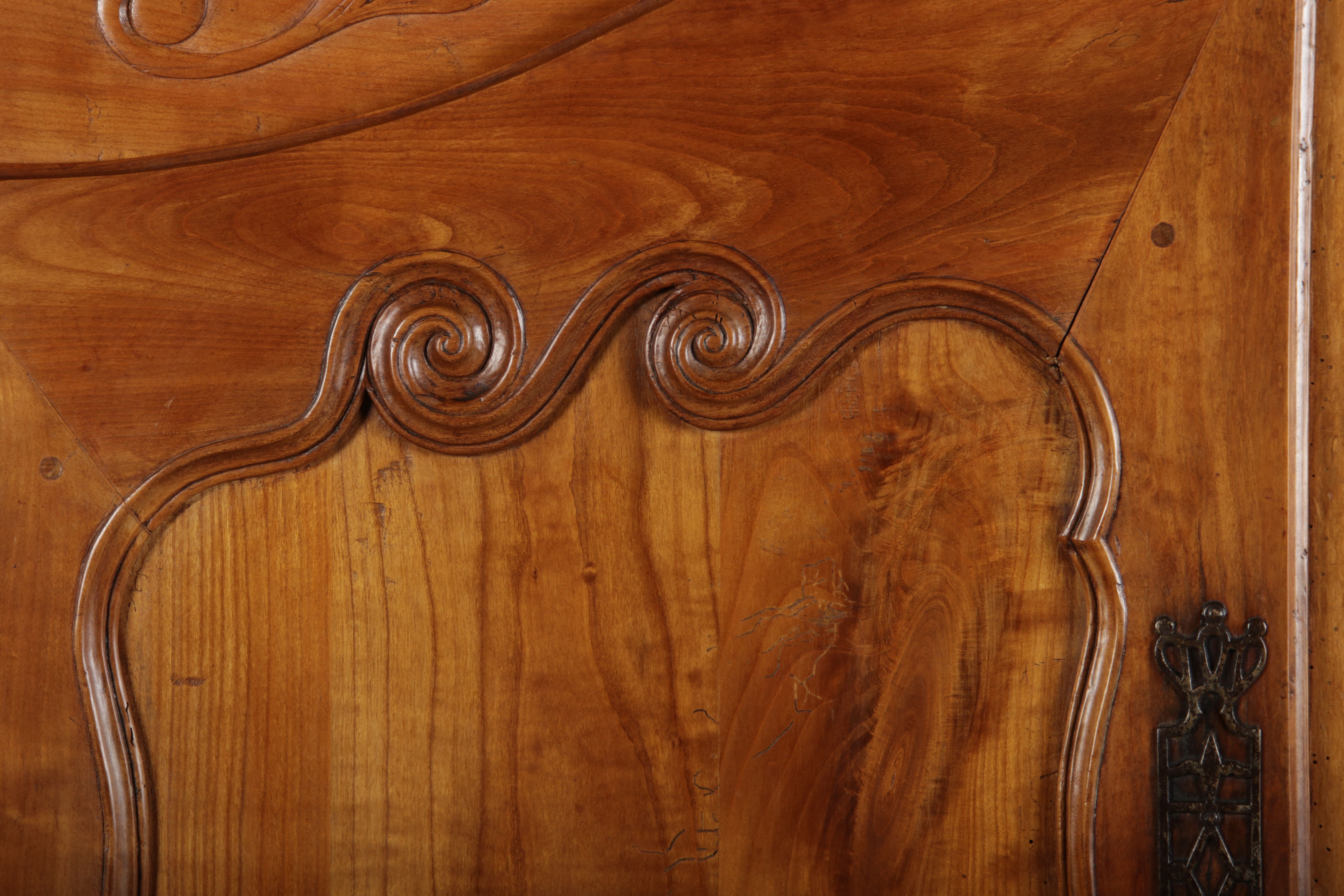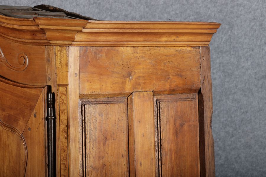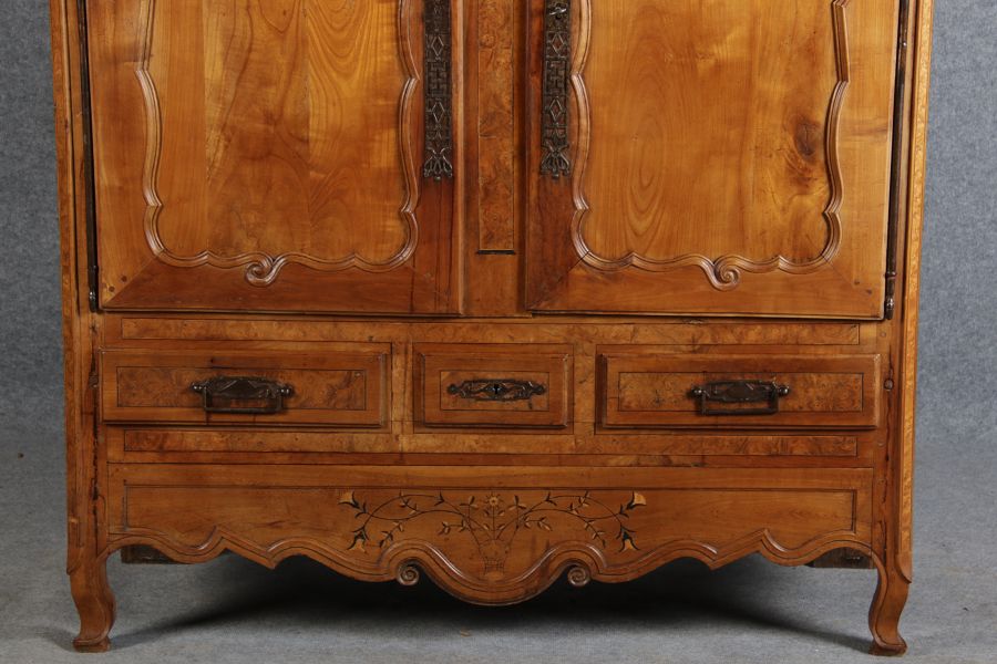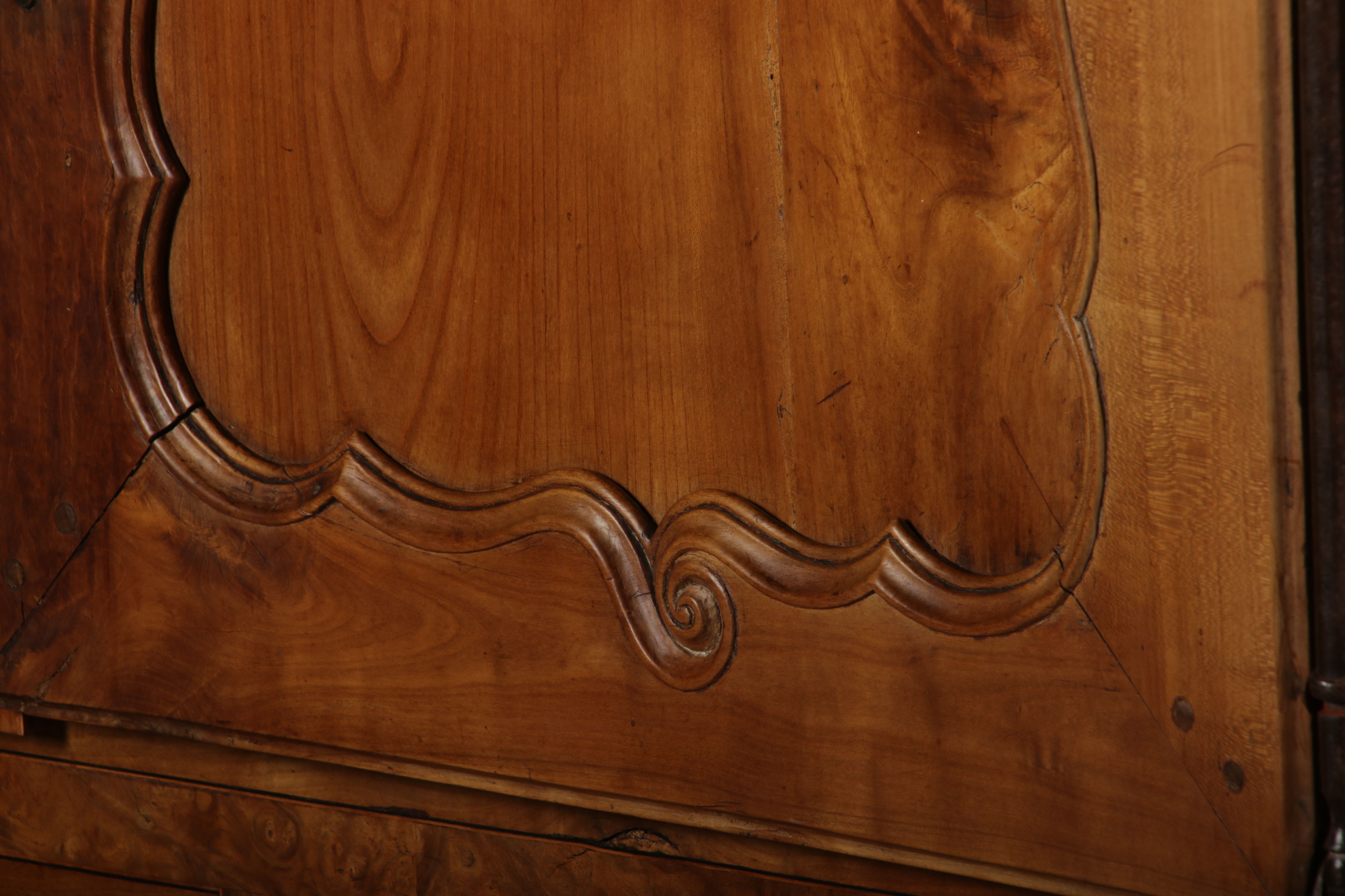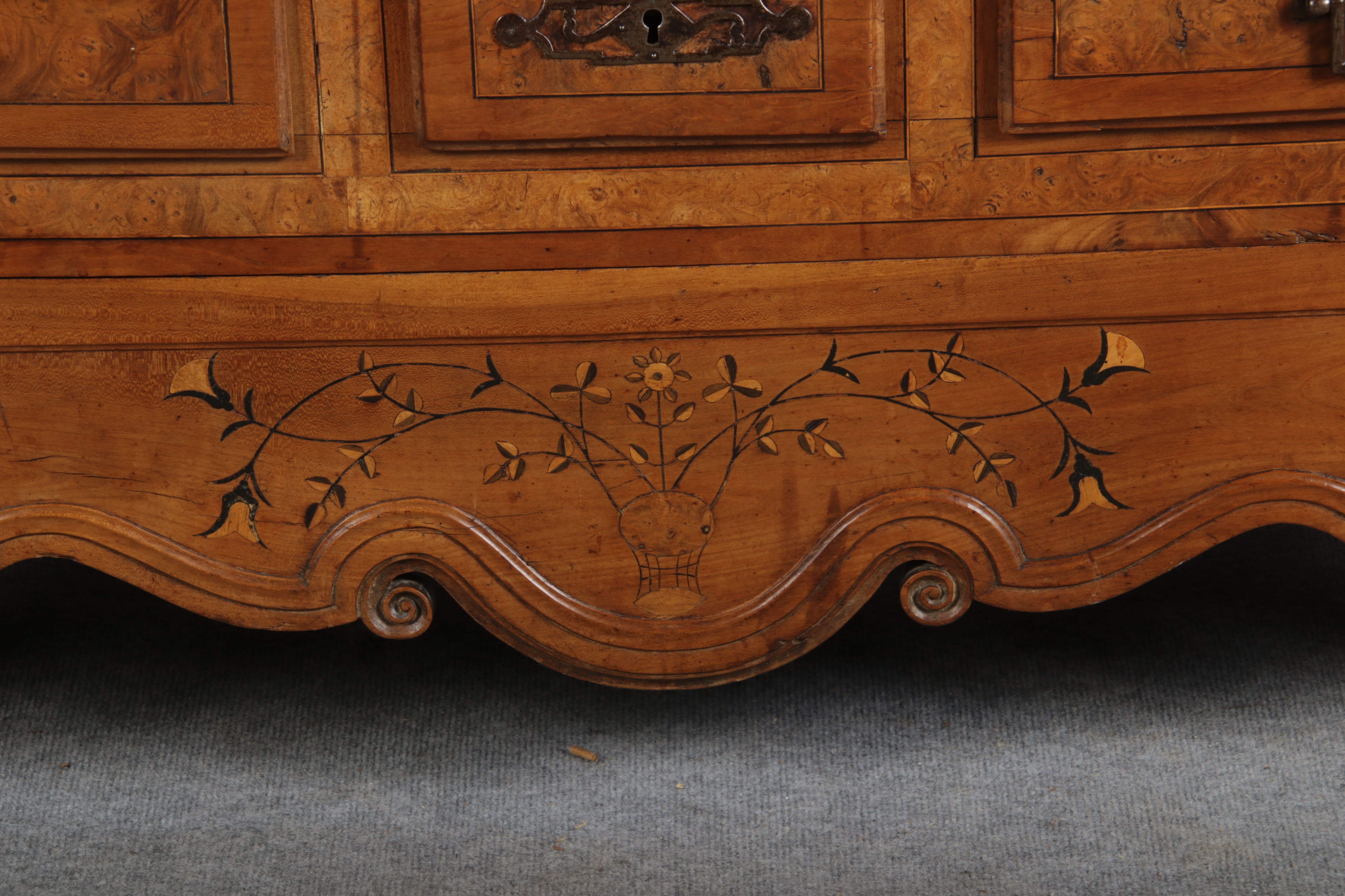 | Antiker Französischer Barockschrank um 1760 Kirschbaum große Eisenbeschläge- Türangeln, Kirchbaum, Schnitzereien, Einlegearbeiten und Bandeinlagen |
