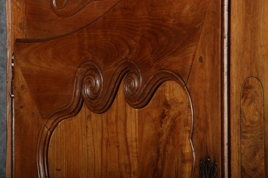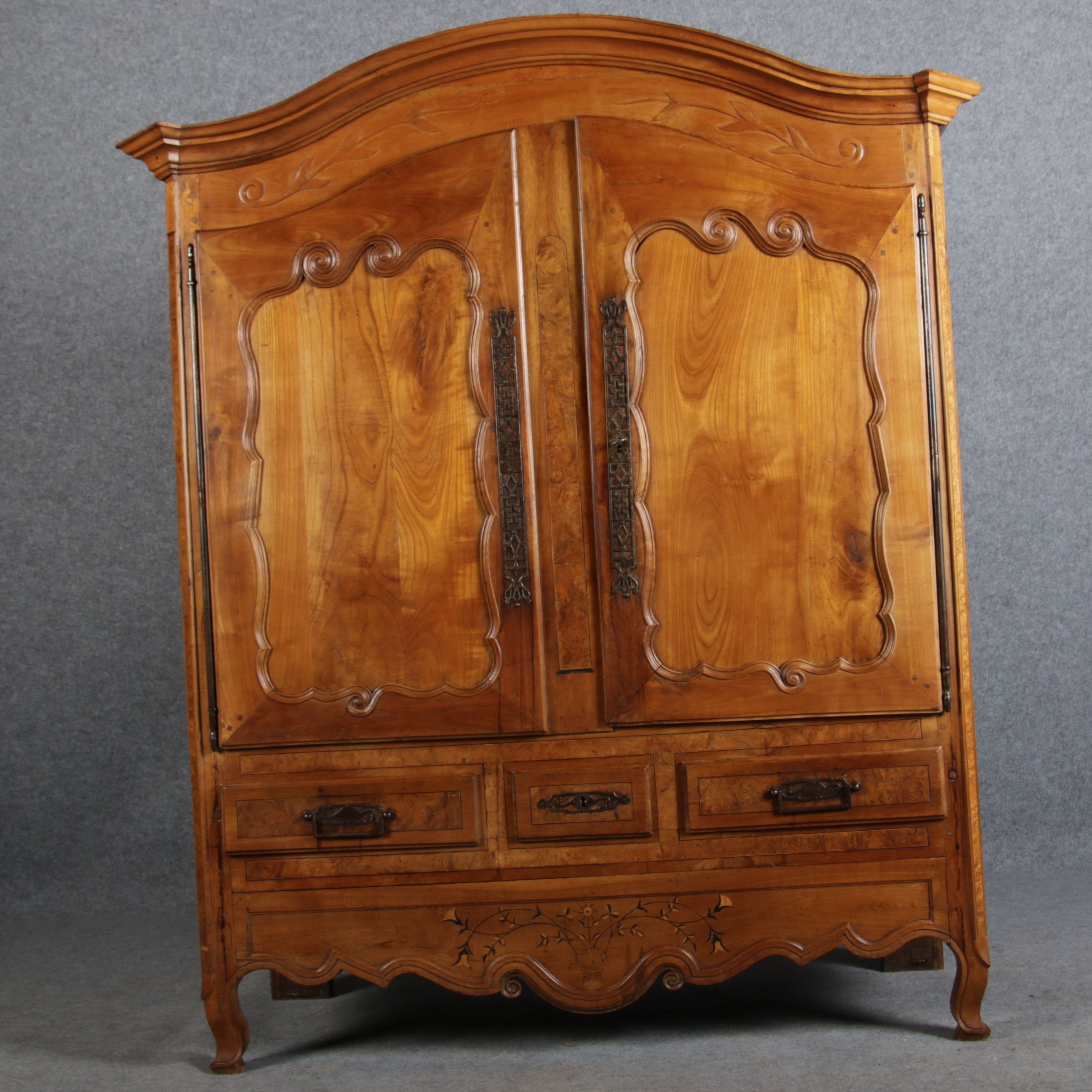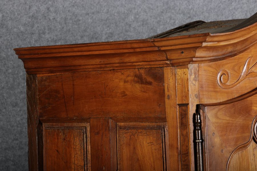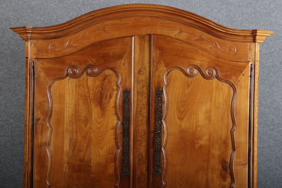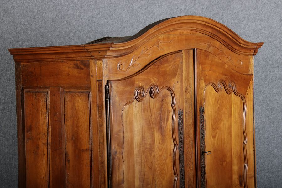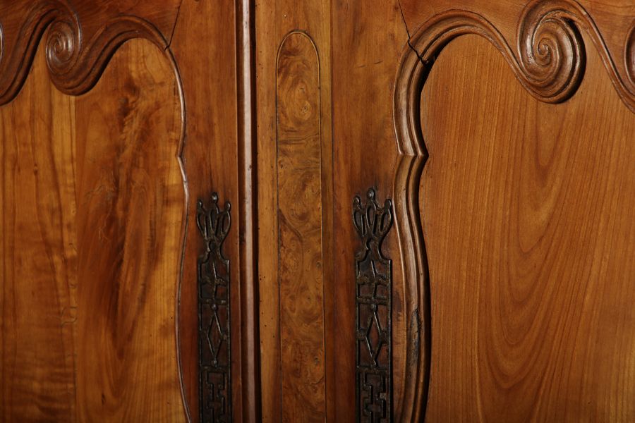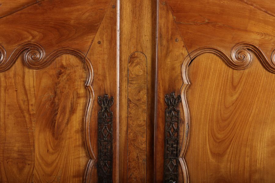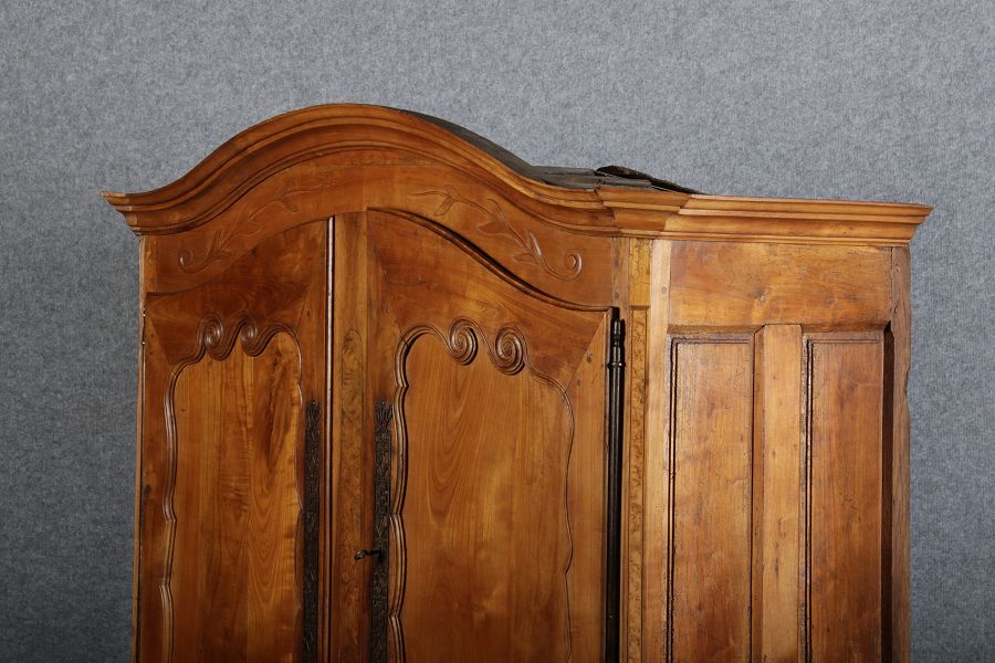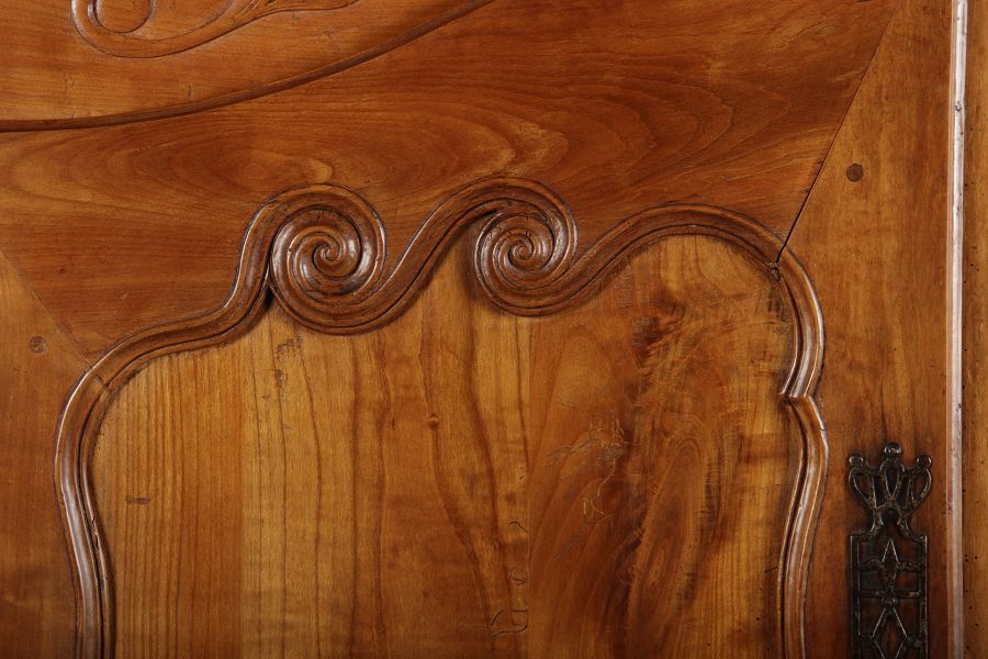 | Antiker Französischer Barockschrank um 1760 Kirschbaum große Eisenbeschläge- Türangeln, Kirchbaum, Schnitzereien, Einlegearbeiten und Bandeinlagen |