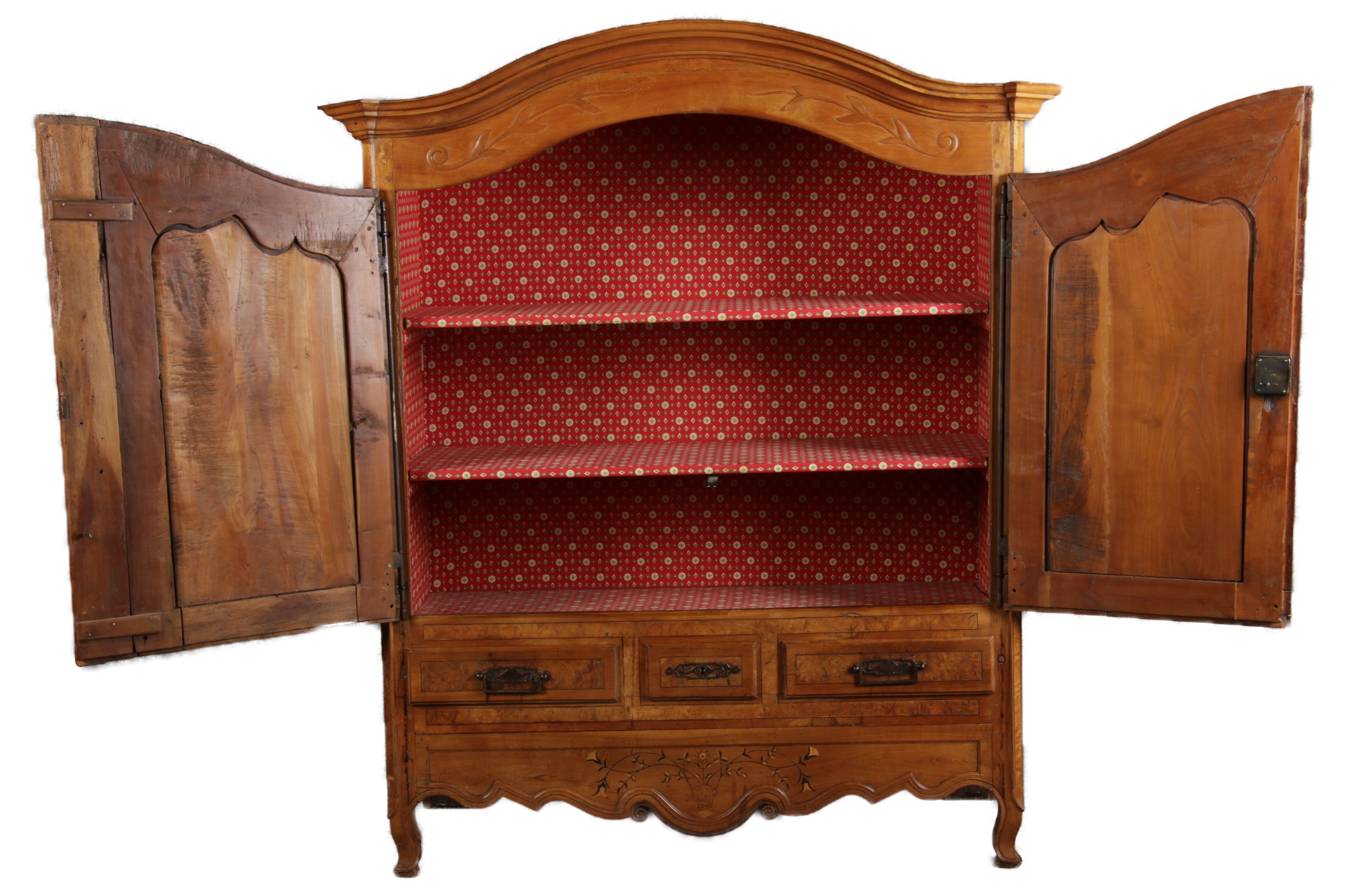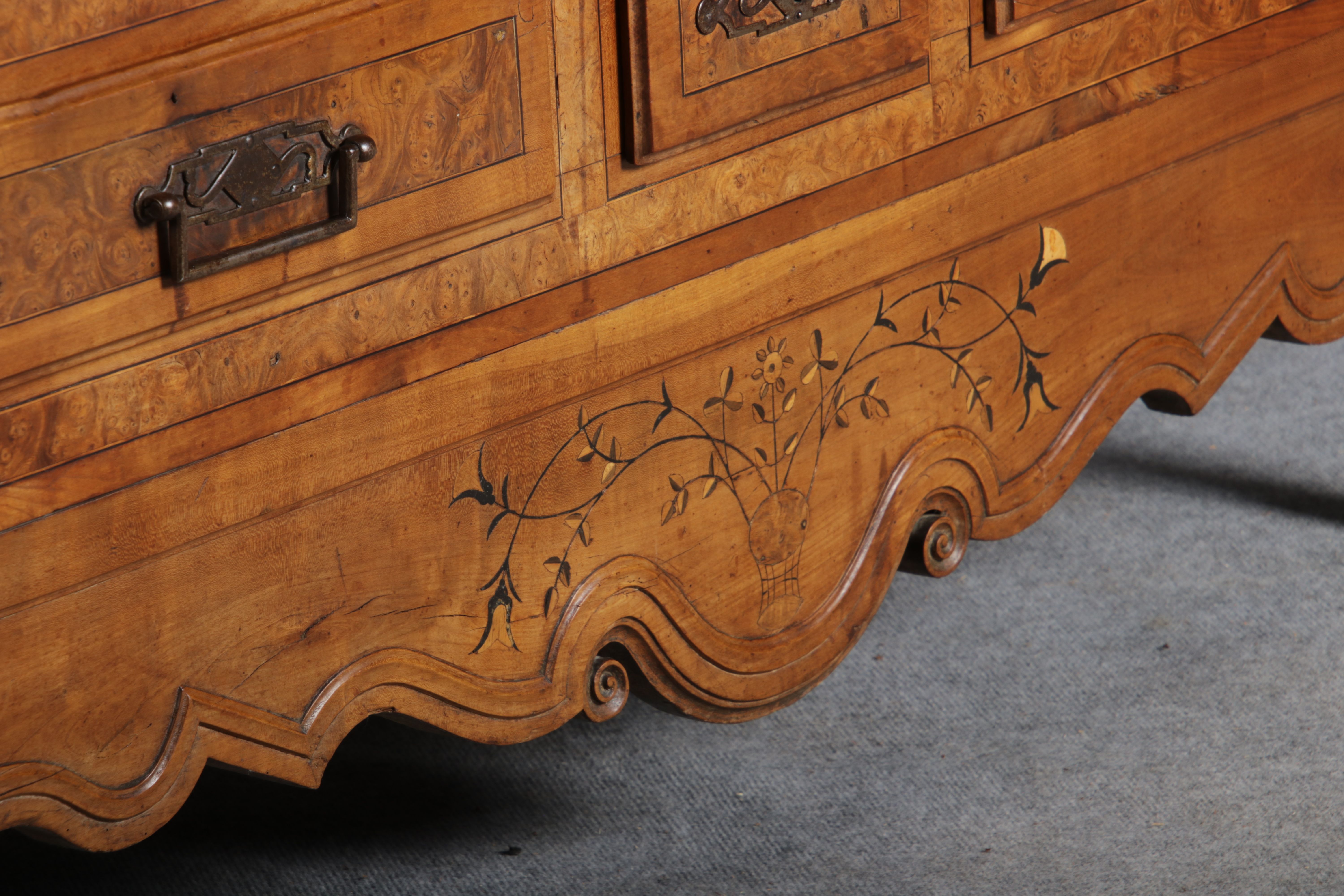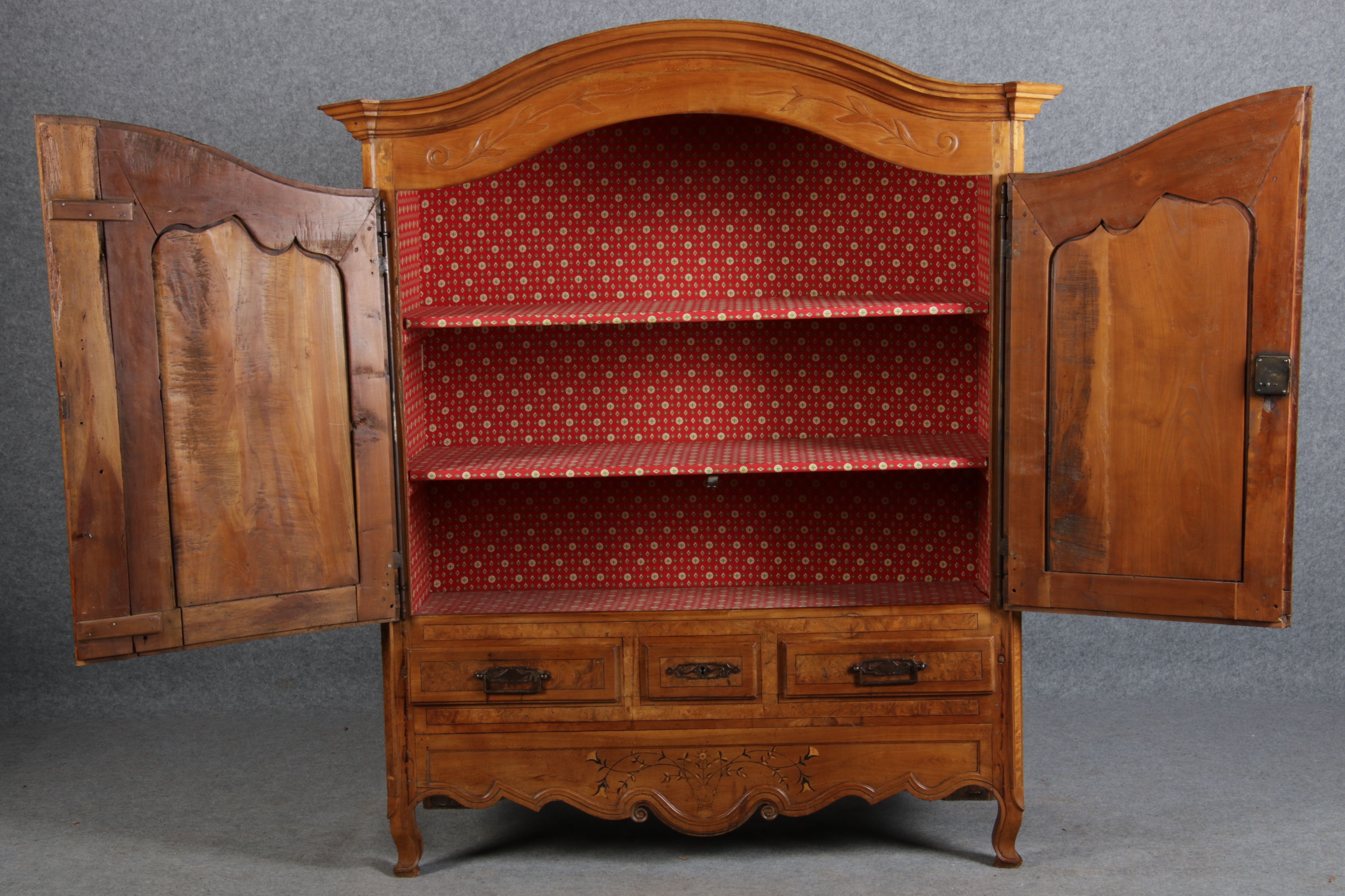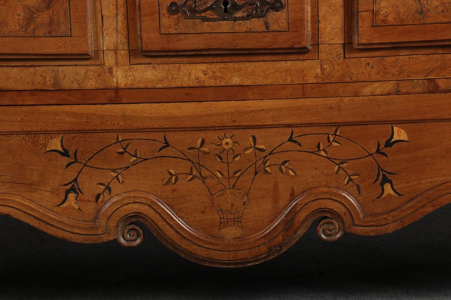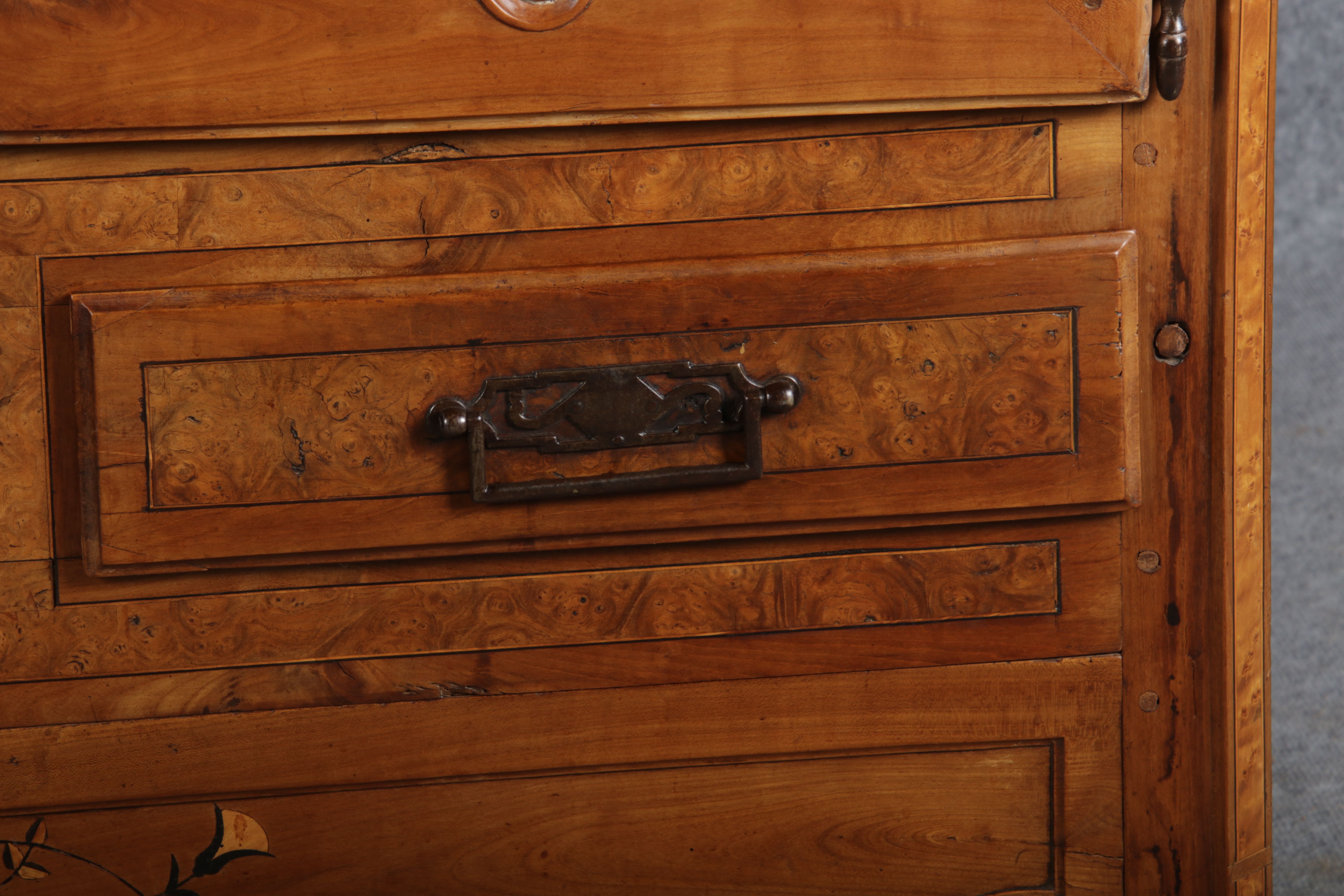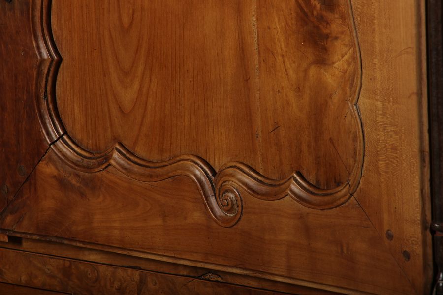 | Antiker Französischer Barockschrank um 1760 Kirschbaum große Eisenbeschläge- Türangeln, Kirchbaum, Schnitzereien, Einlegearbeiten und Bandeinlagen |