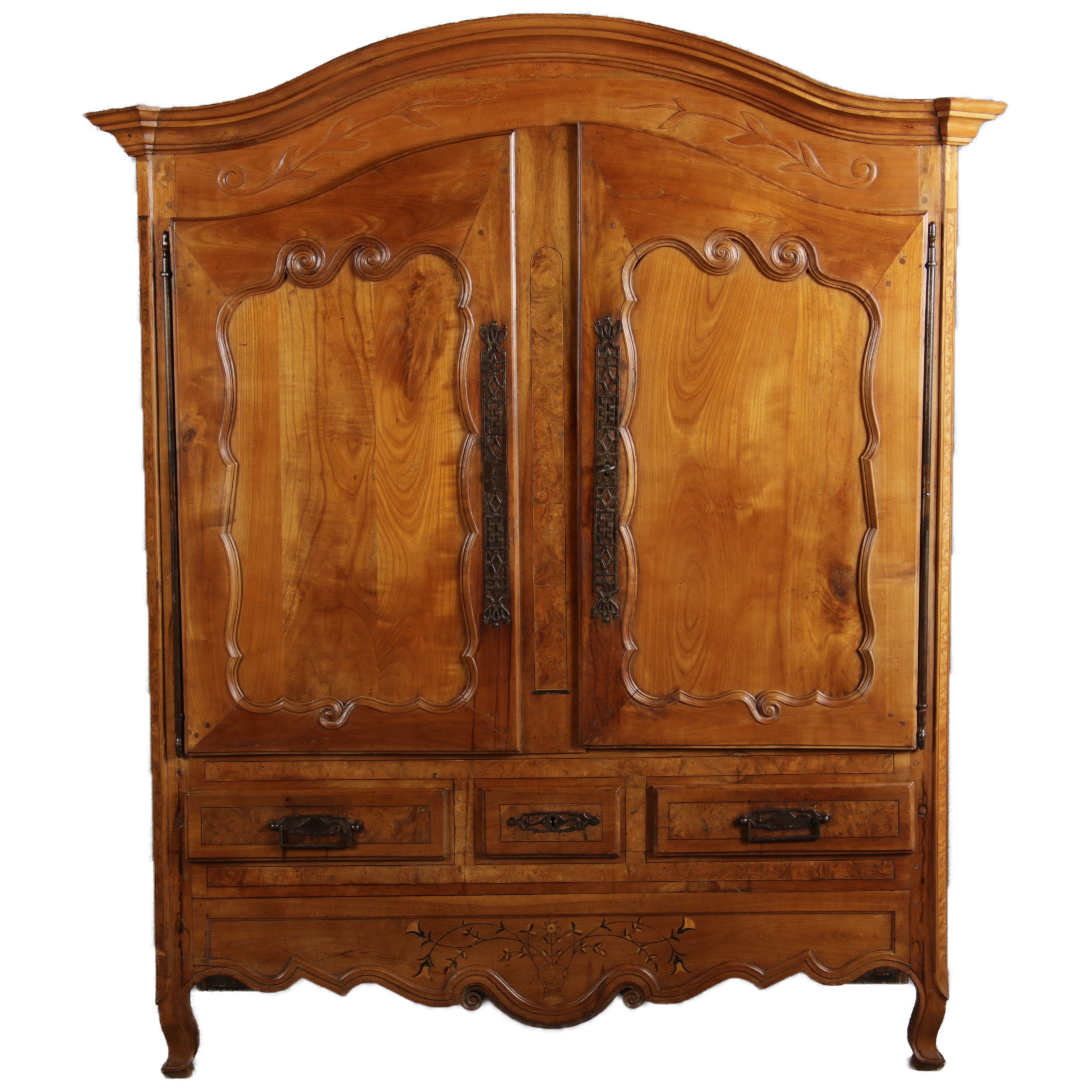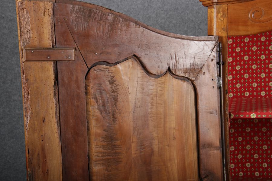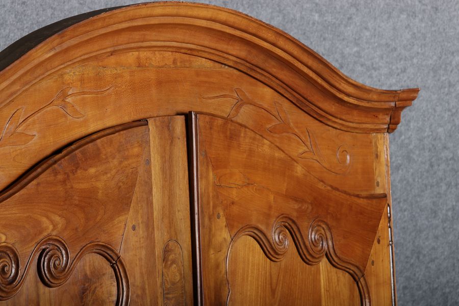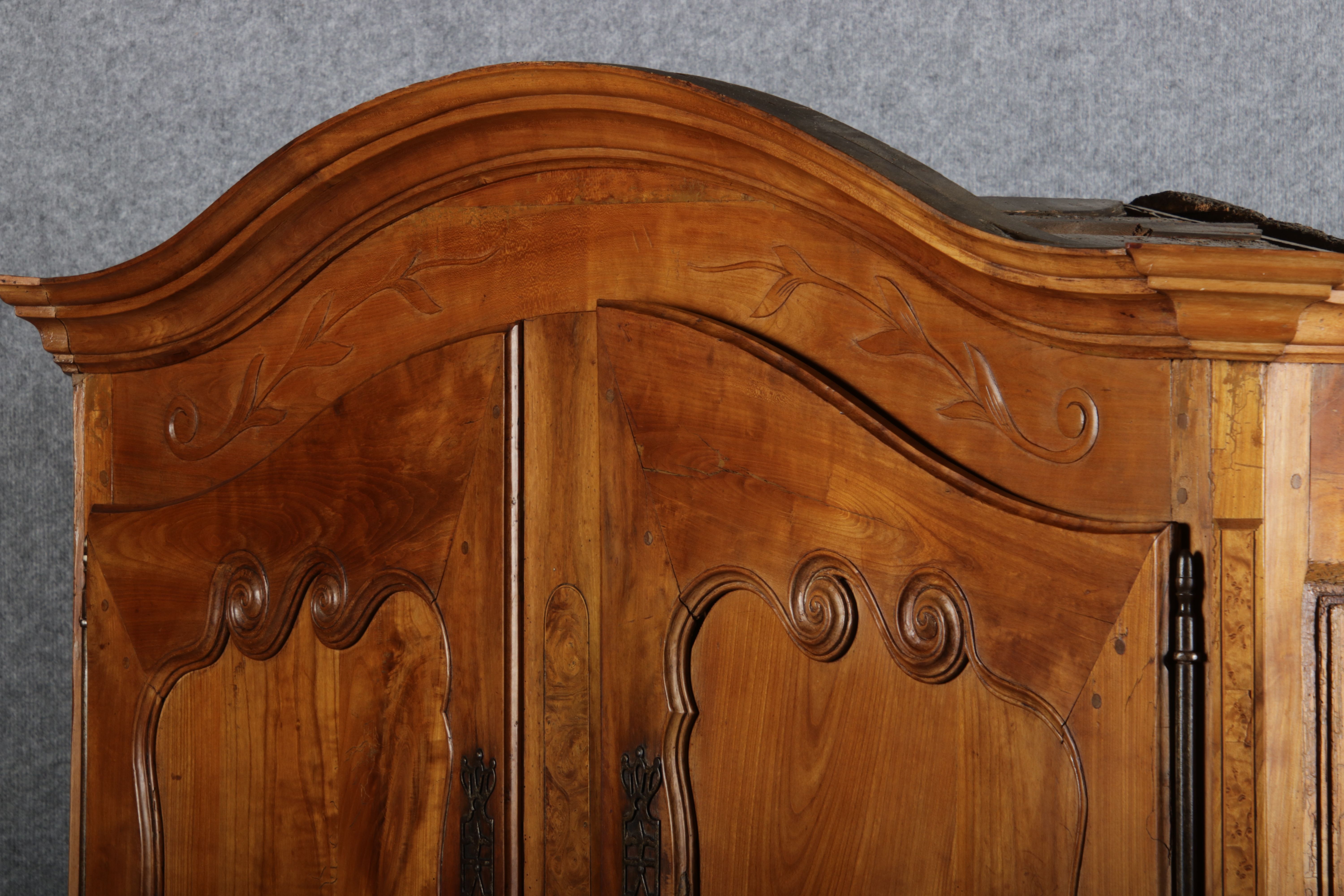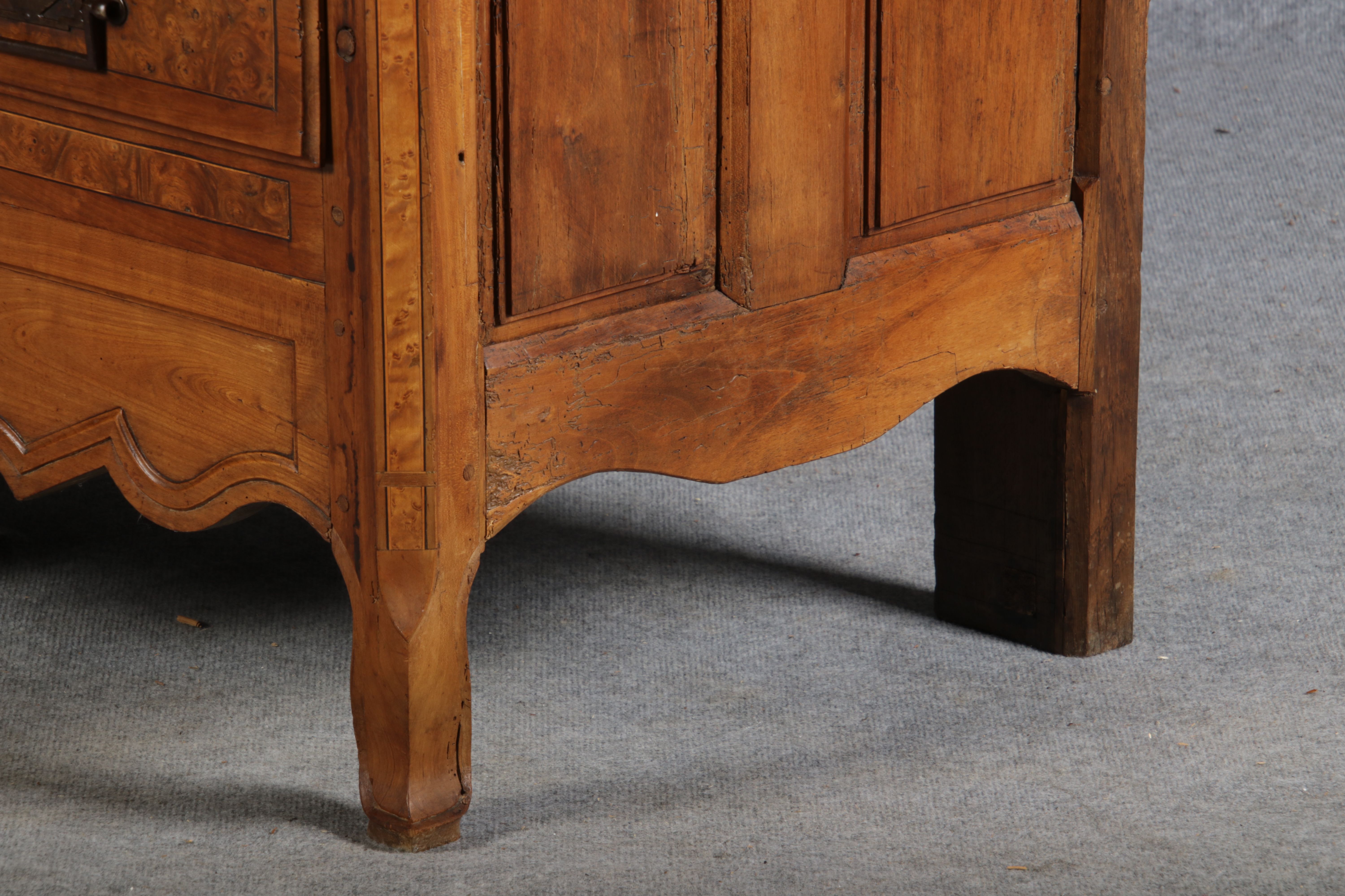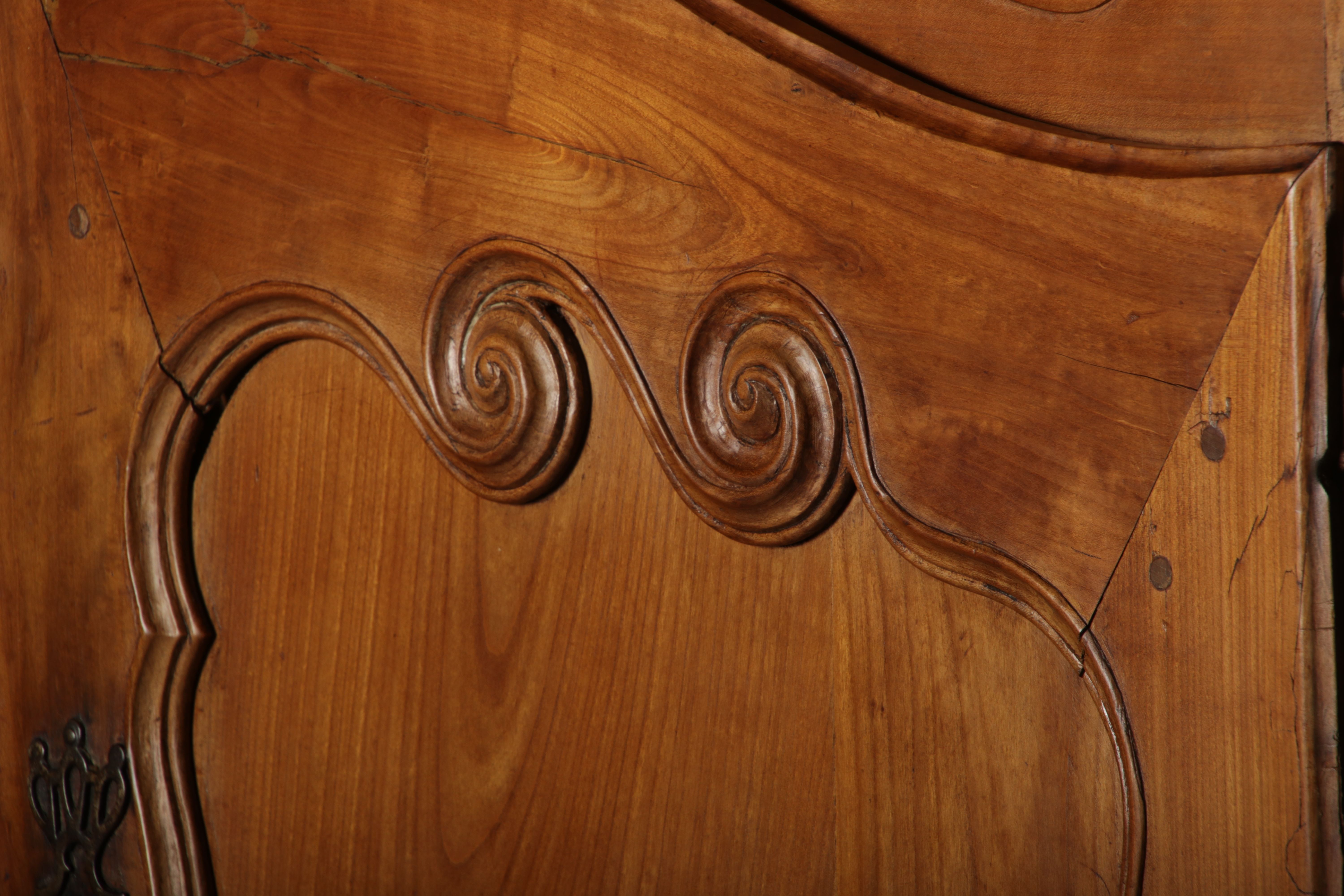 | Antiker Französischer Barockschrank um 1760 Kirschbaum große Eisenbeschläge- Türangeln, Kirchbaum, Schnitzereien, Einlegearbeiten und Bandeinlagen |