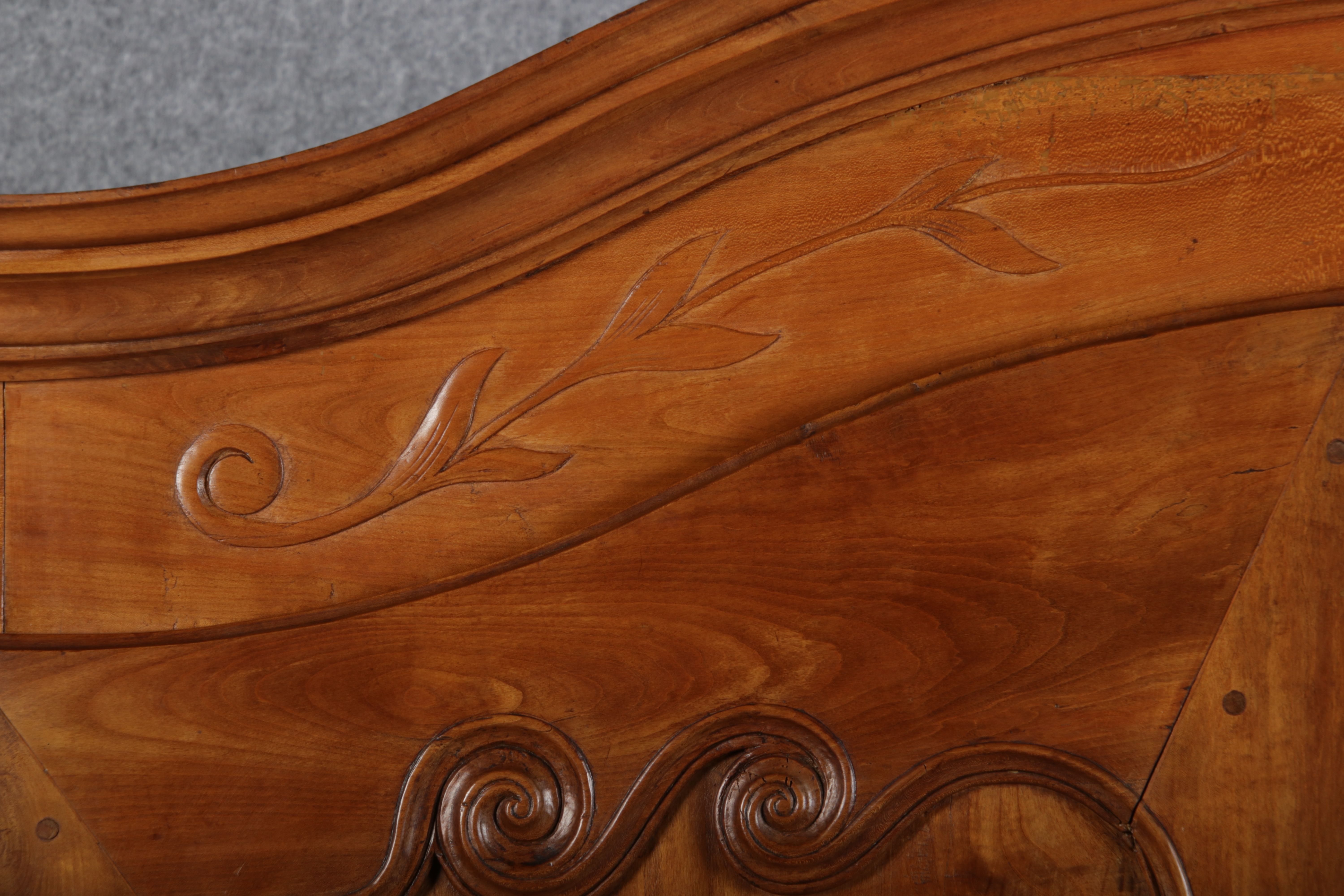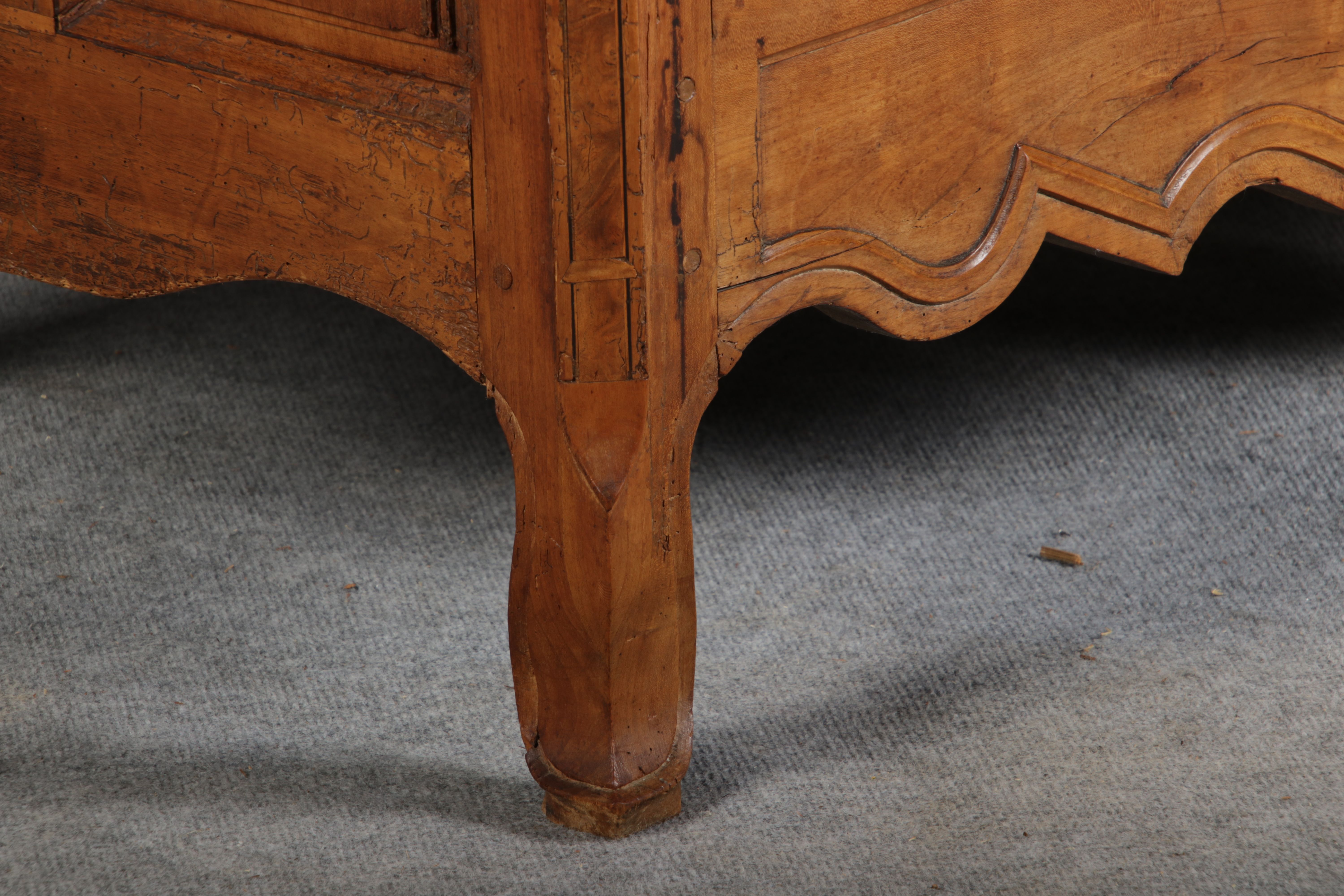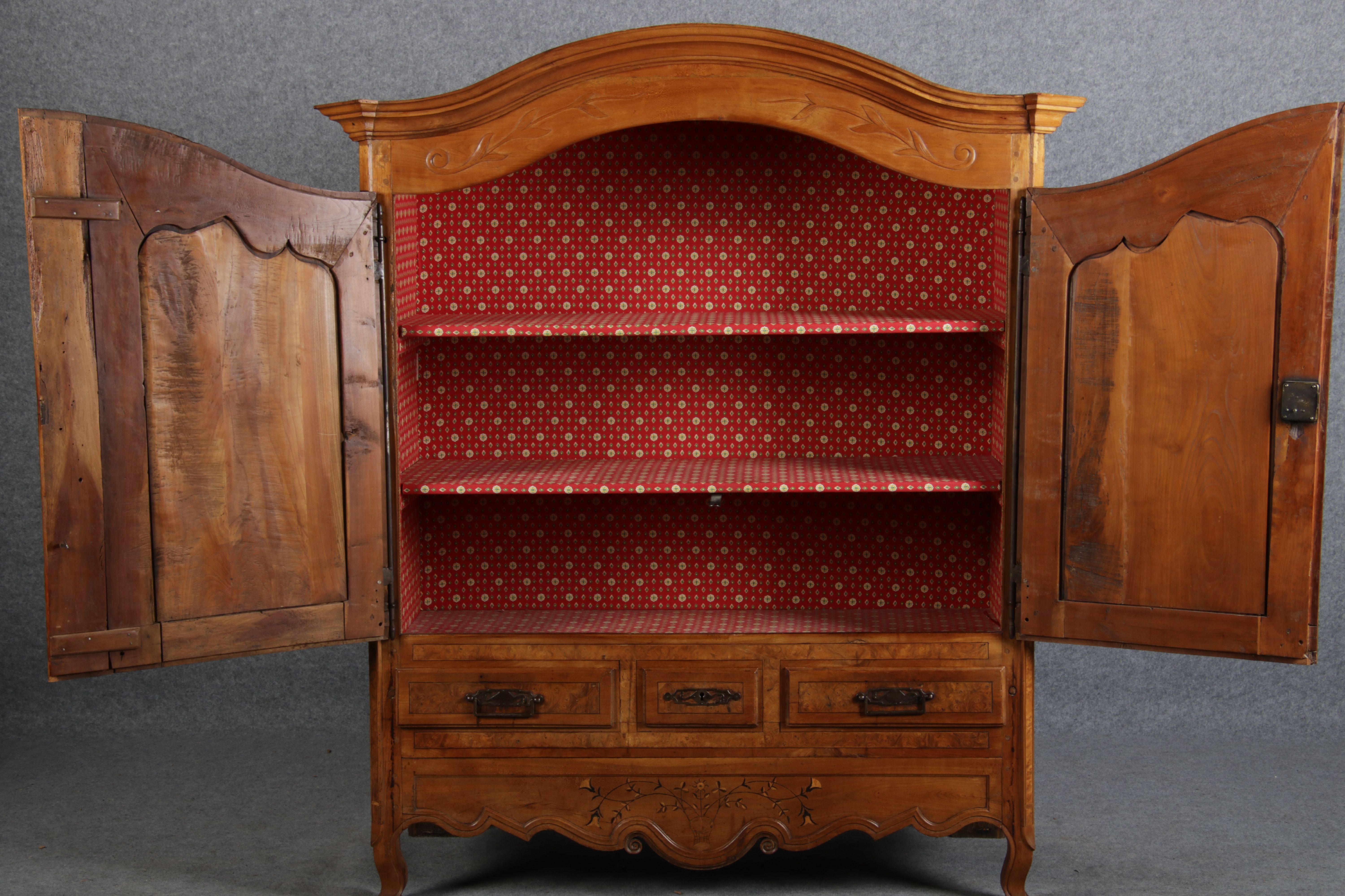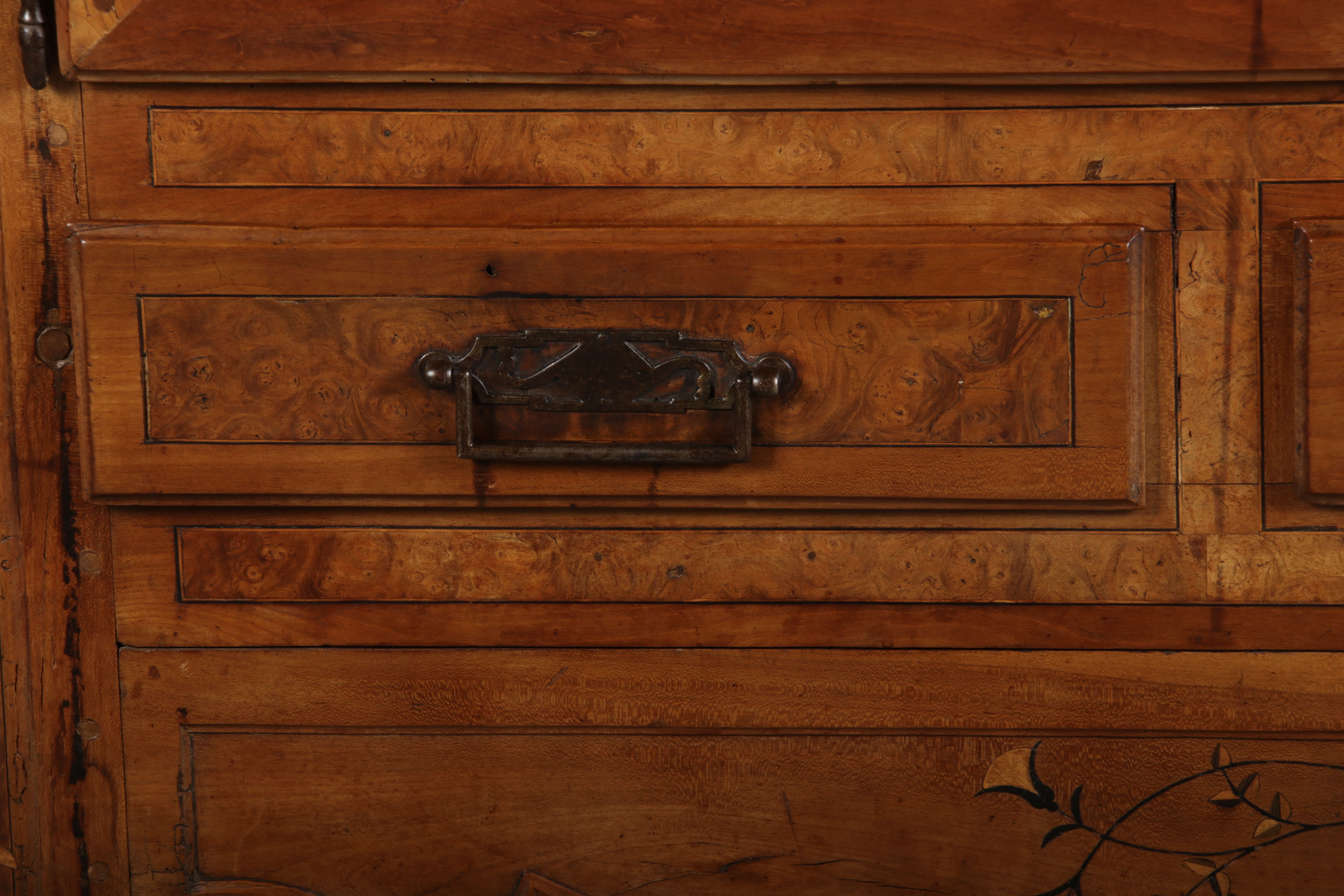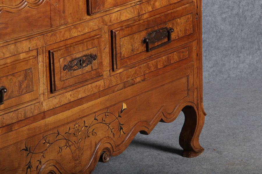 | Antiker Französischer Barockschrank um 1760 Kirschbaum große Eisenbeschläge- Türangeln, Kirchbaum, Schnitzereien, Einlegearbeiten und Bandeinlagen |