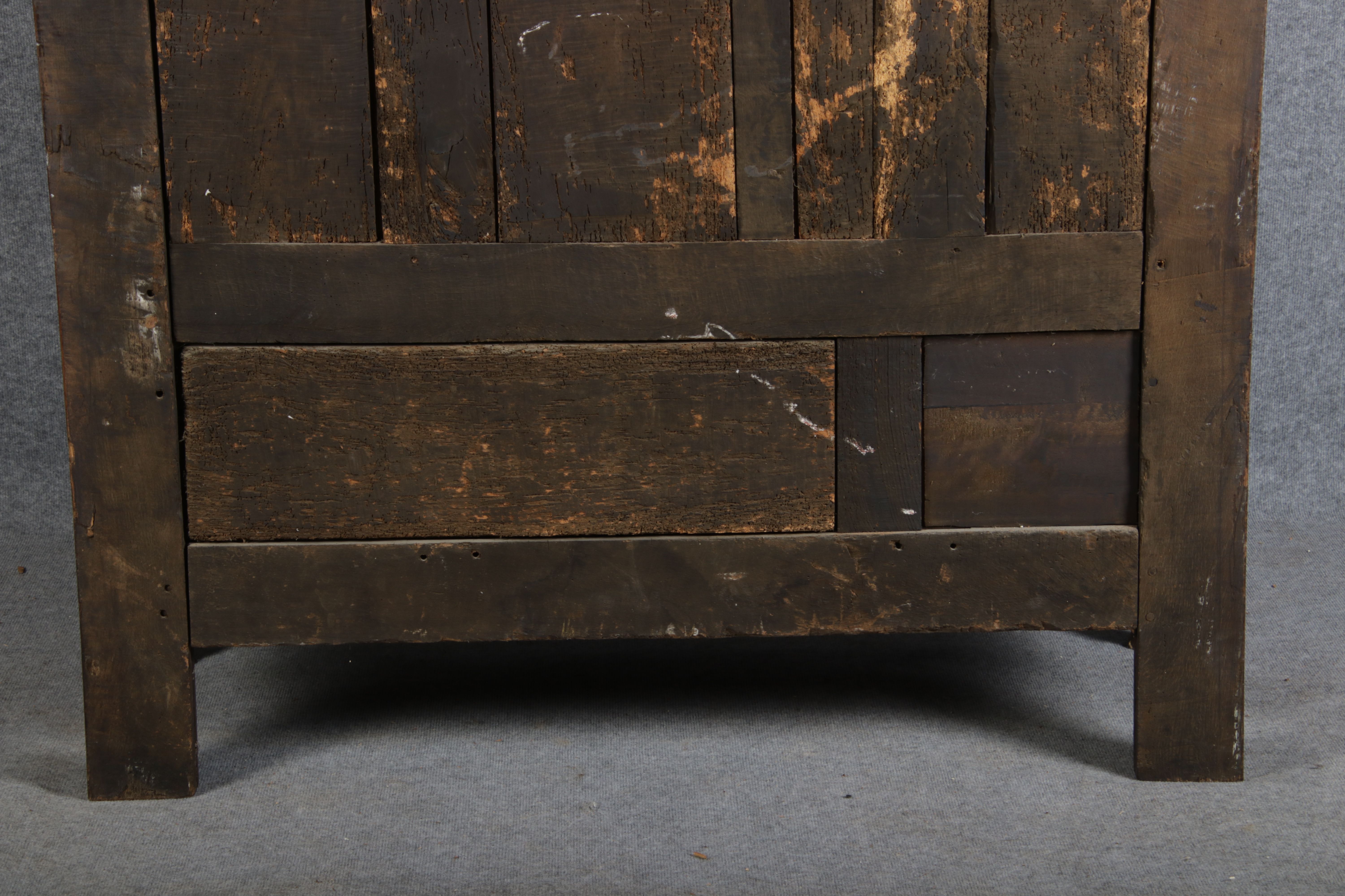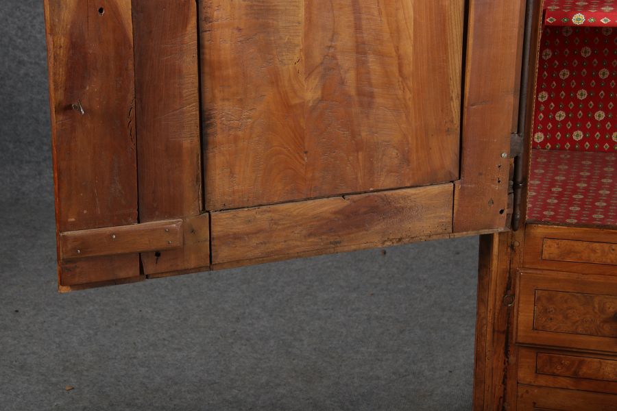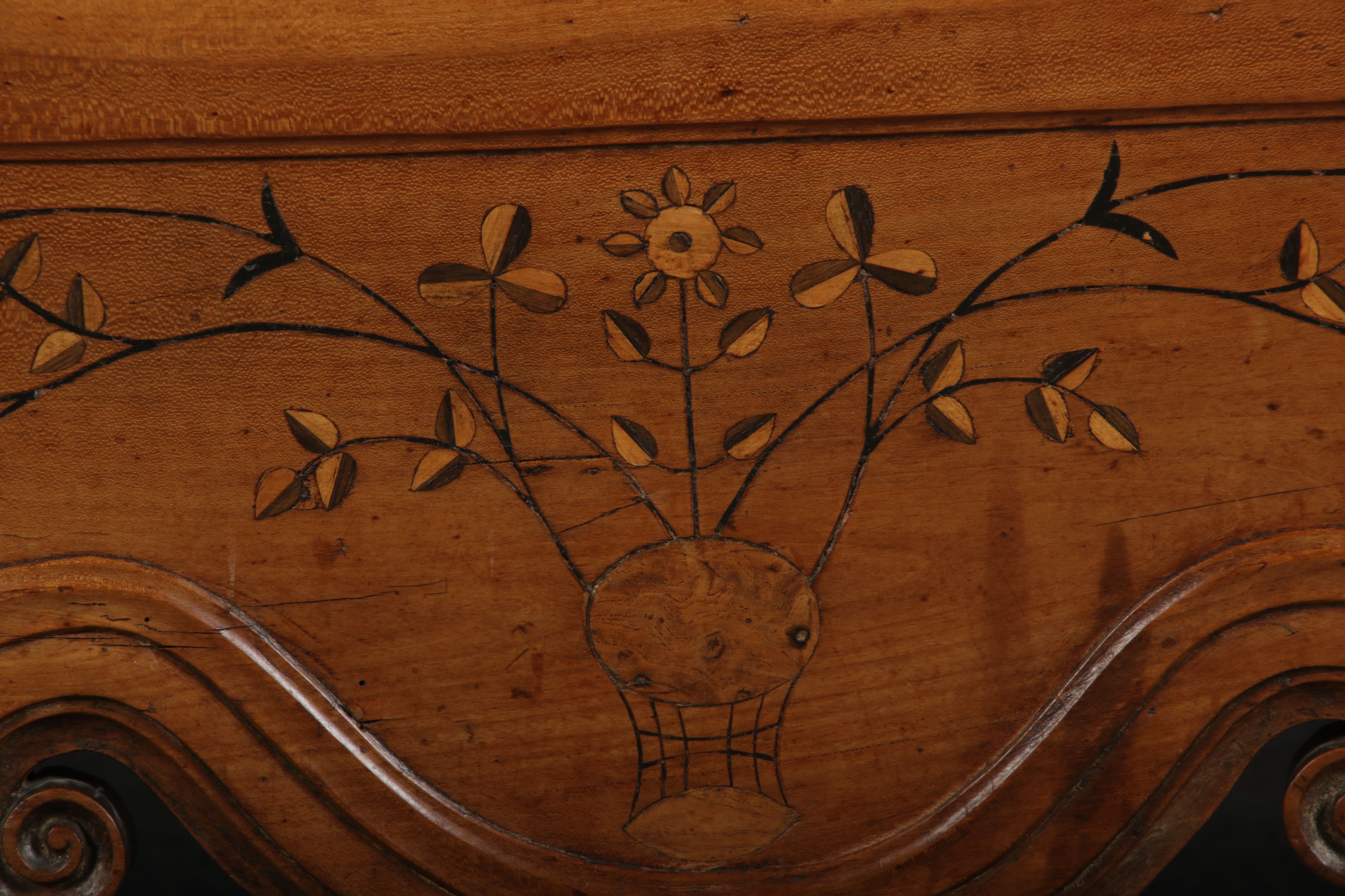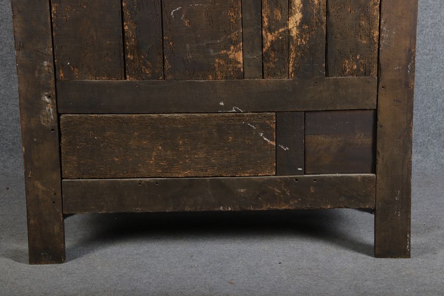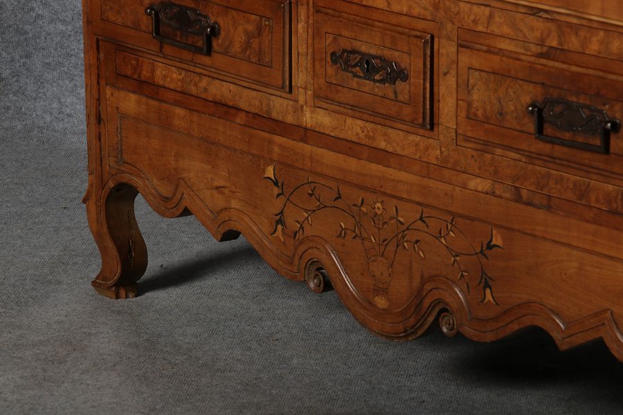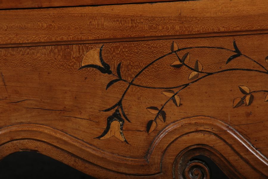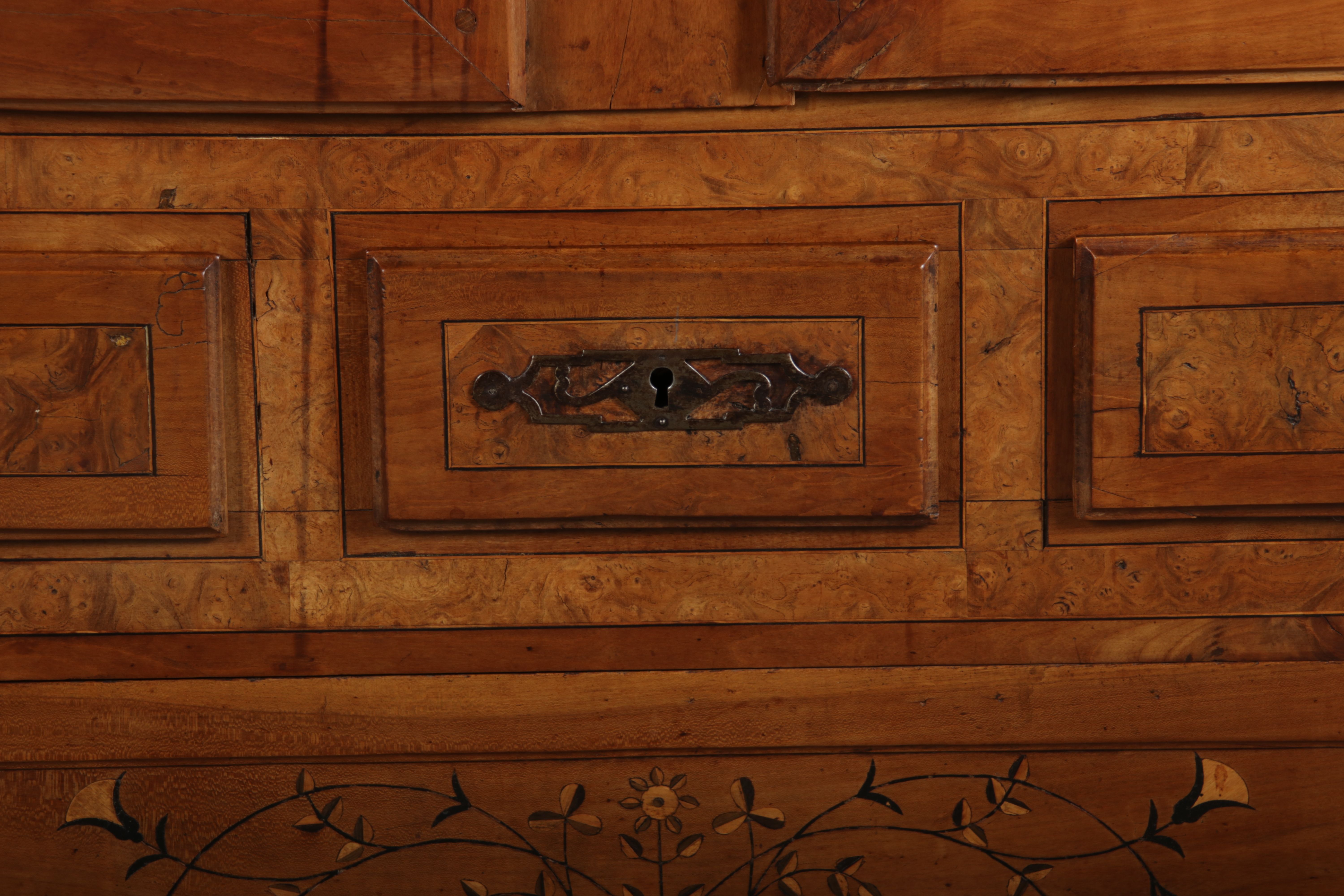 | Antiker Französischer Barockschrank um 1760 Kirschbaum große Eisenbeschläge- Türangeln, Kirchbaum, Schnitzereien, Einlegearbeiten und Bandeinlagen |