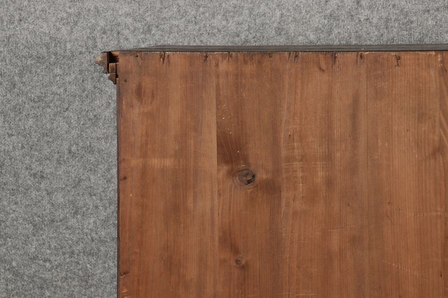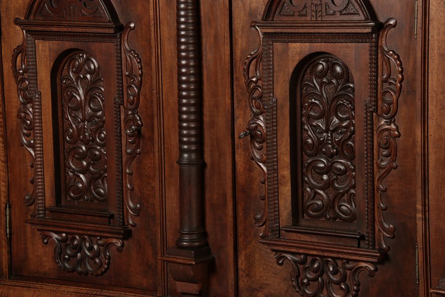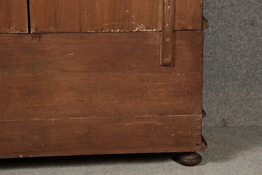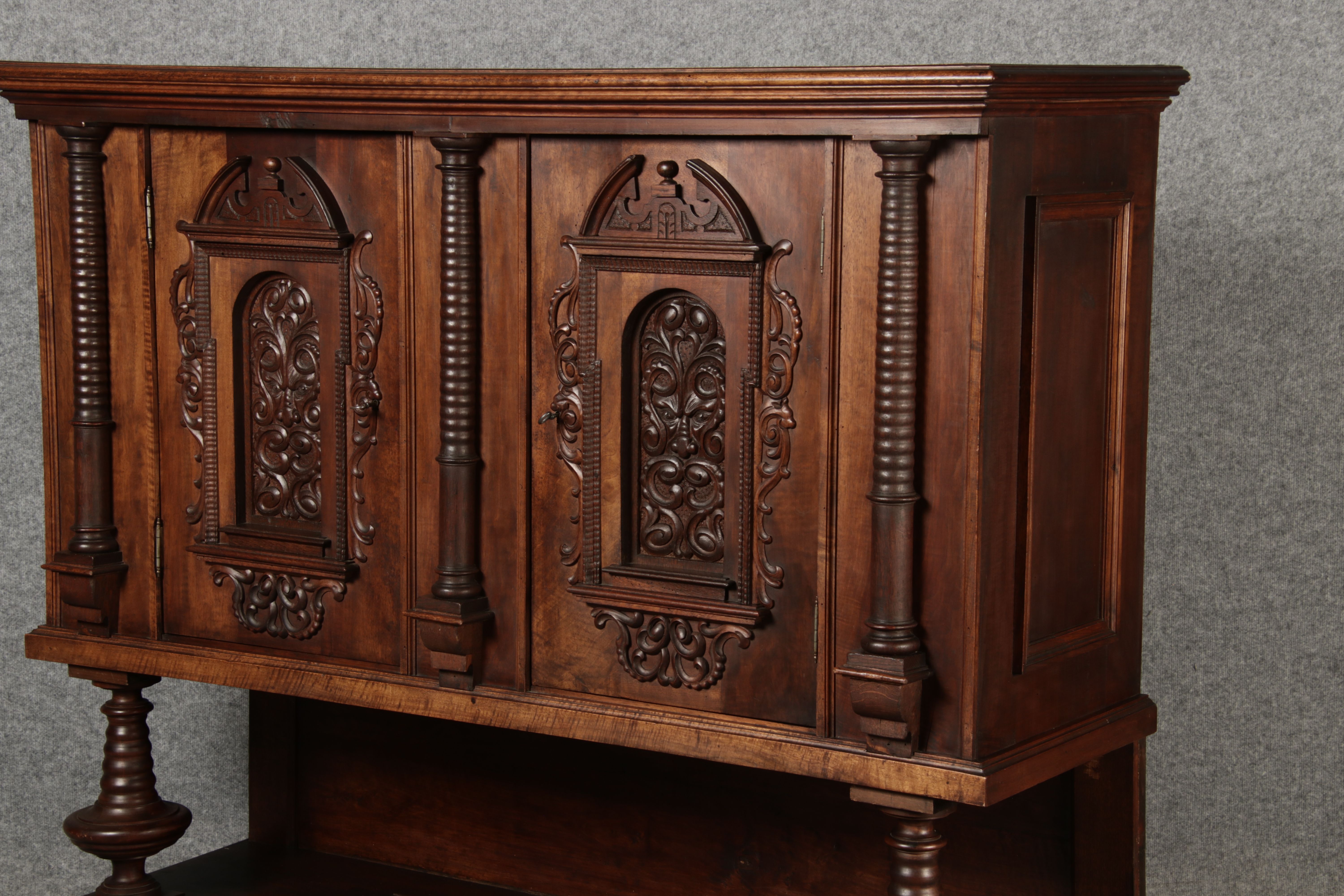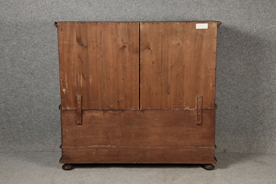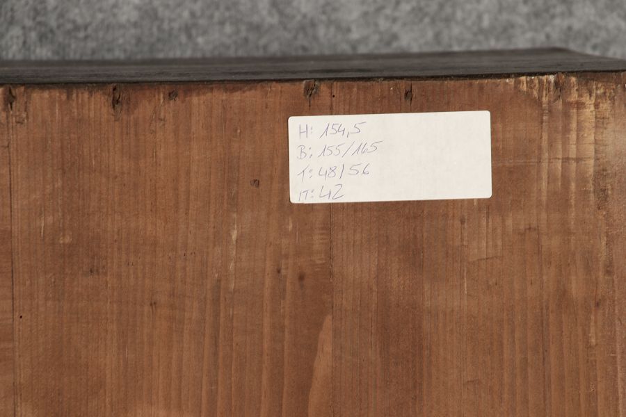 Breite Korpus/Broad Boda ca. 155 cm, Breite Gesims/Broad cornice ca. 165 cm, Tiefe Korpus/Deep body ca. 48 cm, Tiefe Gesims/Deep cornice ca. 56 cm, innen Tiefe/inside depth ca. 42 cm. Holz, Schlüssel/wood,