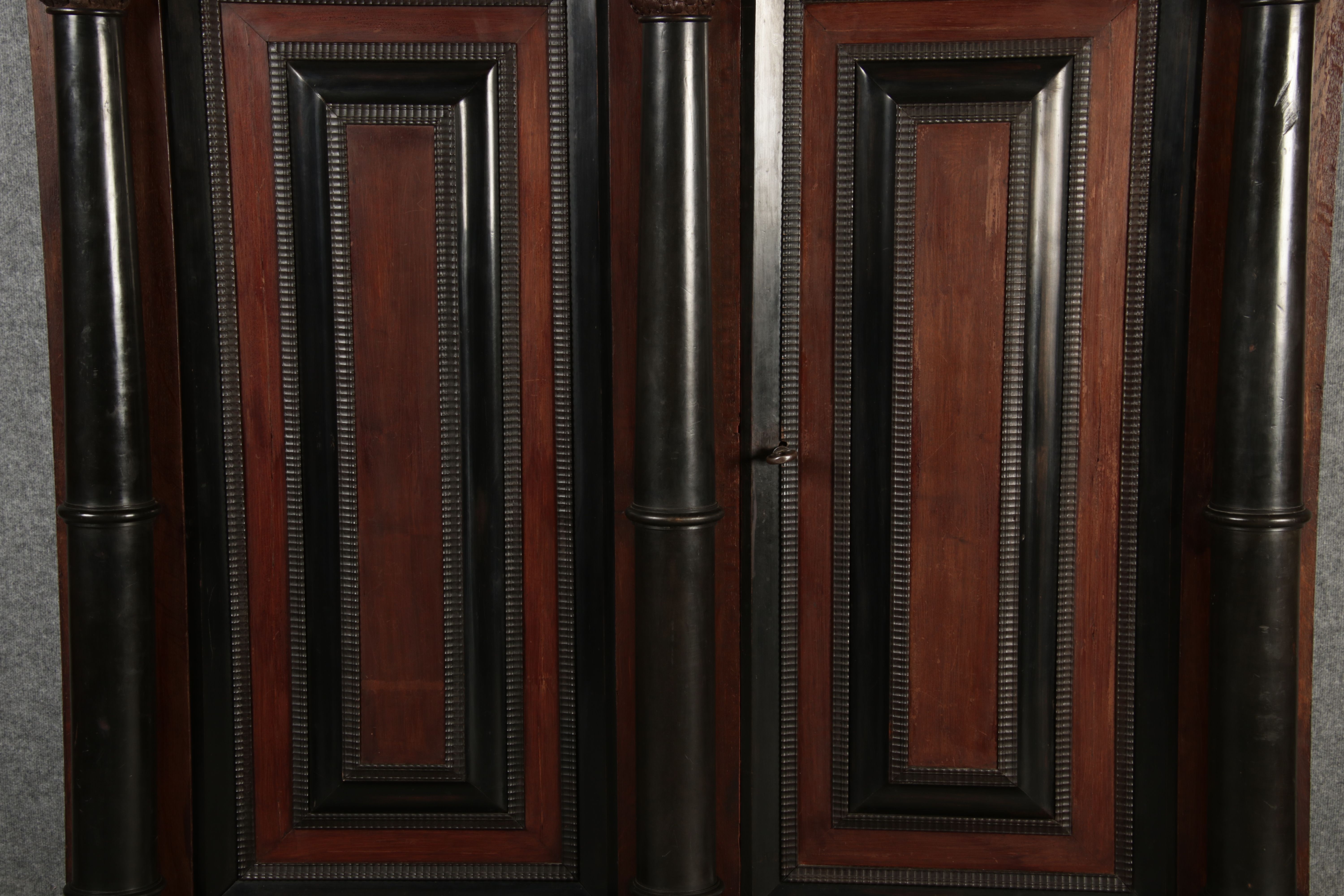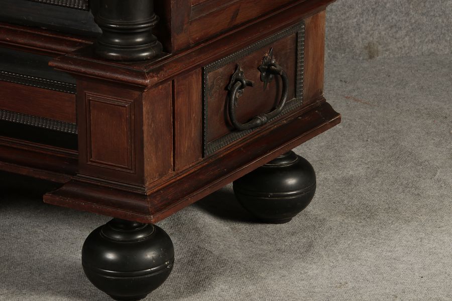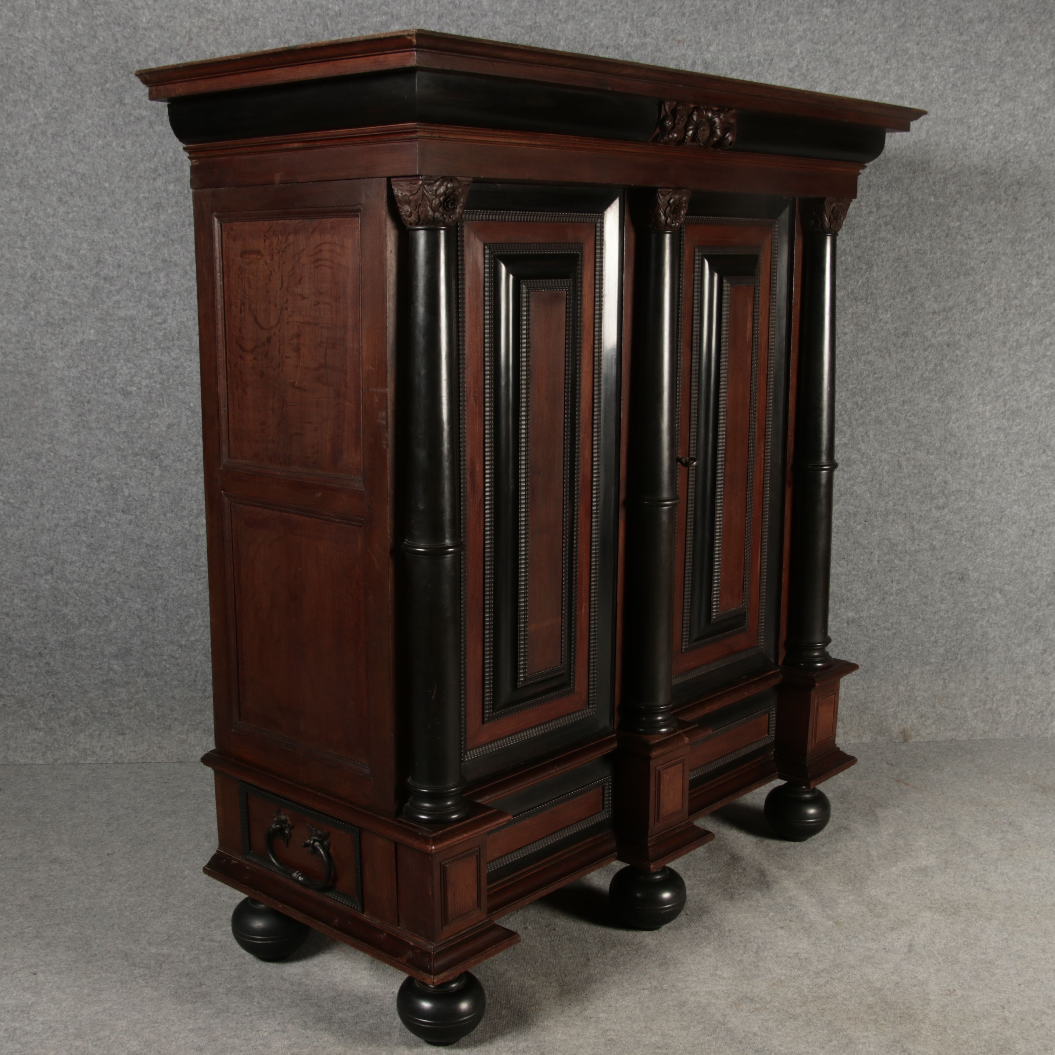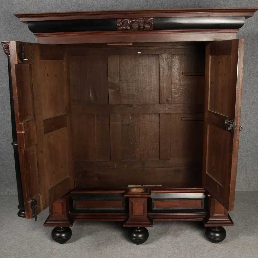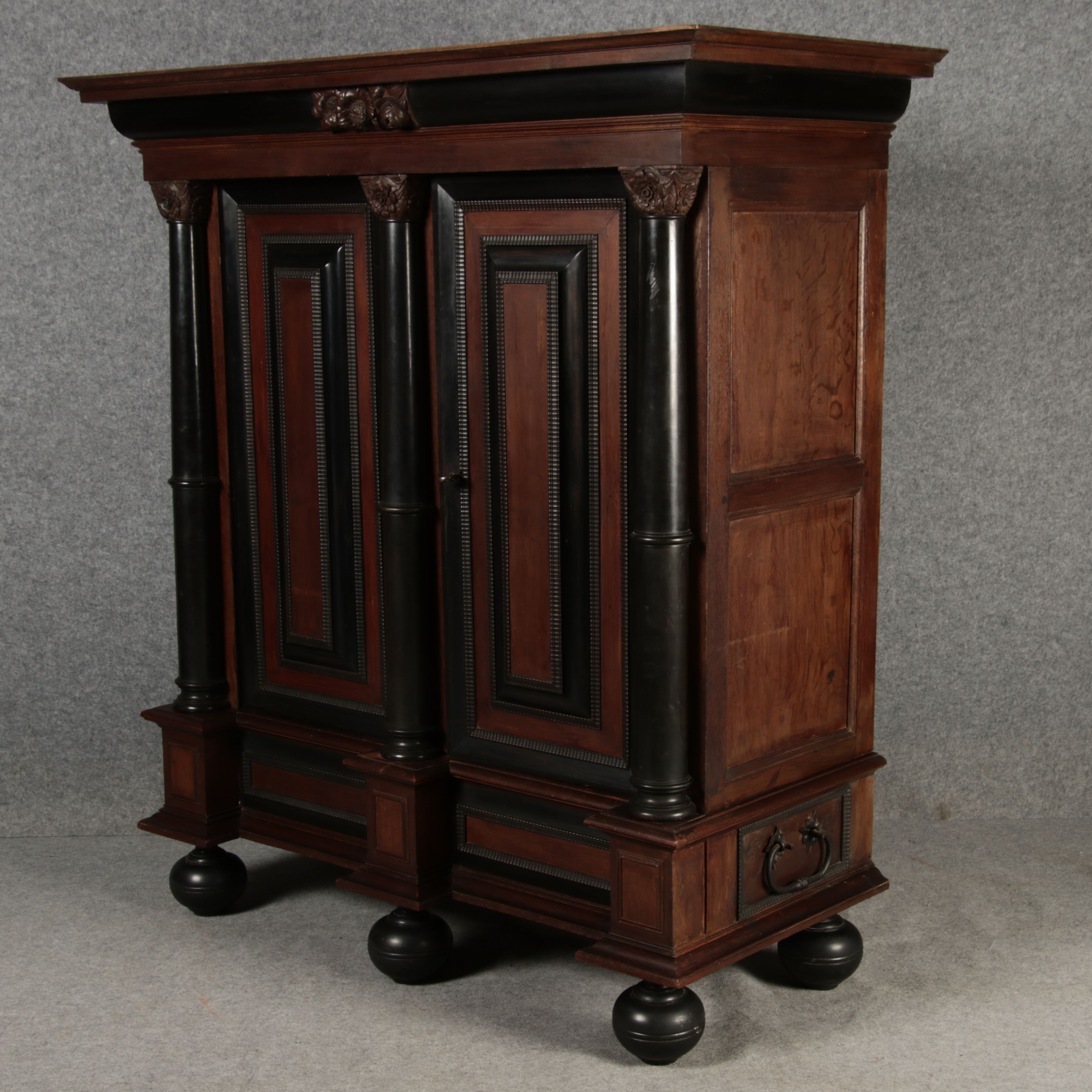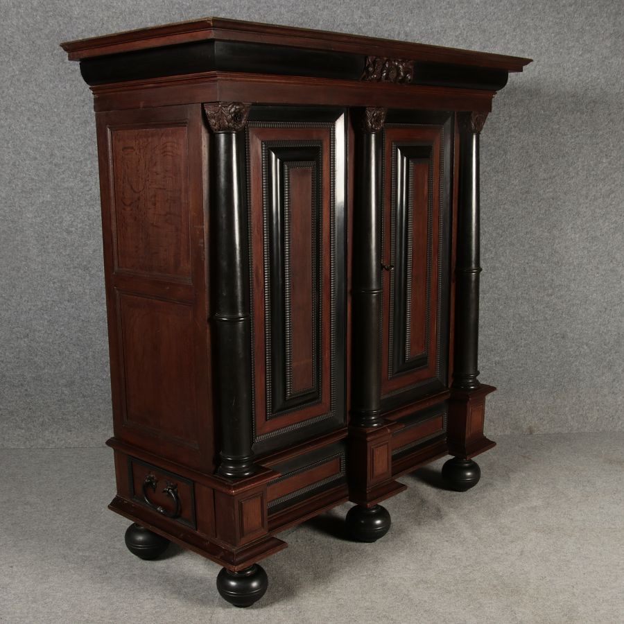 | Antiker Holländischer Renaissance früh Barock Schrank mit 3 Säulen Eisenschloss um 1700 |