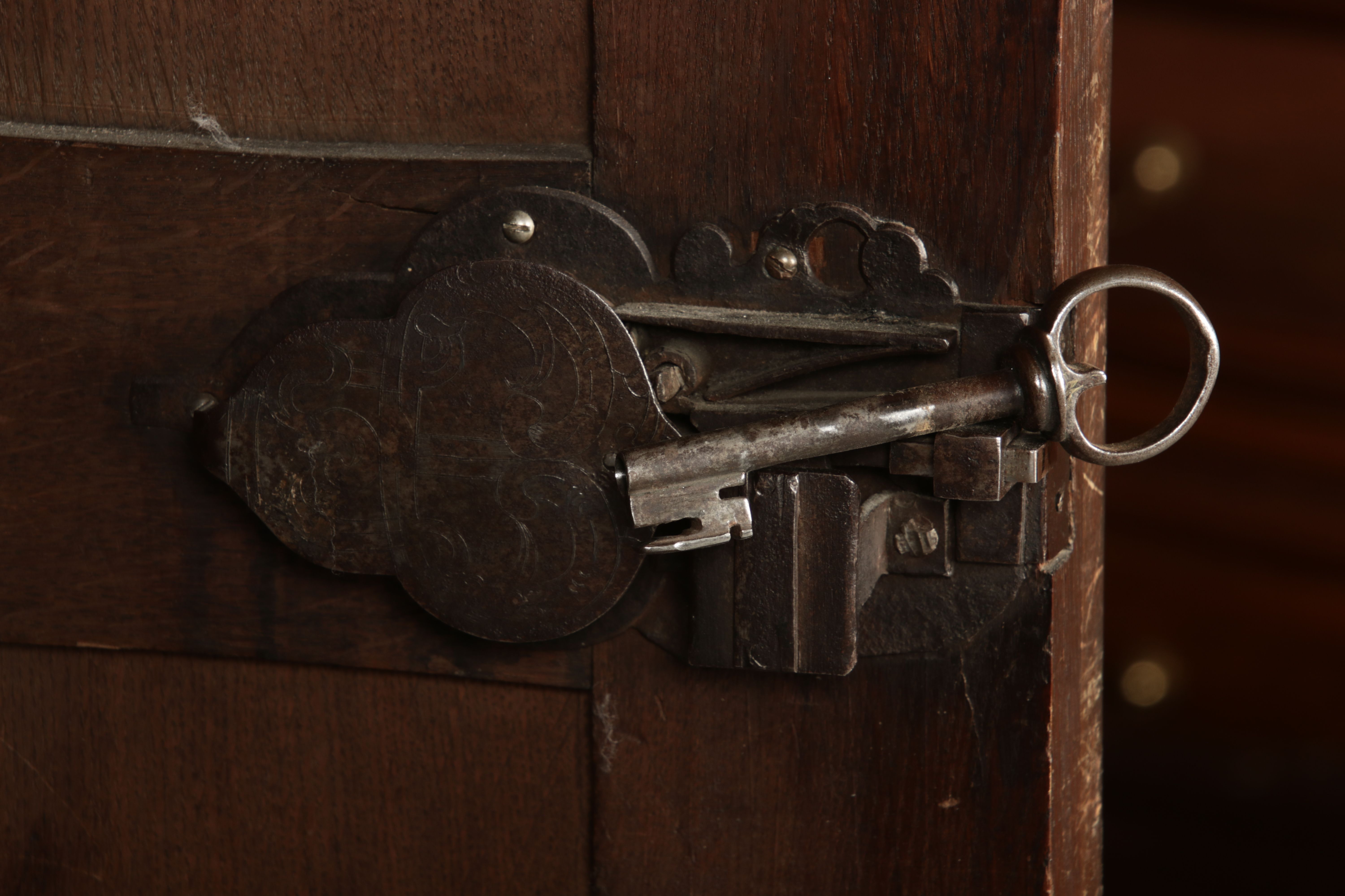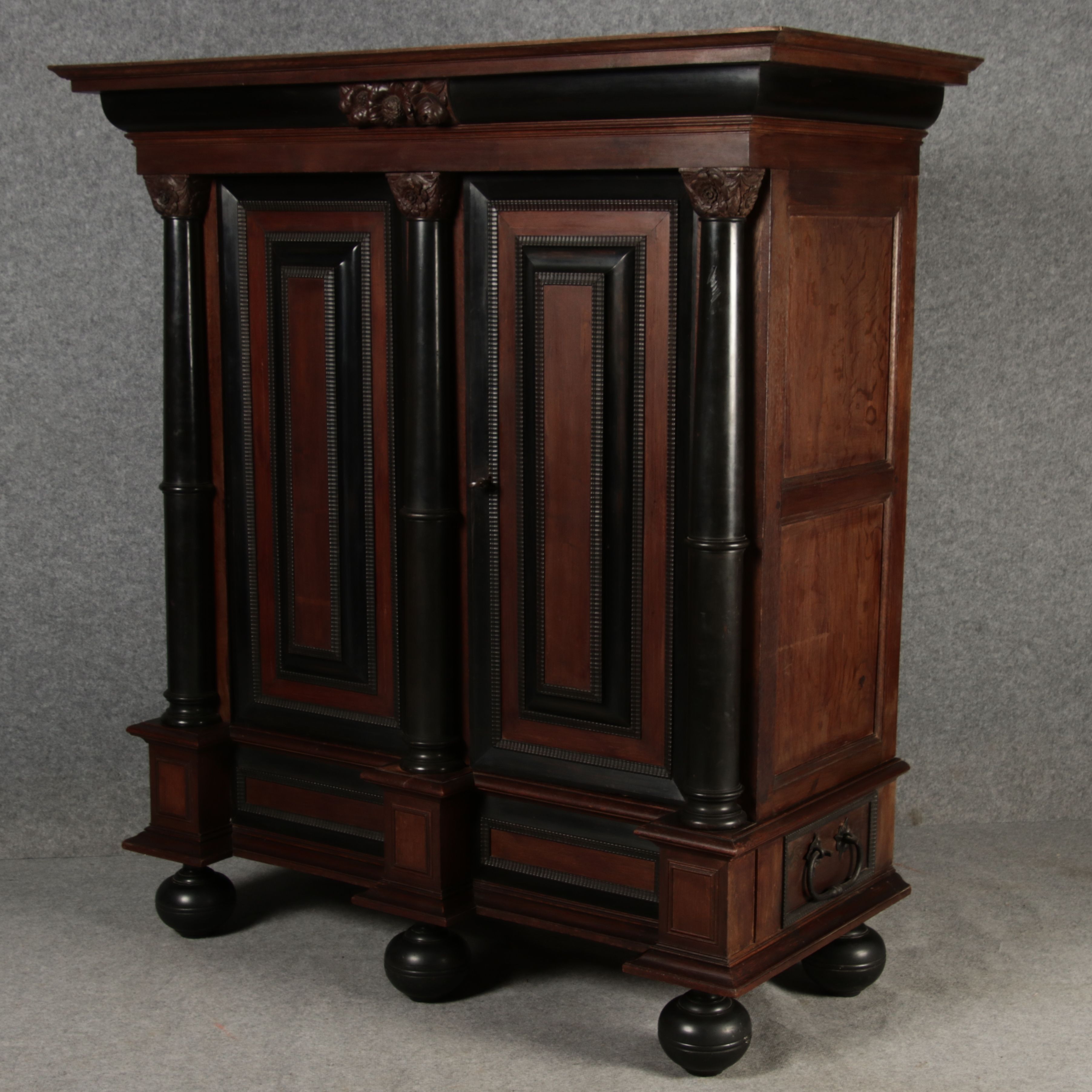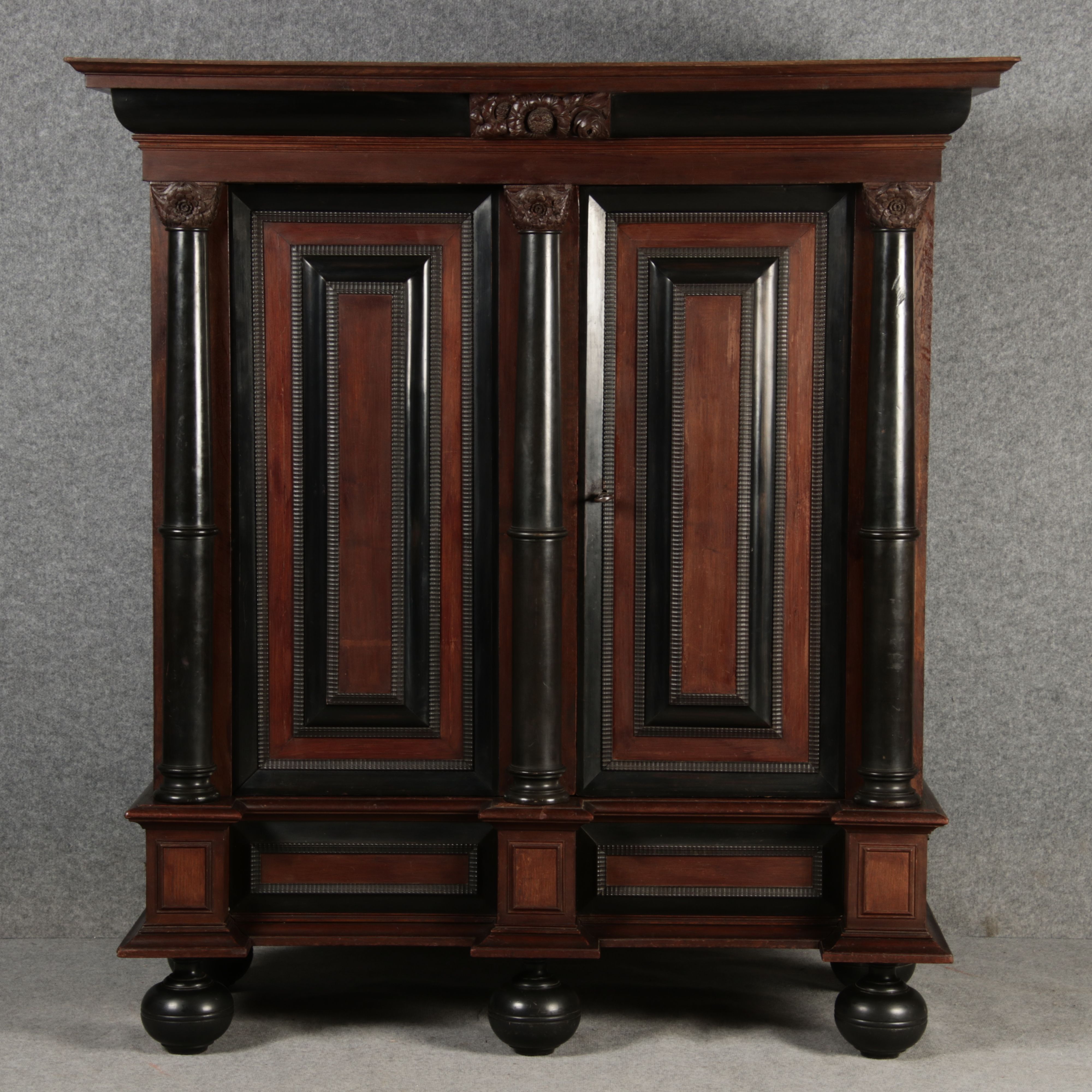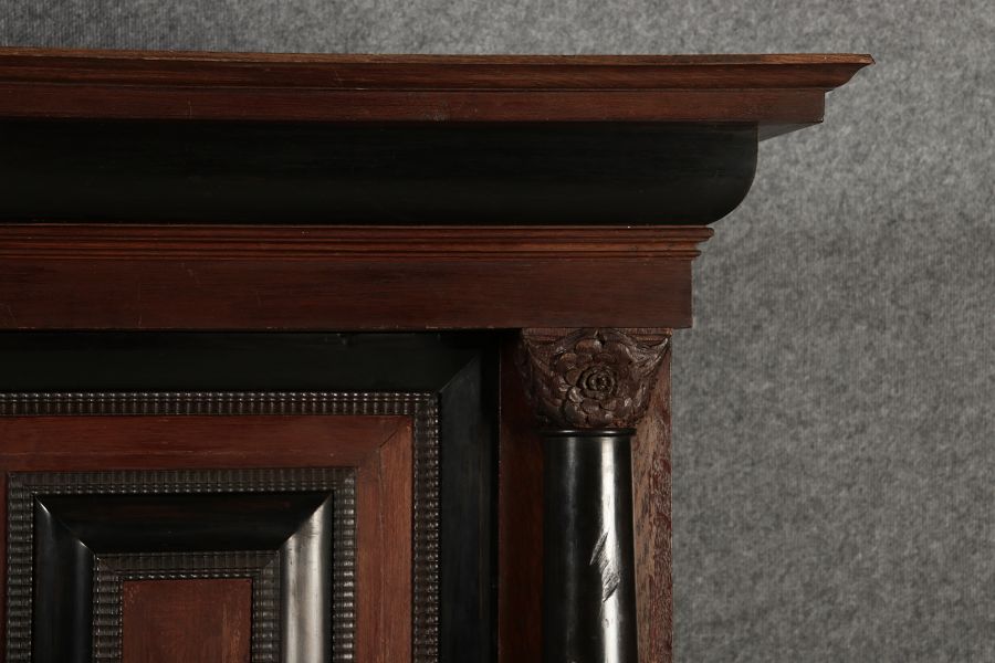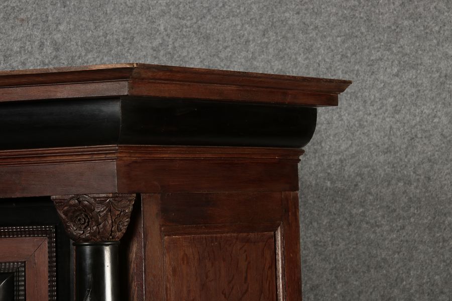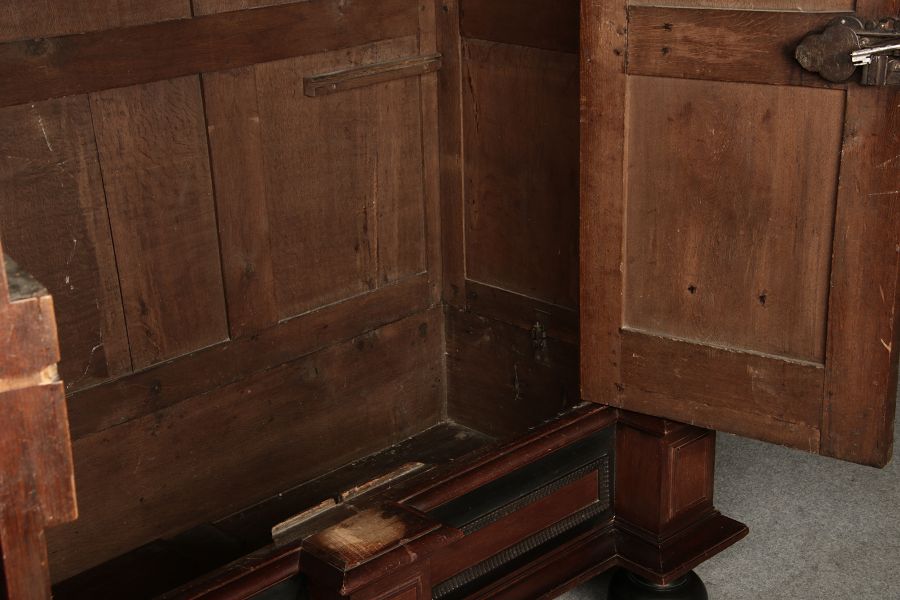 | Antiker Holländischer Renaissance früh Barock Schrank mit 3 Säulen Eisenschloss um 1700 |