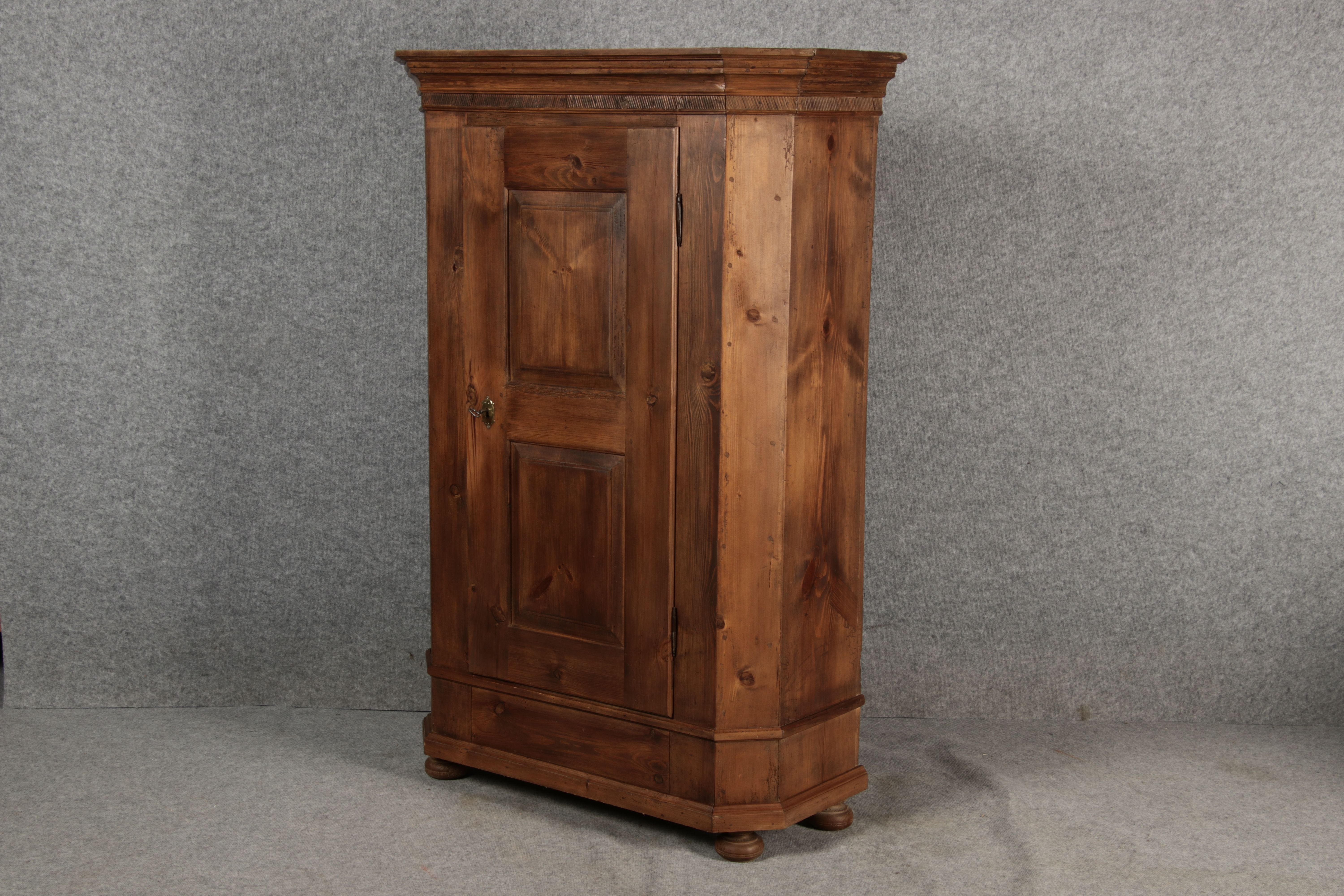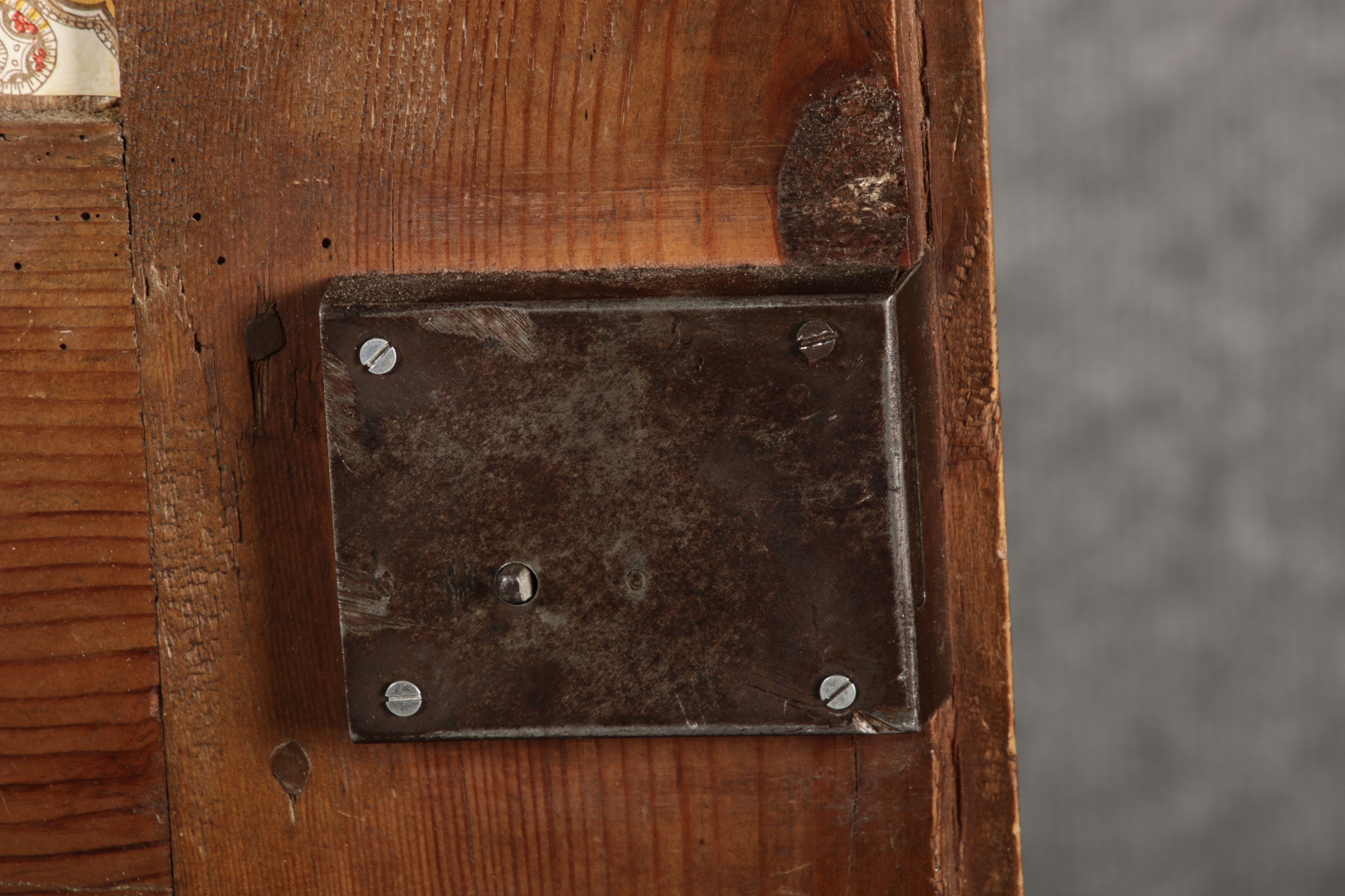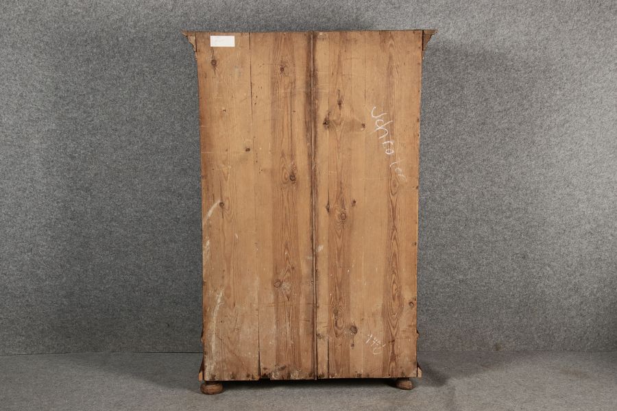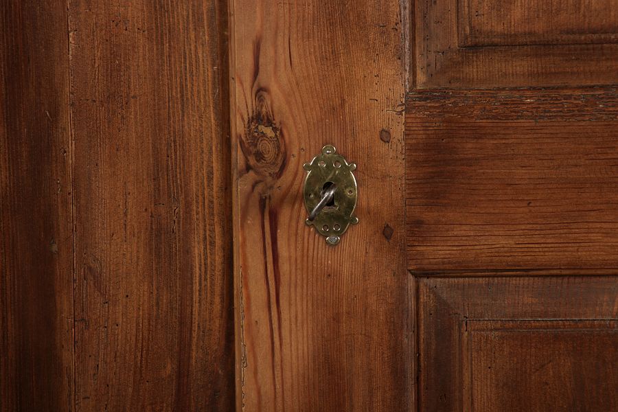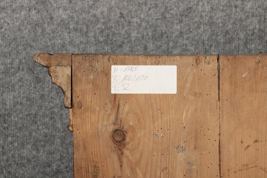 Masse/dimensions: Höhe/Height ca. 178,5 cm, Breite Korpus/Broad Boda ca. 106 cm, Breite Gesims/Broad cornice ca. 120 cm, Tiefe /Deep ca. 52 cm Holz, Schlüssel/wood,