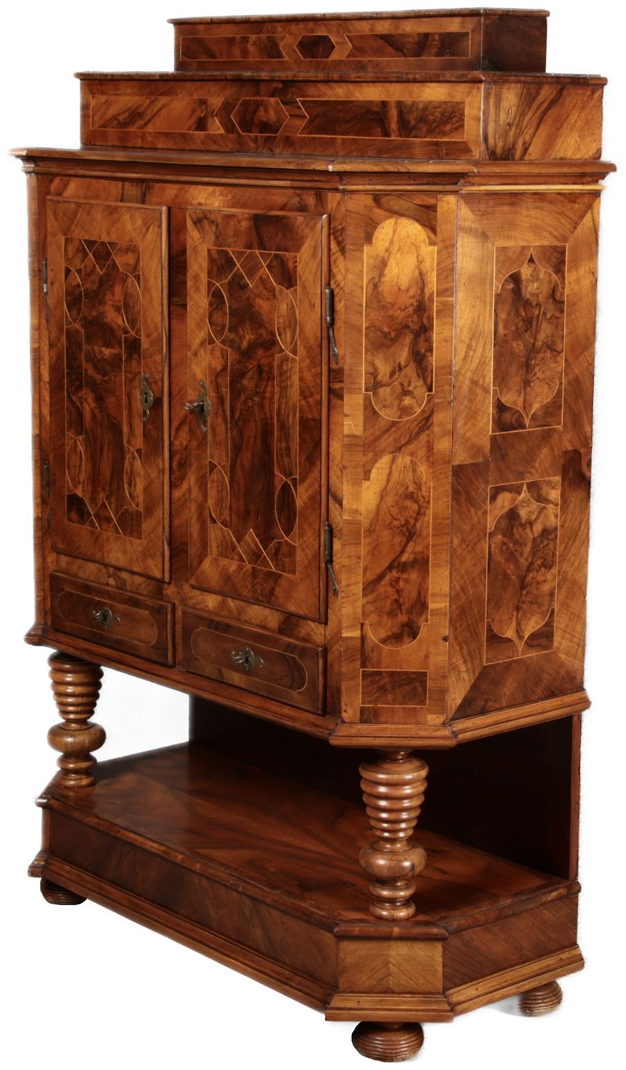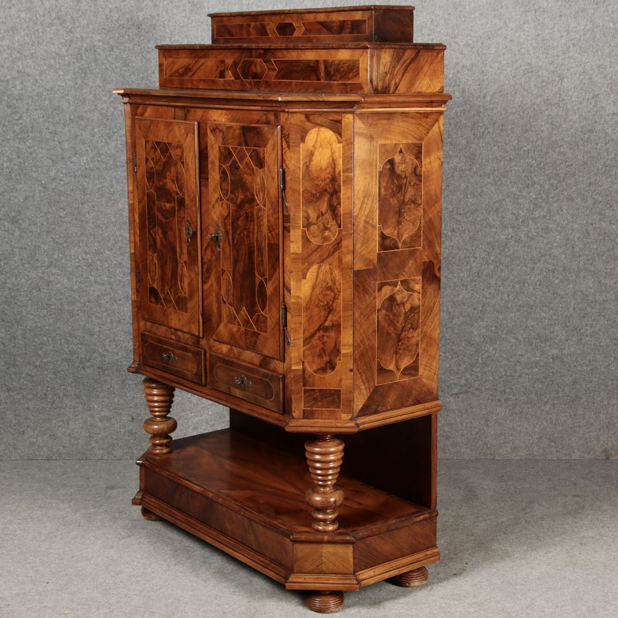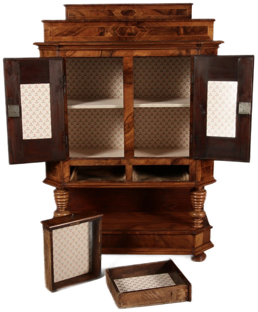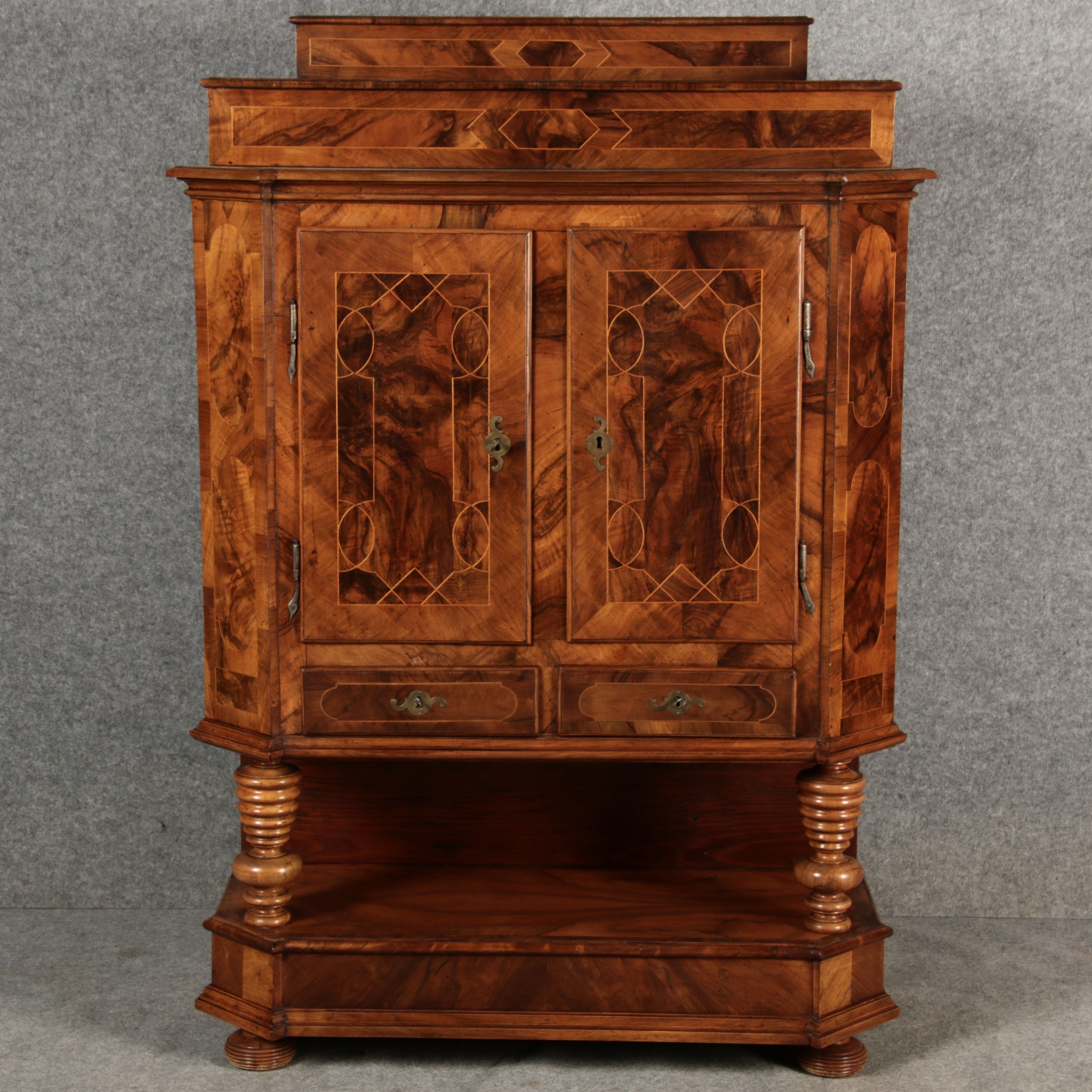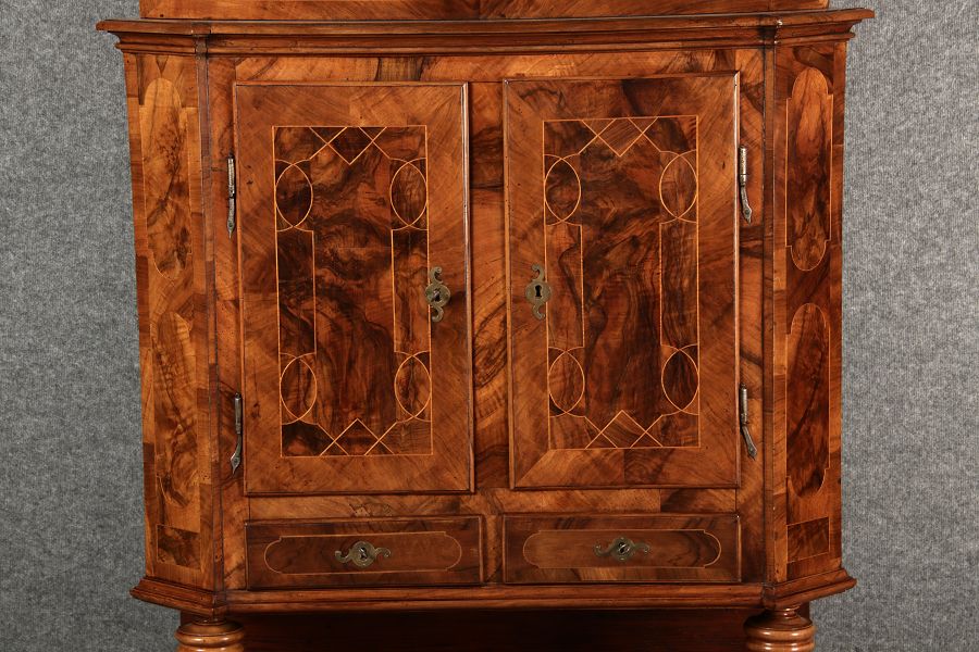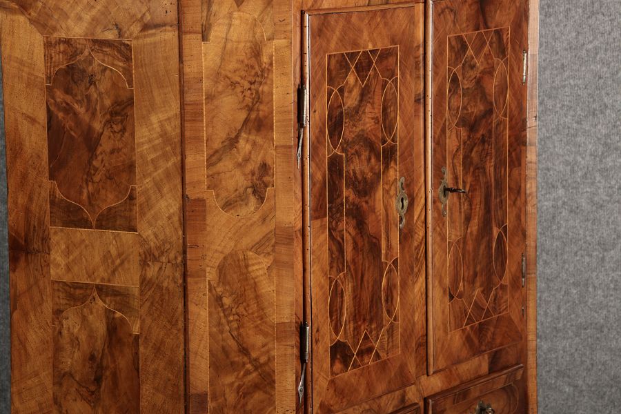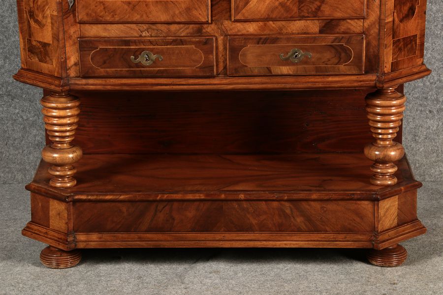| Antiker Barock Stollenschrank Schrank Nussbaum mit Einlegearbeiten um 1720-50 |