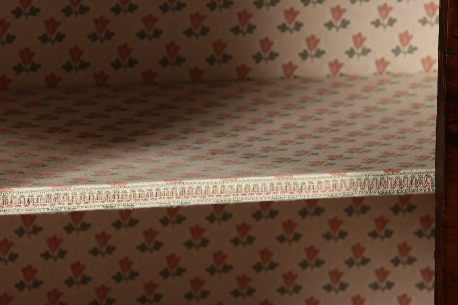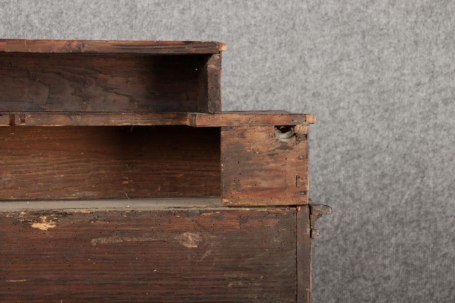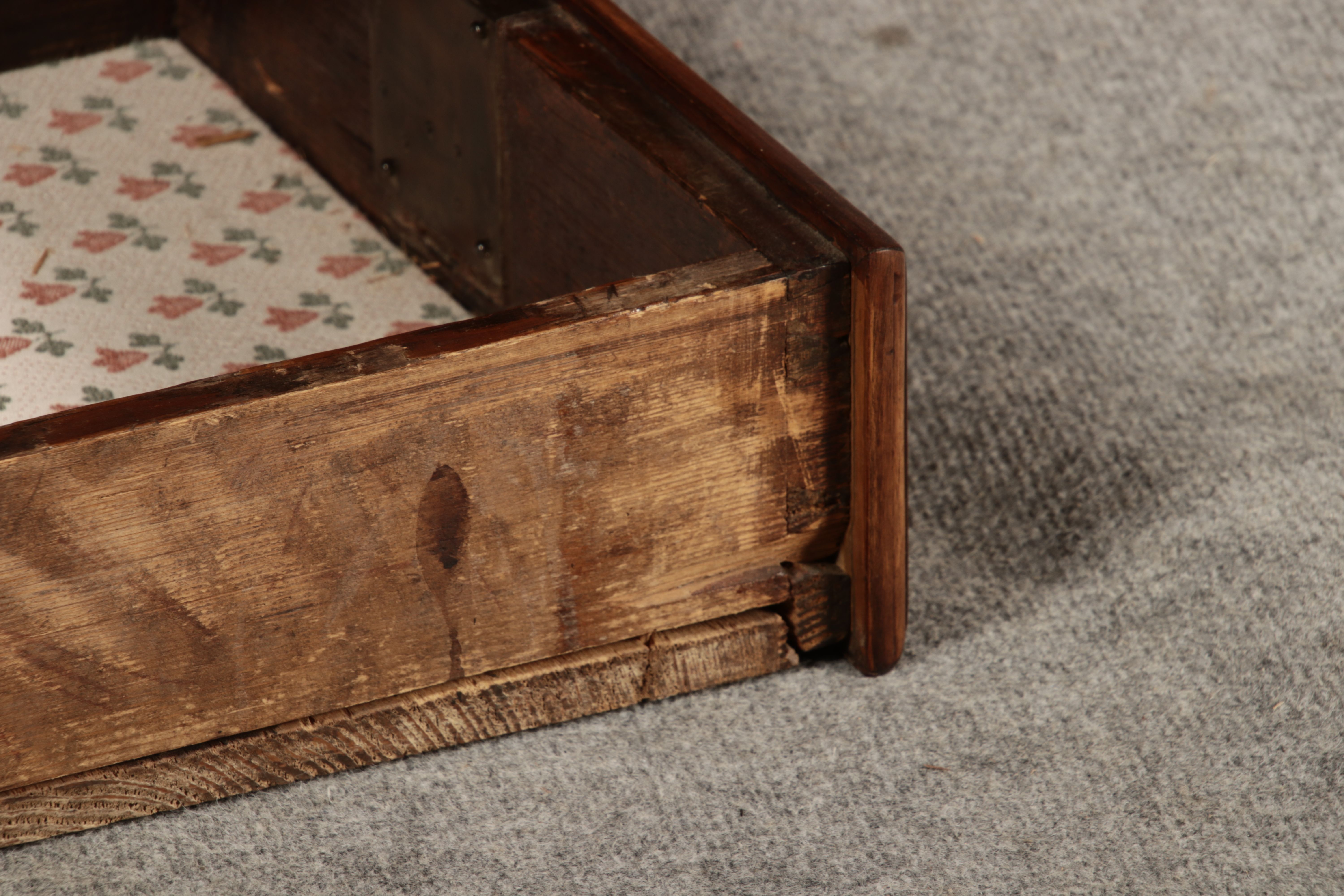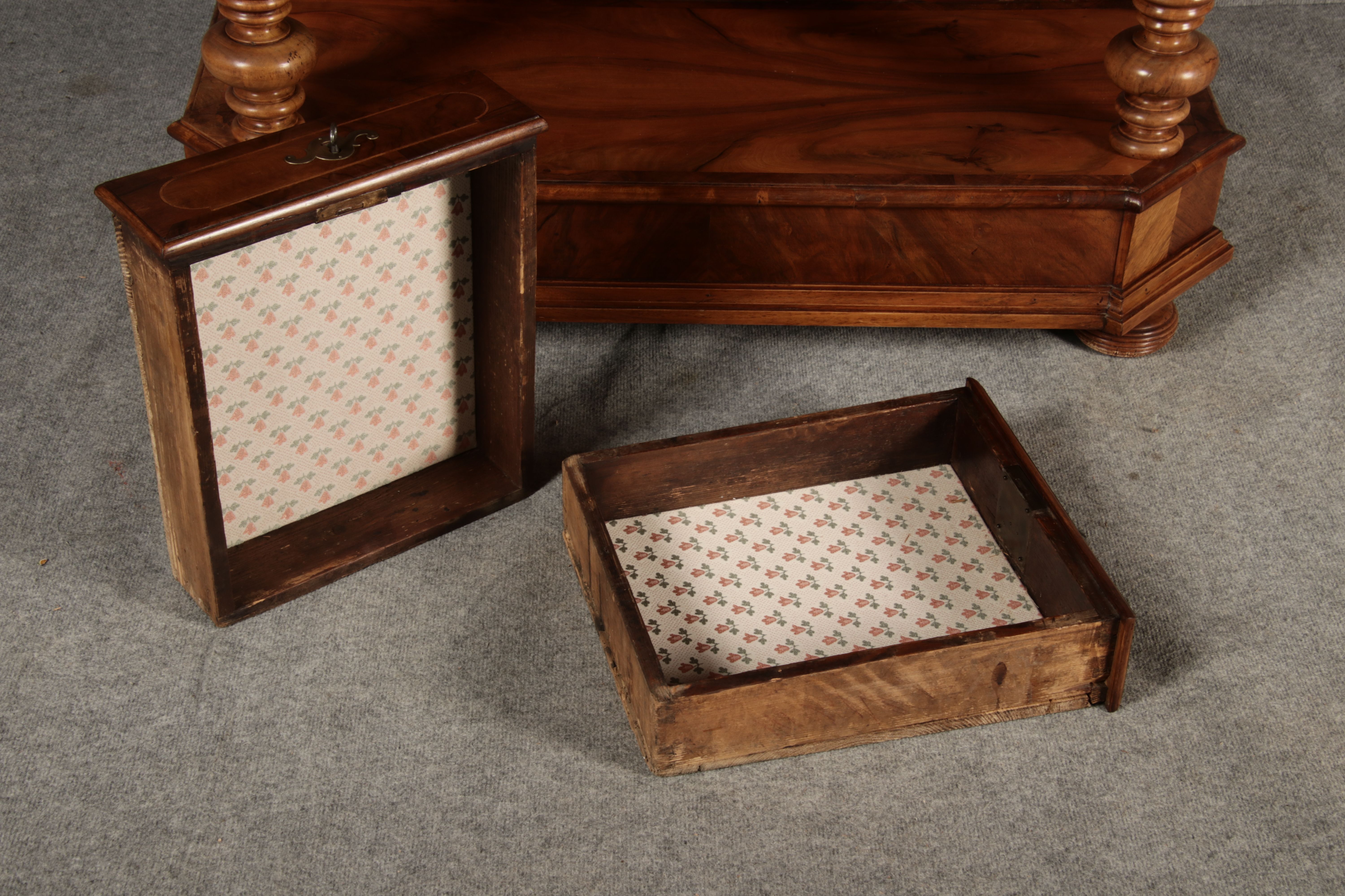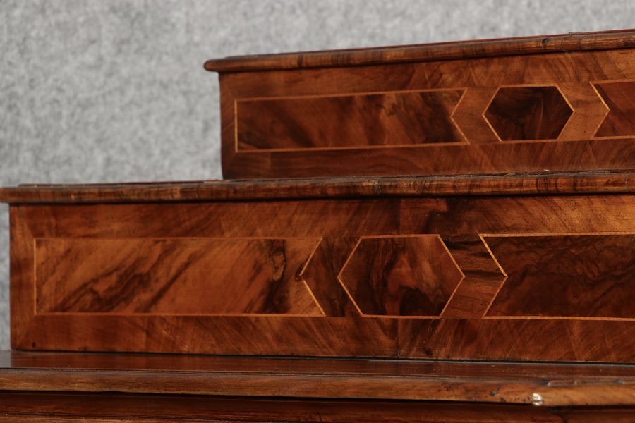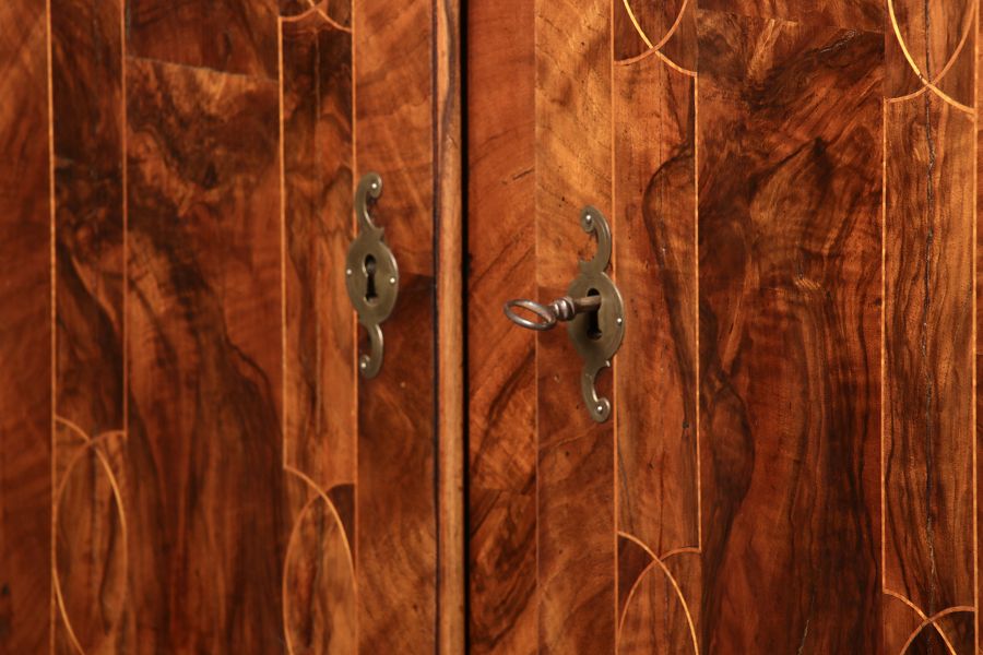 key: Die Holzart ist Nussbaum und andere Hölzer auf Weichholz furniert,er hat 3 Schlüssel