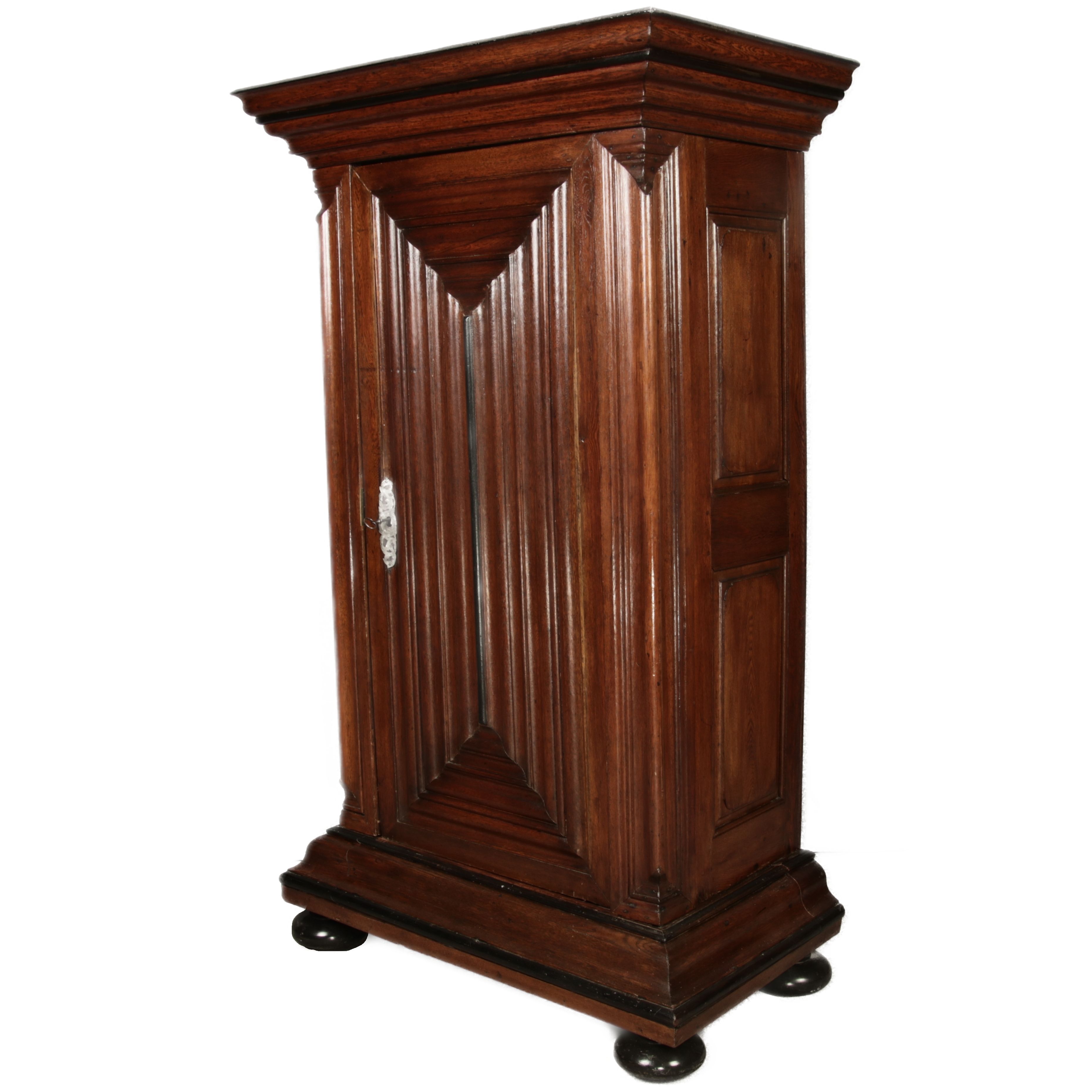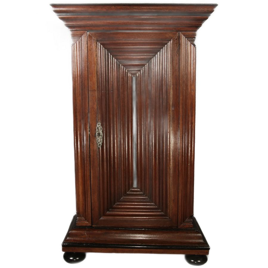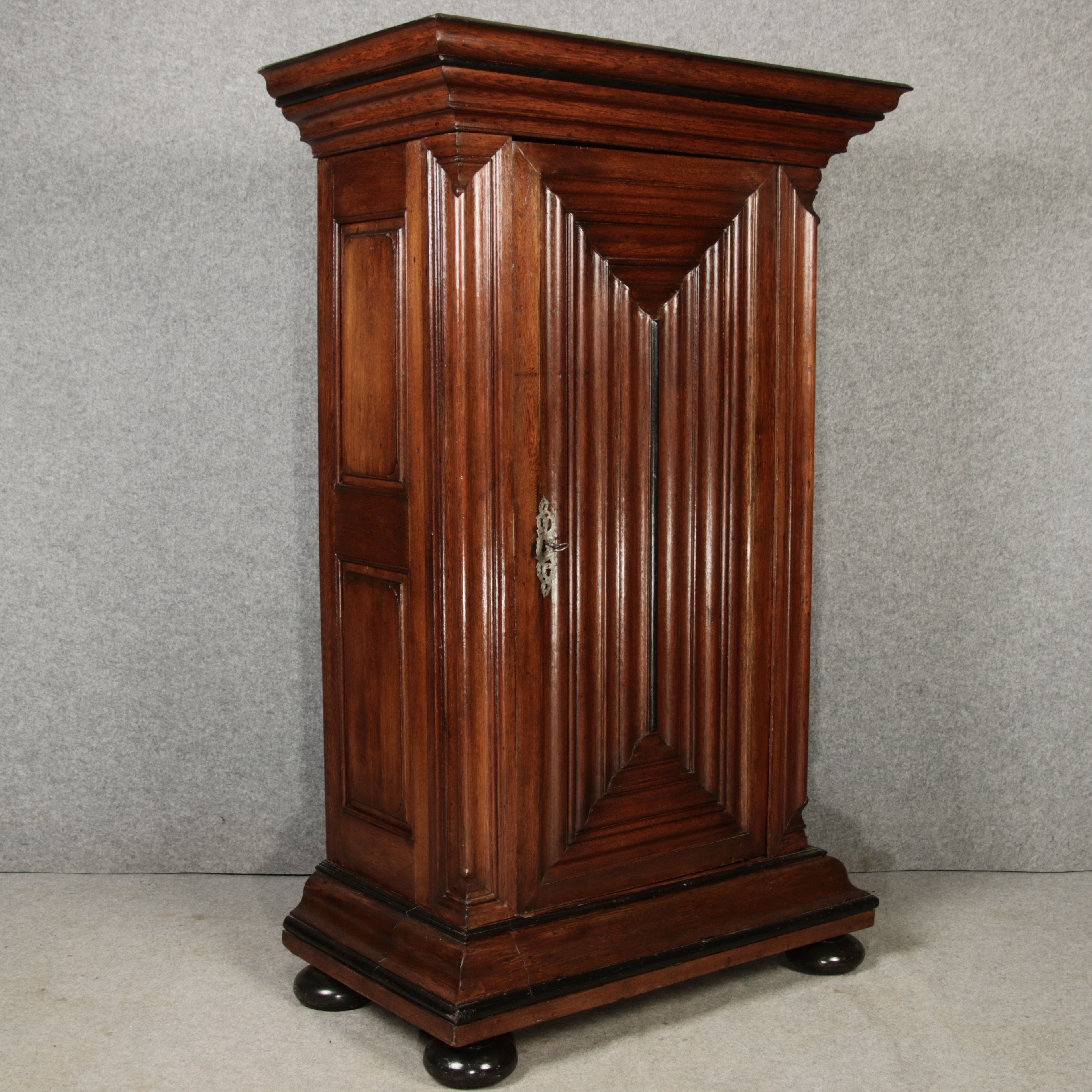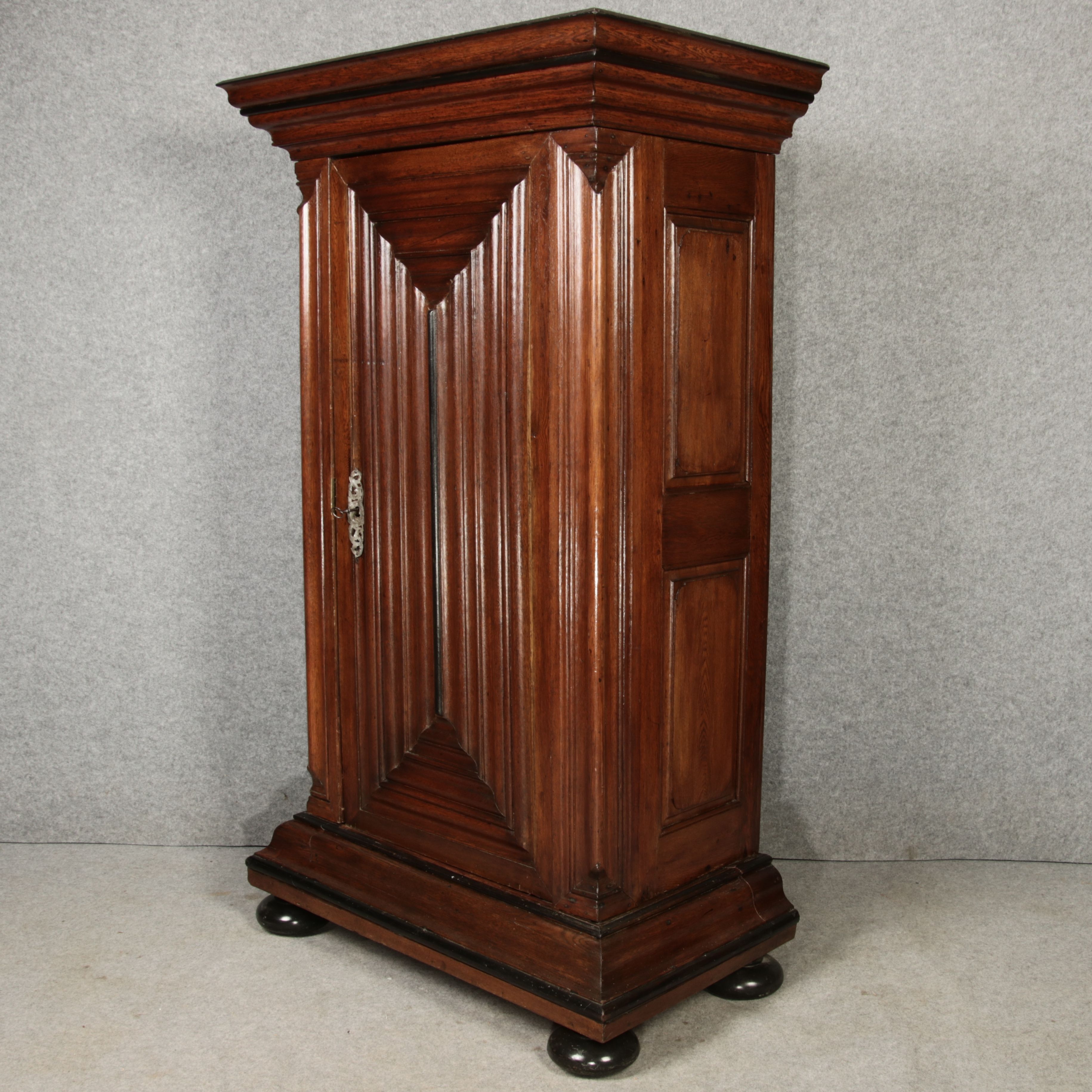 Beschreibung/description: Antiker Eintüriger Barockschrank Frankfurter Wellenschrank, 18. Jahrhundert Dieser Frankfurter Wellenschrank ist ein herausragendes Beispiel für die traditionelle Handwerkskunst des 18. Jahrhunderts. Der Schrank zeichnet sich durch seine typischen wellenförmigen, profilierten Leisten an den Türen und Seiten aus, die ihm eine markante und zugleich elegante Erscheinung verleihen. Diese besondere Gestaltung ist charakteristisch für die Region Frankfurt und hebt den Schrank deutlich von anderen Möbelstücken seiner Zeit ab. Die massiven Eichen Holztür ist mit einem originalen Metallbeschlag und Schloss versehen, das den historischen Wert dieses Möbels unterstreicht. Im Inneren bietet der Schrank großzügigen Stauraum mit mehreren Fächern, die perfekt für die Aufbewahrung von Textilien oder Haushaltsgegenständen geeignet sind. Der Schrank steht auf gedrechselten Kugelfüßen und wird von einem kräftigen Gesims gekrönt, das seine robuste und doch raffinierte Bauweise betont. Die warme Patina des Holzes zeigt den natürlichen Alterungsprozess, der den Charme und die Authentizität dieses antiken Stücks ausmacht. ArtikelNummer /number: sch228