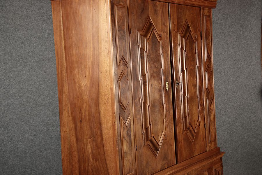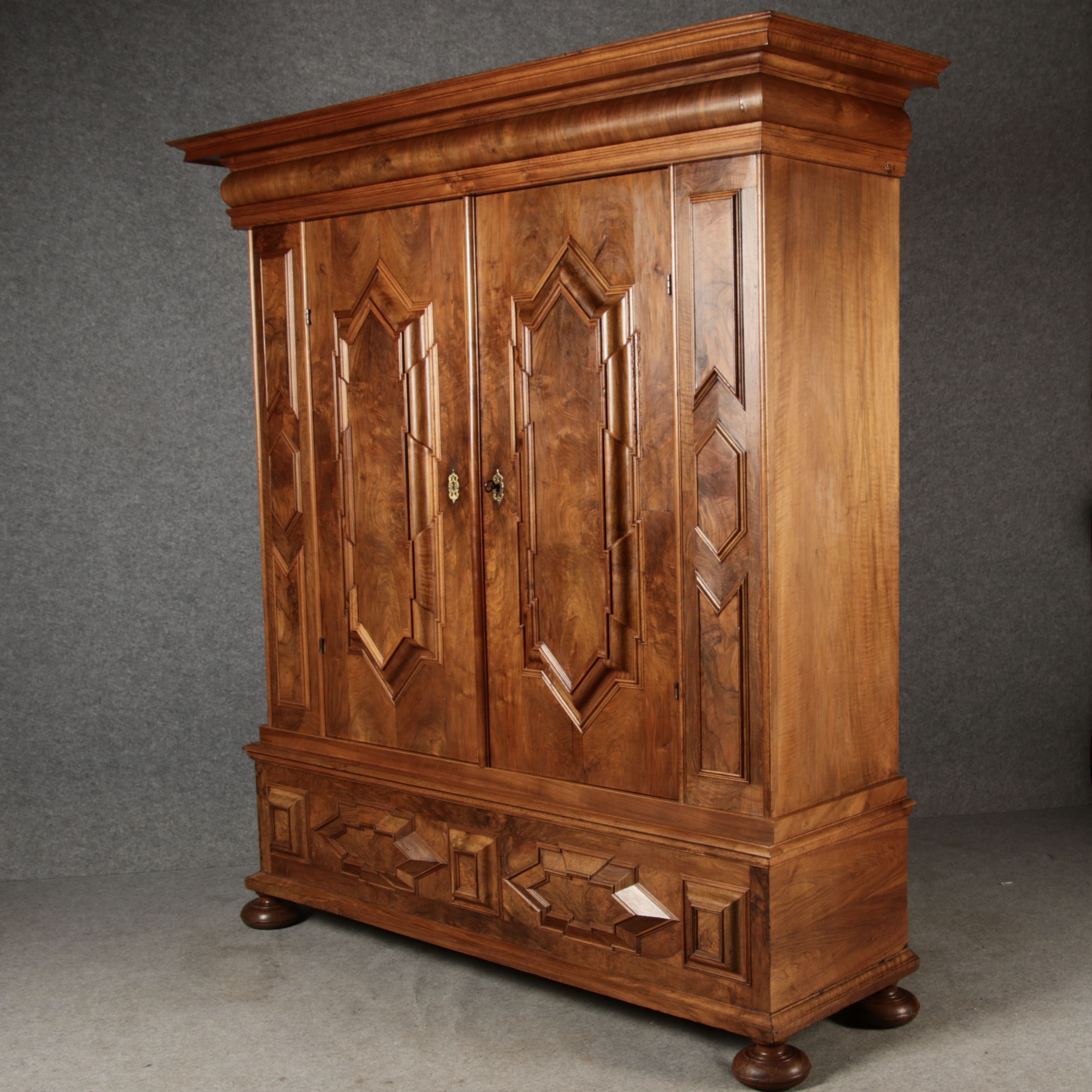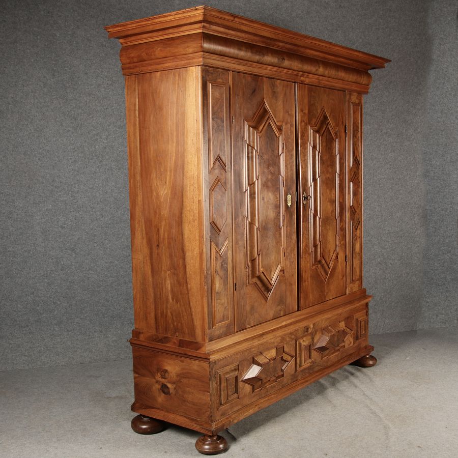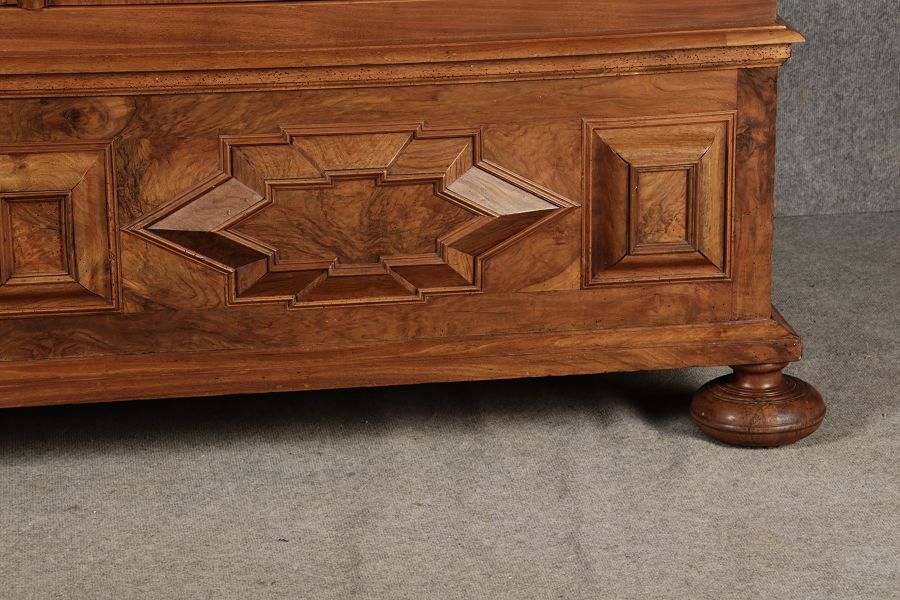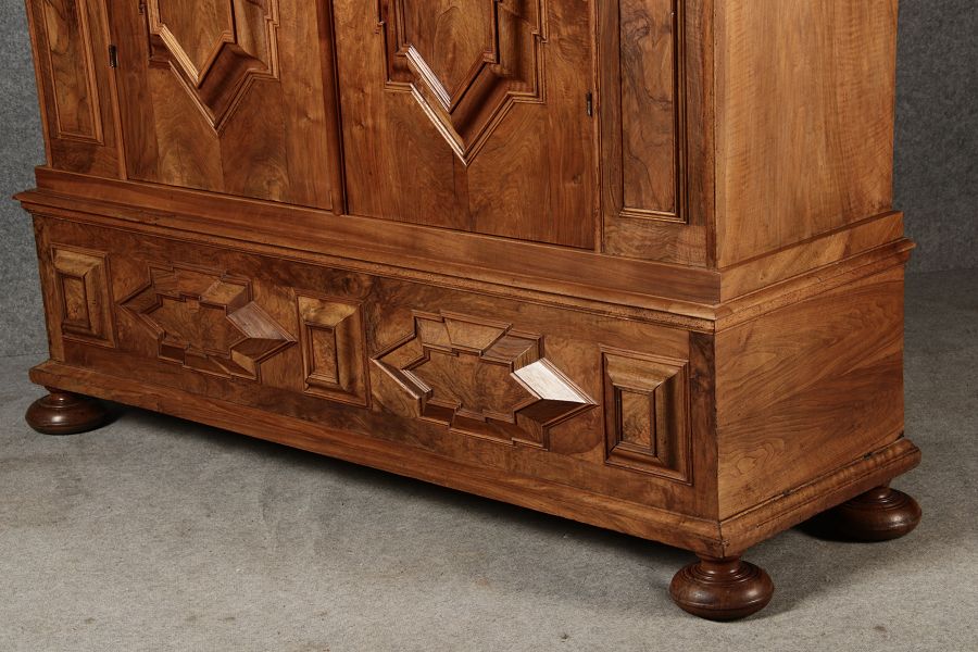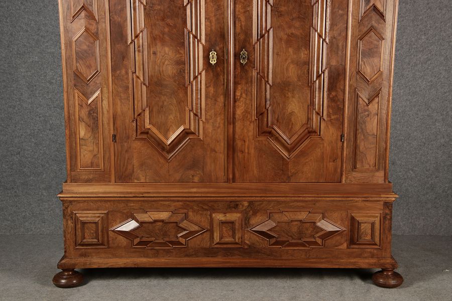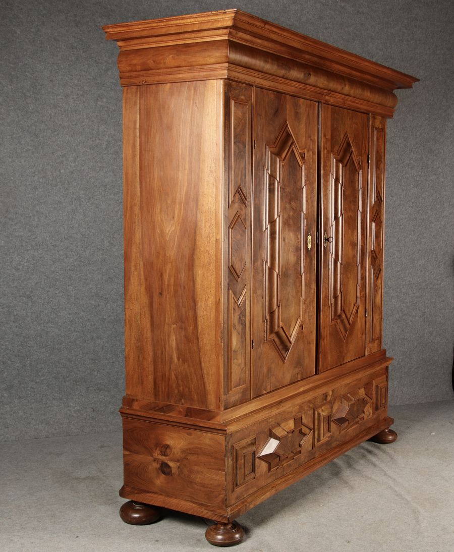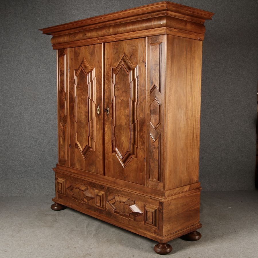 Beschreibung/description: Spätrenaissance-/Frühbarock-Schrank aus Nussbaum, Ende 17. Jahrhundert Dieser beeindruckende Schrank stammt aus der Übergangszeit zwischen der Spätrenaissance und dem Frühbarock und zeichnet sich durch seine opulente Gestaltung und kunstvolle Verarbeitung aus. Hergestellt aus hochwertigem Nussbaumholz, besticht der Schrank durch seine markanten, geometrischen Kassettenfronten, die dem Möbelstück eine faszinierende Tiefe und Struktur verleihen. Die warme, natürliche Maserung des Nussbaumholzes unterstreicht die edle Anmutung und verleiht dem Schrank eine erhabene Ausstrahlung. Die massiven Türen sind mit originalen Metallbeschlägen ausgestattet und lassen sich öffnen, um einen großzügigen Innenraum mit mehreren Regalböden freizugeben, der ideal zur Aufbewahrung von Textilien oder anderen Haushaltsgegenständen geeignet ist. Der Schrank steht auf kräftigen Kugelfüßen, die seine Stabilität und den repräsentativen Charakter unterstreichen. Das Kranzgesims ist typisch für die Epoche und rundet die massive Bauweise stilvoll ab. Ein originalgetreues Stück dieser Qualität ist ein seltenes Sammlerstück und ein Highlight für Liebhaber antiker Möbel. ArtikelNummer /number: sch230