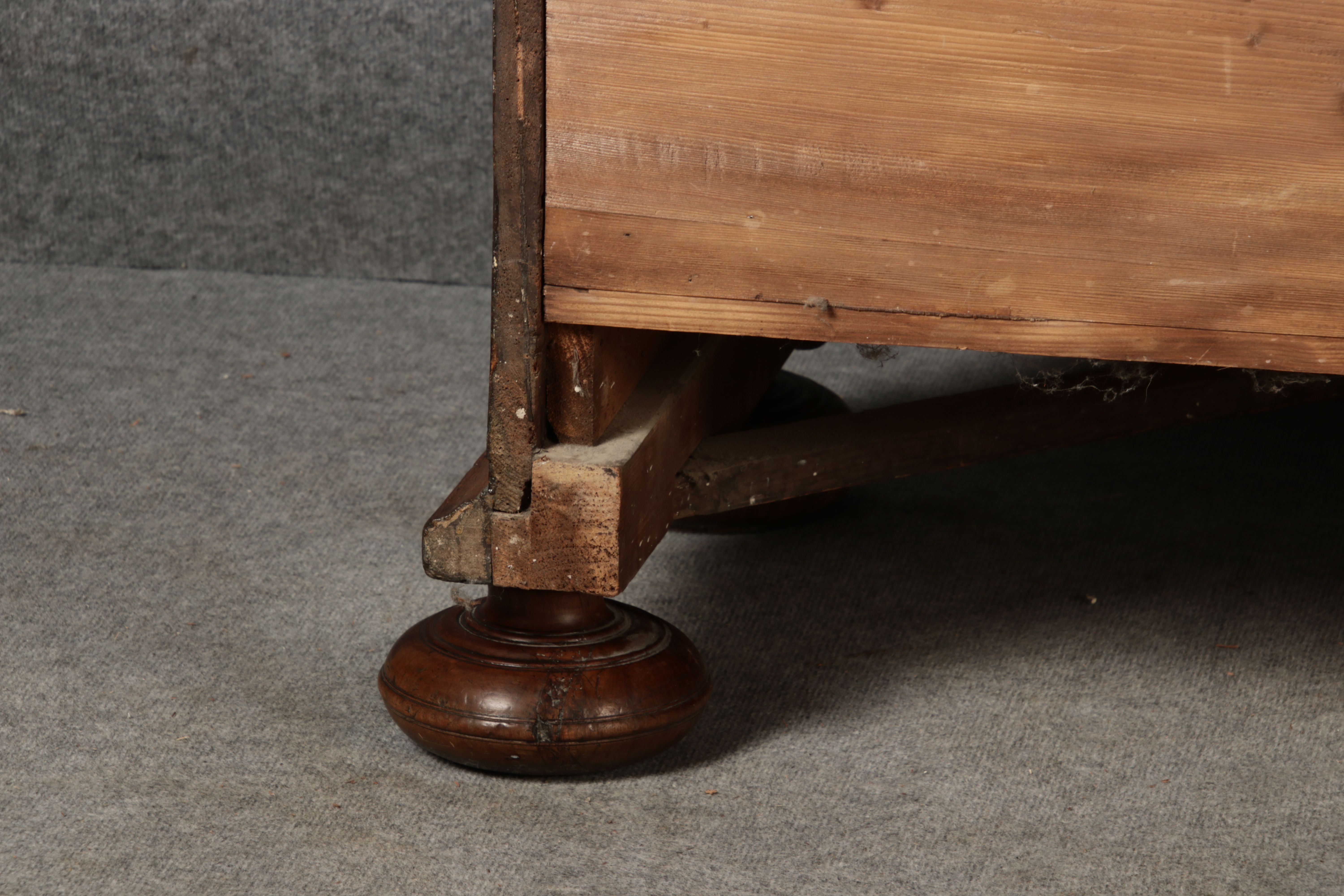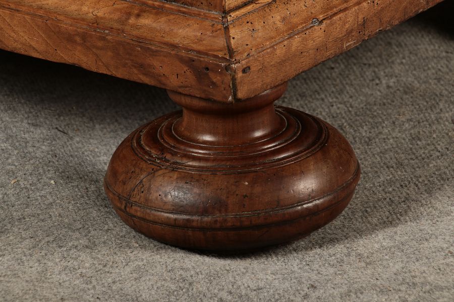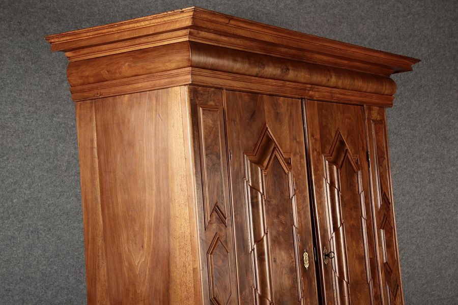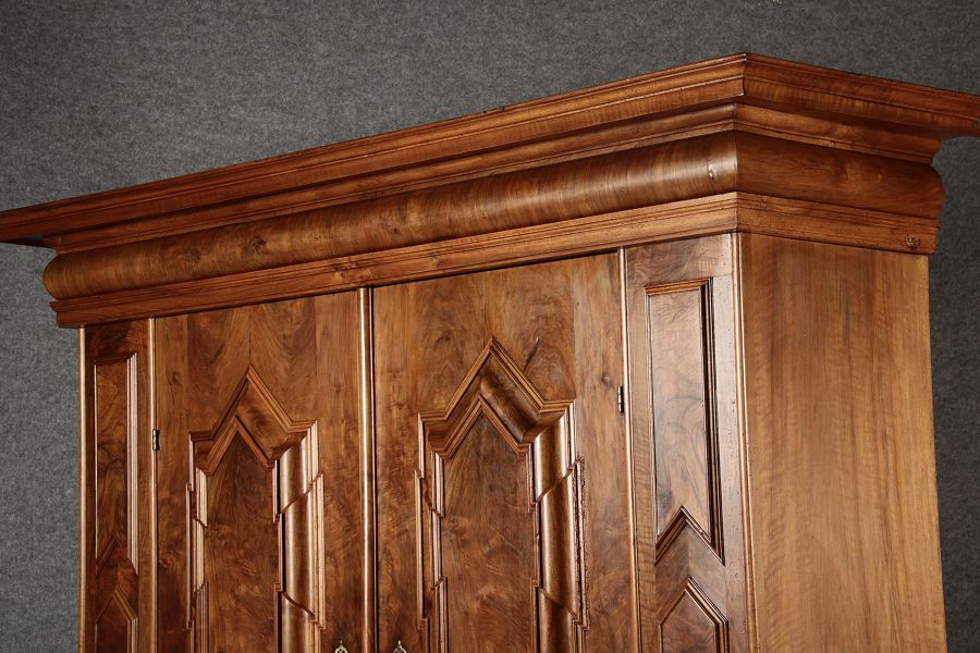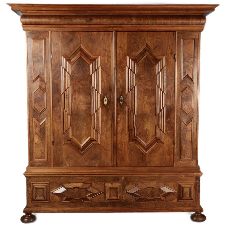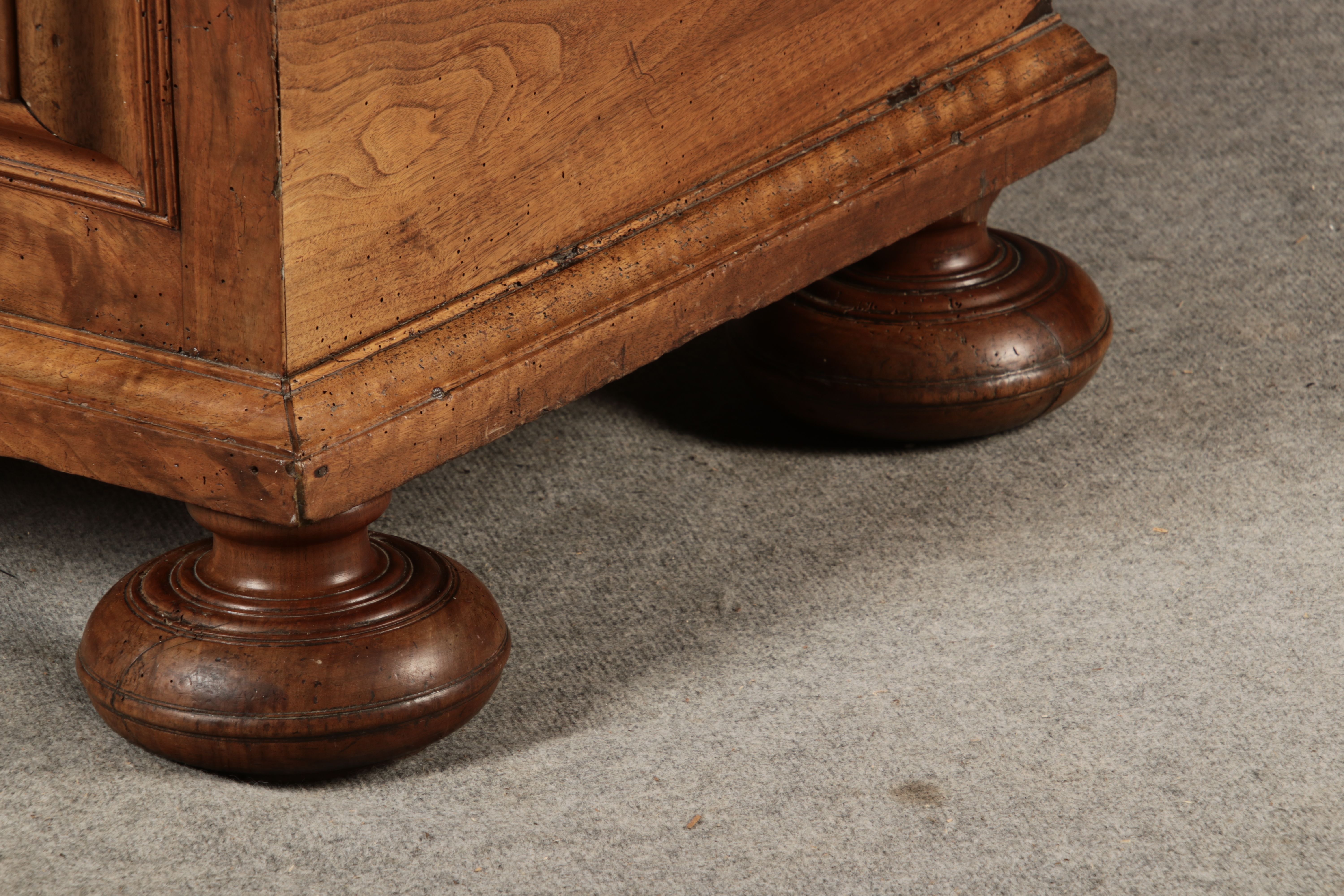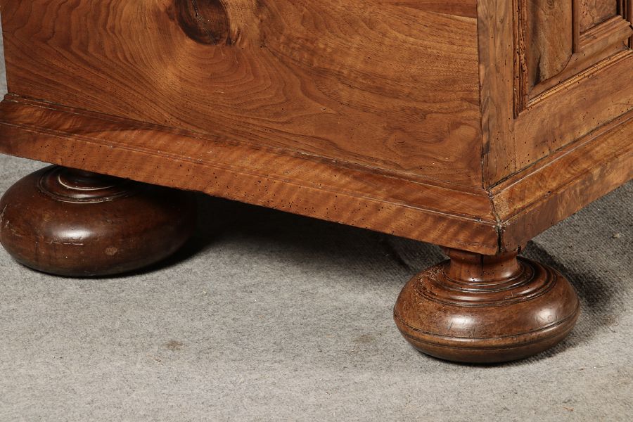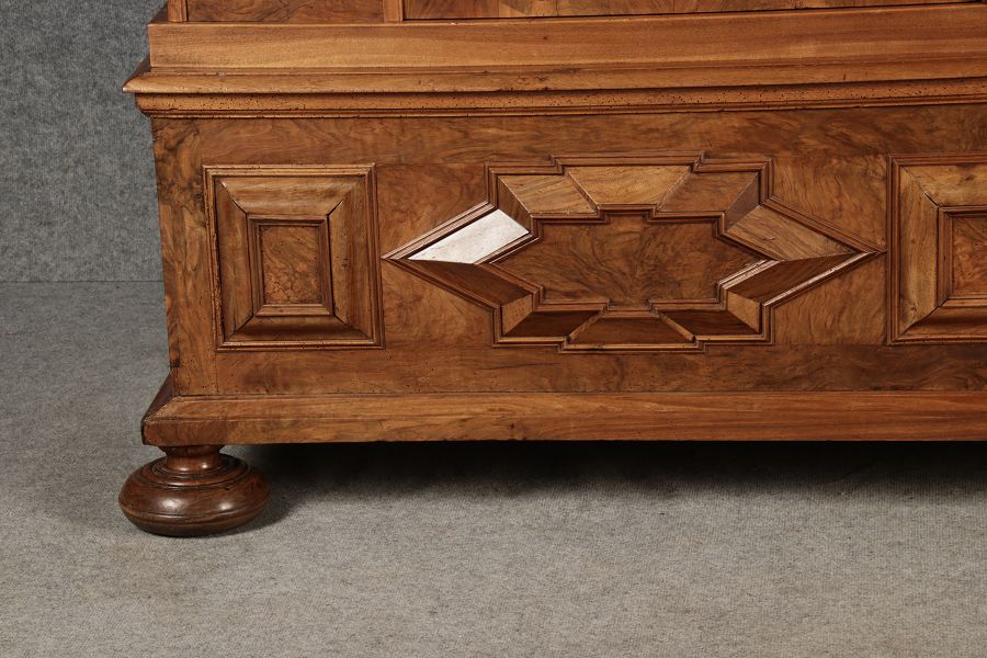 Beschreibung/description: Spätrenaissance-/Frühbarock-Schrank aus Nussbaum, Ende 17. Jahrhundert Dieser beeindruckende Schrank stammt aus der Übergangszeit zwischen der Spätrenaissance und dem Frühbarock und zeichnet sich durch seine opulente Gestaltung und kunstvolle Verarbeitung aus. Hergestellt aus hochwertigem Nussbaumholz, besticht der Schrank durch seine markanten, geometrischen Kassettenfronten, die dem Möbelstück eine faszinierende Tiefe und Struktur verleihen. Die warme, natürliche Maserung des Nussbaumholzes unterstreicht die edle Anmutung und verleiht dem Schrank eine erhabene Ausstrahlung. Die massiven Türen sind mit originalen Metallbeschlägen ausgestattet und lassen sich öffnen, um einen großzügigen Innenraum mit mehreren Regalböden freizugeben, der ideal zur Aufbewahrung von Textilien oder anderen Haushaltsgegenständen geeignet ist. Der Schrank steht auf kräftigen Kugelfüßen, die seine Stabilität und den repräsentativen Charakter unterstreichen. Das Kranzgesims ist typisch für die Epoche und rundet die massive Bauweise stilvoll ab. Ein originalgetreues Stück dieser Qualität ist ein seltenes Sammlerstück und ein Highlight für Liebhaber antiker Möbel. ArtikelNummer /number: sch230